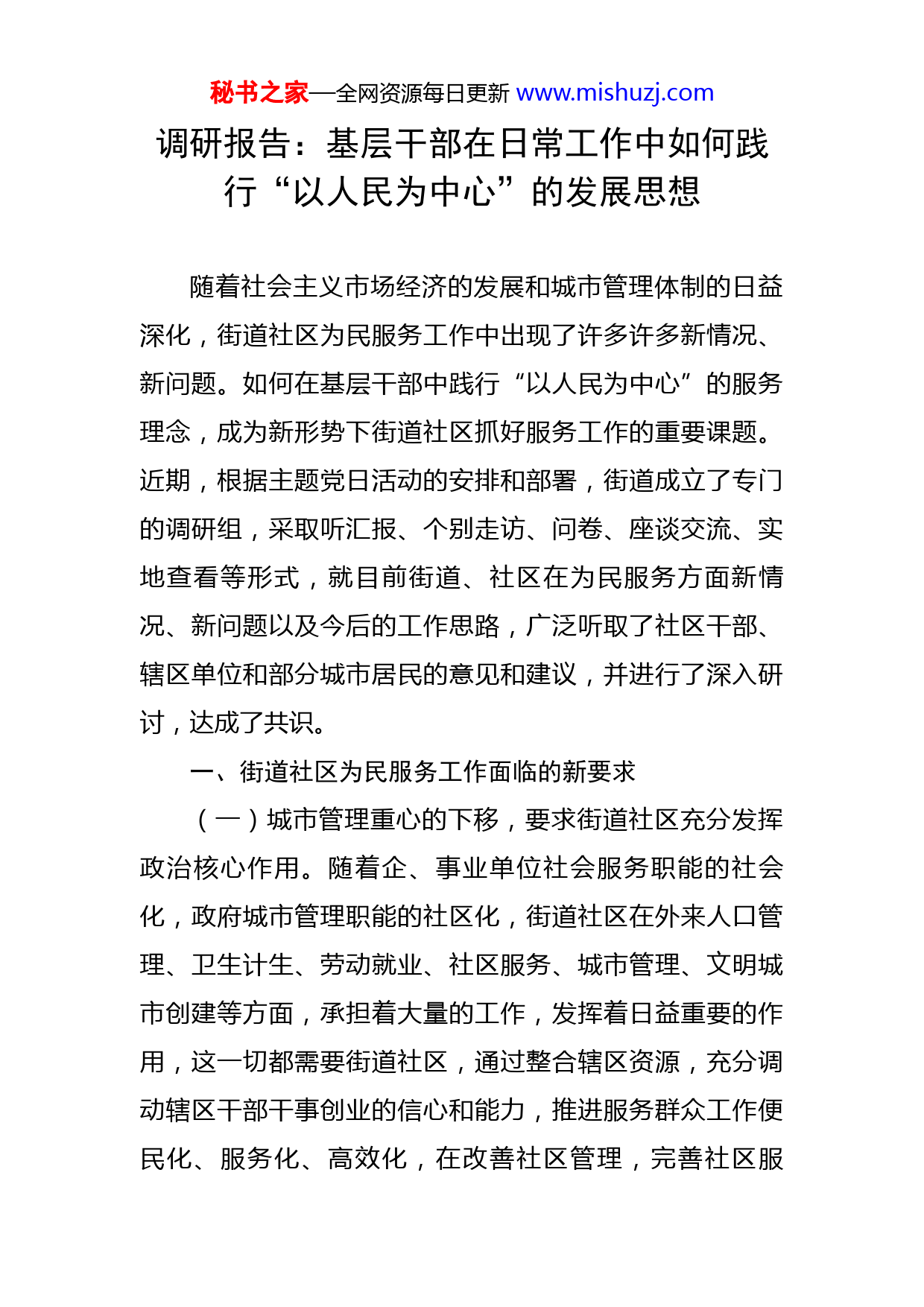秘书之家—全网资源每日更新www.mishuzj.com调研报告:基层干部在日常工作中如何践行“以人民为中心”的发展思想随着社会主义市场经济的发展和城市管理体制的日益深化,街道社区为民服务工作中出现了许多许多新情况、新问题。如何在基层干部中践行“以人民为中心”的服务理念,成为新形势下街道社区抓好服务工作的重要课题。近期,根据主题党日活动的安排和部署,街道成立了专门的调研组,采取听汇报、个别走访、问卷、座谈交流、实地查看等形式,就目前街道、社区在为民服务方面新情况、新问题以及今后的工作思路,广泛听取了社区干部、辖区单位和部分城市居民的意见和建议,并进行了深入研讨,达成了共识。一、街道社区为民服务工作面临的新要求(一)城市管理重心的下移,要求街道社区充分发挥政治核心作用。随着企、事业单位社会服务职能的社会化,政府城市管理职能的社区化,街道社区在外来人口管理、卫生计生、劳动就业、社区服务、城市管理、文明城市创建等方面,承担着大量的工作,发挥着日益重要的作用,这一切都需要街道社区,通过整合辖区资源,充分调动辖区干部干事创业的信心和能力,推进服务群众工作便民化、服务化、高效化,在改善社区管理,完善社区服秘书之家—全网资源每日更新www.mishuzj.com务,化解社会矛盾,保持社会稳定方面发挥强有力的政治核心作用。(二)民生主体地位的凸显,要求街道社区树牢为民服务意识。随着社会的不断进步和发展,国家对民生服务工作越来越重视。新形式和新常态下,要做好街道社区为民服务工作,就必须践行“民思我想、民求我应、民需我办、民难我解”的思路,怀着对居民的深厚感情,着力在便民、服务、保障的支撑服务体系上下功夫,创新服务,提升服务功能。要把党和政府的重托,把人民的期望,化作一腔热情和一颗赤子之心,带着感情、带着责任、带着追求,深入居民家中了解居民“所急、所需、所盼”,及时解决居民的热点、疑点、难点问题,始终不渝地把党和政府的关怀送到居民的心坎上,当好居民的贴心人。(三)广大居民生活方式的改变,要求街道社区体现改革发展初心。始终坚持以人民为中心,体现改革发展初心。城市的核心是人,让人民生活更美好,是改革发展的最大初心。随着生活水平的提高和休闲时间的增多,广大城市居民精神需求日益多样化,社区出现了一些新的群众性组织和活动群体,其中即有公开的也有隐蔽的,有积极的也有消极的,有健康的也有不利于社会发展的。如何坚持正确的政治方向,把群众的积极性保护好、引导好,把各类自发的健康的群体活动组织好,保证群众民主权利的秘书之家—全网资源每日更新www.mishuzj.com实现,是摆在街道、社区干部面前亟待解决的重要问题。二、目前街道、社区为民服务工作存在的问题一是街道社区干部思想落后的问题。街道社区个别党支部及干部认识不到位,思想观念仍然停留在旧框框中,有的干部把为民服务停留在口头上,服务群众的口号喊得震天响,但真正面对群众时却是“话难听,脸难看,门难进”,对新形势下如何做好居民服务工作缺乏研究和思考,工作覆盖面不广,没有特色和创新,不能根据变化后的新形势、新任务提出有针对性的措施。二是街道社区负担过重的问题。街道社区工作人员承担的工作量比较大,涉及面广,有党的建设、综合治理、城市管理、大气污染防治、人口与计划生育、防病防疫、流动人口管理、防范邪教、普法、劳动就业、组织劳务输出、职业介绍、对特困居民提供最低生活保障等等,日常工作项目多,还有随时性工作需要居委会工作人员及时处理。而居委会的情况是责任大,权利小,事情多,经费少,工作任务重。在工作的同时,居委会工作人员要接触各种人、处理各种事,工作精力不足,效率较低。在一定程度上消弱了工作的积极性。三是社区工作经费不足问题。有的社区基础设施相对落后,建设经费不足,各种便民公益设施也无法满足为民服务的需要,基层干部在工作中有想法,有思路,也很想秘书之家—全网资源每日更新www.mishuzj.com施展自己的抱负,干出一番事业来,但因为经费不足,造成好的思路和办法只能成为一种摆设,不能付之于行动,甚至石沉大海,影响了社区和服务发展工作的正常开展。三、今后街道、社区为民服务工作的思考(一)以知民为基础,熟知民意,体恤民情。围绕“知民”,扎实推进调查摸底工作,为服务居民掌握真实准确翔实的第一手资料,增强街道社区工作人员的责任感。随着居民生活水平的不断提高,住房、医疗、养老、就业等各项制度改革的不断深入,城市居民与街道社区的关系越来越密切,居民对街道社区的服务需求越来越多。因此街道干部应该践行“以人民为中心”的服务理念,以“底数清、情况明、信息实”为基本要求,协同相关部门,紧紧抓住“以房管人”等措施,以楼幢为单位,做到每户居民都有街道社区人员管理,不留死角;制作入户登记表,将居民的城市低保、计划生育、劳动保障、重点人员、残疾对象及流动人口等内容详细进行登记,确保入户信息全面周详;同时实行动态管理,督促街道社区工作人员对责任区的重点人员、流动人口、房屋租赁情况定期复查,全面摸清居民基本情况;街道社区设立民情联络站,强化热线服务,把意见和问题分类整理,实行“全程