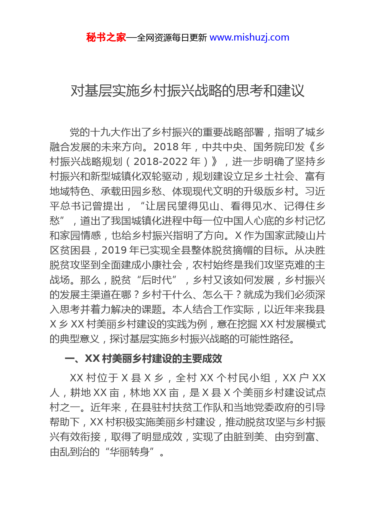 秘书之家—全网资源每日更新www.mishuzj.com对基层实施乡村振兴战略的思考和建议党的十九大作出了乡村振兴的重要战略部署,指明了城乡融合发展的未来方向。2018年,中共中央、国务院印发《乡村振兴战略规划(2018-2022年)》,进一步明确了坚持乡村振兴和新型城镇化双轮驱动,规划建设立足乡土社会、富有地域特色、承载田园乡愁、体现现代文明的升级版乡村。习近平总书记曾提出,“让居民望得见山、看得见水、记得住乡愁”,道出了我国城镇化进程中每一位中国人心底的乡村记忆和家园情感,也给乡村振兴指明了方向。X作为国家武陵山片区贫困县,2019年已实现全县整体脱贫摘帽的目标。从决胜脱贫攻坚到全面建成小康社会,农村始终是我们攻坚克难的主战场。那么,脱贫“后时代”,乡村又该如何发展,乡村振兴的发展主渠道在哪?乡村干什么、怎么干?就成为我们必须深入思考并着力解决的课题。本人结合工作实际,以近年来我县X乡XX村美丽乡村建设的实践为例,意在挖掘XX村发展模式的典型意义,探讨基层实施乡村振兴战略的可能性路径。一、XX村美丽乡村建设的主要成效XX村位于X县X乡,全村XX个村民小组,XX户XX人,耕地XX亩,林地XX亩,是X县X个美丽乡村建设试点村之一。近年来,在县驻村扶贫工作队和当地党委政府的引导帮助下,XX村积极实施美丽乡村建设,推动脱贫攻坚与乡村振兴有效衔接,取得了明显成效,实现了由脏到美、由穷到富、由乱到治的“华丽转身”。秘书之家—全网资源每日更新www.mishuzj.com(一)由脏到美。以前,XX村群众卫生观念普遍较差,大部分群众没有养成自觉维护环境卫生的习惯。垃圾随意丢弃,堆放在房前屋后、村道两旁;院落环境卫生差,垃圾池满溢;池塘、河道漂浮垃圾多,小广告随处乱贴;垃圾没有分类,转运不及时。环境卫生差不仅影响了群众的生活质量,更营造了一种混乱、懒散氛围,制约了XX村的发展。近年来,XX村以美丽乡村建设为契机,大力推进村居环境整治,着力打造出干净整洁、清新秀丽、生态宜居村庄。一是推动村民思想观念“自醒”“自新”。组织村干部、致富带头人外出XX等地考察学习美丽乡村建设先进经验,开拓了干部能人们的视野;通过党员干部会议、院落会进行宣传引导,掀起一场改变本村面貌的“头脑风暴”,村民们的思想观念得到根本性的改变,实现了由“强迫参加”到“主动参与”、从“索要工资”到“义务服务”的“蜕变”。2019年以来,该村共组织义务环境卫生大整治行动X多次,村民从最开始的组织性活动到自发参与,从原来的X名保洁员到现在人人都是保洁员,群众环保意识显著提升。二是大力实施庭院改造。制定了《XX村庭院建设指导意见》,发出了《XX村庭院绿化美好行动倡议书》,按照“因地制宜、量力而行、废物利用、彰显个性”的原则,围绕庭院“门、栏、坪、棚、池、园”六个方面,积极打造美丽庭院;委托XX现代休闲农业研究院编制美丽乡村建设规划,邀请XX林科大园林学研究生团队到片区开展社会实践,完成XX座民居、XX个公共区域的环境整治方案设计;出台“最美庭院”评比及奖励办法,用XX万元的奖励资金撬动了近XX万元的庭院改造资金。2019年,全村推动庭院改造XX座,全部主动参加评比,2020年,增加到XX多户参加评比,全村庭院改造行动如火如荼。三是创新构建文明乡风。组建乡风文明“先秘书之家—全网资源每日更新www.mishuzj.com锋队”和“劝导队”,助力全村改善人居环境,倡导移风易俗,在全村开展志愿者服务,筹划实施“一户一档案”,以“三化五星”推动文明创建工程,村内保洁实现常态化;成立了红白喜事理事会和乡贤理事会,红白喜事一律从简,全村禁塑限炮,取消一次性碗筷,不仅改善了环境卫生,更为群众节约资金XX余万元;全村实施家禽圈养,垃圾进桶、柴草规堆,房前屋后干净整洁。目前,XX村村容村貌焕然一新,正如同陶渊明笔下的XX源:“屋舍俨然,良田美池桑竹之属。”一座座美丽庭院让人移步换景,引人入胜。(二)由乱到治。曾经,XX村的“乱”令人头疼,体现为“三不”:班子不稳,原来的村支部书记和村秘书相继辞职,有知识有文化懂电脑的年轻人大多外出,不愿意留在村里;而有农村工作经验的村干部大部分文化水平低、年纪大,许多工作力不从心。政令不畅,村支两委会议安排的工作仅停留在村级层面,不能下沉到村民中去。村领导将工作布置到村民小组,村组长敷衍应付了事,没有传导到群众中去;而群众认为干部的工作都是走过场、做样子,工作局面无法打开。人心不聚,姓氏之间、院落之间,存在历史性的矛盾和积怨;村规民约形同虚设,开会经常以生气、吵闹、相骂等等收场,甚至在换届时出现酗酒闹事、踩票箱现象;乱占田、占山、占地经常出现,矛盾纠纷难以调处,项目建设困难重重;移民等内外问题引发上访不断。针对这“三不”现象,在工作队的支持下,村支两委创新治理方式,实现了有效治理的目标。一是创新基层协商民主。实行“三责同担”,大家的事大家议,自己的事自己做,村里的事村里管,退权于民;建立健全村支两委例会制、院落协商会经常制、理事会议事定期制,通过“三制”秘书之家—全网资源每日更新www.mishuzj.com“院落会”,把话语权交给群众,将自主权还给村民。2019年以来共召开“院落会”XX余次,实现了村民从过去“找茬子”到现在“出点子”、从