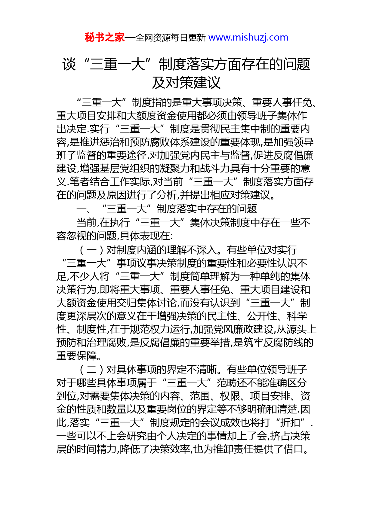 秘书之家—全网资源每日更新www.mishuzj.com谈“三重一大”制度落实方面存在的问题及对策建议“三重一大”制度指的是重大事项决策、重要人事任免、重大项目安排和大额度资金使用都必须由领导班子集体作出决定.实行“三重一大”制度是贯彻民主集中制的重要内容,是推进惩治和预防腐败体系建设的重要体现,是加强领导班子监督的重要途径.对加强党内民主与监督,促进反腐倡廉建设,增强基层党组织的凝聚力和战斗力具有十分重要的意义.笔者结合工作实际,对当前“三重一大”制度落实方面存在的问题及原因进行了分析,并提出相应对策建议。一、“三重一大”制度落实中存在的问题当前,在执行“三重一大”集体决策制度中存在一些不容忽视的问题,具体表现在:(一)对制度内涵的理解不深入。有些单位对实行“三重一大”事项议事决策制度的重要性和必要性认识不足,不少人将“三重一大”制度简单理解为一种单纯的集体决策行为,即将重大事项、重要人事任免、重大项目建设和大额资金使用交归集体讨论,而没有认识到“三重一大”制度更深层次的意义在于增强决策的民主性、公开性、科学性、制度性,在于规范权力运行,加强党风廉政建设,从源头上预防和治理腐败,是反腐倡廉的重要举措,是筑牢反腐防线的重要保障。(二)对具体事项的界定不清晰。有些单位领导班子对于哪些具体事项属于“三重一大”范畴还不能准确区分到位,对需要集体决策的内容、范围、权限、项目安排、资金的性质和数量以及重要岗位的界定等不够明确和清楚.因此,落实“三重一大”制度规定的会议成效也将打“折扣”.一些可以不上会研究由个人决定的事情却上了会,挤占决策层的时间精力,降低了决策效率,也为推卸责任提供了借口。秘书之家—全网资源每日更新www.mishuzj.com(三)出台制度内容的操作性不高。一是部分单位对“三重一大”制度内容只做了原则性、概括性、粗线条界定,细化、量化不够,“三重一大”事项范围不明确.二是个别单位对决策形式、程序、规则以及决议的方式执行不严,议事规程的设计缺乏规范性文件作为指导,导致操作过程中随意性、盲目性较大.三是在贯彻落实“三重一大”制度的过程中,乡镇站在全镇的角度制定了相应的意见和办法,同时也需要各村级组织结合本村实际制定具体的实施标准和细则,但实际调查却发现,村级组织制定的“三重一大”相关规章制度基本是照抄、照搬上一级规章制度,缺少结合实际情况制定的本级实施规范,使制度成了“说在嘴上,写在纸上,挂在墙上”的形式化制度。(四)议题事项的透明度不够。有些上会研究的“三重一大”议题仅局限于决策环节,决策是否执行、如何执行、执行效果等情况,很少在事后对决策执行的情况在会上进行反馈和通报.此外,一些“三重一大”事项在决策执行过程中会发生调整变更现象,而调整变更的集体决策过程往往容易被忽视或漠视,从而导致集体决策的要求未能贯穿“三重一大”事项的始终.例如:某村停车场经营权的发包,最初村委会严格能够按照“四议两公开”要求实施公开招投标.后因停车场基础设施不够完善,承包商以要完善相关基础设施为由向村委会提出增加承包年限,村委会干部在未经过村民代表会议讨论的情况下擅自作出决定,导致群众反映强烈。(五)对制度执行的力度待提升。此问题在村一级的体现较为明显.从近年来的信访问题来看,在农村“三资”管理方面,特别是在资产、资源处置方面尤为突出,映射出部分村在执行“三重一大”制度方面不够严谨、不够深入,同时也体现部分村干部存在私心,为了个人利益不按制度办事的行为.例如:某村为解决办公场所隔热问题需在楼顶加盖隔热设施,涉及“大额资金使用”问题,但村委开几个干部会议就决定实施了,没有执行好“三重一大”制度和“四议两公开”要求,导致群众意见大。秘书之家—全网资源每日更新www.mishuzj.com(六)对制度落实的监督待加强。一是部分单位在决策实施过程中没有委派有关部门进行监督,导致实施过程的监督不到位.二是群众对“三重一大”集体决策结果的认可程度是决策效果的重要评审依据,群众监督也是“三重一大”制度监督体系的重要内容,然而多数群众除与自身利益切实相关的事项外,对参与“三重一大”决策监督的积极性不高,很少参与。二、出现上述问题的原因分析综合分析,以上所出现的问题的原因可以概括为以下几个方面:(一)政策宣传不到位导致对制度理解不透彻。中央、省、市、县均有一系列对于贯彻落实“三重一大”制度的相关政策和文件,各单位也制定了相应的实施方案和规章制度,但由于宣传方式、宣传力度、广度及深度等原因,仍有不少群众甚至机关事业单位人员、镇村干部对“三重一大”相关政策是只识其名、不知其意,对政策尚且一知半解,更不用说在参与监督方面可以发挥多大作用。(二)思想认识不到位导致制度执行难。“三重一大”集体决策制度既然成为了写在纸上,形成文件的东西,就要自上而下地坚决执行,而不能只停留在口头上.但在实践中,由于领导班子及干部思想认识不到位从而导致决策缺项,缺少环节等问题.另一方面,一些单位的副职认为决策是主要领导的事情,和自己无关,在参与决策时怕发表意见会使主要领导对自己有看法,怕