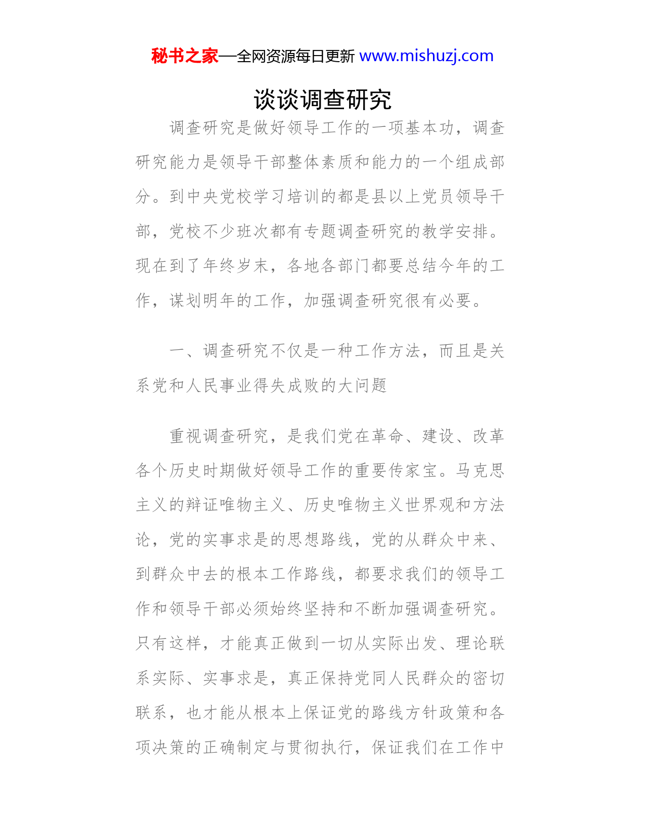 秘书之家—全网资源每日更新www.mishuzj.com谈谈调查研究调查研究是做好领导工作的一项基本功,调查研究能力是领导干部整体素质和能力的一个组成部分。到中央党校学习培训的都是县以上党员领导干部,党校不少班次都有专题调查研究的教学安排。现在到了年终岁末,各地各部门都要总结今年的工作,谋划明年的工作,加强调查研究很有必要。一、调查研究不仅是一种工作方法,而且是关系党和人民事业得失成败的大问题重视调查研究,是我们党在革命、建设、改革各个历史时期做好领导工作的重要传家宝。马克思主义的辩证唯物主义、历史唯物主义世界观和方法论,党的实事求是的思想路线,党的从群众中来、到群众中去的根本工作路线,都要求我们的领导工作和领导干部必须始终坚持和不断加强调查研究。只有这样,才能真正做到一切从实际出发、理论联系实际、实事求是,真正保持党同人民群众的密切联系,也才能从根本上保证党的路线方针政策和各项决策的正确制定与贯彻执行,保证我们在工作中秘书之家—全网资源每日更新www.mishuzj.com尽可能防止和减少失误,即使发生了失误也能迅速得到纠正而又继续胜利前进。回顾我们党的发展历程可以清楚地看到,什么时候全党从上到下重视并坚持和加强调查研究,党的工作决策和指导方针符合客观实际,党的事业就顺利发展;而忽视调查研究或者调查研究不够,往往导致主观认识脱离客观实际、领导意志脱离群众愿望,从而造成决策失误,使党的事业蒙受损失。调查研究的过程,是领导干部提高认识能力、判断能力和工作能力的过程。经常走出领导机关,深入实际、深入基层、深入群众,进行各种形式和类型的调查研究,非常有益于促进领导干部正确认识客观世界、改造主观世界、转变工作作风、增进同人民群众的感情,有益于深切了解群众的需求、愿望和创造精神、实践经验。现在的交通通信手段越来越发达,获取信息的渠道越来越多,但都不能代替领导干部亲力亲为的调查研究。因为直接与基层干部群众接触,面对面地了解情况和商讨问题,对领导干部在认识上和感受上所起的作用和间接听秘书之家—全网资源每日更新www.mishuzj.com汇报、看材料是不同的。通过深入实际调查研究,把大量和零碎的材料经过去粗取精、去伪存真、由此及彼、由表及里的思考、分析、综合,加以系统化、条理化,透过纷繁复杂的现象抓住事物的本质,找出它的内在规律,由感性认识上升为理性认识,在此基础上作出正确的决策,这本身就是领导干部分析和解决问题本领的重要反映,也是领导干部思想理论水平和工作水平的重要反映。领导干部不论阅历多么丰富,不论从事哪一方面工作,都应始终坚持和不断加强调查研究。为什么对领导干部的调查研究,要强调“始终坚持”和“不断加强”呢?一是因为我们所肩负的任务是不断变化的,原有的任务完成了,新的任务又摆到了面前,又需要重新学习和调查研究。二是因为我们党的领导干部是要不断地进行新老交替和不断地调换工作岗位的,老干部离开了领导岗位,新一批干部上来了,老干部学习和调查研究的经验可以供新上来的干部学习借鉴,但代替不了新上来干部的学习和调查研究。领导干部从一个地区和部秘书之家—全网资源每日更新www.mishuzj.com门到另一个地区和部门,都必须进行调查研究。即便是回到曾经熟悉的工作岗位和工作环境,也不能刻舟求剑,还需要重新调查了解新情况。三是客观事物总在不断变化,新矛盾新问题每日每时都在出现,在当代中国社会主义现代化事业蓬勃发展的形势下,在当今世界多极化、经济全球化深入发展和科学技术突飞猛进的条件下更是如此。这也要求领导干部必须坚持不懈地进行和加强调查研究。应该看到,当前在领导干部中,不重视调查研究、不善于调查研究的问题还是存在的。有的走不出“文山会海”,强调工作忙,很少下去调查研究。有的满足于看材料、听汇报、上网络,不深入实际生活,坐在办公室关起门来作决策。有的自认为熟悉本地区本部门情况,对层出不穷的新情况新问题反映不敏锐,对形势发展变化提出的新课题新挑战应对不得力,看不到事物的发展变化是一个由量变到质变的过程,凭经验办事,拍脑袋决策。有的调研走过场,只看“盆景式”典型,满足于听听、转转、看看,蜻蜓点水、浅尝辄止。凡此种种,严重秘书之家—全网资源每日更新www.mishuzj.com影响决策的科学性,妨碍党的路线方针政策的贯彻执行,也损害领导机关、领导干部的形象。胡锦涛同志在党的十七届六中全会上再次明确要求,各级党委要立足我国社会主义初级阶段基本国情,以宽广的眼界观察世界,组织力量开展调查研究,努力回答对我国经济社会发展带有全局性、战略性的重大问题。各级领导干部要充分认识调查研究的重要性,按照胡锦涛同志提出的要求加强和做好调查研究工作。二、学习和掌握正确方法,努力提高调查研究水平和成效做好新形势下的调查研究工作,要坚持以中国特色社会主义理论体系为指导,紧紧围绕党的路线方针政策和中央重大决策部署的贯彻执行,坚持解放思想、实事求是、与时俱进,深入研究影响和制约科学发展的突出问题,深入研究人民群众反映强烈的热点难点问题,深入研究党的建设面临的重大理论和实际问题,深入研究事关改革发