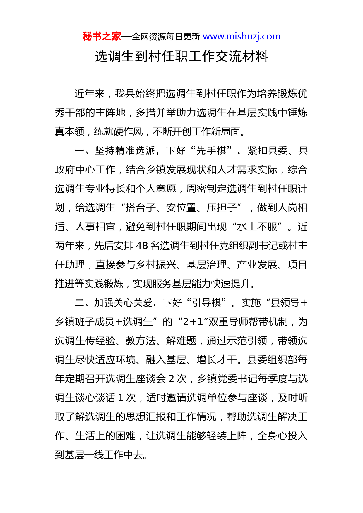 秘书之家—全网资源每日更新www.mishuzj.com选调生到村任职工作交流材料近年来,我县始终把选调生到村任职作为培养锻炼优秀干部的主阵地,多措并举助力选调生在基层实践中锤炼真本领,练就硬作风,不断开创工作新局面。一、坚持精准选派,下好“先手棋”。紧扣县委、县政府中心工作,结合乡镇发展现状和人才需求实际,综合选调生专业特长和个人意愿,周密制定选调生到村任职计划,给选调生“搭台子、安位置、压担子”,做到人岗相适、人事相宜,避免到村任职期间出现“水土不服”。近两年来,先后安排48名选调生到村任党组织副书记或村主任助理,直接参与乡村振兴、基层治理、产业发展、项目推进等实践锻炼,实现服务基层能力快速提升。二、加强关心关爱,下好“引导棋”。实施“县领导+乡镇班子成员+选调生”的“2+1”双重导师帮带机制,为选调生传经验、教方法、解难题,通过示范引领,带领选调生尽快适应环境、融入基层、增长才干。县委组织部每年定期召开选调生座谈会2次,乡镇党委书记每季度与选调生谈心谈话1次,适时邀请选调单位参与座谈,及时听取了解选调生的思想汇报和工作情况,帮助选调生解决工作、生活上的困难,让选调生能够轻装上阵,全身心投入到基层一线工作中去。秘书之家—全网资源每日更新www.mishuzj.com三、注重学做结合,下好“核心棋”。每年组织选调生参加市、县两级培训不少于2次,累计培训时间不少于90个学时,全方位开展党性教育、专业能力培训和知识培训,教育引导选调生坚定理想信念,严守纪律规矩,锤炼专业作风,健全知识体系。督促指导选调生进农家、察实情、听民声,围绕乡镇、村(社区)推进基层公共服务、发展新型集体经济、党建引领基层治理等方向开展村情、国情调研,撰写高质量村情综合报告20余篇、国情调研报告30余篇,着力提升选调生的为民情怀及推动地区高质量发展能力。四、强化日常管理,下好“关键棋”。乡镇党委结合实际制定《到村任职选调生日常管理办法》,建立完善管思想、管工作、管作风、管纪律的日常管理体系。由县级组织部门牵头,在充分征求选调单位、乡镇党委意见基础上,开展选调生到村任职期间的平时考核和年度考核,着重了解选调生德才表现和工作实绩,全方位、多角度考准考实到村任职表现情况,将考核结果与选调生任职定级、奖惩、提拔使用等挂钩,营造比学赶超、去芜存菁的良好氛围,进一步激励选调生干事创业、担当作为。五、完善资金保障,下好“致胜棋”。严格按照《选调生到村任职工作补助资金管理使用暂行规定》精神,通过加强资金保障、规范使用范围、强化监督管理,解决选秘书之家—全网资源每日更新www.mishuzj.com调生到村任职期间的生活安置、国情调研、服务群众、教育培训等经费开支,提高资金使用效益,为选调生在基层安心生活、砥砺奋斗保驾护航。