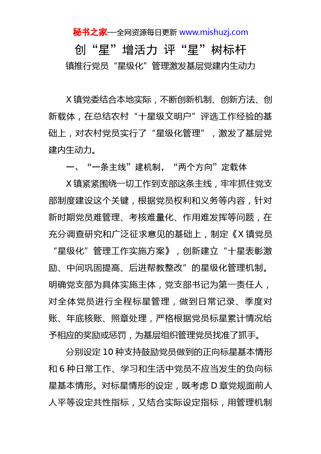 秘书之家—全网资源每日更新www.mishuzj.com创“星”增活力评“星”树标杆镇推行党员“星级化”管理激发基层党建内生动力X镇党委结合本地实际,不断创新机制、创新方法、创新载体,在总结农村“十星级文明户”评选工作经验的基础上,对农村党员实行了“星级化管理”,激发了基层党建内生动力。一、“一条主线”建机制,“两个方向”定载体X镇紧紧围绕一切工作到支部这条主线,牢牢抓住党支部制度建设这个关键,根据党员权利和义务等内容,针对新时期党员难管理、考核难量化、作用难发挥等问题,在充分调查研究和广泛征求意见的基础上,制定《X镇党员“星级化”管理工作实施方案》,创新建立“十星表彰激励、中间巩固提高、后进帮教整改”的星级化管理机制。明确党支部为具体实施主体,党支部书记为第一责任人,对全体党员进行全程标星管理,做到日常记录、季度对账、年底核账、照章处理,严格根据党员标星累计情况给予相应的奖励或惩罚,为基层组织管理党员找准了抓手。分别设定10种支持鼓励党员做到的正向标星基本情形和6种日常工作、学习和生活中党员不应当发生的负向标星基本情形。对标星情形的设定,既考虑D章党规面前人人平等设定共性指标,又结合实际设定指标,用管理机制秘书之家—全网资源每日更新www.mishuzj.com的导向作用和杠杆作用,激励先进、鞭策后进。正向标星情形包括有五爱、守法纪、勤致富、讲道德、学科技、重文教、树新风、履义务、重团结、爱卫生等十项;负向标星情形包括理想信念缺失、政治立场动摇、道德行为败坏、治家管家不严、作风举止不正、煽动造谣滋事等六项。在具体实施过程中,根据党员表现对满足负向标星情形的,相对应正向则不能得星。例如X镇缴板村3个党支部为强化党员示范作用,突出把党员带头办好事、干实事、带头创业等作为加减星的重要依据等。二、“三个步骤”标星值,“四条红线”严奖惩坚持“优秀评得准不准,先让群众审一审”的原则,通过三个步骤来确星定级。第一个步骤是党员互评互议,针对党员个人工作生活实际情况,严格对照标星情形,进行互相测评。第二个步骤是群众测评,由村党总支牵头,在各党支部开展党员互评的基础上,组织本支部所属的村民小组召开村民代表会议,对本支部的党员进行民主测评。在党员互评和群众测评环节,将每个党员每颗星所得星数除以参评人数,得出平均星数,等于或高于80%方可得该星。第三个步骤是组织评定,在党员互评、民主测评的基础上,由村党总支组织召开党总支扩大会议,综合各方面评议结果,审查党员相关档案及平时工作、生活的一贯表现,同时征求综治、计生、纪检、司法、派出所等部秘书之家—全网资源每日更新www.mishuzj.com门的意见,假如存在违反以上情形之一,则该星实行一票否决制,最终提出对每户的评议意见,确定“十星”评选结果。将标星结果与党员评先选优、提拔任用、奖励扶持等挂钩。标星10星范围内,满10星的,设定鼓励、推优、奖励、扶持四条线。对评定为“九星”“八星”的,设定鼓励、帮助、引导、支持四条线;对评定为“七星级”(含“七星级”)以下的,设定预警、约谈、劝退、除名四条线。在实际运用中,各党支部依托考核细则,结合自身工作实际设立激励或惩戒的事项。三、党建引领作用强,推动发展显成效党员“星级化”管理推行以来,增强了党员主动履行义务的责任心和使命感,有效推动形成党员自觉尊崇社会公德、职业道德、家庭美德,认真履行党员义务,争做优秀党员的良好局面。一是支部的堡垒作用更加有力。党员“星级化”管理有效激活了基层党组织细胞,党员在群众中主动亮出了身份,在各项重点工作中对号入座,党员紧紧团结在党组织周围,积极响应党组织号召。找准脱贫攻坚目标和方向,按照党建引领、产业支撑、群众给力的工作思路,实现了贫困群众真脱贫、脱真贫。基础设施有保障。完成道路硬化、水利设施建设、农网改造、垃圾池和焚烧炉建设、亮化工程太阳能路灯安装、人居环境提升工秘书之家—全网资源每日更新www.mishuzj.com程及住房安居工程等。二是党员队伍整体素质得到较大提高。坚持“党要管党、从严治党”的原则,按照践行“四讲四有”、争做“四个合格”党员的标准,积极落实“十星表彰激励、中间巩固提高、后进帮教整改”的总体要求,彻底改变了缴板村党员队伍思想认识不足、素质参差不齐、责任主体意识不强的局面,党员干部队伍整体素质得到明显提高。三是助推经济社会发展。积极参加实用技术培训、带头大力发展产业、带头参加公益事业建设、带头支持项目建设的协调工作、带头模范遵规守纪、带头宣传党的惠民政策、带头在群众中做到“自强、诚信、感恩”。带头用科技致富产业发展显成效。四是群众意识再提升。通过星级化管理,聚广大党员干部之力,广泛宣传党和国家的方针政策,助力乡村振兴。四、党员先锋作用好,村风村貌大改观一是推行党员“星级化”管理,为党员在工作和生活中设置了红线和底线,让党员管理有了“硬抓手”“硬杠杠”,促进了党员量化考评工作的真实性和针对性,推动党员充分履职、发挥先锋模范作用。二是通过营造比、学、赶、帮、超的创先争优氛围,开展“学示范、创示范,学典型、创典型”活动,