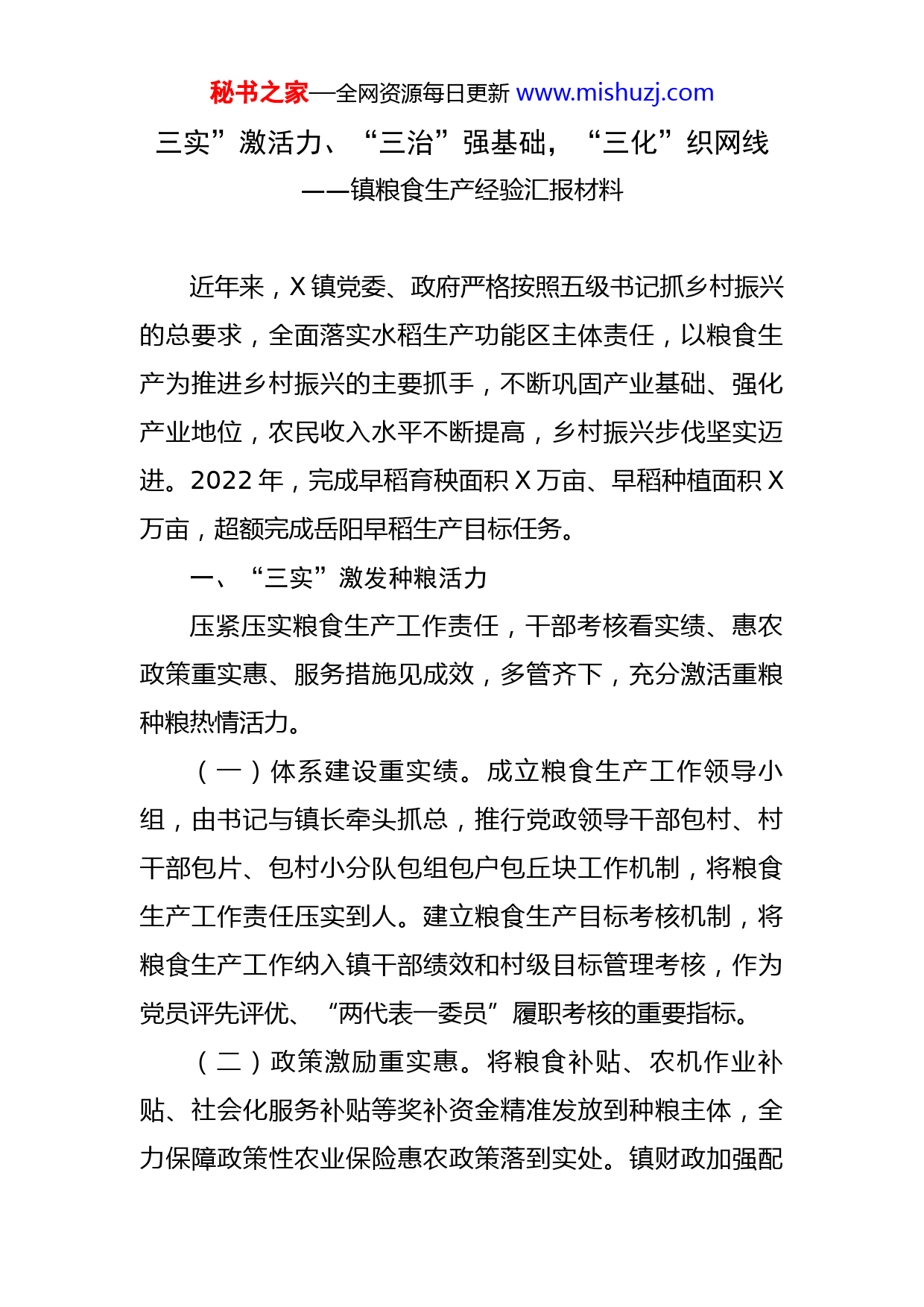 秘书之家—全网资源每日更新www.mishuzj.com三实”激活力、“三治”强基础,“三化”织网线——镇粮食生产经验汇报材料近年来,X镇党委、政府严格按照五级书记抓乡村振兴的总要求,全面落实水稻生产功能区主体责任,以粮食生产为推进乡村振兴的主要抓手,不断巩固产业基础、强化产业地位,农民收入水平不断提高,乡村振兴步伐坚实迈进。2022年,完成早稻育秧面积X万亩、早稻种植面积X万亩,超额完成岳阳早稻生产目标任务。一、“三实”激发种粮活力压紧压实粮食生产工作责任,干部考核看实绩、惠农政策重实惠、服务措施见成效,多管齐下,充分激活重粮种粮热情活力。(一)体系建设重实绩。成立粮食生产工作领导小组,由书记与镇长牵头抓总,推行党政领导干部包村、村干部包片、包村小分队包组包户包丘块工作机制,将粮食生产工作责任压实到人。建立粮食生产目标考核机制,将粮食生产工作纳入镇干部绩效和村级目标管理考核,作为党员评先评优、“两代表一委员”履职考核的重要指标。(二)政策激励重实惠。将粮食补贴、农机作业补贴、社会化服务补贴等奖补资金精准发放到种粮主体,全力保障政策性农业保险惠农政策落到实处。镇财政加强配秘书之家—全网资源每日更新www.mishuzj.com套资金投入,采取以奖代投的方式,优先支持涉农项目建设,重点解决部分丘块灌溉不便、产量不高等问题,让种粮主体获得实实在在的收益。(三)服务支撑重实效。加强与农业科研院校、农业农村主管部门的沟通对接,定期邀请专家教授、农业科技服务团队,以培训讲座、田间课堂等形式,为种粮大户、农民朋友提供粮食生产技术指导。重点推广测土配方施肥、病虫害专业化统防统治等标准化技术服务,扩大机械化作业范围。在确保大户降低生产成本的基础上,做到精耕细作,提高产量、提升品质、增加收益。加强与保险公司、金融机构的深度合作,为散户、大户统筹提供金融保险服务二、“三治”夯实种粮基础从改善种植条件入手,坚决杜绝耕地抛荒,切实防止耕地“非粮化”“非农化”,积极探索产业结构调整,全面筑牢粮食生产基础。(一)兴水利、治出水旱无忧。积极争取高标准农田建设项目的落地见效。近年来,共引进中央及省市投资X余万元,平整土地X亩、改良土壤X万亩、整修山塘X座,新建拦河坝X座、泵站X座、衬砌渠道X公里、渠系建筑物X座、整修机耕道X公里、栽植农田防护林X万余株、新建农药垃圾收集池X座,建成了X片区共X万亩水秘书之家—全网资源每日更新www.mishuzj.com旱无忧的高标准农田。实现高标准农田双季稻全覆盖,预计亩均增产增收X%以上。(二)调结构、治出丰收如歌。对灌溉不便的高岸田、冷浸塝田,通过开沟理水,增施有机肥等技术措施,进行种植结构调整。大力发展玉米、大豆、红薯等旱杂粮,因地适宜推广X瓜果、葛根、黄桃、瓜蒌等经济作物种植,建设了辣椒、茄子、丝瓜等蔬菜种植基地、正亚农产品仓储冷链物流园,力争将X打造成为湘北最大的蔬菜粮油菜蔬瓜果供给基地。多样化的种植模式在保证粮食种植面积的同时,也有效拓宽了全镇群众的致富门路。(三)禁抛荒、治出田园如画。推进抛荒耕地治理网格化管理,建立“镇干部包村、村干部包组”的分片包干责任制度。组织镇村组干部对全镇抛荒丘块进行全面摸底,建立台账。对抛荒地分户建档立卡、动态管理、做到挂图作战、对账销号。对长期外出务工农户、缺劳动力户、种植意愿不强户,下达限期治理通知书,督促其自行复耕复种或土地流转。对抛荒2022年以上的承包户,取消次年度耕地地力保护补贴直至复耕复种;对连续抛荒2022年以上耕地取消土地承包权,交村委会统一流转。通过铁腕整治,共收回土地承包权X亩,流转土地X亩,使X亩抛荒地得到了有效整治。三、“三化”织密种粮网线秘书之家—全网资源每日更新www.mishuzj.com督促散户自主种、鼓励大户连片种、支持托管社会种,从个体到组织,构建三位一体的种植网格,切实解决“谁来种”的难题。(一)集中连片大户化。积极推进农村土地有序流转和适度规模经营,着力培育懂技术、懂经营、有实力的新型农民,在资金、政策、技术上全方位重点支持,鼓励引导其连片种植优质稻。全镇共培育专业合作社、种粮大户等农业新型经营主体X家,流转土地X余亩,全镇X%的耕地实现流转耕种,粮食生产走上了集约化、规模化、机械化发展的崭新道路。(二)“十代”托管社会化。充分利用惠农服务中心、农技推广中心等主体,对播种、育秧、插秧等环节全程技术指导。鼓励农户向专业公司购买服务,大力推广代耕、代育、代抛(插)、代收、代储、代售,开展合作式、订单式、托管式服务。全镇共托管耕地X亩、半托管耕地X亩,粮食生产实现了翻耕、施肥、机插、机锄、机收、无人机植保、风干等机械化作业全覆盖。(三)零散丘块散户化。通过层层召开会议、发放宣传资料、微信群、广播“村村响”等方式进行广泛宣传,鲜明“有种有补、不种不补”“谁种粮谁受益”的导向,营造重粮种粮的浓厚氛围,调动农民和各类经营主体发展粮食生产的积极性。充分发挥本地镇干部、寓外乡友、秘书之家—全网资源每日更新www.mishuzj.com“两代一委员”的示范作用,集中开展“种好爱国粮献礼”党员活动日,督促本地镇干部、村干部、党员注重