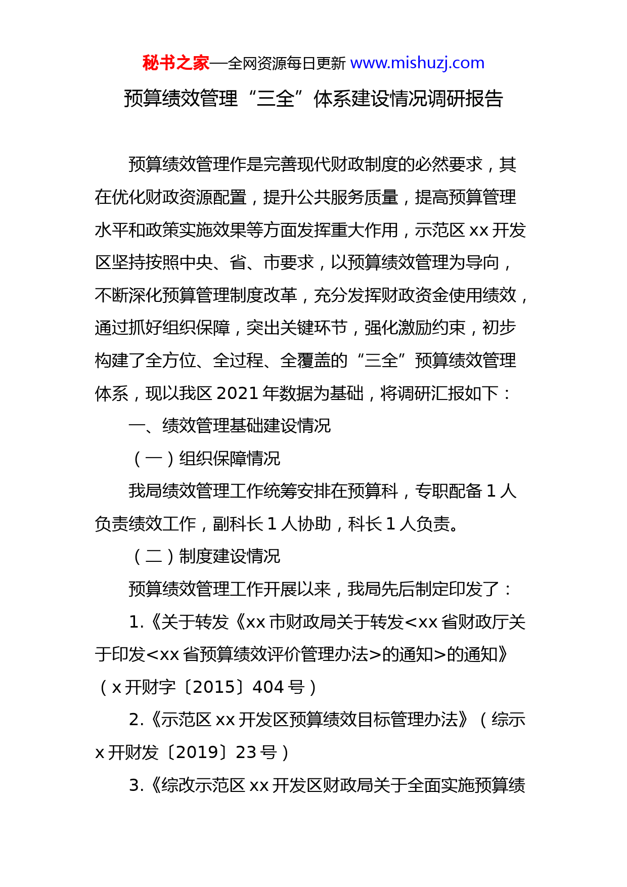 秘书之家—全网资源每日更新www.mishuzj.com预算绩效管理“三全”体系建设情况调研报告预算绩效管理作是完善现代财政制度的必然要求,其在优化财政资源配置,提升公共服务质量,提高预算管理水平和政策实施效果等方面发挥重大作用,示范区xx开发区坚持按照中央、省、市要求,以预算绩效管理为导向,不断深化预算管理制度改革,充分发挥财政资金使用绩效,通过抓好组织保障,突出关键环节,强化激励约束,初步构建了全方位、全过程、全覆盖的“三全”预算绩效管理体系,现以我区2021年数据为基础,将调研汇报如下:一、绩效管理基础建设情况(一)组织保障情况我局绩效管理工作统筹安排在预算科,专职配备1人负责绩效工作,副科长1人协助,科长1人负责。(二)制度建设情况预算绩效管理工作开展以来,我局先后制定印发了:1.《关于转发《xx市财政局关于转发的通知>的通知》(x开财字〔2015〕404号)2.《示范区xx开发区预算绩效目标管理办法》(综示x开财发〔2019〕23号)3.《综改示范区xx开发区财政局关于全面实施预算绩秘书之家—全网资源每日更新www.mishuzj.com效管理实施方案》(综示x开财发〔2019〕214号)4.《示范区xx开发区预算绩效运行监控管理暂行办法》(综示x开财发〔2020〕96号)(三)指标体系建设情况参照《财政部关于印发项目支出绩效评价管理办法的通知》(财预〔2020〕10号)、《xx市财政局2018年预算绩效评价实施方案》(市财绩效〔2018〕3号)执行。(四)信息公开情况目前我区已实现绩效信息的公开,各预算单位预算公开同步公开绩效目标,决算公开同步公开绩效评价情况。(五)信息系统建设和使用情况2021年度绩效目标管理纳入预算一体化系统。二、“三全”绩效管理体系建设情况(一)全方位绩效管理1.政府预算绩效管理目前已将政府支出纳入预算绩效管理,包括一般公共预算和政府基金预算支出,着力对国家重大发展战略和综改区重点改革领域的支出绩效管理,确保财政资源高效配置,增强财政可持续性。2.部门和单位预算绩效管理强化了各预算单位绩效管理主体责任意识,2020年我区各预算部门均制定了绩效自评办法或实施方案。另逐步秘书之家—全网资源每日更新www.mishuzj.com扩大部门整体支出绩效评价试点,围绕部门职责、行业发展规划,以预算资金为主线,统筹考虑资产和业务活动从运行成本、履职效能、社会效应、可持续发展能力和服务对象满意度等方面衡量部门整体及核心业务实施效果。3.政策和项目预算绩效管理区本级50万元以上绩效类项目预算绩效管理全面开展绩效管理(部门没有50万元项目,自行选取1个资金量大的项目开展),从数量、质量、时效、成本、效益等方面综合衡量政策和项目预算资金使用效果,目前实现了项目支出绩效评价预算部门全覆盖。我区政策预算绩效管理暂未开展。(二)全过程绩效管理1.事前绩效评估针对我区综改后,以招商引资扶持为重点的支出特点,我区制定了《招商引资项目绩效评估实施方案》(综示x开管发〔2020〕58号),由主管部门负责专项对招商引资项目开展事前绩效评估。其他专项项目还在研究推动中。2.效目标管理我区制定了《示范区xx开发区预算绩效目标管理办法》(综示x开财发〔2019〕23号),项目类绩效目标已按要求全部开展目标管理,实现了预算部门全覆盖。3.绩效运行监控秘书之家—全网资源每日更新www.mishuzj.com我区制定了《示范区xx开发区预算绩效运行监控管理暂行办法》(综示x开财发〔2020〕96号),每年10月左右开展绩效运行监控,对绩效目标实现程度和预算执行进度实行“双监控”,并将绩效监控结果作为调整预算依据。4.绩效评价财政组织指导全区xx个预算单位完成对xxxx年度xx个项目xx.x亿元财政资金的绩效评价,占xxxx年度区级安排项目财政支出的xx%。其中产业扶持资金xx个项目x.xx亿元,实现了xxx万元以上资金第三方评价全覆盖,项目覆盖率达xx.x%;其他项目资金xx个项目xx.xx亿元,实现了xx万元以上项目自评全覆盖。同时,组织了综合办等xx个部门xxxx年度部门整体支出绩效评价工作,占到全区预算单位的xx%。绩效评价主要采取了预算单位自评、主管部门评价和财政部门重点抽评的方式,根据党工委会逐步扩大第三方评价范围的要求,较去年第三方评价资金占比xx%提升x个百分点至xx%,部门整体支出绩效评价个数占预算单位比提升xx个百分点,我区预算绩效管理正逐步走向规范。5.结果应用重点绩效评价结束后,我局汇总绩效评价情况形成全区正式的绩效评价报告,向党工委会议汇报,同时将重点秘书之家—全网资源每日更新www.mishuzj.com绩效评价结果以及经党工委会审议的具体处理意见反馈给相关部门,敦促相关部门落实具体处理结果和针对存在问题的整改,并将绩效评价结果与预算安排结合起来。绩效评价结果部门随同决算公开一并公开。(三)全覆盖绩效管理我区综改后,政府预算只有一般公共预算和政府基金预算两本预算,目前“两本预算”绩效评价已全覆盖。三、存在的问题和建议1.基层编制预算时间短,任务重,专业的社会评价力量不足,开展预算事前绩效评价和政策类项目绩效评价还存在较大困难。2.分行业、分领域、分层次的绩效指标体系尚未建立,绩效目标中指标设置和取值难度较大,部门整体支出绩效目标管理未开展。3.基层财政工作繁重,业务人员短缺,特别是绩效评价工作正逐步