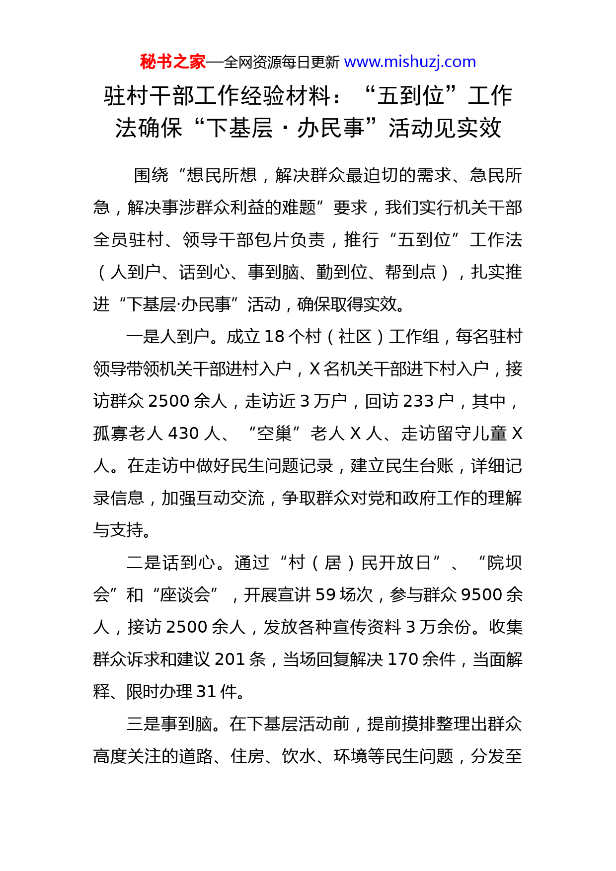 秘书之家—全网资源每日更新www.mishuzj.com驻村干部工作经验材料:“五到位”工作法确保“下基层·办民事”活动见实效围绕“想民所想,解决群众最迫切的需求、急民所急,解决事涉群众利益的难题”要求,我们实行机关干部全员驻村、领导干部包片负责,推行“五到位”工作法(人到户、话到心、事到脑、勤到位、帮到点),扎实推进“下基层·办民事”活动,确保取得实效。一是人到户。成立18个村(社区)工作组,每名驻村领导带领机关干部进村入户,X名机关干部进下村入户,接访群众2500余人,走访近3万户,回访233户,其中,孤寡老人430人、“空巢”老人X人、走访留守儿童X人。在走访中做好民生问题记录,建立民生台账,详细记录信息,加强互动交流,争取群众对党和政府工作的理解与支持。二是话到心。通过“村(居)民开放日”、“院坝会”和“座谈会”,开展宣讲59场次,参与群众9500余人,接访2500余人,发放各种宣传资料3万余份。收集群众诉求和建议201条,当场回复解决170余件,当面解释、限时办理31件。三是事到脑。在下基层活动前,提前摸排整理出群众高度关注的道路、住房、饮水、环境等民生问题,分发至秘书之家—全网资源每日更新www.mishuzj.com18个村(社区)工作组,各工作组先期组织成员讨论研究办法,制定解决方案。活动中,每名机关干部带着问题和办法下基层,对症下药提升解决效率。四是勤到位。工作组94名机关干部按时到位,定期召开工作进度会,集体研究解决问题办法;建立工作进度统计表,收集梳理问题,跟踪办理进度,确保件件有落实、事事有回音。由纪检办、党政办、党建办等3个办公室组成督查组,加大对下基层活动的检查,通报检查结果,促进工作落到实处。五是帮到点。根据XX村存在两委班子战斗力不强、党员教育管理制度不健全、村庄环境卫生较差等6方面问题,帮助该村确立了“服务农民、凝聚人心、致富XX,和谐XX”的发展理念,建强了一个村级班子,办理了一批民生实事,完成硬化王月璐、沙沱支路、斗篷支路等4,5公里;在XX村,帮助落实资金50万元,动员群众集资约X万元,落实水厂管网改造,受益群众1200人;积极与XX盐矿协调,在盐矿主管道上开通临时放水口,解决了4村的秧田缺水的问题,多方筹集资金X万元,修复水库的放水设施和4200米输水管道,保证水利设施真正起到抗旱保X的作用。
