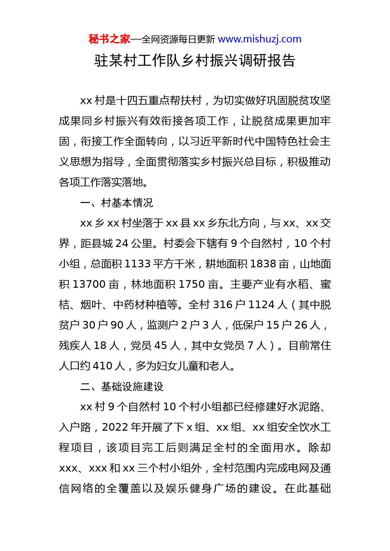 秘书之家—全网资源每日更新www.mishuzj.com驻某村工作队乡村振兴调研报告xx村是十四五重点帮扶村,为切实做好巩固脱贫攻坚成果同乡村振兴有效衔接各项工作,让脱贫成果更加牢固,衔接工作全面转向,以习近平新时代中国特色社会主义思想为指导,全面贯彻落实乡村振兴总目标,积极推动各项工作落实落地。一、村基本情况xx乡xx村坐落于xx县xx乡东北方向,与xx、xx交界,距县城24公里。村委会下辖有9个自然村,10个村小组,总面积1133平方千米,耕地面积1838亩,山地面积13700亩,林地面积1750亩。主要产业有水稻、蜜桔、烟叶、中药材种植等。全村316户1124人(其中脱贫户30户90人,监测户2户3人,低保户15户26人,残疾人18人,党员45人,其中女党员7人)。目前常住人口约410人,多为妇女儿童和老人。二、基础设施建设xx村9个自然村10个村小组都已经修建好水泥路、入户路,2022年开展了下x组、xx组、xx组安全饮水工程项目,该项目完工后则满足全村的全面用水。除却xxx、xxx和xx三个村小组外,全村范围内完成电网及通信网络的全覆盖以及娱乐健身广场的建设。在此基础秘书之家—全网资源每日更新www.mishuzj.com上,2022年xx村开展了3个基础设施项目(xxx堤坝建设和xx桥修建项目,xx组xx塘溢洪道新建,xx大塘清淤美化工程项目),用以满足农田灌溉需求。三、产业发展xx村是传统农业村,村里主要以水稻、蜜桔、烟叶、中药材种植为主。近年来,xx村借助乡村振兴战略,以公司+农户+土地流转的模式,引进xx药材种植公司,种植药材918亩(其中种植黄精20亩,木香718亩),预计能为村集体经济增收36万元。本村主导产业为烟叶种植,2022年预计增收8万元。引进xx果业有限公司,改造桔园品种,打造精品蜜桔,预计每年增收4万元。此外,xx村大力发挥返乡乡贤作用,2022年与乡贤合作在xx乡烟站开办服装加工厂,预计未来3年能带动xx乡周边闲置劳动力就业,每年增收24万元。四、人居环境xx村坚持把村净、树绿、天蓝、水清作为美丽大xx建设总目标,着力抓好垃圾治理、河道整治、村庄绿化等工作,为全村振兴发展提供绿色动力。以厕所革命为契机,对全村范围进行多次户厕问题摸排,卫生厕所普及率稳步提高,厕所粪污基本得到有效处理,生活污水问题得到管控。各村组都配有保洁员打扫卫生,定期开展环境卫生巡查检查,巩固垃圾清理成果;严格落实巡查员责任秘书之家—全网资源每日更新www.mishuzj.com制,加大宣传和奖惩力度,制止垃圾乱扔乱丢、乱倒乱排、乱挖乱采行为,确保村内环境卫生整洁。五、乡风文明建设xx村以培育和践行社会主义核心价值观为重点,不断向村民灌注建设中国特色社会主义的思想观念和道德要求。强化道德实践养成,积极倡导乡贤文化,健全完善村规民约,深入开展新时代文明实践活动;深化诚信建设活动,利用村内微信交流群平台,把诚信教育融入村民生活各方面,努力提高广大村民诚信素质。通过设立道德红黑榜、爱心公益超市、开展三讲一评感恩活动、发放《“推动移风易俗,树立文明新风”倡议书》,教育引导广大群众移风易俗,号召村民破除铺张流费等陈规陋习,倡导文明生活新方式,让社会主义核心价值观融入百姓生活,进一步提升群众的满意感、获得感、幸福感。六、短板弱项xx村在产业发展上仍以传统农业为主,产业发展内生动力不足,吸引不到更多的返乡人才,在人才兴旺、产业兴旺方面略显疲软。此外,xx村重点基础设施的建设(xx至xx道路硬化、xxx和xxx信号建设等)受到约束,限制了精神文明更上一层楼。市人社局工作队到xx村驻村后,大力开展调研,切实履行工作职责,并在市局领导的关怀下解决xx组无信号的秘书之家—全网资源每日更新www.mishuzj.com问题。今后将继续落实上级政策,确保乡村振兴工作顺利开展。