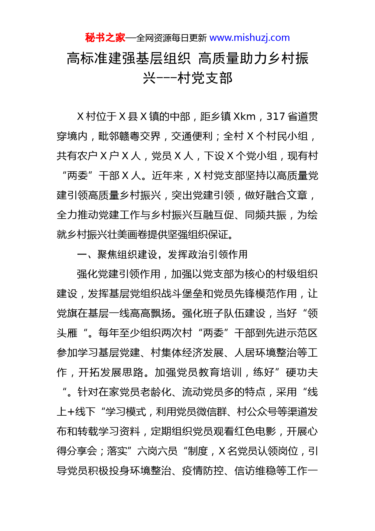 秘书之家—全网资源每日更新www.mishuzj.com高标准建强基层组织高质量助力乡村振兴---村党支部X村位于X县X镇的中部,距乡镇Xkm,317省道贯穿境内,毗邻赣粤交界,交通便利;全村X个村民小组,共有农户X户X人,党员X人,下设X个党小组,现有村“两委”干部X人。近年来,X村党支部坚持以高质量党建引领高质量乡村振兴,突出党建引领,做好融合文章,全力推动党建工作与乡村振兴互融互促、同频共振,为绘就乡村振兴壮美画卷提供坚强组织保证。一、聚焦组织建设,发挥政治引领作用强化党建引领作用,加强以党支部为核心的村级组织建设,发挥基层党组织战斗堡垒和党员先锋模范作用,让党旗在基层一线高高飘扬。强化班子队伍建设,当好“领头雁“。每年至少组织两次村“两委”干部到先进示范区参加学习基层党建、村集体经济发展、人居环境整治等工作,开拓发展思路。加强党员教育培训,练好”硬功夫“。针对在家党员老龄化、流动党员多的特点,采用“线上+线下“学习模式,利用党员微信群、村公众号等渠道发布和转载学习资料,定期组织党员观看红色电影,开展心得分享会;落实”六岗六员“制度,X名党员认领岗位,引导党员积极投身环境整治、疫情防控、信访维稳等工作一秘书之家—全网资源每日更新www.mishuzj.com线,坚持在干中学、学中干,不断提高党员队伍素质。注重后备力量培育,建好”蓄水池“。确保至少有X名村级后备力量,从35岁以下、高中文化程度以上的青年农民、致富能手或转业、退伍军人中发展人选,培育书记梯队人选X人,大专学历以上后备干部X人,为每名村级后备干部落实X名村干部与其结对帮带,主要以谈心谈话、实践指导为主,重点传授积累的工作经验、成熟的工作方法和具体的工作技巧。二、聚力产业兴旺,提升富民强村水平多措并举持续壮大村集体经济,形成产业链条,2021年X村村集体经济经营性收入达X万元。突出主导优势产业。做强蔬菜亮点产业,成立正禾农业专业合作社,在庙湾里、水背塘小组建成X亩蔬菜大棚基地,多茬种植螺丝椒37-94品种面积每年突破X亩,采取“村集体+农户”的模式,形成集土地流转、基地种植、经营销售于一体的产业链,带动农户尤其是脱贫户创收致富。持续推进富硒蔬菜认证,打造富硒品牌,依托X村蔬菜基地冷库,筹资建设农产品初加工厂,延长产业链。打造“千担村”特色品牌。X村注重突出党员的示范引领作用、发挥政策的激励引导作用、提升产业的致富“造血”功能,年种植烟叶面积达X亩,年产量稳定突破千担,新建X座烟叶烤房,不断提升烟叶烘烤质量,增加烟草产业经济效益,成为名副秘书之家—全网资源每日更新www.mishuzj.com其实的烟叶“千担村”。擦亮湖羊产业“新名片”。2022年计划采取“龙头企业+合作社+养殖大户+散户”的运营发展模式,与龙头企业签订合同,引进优良种羊,由村集体合作社、养殖大户、散户三方出资认购种羊,由龙头企业统一技术指导、统一饲养管理、统一收购销售,利润分红,带动农户务工,解决就业,增收创收。三、聚效基层治理,打造宜居宜业环境多方联动凝聚合力,探索多元共治新路径,激活基层治理新活力。织密治理网格。推行“党建引领、网格治理、党员入格”模式,着力打造集政治引领、社会治理、便民服务为一体的基层治理单元,建立“乡镇党委—村党组织—包联干部—网格长(村民小组长)—网格员—联系户”的组织架构,每个网格组建“一名指导员、一名网格长、两名专职网格员、四名兼职网格员”的管理服务团队,合力做好乡村治理各项工作。加强法治建设。引导好农村“法律明白人”骨干和人民调解员主动参与到基层法治实践活动中,强化基层法律服务队伍建设和能力建设;在每月村民大会、党员大会和重点节日里发放法律宣传手册,在微信群、村公众号转发法律知识链接等,广泛普及法律知识,营造浓厚法治氛围。激发自治活力。成立村务监督委员会,发挥小组长、乡贤和“五老”顾问的作用,让村民参与、监督,调动了村民参与村务的主动性,增强秘书之家—全网资源每日更新www.mishuzj.com了党员群众关系的紧密性。倡导德治思维。深入推进农村移风易俗,全面开展“道德红黑榜”评议活动,广泛开展“道德模范”“身边好人”“孝亲敬老”等评选活动,持续培育乡风文明,不断提高乡村社会文明程度。提升“智治”水平。X村先行试点全省平安数字乡村建设,积极探索乡村治理新模式,以智能化手段提升乡村治理“智治”水平。四、聚情民生福祉,巩固脱贫攻坚成果落实脱贫攻坚过渡期要求,保持现有帮扶政策总体稳定,确保政策不留空白、工作不留空档,有效衔接乡村振兴。扎实开展动态监测。健全“早发现、早干预、早帮扶”的动态监测机制,重点关注脱贫户、“三类对象”、大病户和突发困难户,实行分类帮扶和因户施策,坚决守住返贫致贫底线。严格进行全面排查。定期对全村农户进行常态化排查,不漏一户,不落一人,现场研判,及时制定帮扶措施;赣州市农业农村局驻村以来,共走访“三类对象”X户X次、脱贫户X户X次、一般农户X次,掌握实情、排查问题、精准施策,确保“一达标、两不愁、三保障”问题动态清零。充分发挥联动作用。强化产业带动就业,引导脱贫户参与乡村振兴项目,鼓励扶持其发展产业,实现增收创收,提高生活质量。秘书之家—全网