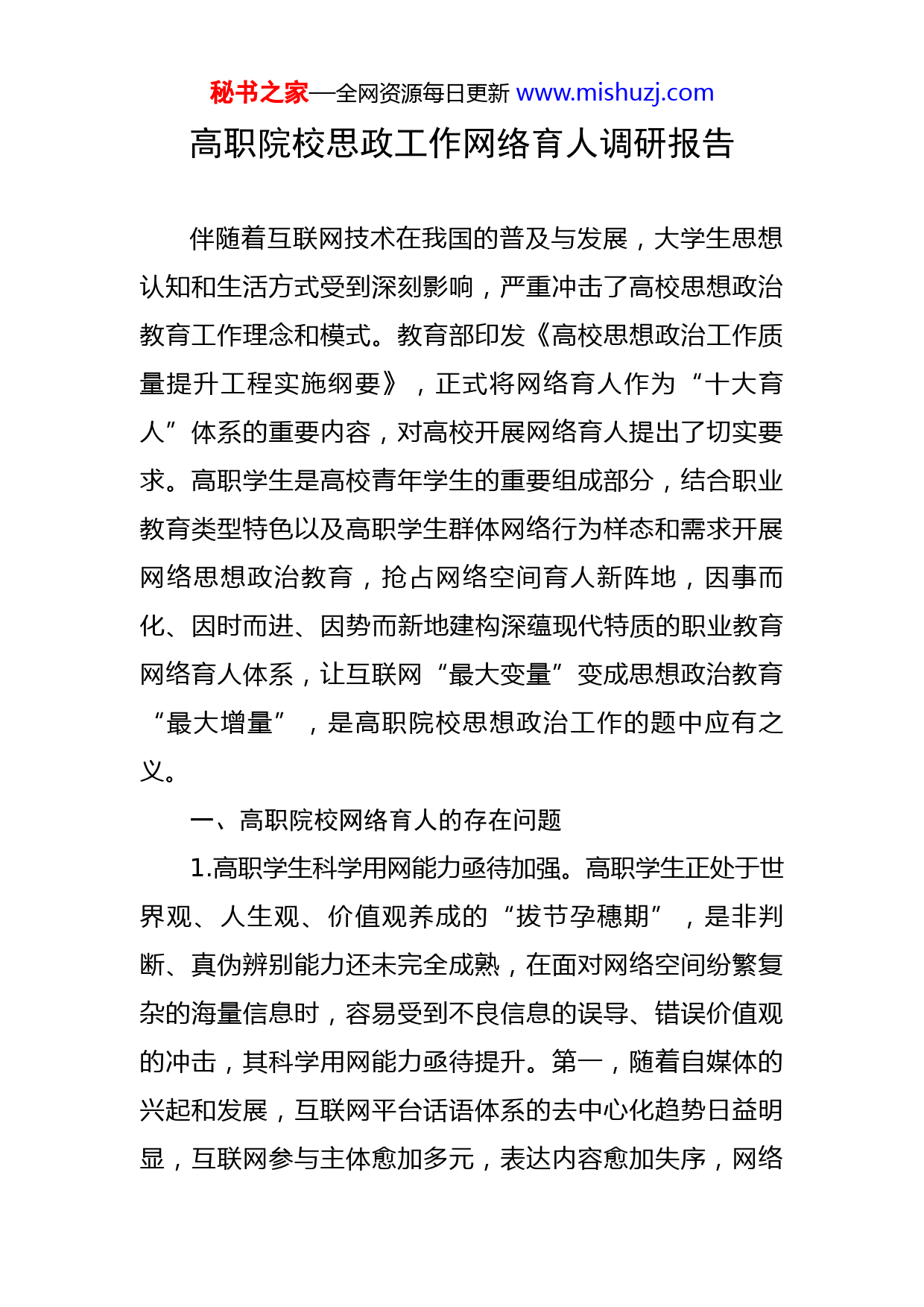 秘书之家—全网资源每日更新www.mishuzj.com高职院校思政工作网络育人调研报告伴随着互联网技术在我国的普及与发展,大学生思想认知和生活方式受到深刻影响,严重冲击了高校思想政治教育工作理念和模式。教育部印发《高校思想政治工作质量提升工程实施纲要》,正式将网络育人作为“十大育人”体系的重要内容,对高校开展网络育人提出了切实要求。高职学生是高校青年学生的重要组成部分,结合职业教育类型特色以及高职学生群体网络行为样态和需求开展网络思想政治教育,抢占网络空间育人新阵地,因事而化、因时而进、因势而新地建构深蕴现代特质的职业教育网络育人体系,让互联网“最大变量”变成思想政治教育“最大增量”,是高职院校思想政治工作的题中应有之义。一、高职院校网络育人的存在问题1.高职学生科学用网能力亟待加强。高职学生正处于世界观、人生观、价值观养成的“拔节孕穗期”,是非判断、真伪辨别能力还未完全成熟,在面对网络空间纷繁复杂的海量信息时,容易受到不良信息的误导、错误价值观的冲击,其科学用网能力亟待提升。第一,随着自媒体的兴起和发展,互联网平台话语体系的去中心化趋势日益明显,互联网参与主体愈加多元,表达内容愈加失序,网络秘书之家—全网资源每日更新www.mishuzj.com信息包罗万象,网络乱象层出不穷,迫切要求高职学生增强网络辨别力。第二,绝大多数高职学生的年龄介于18岁至23岁之间,兴趣涉猎广泛,有一定的猎奇心理,对社会焦点问题及舆论事件关注度较高,但由于缺乏相应的社会经验,思想不够成熟,所以极易被错误观点和不良思潮误导,高职学生的理性思维能力亟待提高。第三,部分学生在网络游戏的虚拟世界中收获了现实生活中所没有的成就感和满足感,容易沉溺于网络空间之中,网络成瘾问题突出,高职学生在网络空间的自我管理能力亟待加强。2.高职院校网络空间治理能力有待提高。第一,核心技术有待提升。当前我国虽在网络信息技术方面的自主研发能力不断增强,但仍有部分核心技术设备依赖进口,面临着“卡脖子”的网络技术难题,使得我国网络信息技术的发展受到西方国家的掣肘,难以实施有效的网络意识形态管控,无形中为西方腐朽思潮的传播与蔓延提供了可乘之机。第二,管理方式有待创新。一方面,网络信息技术的发展以及笔记本电脑、智能手机等移动终端设备的广泛应用,助推了高职学生主体性的发挥。另一方面,网络空间的虚拟性、匿名性特征导致高职学生缺乏网络空间中的行为自律,网络信息传播的即时性和不可控性也在无形中增加了他们的试错成本。高职学生不仅是信息的接受者,还是信息的创造者和传播者,更有甚者会沦为不实消息与不秘书之家—全网资源每日更新www.mishuzj.com当言论的生产者。但高职院校难以及时监督和调控学生的不良行为,其网络治理滞后性的弊病日益凸显。如何提升学生网络媒介素养,如何加大网络监管,如何健全网络舆情预警机制,提高思想政治工作的时效性,是提升高职院校网络空间治理能力需要直面的问题。3.高职院校网络育人创新力度亟待增强。第一,网络育人方式有待革新。高职院校网络育人管理主体是学校党政部门、群团组织,管理对象为学生、教师,管理决策模式主要表现为学校的单向决策,在具体的思想政治教育活动中存在对学生进行灌输式说教现象。然而,伴随着各种思潮借助互联网在校园内不断交流交融交锋,高职学生表达意愿不断提升,表达途径不断拓展,教育教学逐渐形成去权威化倾向,传统说教管理模式受到排斥,运用互联网思维创新和完善网络育人工作势在必行。第二,网络育人品牌创建不力。相较于本科高校,高职院校网络平台建设方面投入资源不多,在网络文化作品上缺乏创新性,未能充分发挥高等职业教育的特色和优势,未能形成体系化的特色项目和品牌文化,高职院校探究网络育人的创新力度还需加强。二、高职院校网络育人的增效路径1.理念更新:全时全域引导理念贯穿始终。高职院校要坚持以生为本的“用户思维”,灵活运用讲授、启发、互秘书之家—全网资源每日更新www.mishuzj.com动、体验等方法,运用网络技术贯穿学生课内课外、线上线下,实现对学生的全时全域引导,增强网络育人的实效性。第一,引导方式追求全时全域。首先要立好“第一课堂”,帮助学生“扣好人生第一粒扣子”。高职院校在思想政治课堂上要直面网络热点问题,将鲜活的网络资源融入课堂教学中,及时帮助高职学生分析和处理疑点、难点,引导和激励他们坚持真理、坚守理想、坚定信念。其次要丰富“第二课堂”,巩固学生的学习效果。高职院校在思想政治教育中要聚焦学生思想困惑,以学生喜闻乐见的方式开展网络文明宣传教育系列活动,筑牢课下“育人空间”。最后要站好“第三课堂”,实施“互联网+”战略。高职院校要积极运用微信、微博、抖音等平台,推动网络育人阵地建设,打造生动活泼、脍炙人口的原创精品,牢牢占据网络“育人空间”。第二,育人队伍力求全员全域。在网络空间有效开展育人工作的关键是人,高职院校要加强专职队伍建设。“三全育人”格局下,高职院校要把所有教职员工都纳入网络育人队伍,对队伍成员实施分类管理,进行专业培训,使人人各尽其能、各展所长,实现思想政治素质和