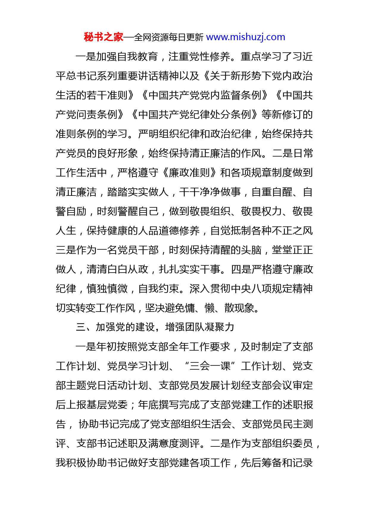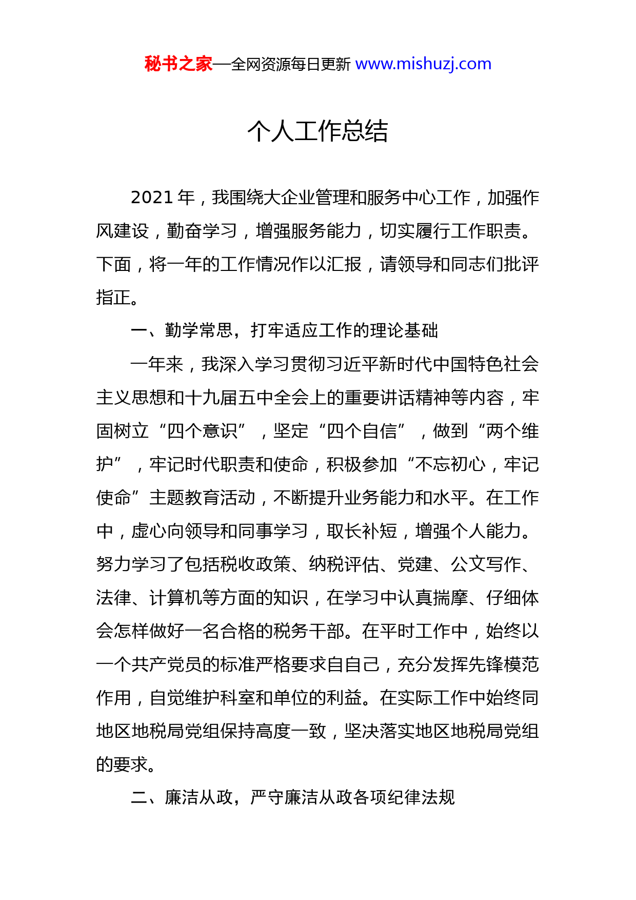 秘书之家—全网资源每日更新www.mishuzj.com个人工作总结2021年,我围绕大企业管理和服务中心工作,加强作风建设,勤奋学习,增强服务能力,切实履行工作职责。下面,将一年的工作情况作以汇报,请领导和同志们批评指正。一、勤学常思,打牢适应工作的理论基础一年来,我深入学习贯彻习近平新时代中国特色社会主义思想和十九届五中全会上的重要讲话精神等内容,牢固树立“四个意识”,坚定“四个自信”,做到“两个维护”,牢记时代职责和使命,积极参加“不忘初心,牢记使命”主题教育活动,不断提升业务能力和水平。在工作中,虚心向领导和同事学习,取长补短,增强个人能力。努力学习了包括税收政策、纳税评估、党建、公文写作、法律、计算机等方面的知识,在学习中认真揣摩、仔细体会怎样做好一名合格的税务干部。在平时工作中,始终以一个共产党员的标准严格要求自自己,充分发挥先锋模范作用,自觉维护科室和单位的利益。在实际工作中始终同地区地税局党组保持高度一致,坚决落实地区地税局党组的要求。二、廉洁从政,严守廉洁从政各项纪律法规秘书之家—全网资源每日更新www.mishuzj.com一是加强自我教育,注重党性修养。重点学习了习近平总书记系列重要讲话精神以及《关于新形势下党内政治生活的若干准则》《中国共产党党内监督条例》《中国共产党问责条例》《中国共产党纪律处分条例》等新修订的准则条例的学习。严明组织纪律和政治纪律,始终保持共产党员的良好形象,始终保持清正廉洁的作风。二是日常工作生活中,严格遵守《廉政准则》和各项规章制度做到清正廉洁,踏踏实实做人,干干净净做事,自重自醒、自警自励,时刻警醒自己,做到敬畏组织、敬畏权力、敬畏人生,保持健康的人品道德修养,自觉抵制各种不正之风三是作为一名党员干部,时刻保持清醒的头脑,堂堂正正做人,清清白白从政,扎扎实实干事。四是严格遵守廉政纪律,慎独慎微,自我约束。深入贯彻中央八项规定精神切实转变工作作风,坚决避免慵、懒、散现象。三、加强党的建设,增强团队凝聚力一是年初按照党支部全年工作要求,及时制定了支部工作计划、党员学习计划、“三会一课”工作计划、党支部主题党日活动计划、支部党员发展计划经支部会议审定后上报基层党委;年底撰写完成了支部党建工作的述职报告,协助书记完成了党支部组织生活会、支部党员民主测评、支部书记述职及满意度测评。二是作为支部组织委员,我积极协助书记做好支部党建各项工作,先后筹备和记录秘书之家—全网资源每日更新www.mishuzj.com了支部委员会21次、党员大会10次,协助书记专题研究党建工作,涉及党建工作议题50余个;及时按要求筹备支部书记讲党课8次,做好了党课教育的会议记录;结合“三会一课”协商书记开展支部主题党日活动12次,做好了12次党日活动记录;每季度按期开展了“党员先锋岗评选”工作;积极督导宣传委员做好党员学习,督促党小组组长开好党小组会议;每月及时督促党员缴纳党费。三是扎实做好党组织日常工作。严格按照机关党委党支部工作清单落实各项党建工作,每天按时完成党支部日常工作,2021年向党办上报了各类报表和汇报材料130余次,切实把一分局的党建工作不断做实做细。四是认真撰写心得体会20余篇每天按时在“学习强国”APP上开展学习,运用微信公众号等新媒体开展党建知识学习。五是积极参加了支部的各类文艺活动;按照要求做好了精神文明各项工作。六是对党建工作资料及时归类,进一步完善了党建档案的收集装订工作。四、尽心尽责,努力完成各项工作任务一是认真完成了各类材料的撰写。撰写了区局一分局和地区局要求上报的文稿和综合性材料,完成了第一税务分局2021年度工作计划、重点工作任务;撰写了2021年科室年度工作总结和各类汇报材料20余份;每周、每月、每季按时向办公室报送科室小结。二是认真做好了各类会秘书之家—全网资源每日更新www.mishuzj.com议工作。协助科长做好了每周工作例会工作,记录会议46次,出例会纪要46期,协助科长做好了廉政工作会议,“转提优”工作例会,记录会议6次,出会议纪要6期。三是认真完成领导交办的督查督办重要工作事项,对每次会议的工作要求及时在工作群里进行督促。四是认真做好了公文工作,每天及时处理一分局公文,2021年处理收文1493份,审核处理发文37份。四是做好了信息宣传工作,制定了年度信息报送计划,对科室的信息及时修改上报,顺利完成了2021年的上稿任务。五是承接机关公共绩效考核工作。共承担地区局机关共性考核29项中的23项考核指标工作的承接和落实,全年顺利完成承接的共性指标工作的任务。六是认真做好科室内勤工作,按照要求及时完成了地区局机关每天要求上报的名单、报表、材料、数据全年上报93次。七是认真做好科室资产、档案、考勤等日常事务性工作;对固定资产、评估档案、日常考勤制定详细的清单进行电子登记和书面登记,确保固定资产、评估档案、日常考勤登记有序,有据可查。八是根据要求年初修订了科室相关制度,并对科室制度形成了制度汇编。九是9月份被区局抽调到“不忘初心牢记使命”主题教育第六巡回指导组,积极服从组长的安排,按照要求进行巡回指导,及时上报各类资料30余份,顺利完成了该项工作。五、工作中