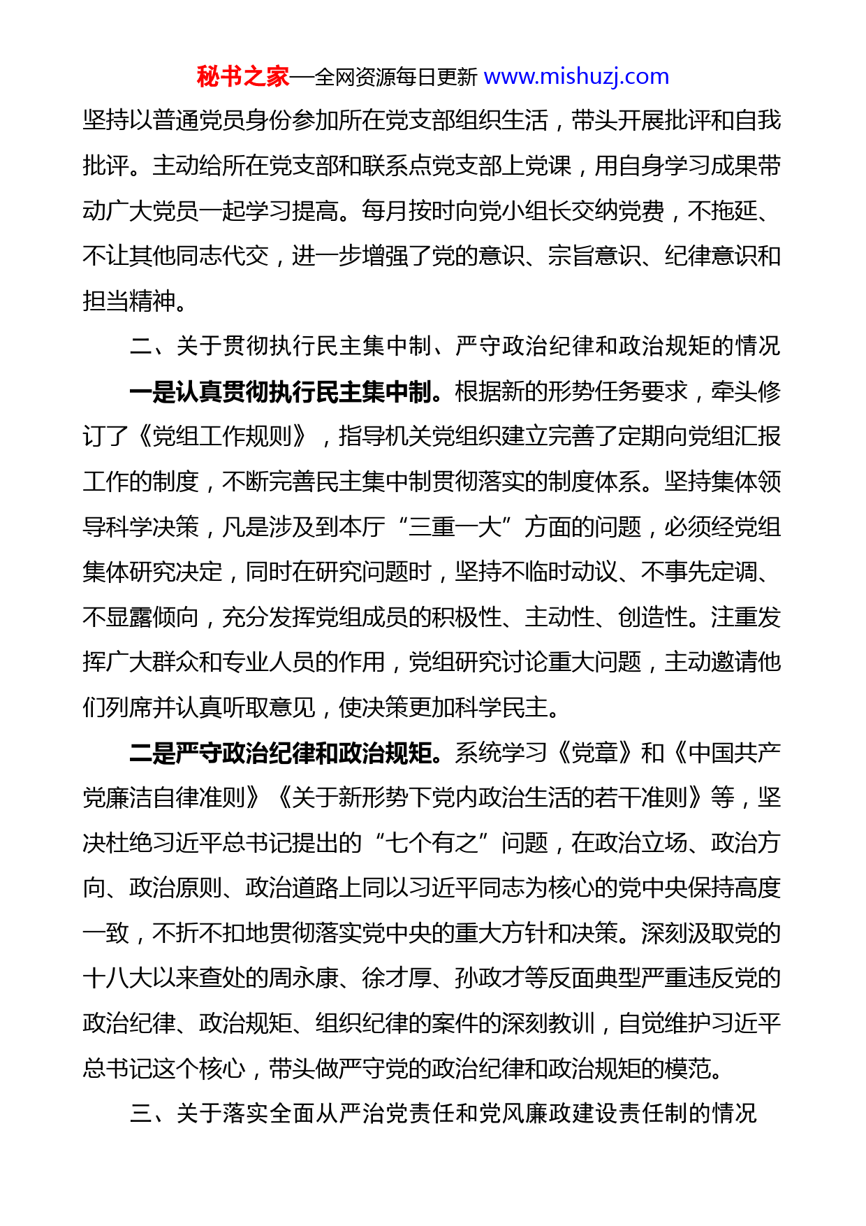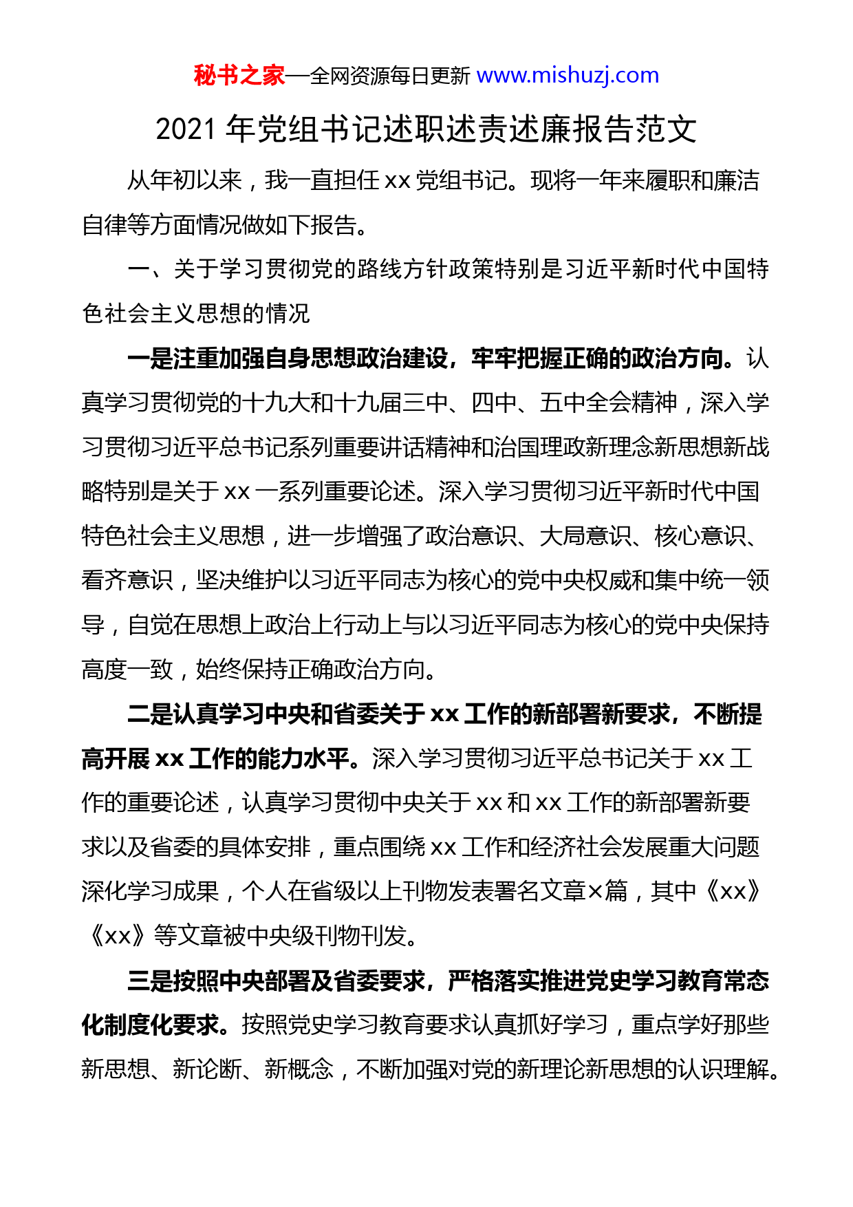 秘书之家—全网资源每日更新www.mishuzj.com2021年党组书记述职述责述廉报告范文从年初以来,我一直担任xx党组书记。现将一年来履职和廉洁自律等方面情况做如下报告。一、关于学习贯彻党的路线方针政策特别是习近平新时代中国特色社会主义思想的情况一是注重加强自身思想政治建设,牢牢把握正确的政治方向。认真学习贯彻党的十九大和十九届三中、四中、五中全会精神,深入学习贯彻习近平总书记系列重要讲话精神和治国理政新理念新思想新战略特别是关于xx一系列重要论述。深入学习贯彻习近平新时代中国特色社会主义思想,进一步增强了政治意识、大局意识、核心意识、看齐意识,坚决维护以习近平同志为核心的党中央权威和集中统一领导,自觉在思想上政治上行动上与以习近平同志为核心的党中央保持高度一致,始终保持正确政治方向。二是认真学习中央和省委关于xx工作的新部署新要求,不断提高开展xx工作的能力水平。深入学习贯彻习近平总书记关于xx工作的重要论述,认真学习贯彻中央关于xx和xx工作的新部署新要求以及省委的具体安排,重点围绕xx工作和经济社会发展重大问题深化学习成果,个人在省级以上刊物发表署名文章×篇,其中《xx》《xx》等文章被中央级刊物刊发。三是按照中央部署及省委要求,严格落实推进党史学习教育常态化制度化要求。按照党史学习教育要求认真抓好学习,重点学好那些新思想、新论断、新概念,不断加强对党的新理论新思想的认识理解。秘书之家—全网资源每日更新www.mishuzj.com坚持以普通党员身份参加所在党支部组织生活,带头开展批评和自我批评。主动给所在党支部和联系点党支部上党课,用自身学习成果带动广大党员一起学习提高。每月按时向党小组长交纳党费,不拖延、不让其他同志代交,进一步增强了党的意识、宗旨意识、纪律意识和担当精神。二、关于贯彻执行民主集中制、严守政治纪律和政治规矩的情况一是认真贯彻执行民主集中制。根据新的形势任务要求,牵头修订了《党组工作规则》,指导机关党组织建立完善了定期向党组汇报工作的制度,不断完善民主集中制贯彻落实的制度体系。坚持集体领导科学决策,凡是涉及到本厅“三重一大”方面的问题,必须经党组集体研究决定,同时在研究问题时,坚持不临时动议、不事先定调、不显露倾向,充分发挥党组成员的积极性、主动性、创造性。注重发挥广大群众和专业人员的作用,党组研究讨论重大问题,主动邀请他们列席并认真听取意见,使决策更加科学民主。二是严守政治纪律和政治规矩。系统学习《党章》和《中国共产党廉洁自律准则》《关于新形势下党内政治生活的若干准则》等,坚决杜绝习近平总书记提出的“七个有之”问题,在政治立场、政治方向、政治原则、政治道路上同以习近平同志为核心的党中央保持高度一致,不折不扣地贯彻落实党中央的重大方针和决策。深刻汲取党的十八大以来查处的周永康、徐才厚、孙政才等反面典型严重违反党的政治纪律、政治规矩、组织纪律的案件的深刻教训,自觉维护习近平总书记这个核心,带头做严守党的政治纪律和政治规矩的模范。三、关于落实全面从严治党责任和党风廉政建设责任制的情况秘书之家—全网资源每日更新www.mishuzj.com一是切实履行好全面从严治党第一责任人的主体责任。坚决落实全面从严治党要求,召开党风廉政建设工作会议,对党风廉政建设进行部署、提出要求。全面加强党组政治建设、思想建设、组织建设、作风建设、纪律建设,把制度建设贯穿其中,坚守责任担当,当好班长,带好队伍。牢固树立正确选人用人导向,严格落实《党政干部选拔任用工作条例》,制定《机关干部选拔任用工作规程》,配合省委组织部选拔任用厅级干部。通过全面从严治党,在机关营造了风清气正的良好政治生态。二是进一步抓严抓实党建工作。领导制定了《党组2021年度全面从严治党工作计划》等,提高了党建工作的制度化、规范化和程序化水平。全面落实党组意识形态工作责任制,将意识形态工作纳入重要议事日程,统筹谋划,强力推动。狠抓“三会一课”制度落实,建立机关党建工作考评制度,出台考评办法和实施细则,督促各级党组织着力加强自身建设,不断提高建设水平。四、关于落实中央八项规定精神和遵守廉洁从政规定等方面的情况一是认真落实中央八项规定精神。中央八项规定实施细则出台后,按照相关精神主持制定实施方案,严格按照规定要求,进一步改进了调查研究工作,坚持轻车简从、简化接待,深入基层、深入困难地区,了解社情民意。进一步改进会风和文风,精简会议活动和文件简报,开短会、讲短话、求实效。坚持厉行勤俭节约,严格执行住房、车辆配备等有关工作和生活待遇的规定。秘书之家—全网资源每日更新www.mishuzj.com二是严格遵守廉洁从政相关规定。严格执行中央及省委关于领导干部廉洁从政的各项规定,如实报告个人事项,自觉接受监督,管好自己、管好家人和身边的工作人员。切实增强自律意识,严格遵守党纪国法,坚持做到权为民所用、情为民所系、利为民所谋,确保权力干净运行。牢记正派做人,坦荡为官,努力做到心中有党、心中有民、心中有责、心中有戒,自觉增强政治定力、纪律定力、道德定力、抵腐定力,始终保持共产党员的良好