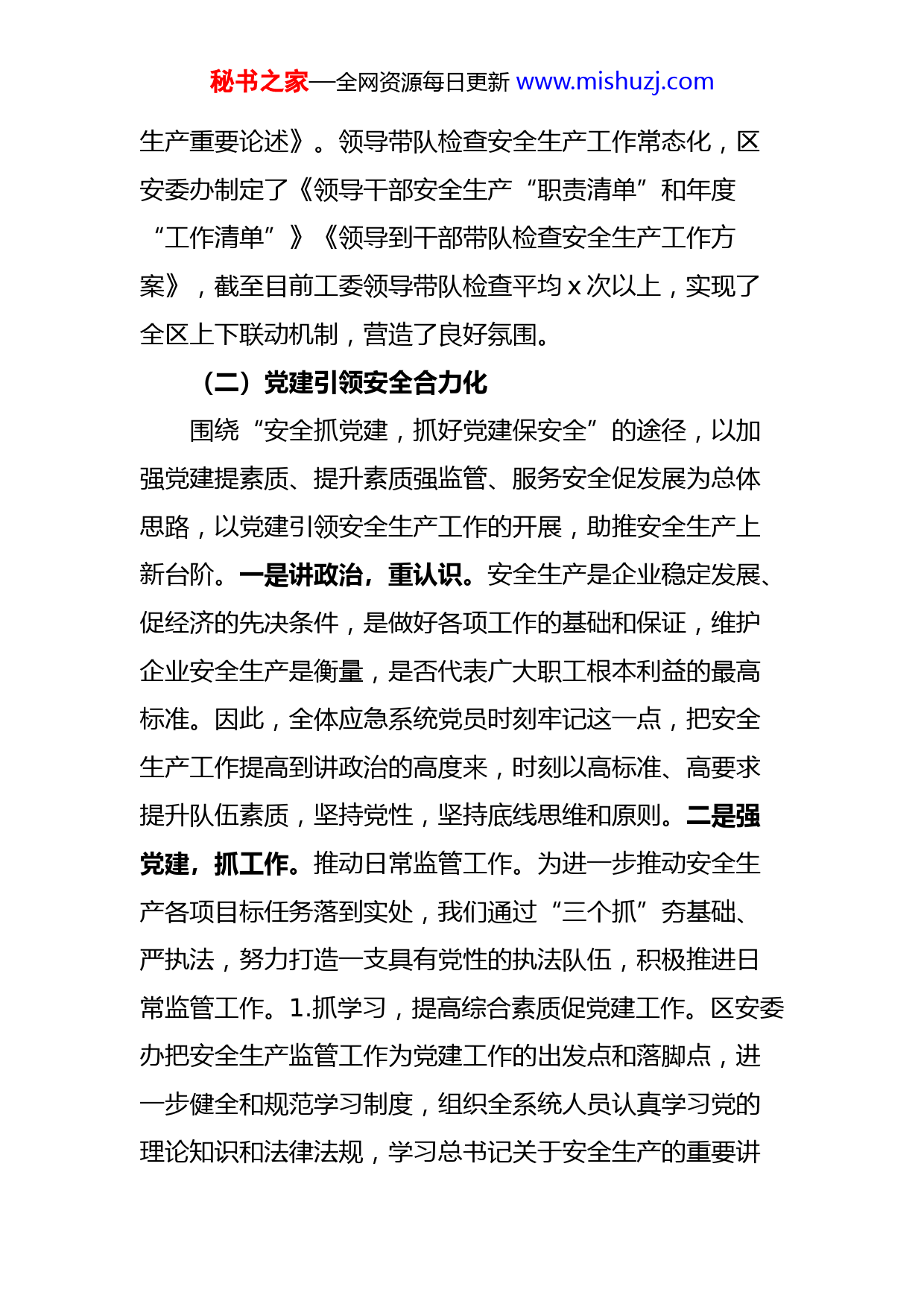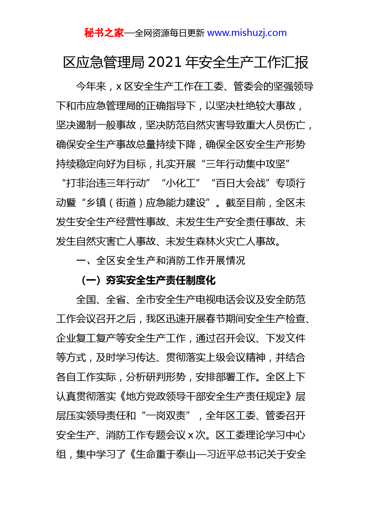 秘书之家—全网资源每日更新www.mishuzj.com区应急管理局2021年安全生产工作汇报今年来,x区安全生产工作在工委、管委会的坚强领导下和市应急管理局的正确指导下,以坚决杜绝较大事故,坚决遏制一般事故,坚决防范自然灾害导致重大人员伤亡,确保安全生产事故总量持续下降,确保全区安全生产形势持续稳定向好为目标,扎实开展“三年行动集中攻坚”“打非治违三年行动”“小化工”“百日大会战”专项行动暨“乡镇(街道)应急能力建设”。截至目前,全区未发生安全生产经营性事故、未发生生产安全责任事故、未发生自然灾害亡人事故、未发生森林火灾亡人事故。一、全区安全生产和消防工作开展情况(一)夯实安全生产责任制度化全国、全省、全市安全生产电视电话会议及安全防范工作会议召开之后,我区迅速开展春节期间安全生产检查、企业复工复产等安全生产工作,通过召开会议、下发文件等方式,及时学习传达、贯彻落实上级会议精神,并结合各自工作实际,分析研判形势,安排部署工作。全区上下认真贯彻落实《地方党政领导干部安全生产责任规定》层层压实领导责任和“一岗双责”,全年区工委、管委召开安全生产、消防工作专题会议x次。区工委理论学习中心组,集中学习了《生命重于泰山—习近平总书记关于安全秘书之家—全网资源每日更新www.mishuzj.com生产重要论述》。领导带队检查安全生产工作常态化,区安委办制定了《领导干部安全生产“职责清单”和年度“工作清单”》《领导到干部带队检查安全生产工作方案》,截至目前工委领导带队检查平均x次以上,实现了全区上下联动机制,营造了良好氛围。(二)党建引领安全合力化围绕“安全抓党建,抓好党建保安全”的途径,以加强党建提素质、提升素质强监管、服务安全促发展为总体思路,以党建引领安全生产工作的开展,助推安全生产上新台阶。一是讲政治,重认识。安全生产是企业稳定发展、促经济的先决条件,是做好各项工作的基础和保证,维护企业安全生产是衡量,是否代表广大职工根本利益的最高标准。因此,全体应急系统党员时刻牢记这一点,把安全生产工作提高到讲政治的高度来,时刻以高标准、高要求提升队伍素质,坚持党性,坚持底线思维和原则。二是强党建,抓工作。推动日常监管工作。为进一步推动安全生产各项目标任务落到实处,我们通过“三个抓”夯基础、严执法,努力打造一支具有党性的执法队伍,积极推进日常监管工作。1.抓学习,提高综合素质促党建工作。区安委办把安全生产监管工作为党建工作的出发点和落脚点,进一步健全和规范学习制度,组织全系统人员认真学习党的理论知识和法律法规,学习总书记关于安全生产的重要讲秘书之家—全网资源每日更新www.mishuzj.com话精神。2.抓管理,提高责任担当促党建工作。区工委、管委会定期召开安全生产例会,与各街道办事处、管理处层层签订安全工作目标管理责任书,将安全生产工作纳入年度重点工作目标考核,严格实行安全生产工作“一票否决”制度,确保了安全工作目标与责任。3.抓治理,提高责任意识促党建工作。一方面,认真抓好“春节”“元旦”“五一”等节假日安全生产大检查工作。另一方面,精心组织开展安全生产专项整治行动活动。采取“企业整改治理、部门督促落实”的方式,深入开展安全生产标准化企业创建、双重预防机制创建活动,强化安全基层基础工作。(三)落实疫情防控科学化疫情防控期间,应急管理局全体人员,深入一线,督查安全生产工作;各乡镇、街道积极履行属地监管职责,对辖区内企业和重点行业领域开展安全生产检查,并持续推进村(社区)安全生产网格化管理,建立安全生产网格员制度,实现安全监管“社区、村”二级全覆盖。一是及时摸清底数。区安委办对全区疫情防控期间复工复产企业情况进行摸底统计,适时掌握全区企业复工复产情况、隐患排查整改情况。疫情防控期间,各相关单位和部门在对已复工复产企业开展安全检查中共排查隐患x条,已全部完成整改。二是开展督查检查。区安委办对各办事处、管理处的复工复产企业安全生产工作进行了督查检查,共抽秘书之家—全网资源每日更新www.mishuzj.com查企业x家,重点检查危险化学品、工贸等企业。三是发放疫情防控物资。区安委办采取上门服务企业模式分线分组对辖区企业发放口罩物资x个、消毒液x瓶、酒精x瓶、消毒凝胶x瓶。(四)开展专项整治成效化根据我区今年安全生产工作“严格监管执法”思路,强力推进“强执法防事故”“三年行动集中攻坚”“打非治违三年行动”“小化工”“百日大会战”促进安全生产责任落实。一是全面部署。根据全区安全生产的实际和特点,实行了全面检查与严格执法相结合、企业自查与部门检查相结合、属地负责与行业监管相结合,集中开展各项整治工作。二是严格检查。此次专项整治,按照工作力度不减、标准不变、尺度不松要求,认真开展重点行业领域检查。专项整治期间,组织执法检查x次,检查排查隐患x条,整改完毕x条,下达执法文书x份,简易执法x起,处罚金额x千元,立案处罚x起,处罚金额x万元,取得了一定的成效。三是狠抓整改。对各办事处、管理处,行业部门的专项整治开展情况进行了督查检查。督查采取现场检查、随机抽查的形式,深入查找安全隐患和问题。对