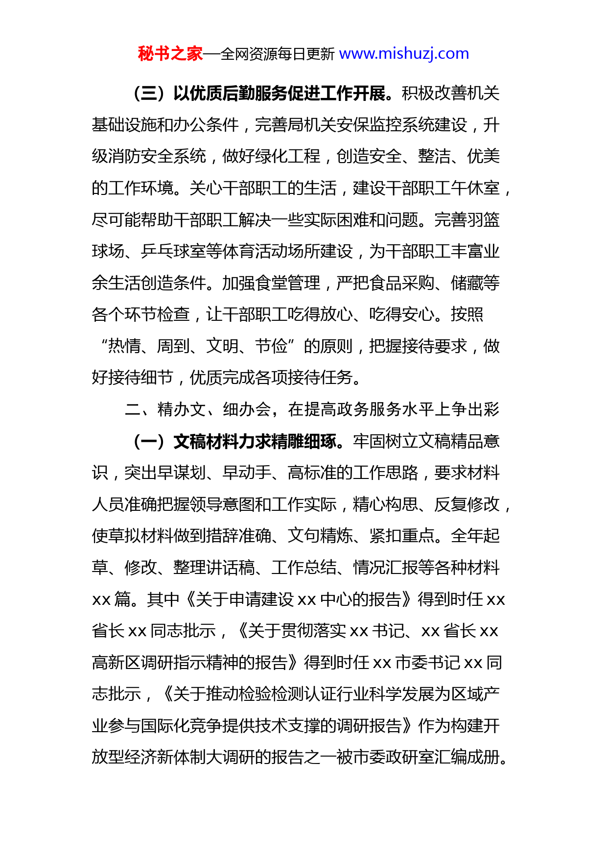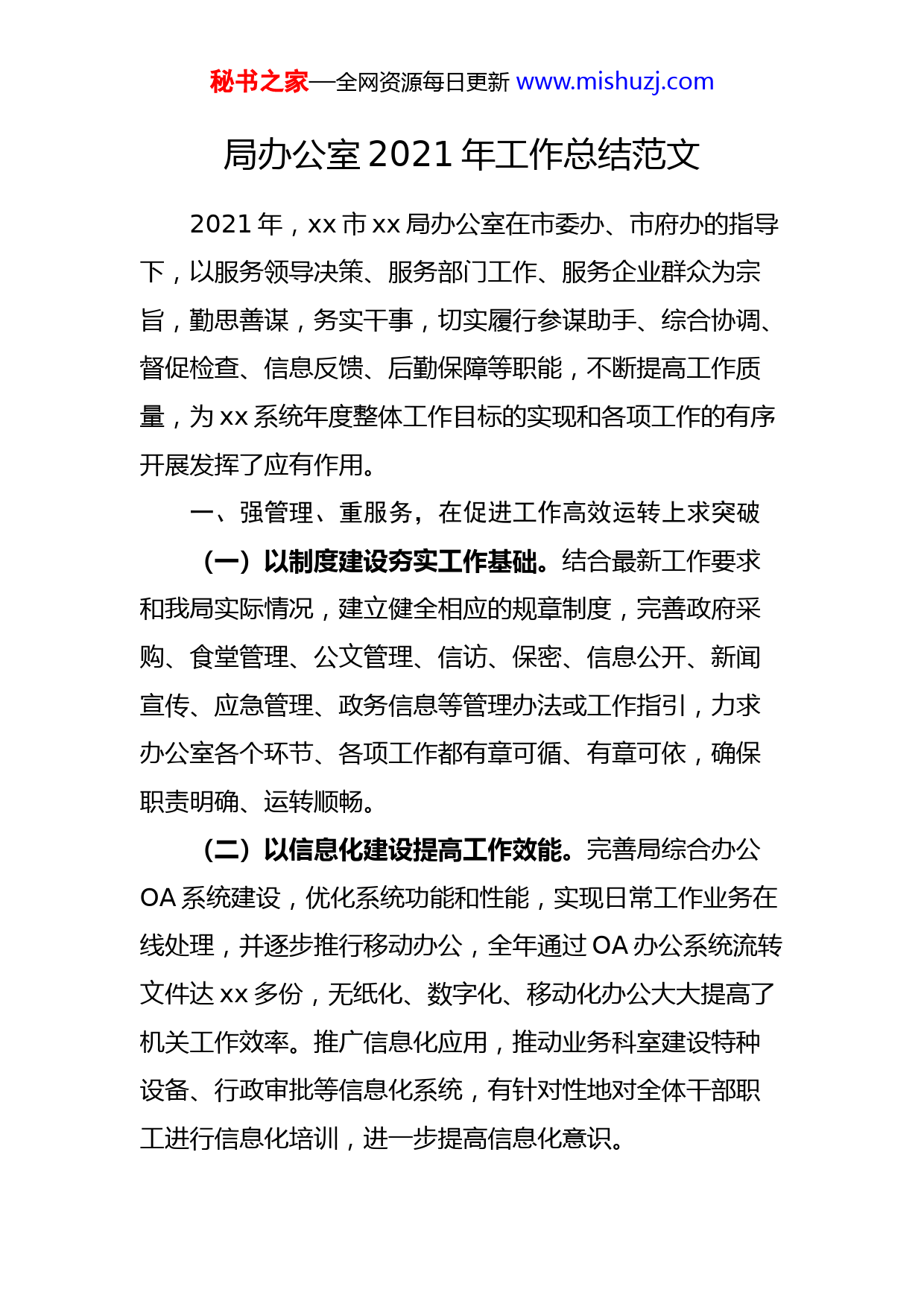 秘书之家—全网资源每日更新www.mishuzj.com局办公室2021年工作总结范文2021年,xx市xx局办公室在市委办、市府办的指导下,以服务领导决策、服务部门工作、服务企业群众为宗旨,勤思善谋,务实干事,切实履行参谋助手、综合协调、督促检查、信息反馈、后勤保障等职能,不断提高工作质量,为xx系统年度整体工作目标的实现和各项工作的有序开展发挥了应有作用。一、强管理、重服务,在促进工作高效运转上求突破(一)以制度建设夯实工作基础。结合最新工作要求和我局实际情况,建立健全相应的规章制度,完善政府采购、食堂管理、公文管理、信访、保密、信息公开、新闻宣传、应急管理、政务信息等管理办法或工作指引,力求办公室各个环节、各项工作都有章可循、有章可依,确保职责明确、运转顺畅。(二)以信息化建设提高工作效能。完善局综合办公OA系统建设,优化系统功能和性能,实现日常工作业务在线处理,并逐步推行移动办公,全年通过OA办公系统流转文件达xx多份,无纸化、数字化、移动化办公大大提高了机关工作效率。推广信息化应用,推动业务科室建设特种设备、行政审批等信息化系统,有针对性地对全体干部职工进行信息化培训,进一步提高信息化意识。秘书之家—全网资源每日更新www.mishuzj.com(三)以优质后勤服务促进工作开展。积极改善机关基础设施和办公条件,完善局机关安保监控系统建设,升级消防安全系统,做好绿化工程,创造安全、整洁、优美的工作环境。关心干部职工的生活,建设干部职工午休室,尽可能帮助干部职工解决一些实际困难和问题。完善羽篮球场、乒乓球室等体育活动场所建设,为干部职工丰富业余生活创造条件。加强食堂管理,严把食品采购、储藏等各个环节检查,让干部职工吃得放心、吃得安心。按照“热情、周到、文明、节俭”的原则,把握接待要求,做好接待细节,优质完成各项接待任务。二、精办文、细办会,在提高政务服务水平上争出彩(一)文稿材料力求精雕细琢。牢固树立文稿精品意识,突出早谋划、早动手、高标准的工作思路,要求材料人员准确把握领导意图和工作实际,精心构思、反复修改,使草拟材料做到措辞准确、文句精炼、紧扣重点。全年起草、修改、整理讲话稿、工作总结、情况汇报等各种材料xx篇。其中《关于申请建设xx中心的报告》得到时任xx省长xx同志批示,《关于贯彻落实xx书记、xx省长xx高新区调研指示精神的报告》得到时任xx市委书记xx同志批示,《关于推动检验检测认证行业科学发展为区域产业参与国际化竞争提供技术支撑的调研报告》作为构建开放型经济新体制大调研的报告之一被市委政研室汇编成册。秘书之家—全网资源每日更新www.mishuzj.com(二)政务信息力求又快又准。积极转变信息工作思路,精准结合全国、全省xx工作政策和社会关注热点及时准确向各级领导反映xx工作的新情况、新问题、新成就,全年采编上报信息xx篇,被省委省政府采用xx篇,国家xx总局采用xx篇,省xx局采用73篇,《xx市成功创建全国xx强市示范城市》等信息获得xx副省长、xx市长等领导批示。在全省xx系统政务信息排名和全国xx系统政务信息直报点排名中均名列前茅。(三)公文处理力求及时规范。严格收发文工作标准和办理程序,全年收文xx份,基本做到急件马上处理、平件当天处理,没有发生因公文处理不及时造成重要工作延误的情况。认真修改、提炼和审核各部门上报的公文,提高发文质量,发出各类文件xx份,充分发挥了公文对xx工作的促进和指导作用。(四)会务组织力求细致严谨。对会务工作的每一个步骤、每一个细节都提前考虑、周密部署,重要会议均制出详细工作方案和分工表格,把具体任务落实到每一个人,做到事事有跟进、件件有落实。全年牵头组织各类会议xx多次,得到了局领导及各业务部门的充分肯定。三、办实事、做细活,在推动事务工作落实上下功夫(一)重点抓好督查督办。制定督查任务表,督促各业务部门严格按照时限及相关要求做好重要会议、重要文秘书之家—全网资源每日更新www.mishuzj.com件、重大决定和领导交办事项的落实,了解掌握贯彻落实过程中的进展情况并协调解决存在的问题,完成年度工作要点落实、政协提案办理等多项督查督办任务,完成xx份市政府及市各部门征求意见的受理和回复工作,确保了各项目标任务的全面完成。(二)突出抓好宣传工作。不定期策划对外宣传工作,统筹召开2021年xx新闻发布会,取得了良好的宣传效果。拓宽宣传渠道,在加强与传统媒体沟通联系的基础上,主动适应以互联网和手机为代表的新媒体日益普及的形势,建设“xx”微信公众号,做好微博发布工作,并积极筹建网络舆情监测系统。2021年,为xx日报、xx时报等媒体提供新闻通稿xx篇。(三)用心做好其他各项工作。严格按规定公开政府信息,全年通过政府信息公开栏目主动公开政府信息xx条,受理依申请公开xx件,均在规定时限内予以回复。热情接访、积极处访,多次协调业务部门探讨信访事项解决办法,信访事项100%按时按规回复,切实解决群众问题。组织保密知识宣传教育,完善保密防护设备设施,规范涉密文件管理,开展各类保密检查xx次,全年未发生任何泄密事故。加强档案管理,提高数字化水平,整理了十几年以来的专门档案约xx卷,扫描纸质文本xx万页,提高了档案完整度。秘书之家—全网资