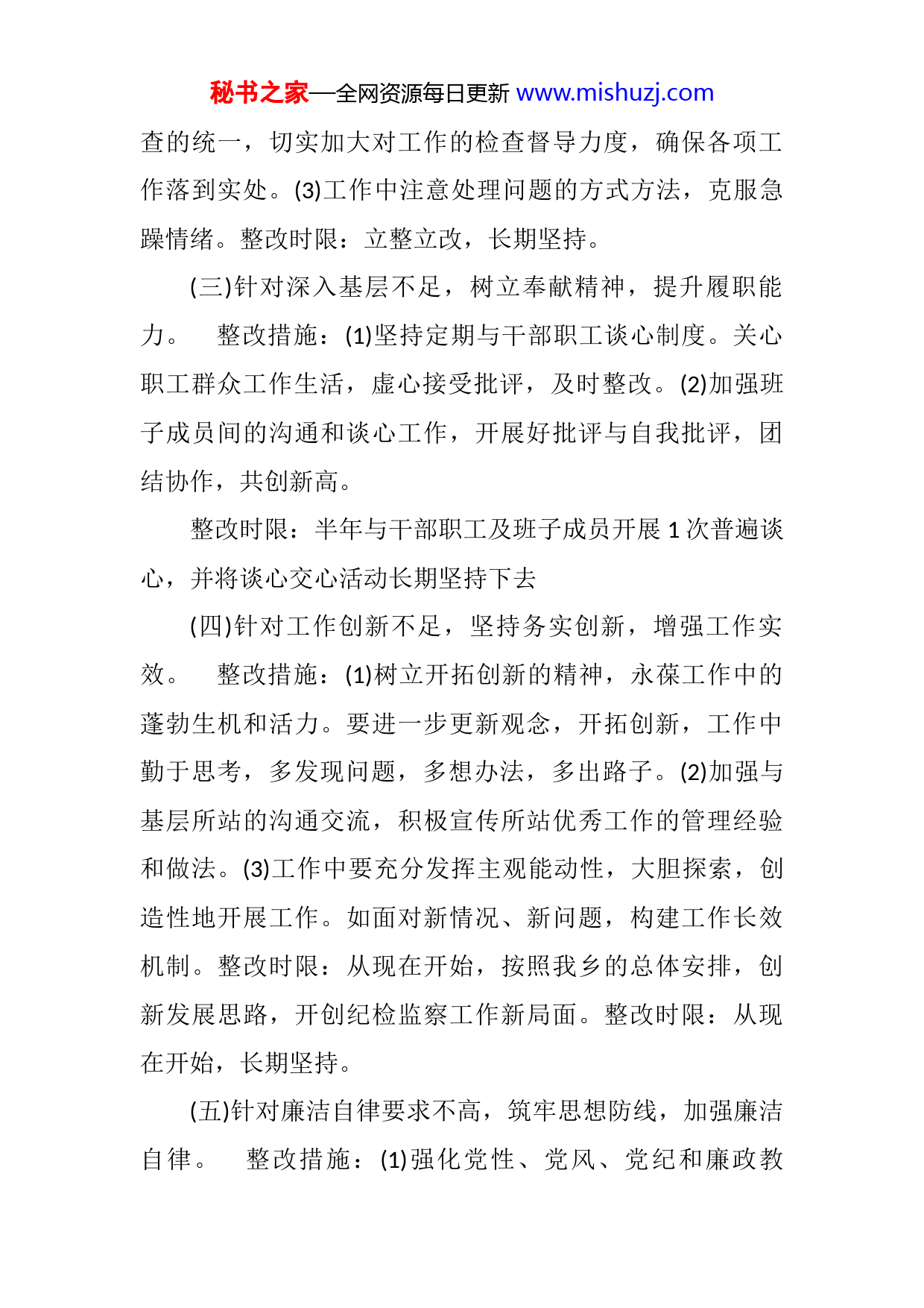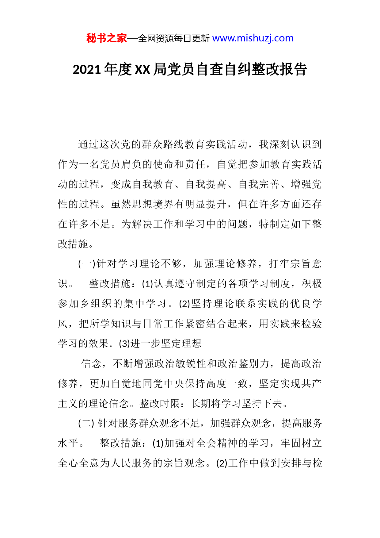 秘书之家—全网资源每日更新www.mishuzj.com2021年度XX局党员自查自纠整改报告通过这次党的群众路线教育实践活动,我深刻认识到作为一名党员肩负的使命和责任,自觉把参加教育实践活动的过程,变成自我教育、自我提高、自我完善、增强党性的过程。虽然思想境界有明显提升,但在许多方面还存在许多不足。为解决工作和学习中的问题,特制定如下整改措施。(一)针对学习理论不够,加强理论修养,打牢宗旨意识。整改措施:(1)认真遵守制定的各项学习制度,积极参加乡组织的集中学习。(2)坚持理论联系实践的优良学风,把所学知识与日常工作紧密结合起来,用实践来检验学习的效果。(3)进一步坚定理想信念,不断增强政治敏锐性和政治鉴别力,提高政治修养,更加自觉地同党中央保持高度一致,坚定实现共产主义的理论信念。整改时限:长期将学习坚持下去。(二)针对服务群众观念不足,加强群众观念,提高服务水平。整改措施:(1)加强对全会精神的学习,牢固树立全心全意为人民服务的宗旨观念。(2)工作中做到安排与检秘书之家—全网资源每日更新www.mishuzj.com查的统一,切实加大对工作的检查督导力度,确保各项工作落到实处。(3)工作中注意处理问题的方式方法,克服急躁情绪。整改时限:立整立改,长期坚持。(三)针对深入基层不足,树立奉献精神,提升履职能力。整改措施:(1)坚持定期与干部职工谈心制度。关心职工群众工作生活,虚心接受批评,及时整改。(2)加强班子成员间的沟通和谈心工作,开展好批评与自我批评,团结协作,共创新高。整改时限:半年与干部职工及班子成员开展1次普遍谈心,并将谈心交心活动长期坚持下去(四)针对工作创新不足,坚持务实创新,增强工作实效。整改措施:(1)树立开拓创新的精神,永葆工作中的蓬勃生机和活力。要进一步更新观念,开拓创新,工作中勤于思考,多发现问题,多想办法,多出路子。(2)加强与基层所站的沟通交流,积极宣传所站优秀工作的管理经验和做法。(3)工作中要充分发挥主观能动性,大胆探索,创造性地开展工作。如面对新情况、新问题,构建工作长效机制。整改时限:从现在开始,按照我乡的总体安排,创新发展思路,开创纪检监察工作新局面。整改时限:从现在开始,长期坚持。(五)针对廉洁自律要求不高,筑牢思想防线,加强廉洁自律。整改措施:(1)强化党性、党风、党纪和廉政教秘书之家—全网资源每日更新www.mishuzj.com育,进一步提高廉政意识。(2)在自身世界观的改造上下功夫,从小事做起,防微杜渐,牢固树立正确的世界观、人生观和价值观,自觉抵制各种腐朽思想的侵蚀。(3)进一步完善个人《廉政公开承诺书》,自觉接受党组织和职工群众的监督。(4)严格执行党风廉政各项规定,发挥好一名党员领导干部的表率作用,永葆共产党员先进性。整改时限:边学边查,边查边改,常抓不懈下一步具体整改措施一、进一步强化政治学习,增强理论功底,提高领导艺术水平。通过持之以恒的理论学习提高自己的政治敏锐性和政治鉴别力,树立科学的世界观、人生观和价值观,提高自己的政治素质、业务能力和道德水平。认真研读党的群众路线教育实践活动实质,自觉加强党性修养,牢固树立全心全意为人民服务的宗旨,建立正确的世界观、人生观、价值观,切实筑牢思想防线。在掌握科学体系和领会精神实质下工夫,做到深入不肤浅,实际不空谈,切实提高思想理论水平。二、进一步发挥模范带头作用。作为纪委书记,必须正确定位自己,立足岗位实际,以身作则、率先垂范以上率下。要以敬畏之心对待肩负的责任,以进取之心对待从事的工作,以真诚之心对待干部职工。通过这次活动,在工作中起模范带头作用,根据群众提、自己找、上级点,秘书之家—全网资源每日更新www.mishuzj.com继续深挖自己身上存在的的“四风”突出问题,深入剖析问题产生根源,着力解决作风建设的突出问题。努力加强与班子深入沟通,努力提高科学化、民主化水平,努力改变一切不能适应工作的做法,实实在在把工作重点落实到创建优质服务,转变工作作风上来,在作风建设上取得实际成效,提高群众的满意度。三、进一步改进工作作风,增强服务意识,传递正能量牢固树立群众观点,忠实地执行党的群众路线。以解决思想和工作中存在的实际问题为出发点,以改进自己的工作作风和工作方式、提高工作成效为落脚点,牢记职工利益无小事的道理,时刻把职工的需求和冷暖挂在心上,诚心诚意为职工群众办实事、解难事、做好事,对实际情况无法解决问题的应多和干部职工勾通、解释,争取谅解,反映到我们的实际工作中就是提高服务水平、服务的意识,通过全体干部职工的共同努力,使得各项工作有条不紊的开展,得到群众的认可。同时加强与同事之间的沟通,了解职工所急、所需,在合理、合规的前提下解决问题,谈心谈话活动。发挥干部职工的积极性。今后在工作生活中带头讲大局,讲团结,讲奉献,带头遵纪守法,带头宏扬正气,传递正能量。四、进一步解放思想、务实创新,增强工作实效,进一步增强改革意识,坚持解放思想、实事求是、与时俱进。努力做到善于克服消极思维、模糊认识所造成的各种秘书之家—全网资源每日更新www.mishuzj.com束缚,破除急躁情绪,迎难而上,积极工作;善于从政治、全局的高度认识事物,不断完善和提高自己,在科学理论的指导下,通过实现