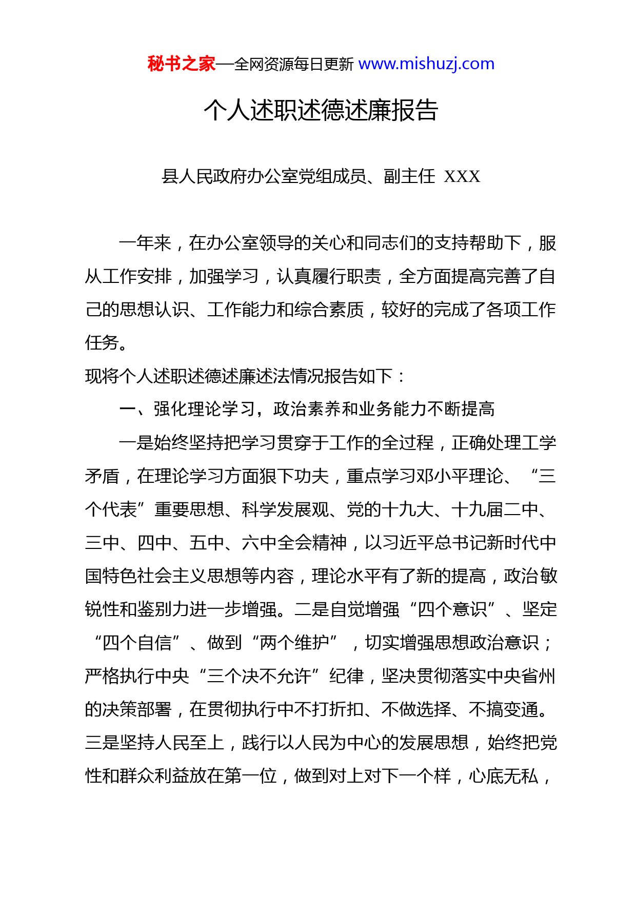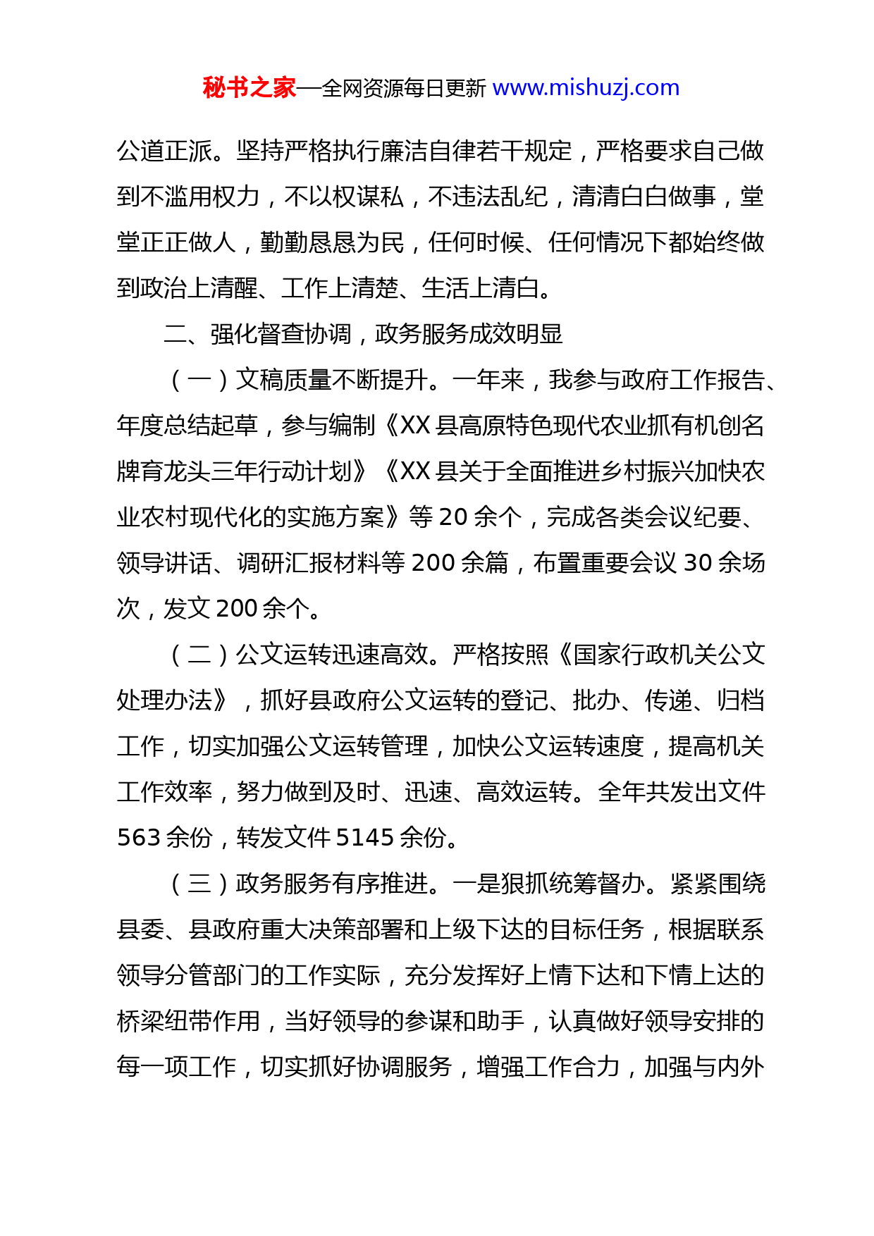 秘书之家—全网资源每日更新www.mishuzj.com个人述职述德述廉报告县人民政府办公室党组成员、副主任XXX一年来,在办公室领导的关心和同志们的支持帮助下,服从工作安排,加强学习,认真履行职责,全方面提高完善了自己的思想认识、工作能力和综合素质,较好的完成了各项工作任务。现将个人述职述德述廉述法情况报告如下:一、强化理论学习,政治素养和业务能力不断提高一是始终坚持把学习贯穿于工作的全过程,正确处理工学矛盾,在理论学习方面狠下功夫,重点学习邓小平理论、“三个代表”重要思想、科学发展观、党的十九大、十九届二中、三中、四中、五中、六中全会精神,以习近平总书记新时代中国特色社会主义思想等内容,理论水平有了新的提高,政治敏锐性和鉴别力进一步增强。二是自觉增强“四个意识”、坚定“四个自信”、做到“两个维护”,切实增强思想政治意识;严格执行中央“三个决不允许”纪律,坚决贯彻落实中央省州的决策部署,在贯彻执行中不打折扣、不做选择、不搞变通。三是坚持人民至上,践行以人民为中心的发展思想,始终把党性和群众利益放在第一位,做到对上对下一个样,心底无私,秘书之家—全网资源每日更新www.mishuzj.com公道正派。坚持严格执行廉洁自律若干规定,严格要求自己做到不滥用权力,不以权谋私,不违法乱纪,清清白白做事,堂堂正正做人,勤勤恳恳为民,任何时候、任何情况下都始终做到政治上清醒、工作上清楚、生活上清白。二、强化督查协调,政务服务成效明显(一)文稿质量不断提升。一年来,我参与政府工作报告、年度总结起草,参与编制《XX县高原特色现代农业抓有机创名牌育龙头三年行动计划》《XX县关于全面推进乡村振兴加快农业农村现代化的实施方案》等20余个,完成各类会议纪要、领导讲话、调研汇报材料等200余篇,布置重要会议30余场次,发文200余个。(二)公文运转迅速高效。严格按照《国家行政机关公文处理办法》,抓好县政府公文运转的登记、批办、传递、归档工作,切实加强公文运转管理,加快公文运转速度,提高机关工作效率,努力做到及时、迅速、高效运转。全年共发出文件563余份,转发文件5145余份。(三)政务服务有序推进。一是狠抓统筹督办。紧紧围绕县委、县政府重大决策部署和上级下达的目标任务,根据联系领导分管部门的工作实际,充分发挥好上情下达和下情上达的桥梁纽带作用,当好领导的参谋和助手,认真做好领导安排的每一项工作,切实抓好协调服务,增强工作合力,加强与内外秘书之家—全网资源每日更新www.mishuzj.com单位的沟通交流,注重协调好各方面的关系,努力把县人民政府领导分管的脱贫攻坚、农业、林业、应急管理、自然资源、住建、生态环境等工作抓出成效。二是狠抓服务保障。牢固树立服务意识、责任意识和大局意识,时刻保持着高度的责任心和责任感,具有较强的服务协调能力,对待本职工作认真负责,圆满完成各项重大调研活动的协调服务工作。今年以来积极参与省、州脱贫攻坚、民族团结创建等工作的材料撰写、后勤保障等工作;共参加了省州民族团结创建、省州脱贫攻坚调研组等调研活动材料撰写和后勤保障等工作。三、崇尚道德,树立良好形象“人无德不立,官无德不为”,因此,本人一直把道德作为做人立身之本,常修为政之德、常思贪欲之害、常怀律己之心,在工作中努力做到严格要求自己,要求别人做到的,自己首先做到,要求别人不做的,自己首先不做,以诚待人,以和为贵,以礼相待,树立正确的荣辱观,淡泊名利,低调做人,倡导社会公平、正义。坚决贯彻执行中央八项规定,省、州委有关规定,厉行节约,反对铺张浪费,清清白白做人,扎扎实实做事。牢固树立社会主义道德核心价值观,遵守社会公德、职业道德、个人品德,以高尚的道德品行约束自己,深入基层,调查研究,倾听群众呼声,多为群众办好事、办实事。四、注重廉洁自律,永葆党员先进性秘书之家—全网资源每日更新www.mishuzj.com自参加工作以来始终树立正确的人生观、世界观和价值观树立淡泊名利意识,以正确态度对待荣辱、成败、得失。坚持学习实践科学发展观,具有较强的政治敏锐力,忠于党、忠于人民、忠于法律。一是始终把严守党的纪律作为思想和行动的基本准则,严格遵守党的政治纪律,执行党的路线、方针、政策,在思想上、政治上、行动上同以习近平为总书记的党中央保持高度一致,认真落实中央、省州县党委及县政府的各项决策部署。严格执行中央“三个决不允许”纪律,坚决贯彻落实中央省州的决策部署,在贯彻执行中不打折扣、不做选择、不搞变通。二是注重自身的作风建设,做到言行一致、表里如一,注重自己的行为规范,按照廉政要求和公务员规范,严格要求自己,把廉政建设落实到工作业务和生活实际的每一个环节,按照共产党员的标准努力做作风正派,讲党性,廉洁从政,认真履职。严格要求自己,没有参加过任何形式的赌博活动,在工作期间没有打麻将、下棋、打扑克、上网聊天或玩游戏的情况;不存在瞒报工作、虚报工作成绩问题;没有其他违法违纪问题。三是严格遵守廉洁自律各项规定。我始终在思想上保持高度的警觉,自觉做到自重、自省、自警、自励,时时处处以一名共产党员的标准严格要求自己。首先,杜绝以权谋私。坚持落实领导干部配偶、子女