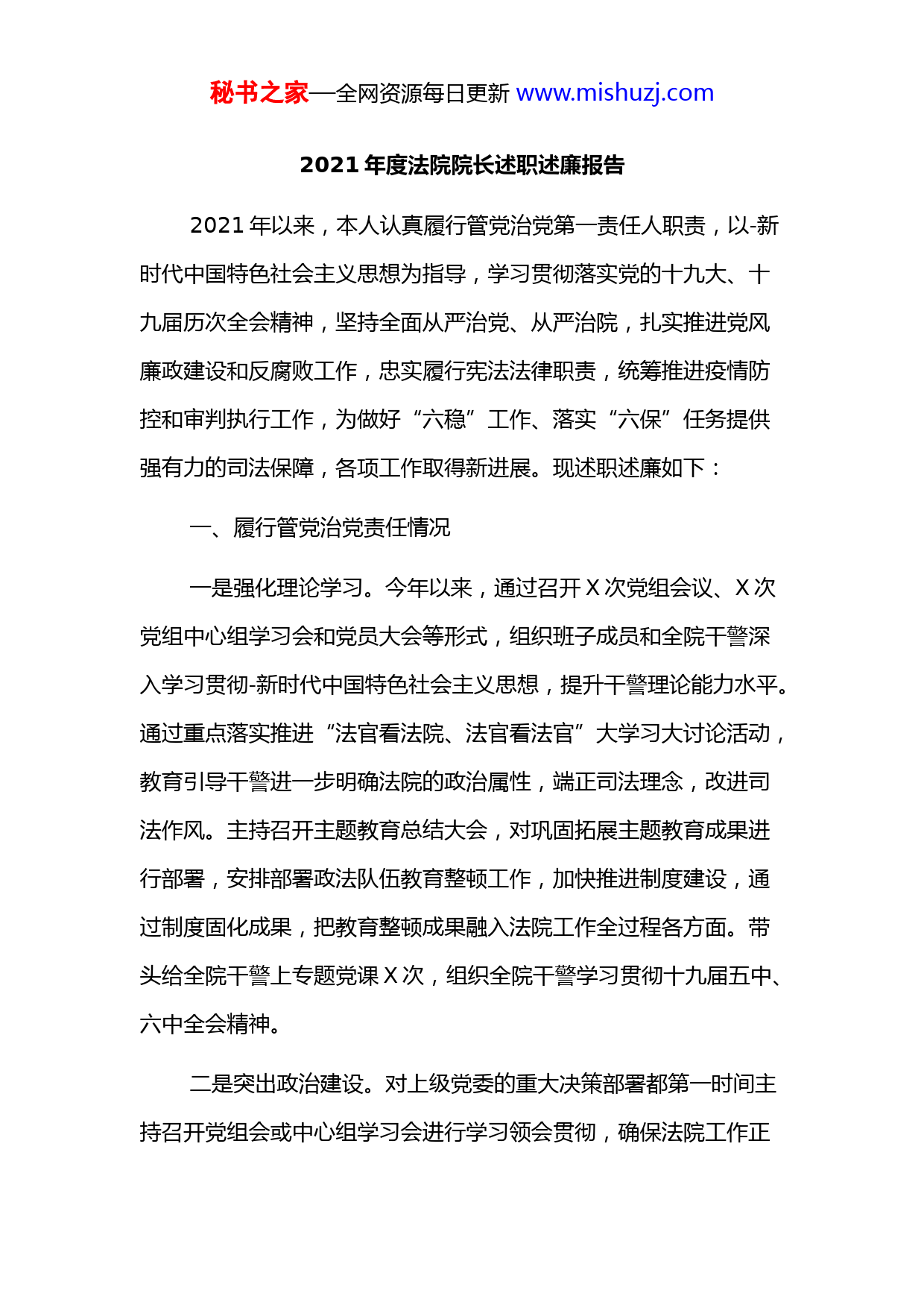 秘书之家—全网资源每日更新www.mishuzj.com2021年度法院院长述职述廉报告2021年以来,本人认真履行管党治党第一责任人职责,以-新时代中国特色社会主义思想为指导,学习贯彻落实党的十九大、十九届历次全会精神,坚持全面从严治党、从严治院,扎实推进党风廉政建设和反腐败工作,忠实履行宪法法律职责,统筹推进疫情防控和审判执行工作,为做好“六稳”工作、落实“六保”任务提供强有力的司法保障,各项工作取得新进展。现述职述廉如下:一、履行管党治党责任情况一是强化理论学习。今年以来,通过召开X次党组会议、X次党组中心组学习会和党员大会等形式,组织班子成员和全院干警深入学习贯彻-新时代中国特色社会主义思想,提升干警理论能力水平。通过重点落实推进“法官看法院、法官看法官”大学习大讨论活动,教育引导干警进一步明确法院的政治属性,端正司法理念,改进司法作风。主持召开主题教育总结大会,对巩固拓展主题教育成果进行部署,安排部署政法队伍教育整顿工作,加快推进制度建设,通过制度固化成果,把教育整顿成果融入法院工作全过程各方面。带头给全院干警上专题党课X次,组织全院干警学习贯彻十九届五中、六中全会精神。二是突出政治建设。对上级党委的重大决策部署都第一时间主持召开党组会或中心组学习会进行学习领会贯彻,确保法院工作正秘书之家—全网资源每日更新www.mishuzj.com确的政治方向;严格落实民主集中制,重大工作部署和重大问题都提交党组会议或院务会讨论;严肃党内政治生活,落实了民主生活会、组织生活会和“三会一课”等制度,把党风政建设和政治纪律、工作纪律、保密纪律等纳入支部每月学习内容。落实“两个坚持”要求,确保坚持党对司法工作的绝对领导,确保人民法院工作正确方向,把旗帜鲜明讲政治贯穿法院工作始终。三是压实从严治党责任。组织制定党组班子和班子成员党风廉政建设“主体责任”清单和“一岗双责”清单,进一步明确党风廉政建设责任的落实。推动全院深入贯彻《中国共产党政法工作条例》《中国共产党重大事项请示报告条例》,教育引导干警严守政治纪律和政治规矩,切实做好重大事项请示报告工作,确保上级决策部署在法院得到不折不扣贯彻执行,确保令行禁止、政令畅通。四是严格落实问题整改。组织对教育整顿期间党组和党组班子成员通过对照党章和检视问题共查找出存在的X个问题以及通过召开专题民主生活会检视出党组班子存在X方面X个问题,党组班子成员存在X方面X个问题开展整改工作,目前全部按要求整改完成。组织对X政法委纪律作风督查巡查反馈意见相关整改工作,对巡查反馈意见的X方面X个问题进行了全面的查摆整改,目前所有问题均整改完毕。二、开展党风廉政建设与反腐败工作情况秘书之家—全网资源每日更新www.mishuzj.com(一)全面压实主体责任。本人始终坚持把抓党风廉政建设与法院工作同部署、同落实、同检查、同考核,认真落实上级党委党风廉政建设各项重大部署,通盘考虑、协调党风廉政建设与审判工作统筹推进。年初主持研究制定党风廉政建设工作要点,并对今年的党风廉政建设和反腐败工作的指导思想、工作任务、具体措施做出了明确规定和部署。组织召开2021年党风廉政建设和反腐败工作会,对部门负责人开展集体廉政谈话,压实“一岗双责”责任。每月召开党组会议讨论研究党风廉政建设和反腐败工作,分析和研判党风廉政建设形势,及时解决党风廉政建设和反腐败工作重大问题、重要案件和重大事项。(二)扎实推进党风廉政建设和反腐败工作。一是助推“作风兴市”各项工作。紧紧围绕作风兴市任务目标,深入推进法院司法作风建设,充分发挥审判职能作用,大力助推作风兴市相关工作。在落实作风兴市工作问题清单、目标清单方面,积极开展“学用政策促发展活动”,认真组织全院干警开展政策业务学习和理论学习;组织干警集中学习讨论X法院在多元解纷方面的先进经验和做法,推进我院诉讼服务中心“两个一站式”建设相关工作。目前已按相关要求完成问题清单整改工作。在落实“对标先进、又快又好”活动事项方面,将“诉讼服务工作提质增速”作为动态优化一批已明确为“又好又快”事项,通过积极开展理论学习、业务提升、作风整顿等工作,进一步推进诉讼服务工作提质增速,并获评X先进集秘书之家—全网资源每日更新www.mishuzj.com体。目前已顺利完成活动事项清单中“又好又快”事项的任务目标。二是督促开展廉政风险防控工作。对已形成的单位、部门和个人的《廉政风险防控登记表》进行完善细化,形成完善的监管制度,确保司法权力规范行使。落实推进纪委监委“一站(组)两网”工作,将X监察对象“互廉网”监督墙、项目资金“物廉网”监督墙、关键岗位权力清单等情况进行公示,进一步规范权力运行,为干警干事创业营造廉洁有序的环境。三是开展专项整治活动。通过落实开展从严治警“五查五整顿”、落实“三个规定”情况专项整治、“两个坚持”专题教育,“以案释德、以案释纪、以案释法”警示教育、开展虚报冒领补助和司法作风问题专项整治和重点领域突出问题专项整治等活动,加强政治建设,巩固中央八项规定落实成效,改进司法作风。四是加强党风廉政教育。以X案等典型案
