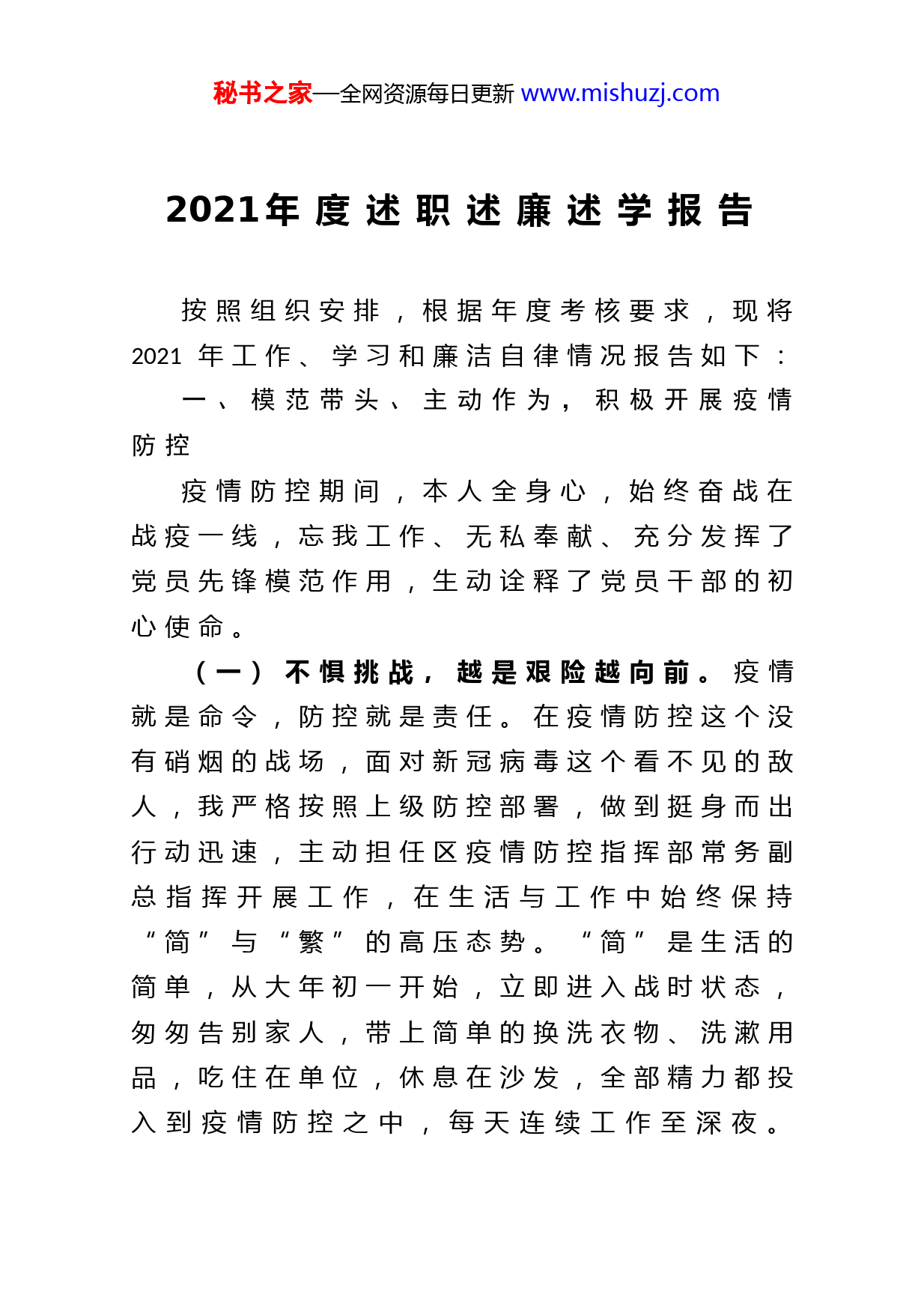 秘书之家—全网资源每日更新www.mishuzj.com2021年度述职述廉述学报告按照组织安排,根据年度考核要求,现将2021年工作、学习和廉洁自律情况报告如下:一、模范带头、主动作为,积极开展疫情防控疫情防控期间,本人全身心,始终奋战在战疫一线,忘我工作、无私奉献、充分发挥了党员先锋模范作用,生动诠释了党员干部的初心使命。(一)不惧挑战,越是艰险越向前。疫情就是命令,防控就是责任。在疫情防控这个没有硝烟的战场,面对新冠病毒这个看不见的敌人,我严格按照上级防控部署,做到挺身而出行动迅速,主动担任区疫情防控指挥部常务副总指挥开展工作,在生活与工作中始终保持“简”与“繁”的高压态势。“简”是生活的简单,从大年初一开始,立即进入战时状态,匆匆告别家人,带上简单的换洗衣物、洗漱用品,吃住在单位,休息在沙发,全部精力都投入到疫情防控之中,每天连续工作至深夜。秘书之家—全网资源每日更新www.mishuzj.com“繁”是工作的繁重,从指挥部筹建、专班设立、人员抽调,到例会调度、统筹协调、具体指导,从排查摸底、联防联控、应急处置,到医疗救治、集中隔离、物资保障,始终坚持事无巨细、亲力亲为。办公室就是作战室,一份份资料、一张张报表,挂图作战、清晰明了,充分展现了在急难险重的任务面前,不惧困难雷厉风行,善打硬仗、能打胜仗的优良作风。(二)科学防控,急难险重显担当。疫情防控重任在肩,我始终坚持在区委正确领导下深入贯彻总书记重要指示精神,坚决落实中央和省委、市委各项决策部署,紧密结合X实际,对疫情认识充分、反应敏锐、研判准确,工作安排部署比较超前。对到辖区X家药店购买止咳退烧药品人员进行登记了解,存在异常情况者及时纳入观察范围;X区在全市率先推动居家隔离向集中隔离转变,设立了X医院和X酒店X个集中医学隔离管控点,对密切接触者、流行病观察者、发热人员等进行集中隔离观察,有效避免人员交叉感染;在全市率先实行发热病人集中收治,在二级以上医院配置专用病房秘书之家—全网资源每日更新www.mishuzj.com每家医院成立联络小组,对呼吸道发热病人集中管理,有效做到防患未然、确保万无一失;既是指挥员,更是战斗员,本人坚持身先士卒示范带动,带头深入医院、社区、企业等抗击疫情防控一线,对每一个环节短板、指挥部指令等细节,做到提前预判、督办落实,做到早排查、早隔离、早检测,早收治,在疫情形势最吃紧的关头,更是迎难而上、靠前指挥,带领基层同志一起干。一系列紧锣密鼓的工作举措,一连串精准果断的防控措施,建立起覆盖全区的交情防治网络,防控工作规范有序,疫情蔓延势头得到有效遏制。(三)善弹钢琴,统筹兼顾促发展。为统筹推进新冠肺炎疫情防控和经济社会发展工作区委成立了“三返”工作专班和复产“返工”专项工作组,由我牵头负责,就企业有序复工进行统筹安排、精准调度。多次主持召开专题会议研究部署复工复产、安全环保工作,及时下发相关指导文件,指导企业做好复工复产各项工作,最大限度地推动企业应复尽复。建立了企业家微信群,第一时间将疫情管控要求、秘书之家—全网资源每日更新www.mishuzj.com企业复产复工文件和申报审批流程,告知企业同时,对外公布了自己的手机号主动接受企业咨询。有企业反映缺少口罩、额温枪、隔离场所等问题,立刻帮助协调解决。在各方共同努力下,X区形成了党群连心、政企同心、抱团取暖的生动局面。二、学思践悟、守牢初心,不断提升自身素质始终把学习作为一种政治责任、事业需要和精神追求,勤学多思,学深学透,努力增强党性观念,不断提高服务大局、科学决策的能力。(一)深学理论知识。坚持把读原著、学原文、悟原理的个人自学与区委理论学习中心组集体学习结合起来,认真学习习总书记到X视察时的重要讲话、党的十九届四中、五中全会精神、中央经济工作会议精神,及时领会总书记最新讲话要求,提升政治理论素养和政策水平,确保思路清、方向明。(二)守牢初心使命。坚持在学深悟透习近平新时代中国特色社会主义思想基础上,深秘书之家—全网资源每日更新www.mishuzj.com入领会贯穿其中的坚定信仰信念、鲜明人民立场、强烈历史担当、求真务实作风、勇于创新精神和科学方法论,进一步擦亮了初心,提高了运用党的创新理论指导实践、推动工作的能力。(三)强化知行合一。结合X大企业多、科研院所多、高端服务业多的实际,有针对性加强大数据、云计算、区块链、总部经济、票据经济等领域知识的系统性学习,为我区制造业服务业高质量发展出谋划策;结合主题教育期间,我区开展的党群连心活动,学做结合,知行合一,深入基层一线、走进群众家中,开展走访调研活动,在实践中不断巩固、检验和提高学习效果,努力提高自己的理论水平和工作能力。三、提高站位,强化统筹,全力服务高质量发展一年来,坚持自觉讲政治、着力强统筹、主动干在先,围绕全区中心工作、服务大局,推动落实、提供保障。(一)突出担当作为,推动分管工作高质秘书之家—全网资源每日更新www.mishuzj.com量推进。全力抓好分包重点项目。工作中,按照区委要求,建立工作台账,加强跟踪督查,全力服务重大项目建设。X-X月,全区X个重大项目,累计完成投资X亿元,占年度目标任务的X%。我直接担任指挥长负责推动的项