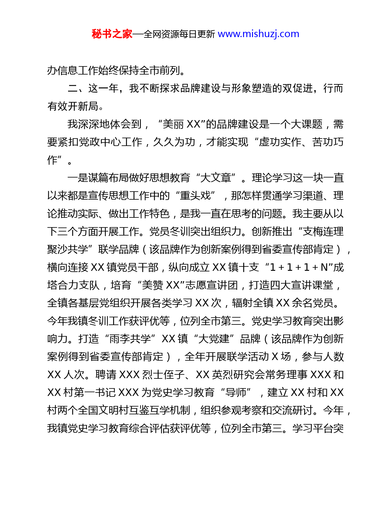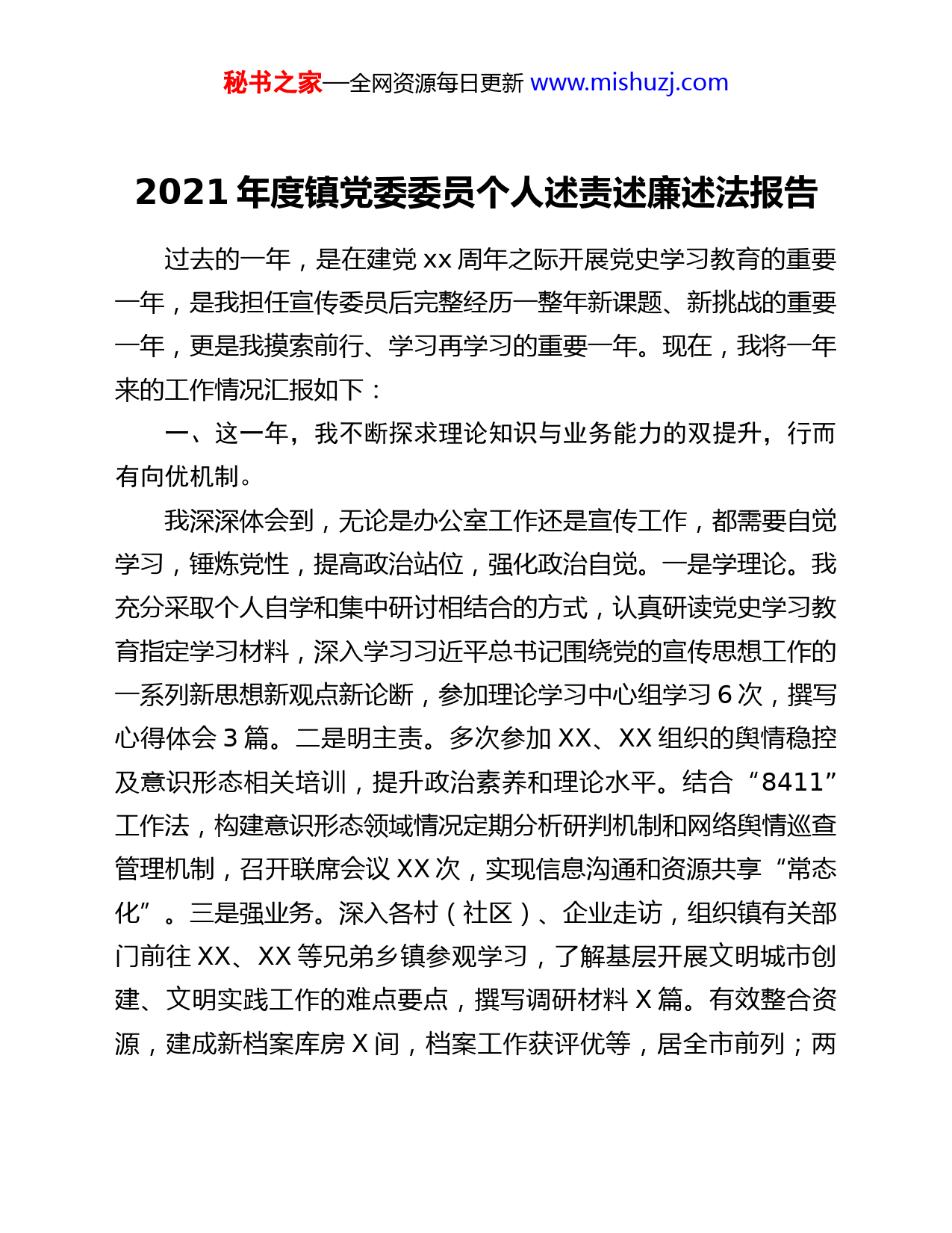 秘书之家—全网资源每日更新www.mishuzj.com2021年度镇党委委员个人述责述廉述法报告过去的一年,是在建党xx周年之际开展党史学习教育的重要一年,是我担任宣传委员后完整经历一整年新课题、新挑战的重要一年,更是我摸索前行、学习再学习的重要一年。现在,我将一年来的工作情况汇报如下:一、这一年,我不断探求理论知识与业务能力的双提升,行而有向优机制。我深深体会到,无论是办公室工作还是宣传工作,都需要自觉学习,锤炼党性,提高政治站位,强化政治自觉。一是学理论。我充分采取个人自学和集中研讨相结合的方式,认真研读党史学习教育指定学习材料,深入学习习近平总书记围绕党的宣传思想工作的一系列新思想新观点新论断,参加理论学习中心组学习6次,撰写心得体会3篇。二是明主责。多次参加XX、XX组织的舆情稳控及意识形态相关培训,提升政治素养和理论水平。结合“8411”工作法,构建意识形态领域情况定期分析研判机制和网络舆情巡查管理机制,召开联席会议XX次,实现信息沟通和资源共享“常态化”。三是强业务。深入各村(社区)、企业走访,组织镇有关部门前往XX、XX等兄弟乡镇参观学习,了解基层开展文明城市创建、文明实践工作的难点要点,撰写调研材料X篇。有效整合资源,建成新档案库房X间,档案工作获评优等,居全市前列;两秘书之家—全网资源每日更新www.mishuzj.com办信息工作始终保持全市前列。二、这一年,我不断探求品牌建设与形象塑造的双促进,行而有效开新局。我深深地体会到,“美丽XX”的品牌建设是一个大课题,需要紧扣党政中心工作,久久为功,才能实现“虚功实作、苦功巧作”。一是谋篇布局做好思想教育“大文章”。理论学习这一块一直以来都是宣传思想工作中的“重头戏”,那怎样贯通学习渠道、理论推动实际、做出工作特色,是我一直在思考的问题。我主要从以下三个方面开展工作。党员冬训突出组织力。创新推出“支梅连理聚沙共学”联学品牌(该品牌作为创新案例得到省委宣传部肯定),横向连接XX镇党员干部,纵向成立XX镇十支“1+1+1+N”成塔合力支队,培育“美赞XX”志愿宣讲团,打造四大宣讲课堂,全镇各基层党组织开展各类学习XX次,辐射全镇XX余名党员。今年我镇冬训工作获评优等,位列全市第三。党史学习教育突出影响力。打造“雨李共学”XX镇“大党建”品牌(该品牌作为创新案例得到省委宣传部肯定),全年开展联学活动X场,参与人数XX人次。聘请XXX烈士侄子、XX英烈研究会常务理事XXX和XX村第一书记XXX为党史学习教育“导师”,建立XX村和XX村两个全国文明村互鉴互学机制,组织参观考察和交流研讨。今年,我镇党史学习教育综合评估获评优等,位列全市第三。学习平台突秘书之家—全网资源每日更新www.mishuzj.com出凝聚力。开展“学习强国”先进个人表彰活动,向XXX名先进典型授予七类荣誉称号。“学习强国”学习平台参与率始终保持全市前X,供稿列全市第X,较以往大有提升。二是精准发力架构品牌建设“大体系”。我一直在思考,如何以品牌建设为立足点,为经济社会发展积聚动能、蓄积势能。深化品牌体系。不断吃深吃透党在农村的各项路线方针政策,配合各条线部门打造XX镇“美赞XX”品牌,并孵化出“XX智造”“一村一品”“遇见XX”等子品牌。拓宽带货直播等销售新路子,将“产品故事”转化成“线上订单”,打响了“黑美人”玉米、“常茂”黑猪肉等特色农产品品牌。优化宣传渠道。排演舞台剧《我们永远在路上》X场,多渠道展演《清水江边第一枪》等文艺作品。打通全媒体宣传渠道,我镇整体工作成效获媒体报道XXX余次,其中,中央媒体XX余次、省级媒体XX次。全年政务微信公众号月度排行均位居乡镇板块前列,XX篇推文获得“好稿点评”。强化阵地建设。成功构建“实践所、站、点、驿站”四级组织体系,开展文明实践“一村一品”特色活动。XX村、XX村新时代文明实践站获评“2021年度XX市新时代文明实践示范站”;“民抗”旧址、龙腾党建馆获评“2021年度XX市新时代文明实践示范点”。杏慧书房获评“XX市优秀阅读推广组织”。三是统筹协调成就文明发展“大风尚”。今年以来,我立足“挖掘一批人、宣传一批人、影响一批人”三个一批工作,提高文秘书之家—全网资源每日更新www.mishuzj.com明水平,改善民生福祉。文明创建有措有力。深化“美赞XX”文明城市创建“1+6+18”工作品牌;辐射聚沙园2公里范围构建“15分钟文明实践圈”,以“一圈一计划N点位”切实为民办实事,乡镇文明程度和群众文明素养不断提升。建立联合督导检查闭环机制,形成《啄木鸟专报》X期。开展“扫黄打非”站点建设,对校园周边治安环境开展检查X次。推进“美赞XX”群众文化一村一品落地工作,形成《文明沈市,我为你代言》等X部作品。志愿服务有形有效。打造“6+1+1”“美赞XX”专项志愿服务品牌,推进X个镇级整治提升项目,实施X个市级重点督办项目——综合市场“管理+”项目(该项目获全市重点督办项目乡镇第一名)。实施“文明连连看幸福从头来”伙伴计划,服务X余人次。XXX、XXX获评2021年度XX市“道德模范”。全民阅读有声有色。打造“美赞XX阅读同行”全民阅读品牌,推出的“4PLUS”计划获评“XX市优秀阅读活动”,全民阅读信息位居全市第一,全民阅读整体工作位居全市第二。三、这一年