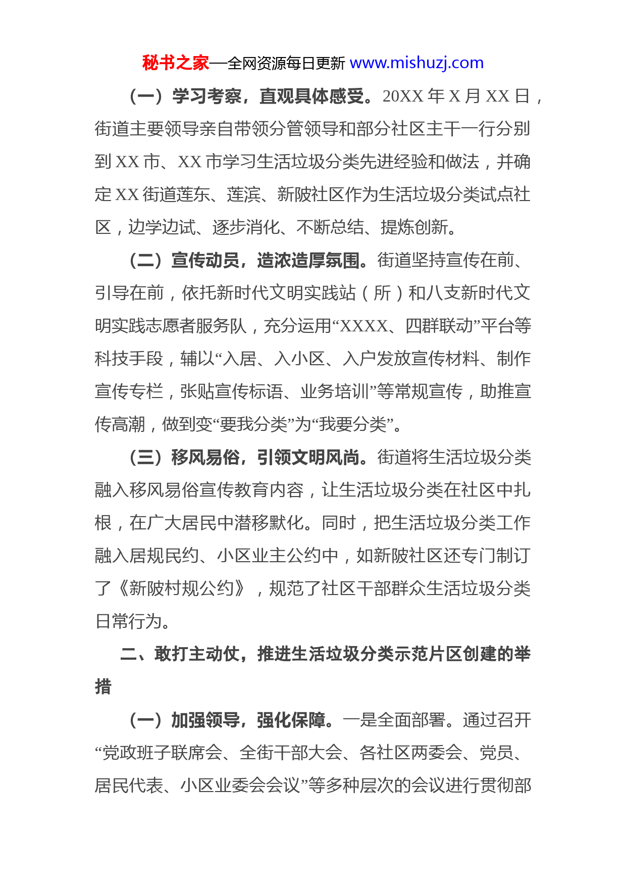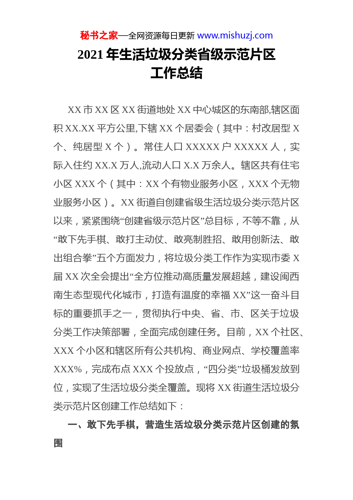 秘书之家—全网资源每日更新www.mishuzj.com2021年生活垃圾分类省级示范片区工作总结XX市XX区XX街道地处XX中心城区的东南部,辖区面积XX.XX平方公里,下辖XX个居委会(其中:村改居型X个、纯居型X个)。常住人口XXXXX户XXXXX人,实际入住约XX.X万人,流动人口X.X万余人。辖区共有住宅小区XXX个(其中:XX个有物业服务小区,XXX个无物业服务小区)。XX街道自创建省级生活垃圾分类示范片区以来,紧紧围绕“创建省级示范片区”总目标,不等不靠,从“敢下先手棋、敢打主动仗、敢亮制胜招、敢用创新法、敢出组合拳”五个方面发力,将垃圾分类工作作为实现市委X届XX次全会提出“全方位推动高质量发展超越,建设闽西南生态型现代化城市,打造有温度的幸福XX”这一奋斗目标的重要抓手之一,贯彻执行中央、省、市、区关于垃圾分类工作决策部署,全面完成创建任务。目前,XX个社区、XXX个小区和辖区所有公共机构、商业网点、学校覆盖率XXX%,完成布点XXX个投放点,“四分类”垃圾桶发放到位,实现了生活垃圾分类全覆盖。现将XX街道生活垃圾分类示范片区创建工作总结如下:一、敢下先手棋,营造生活垃圾分类示范片区创建的氛围秘书之家—全网资源每日更新www.mishuzj.com(一)学习考察,直观具体感受。20XX年X月XX日,街道主要领导亲自带领分管领导和部分社区主干一行分别到XX市、XX市学习生活垃圾分类先进经验和做法,并确定XX街道莲东、莲滨、新陂社区作为生活垃圾分类试点社区,边学边试、逐步消化、不断总结、提炼创新。(二)宣传动员,造浓造厚氛围。街道坚持宣传在前、引导在前,依托新时代文明实践站(所)和八支新时代文明实践志愿者服务队,充分运用“XXXX、四群联动”平台等科技手段,辅以“入居、入小区、入户发放宣传材料、制作宣传专栏,张贴宣传标语、业务培训”等常规宣传,助推宣传高潮,做到变“要我分类”为“我要分类”。(三)移风易俗,引领文明风尚。街道将生活垃圾分类融入移风易俗宣传教育内容,让生活垃圾分类在社区中扎根,在广大居民中潜移默化。同时,把生活垃圾分类工作融入居规民约、小区业主公约中,如新陂社区还专门制订了《新陂村规公约》,规范了社区干部群众生活垃圾分类日常行为。二、敢打主动仗,推进生活垃圾分类示范片区创建的举措(一)加强领导,强化保障。一是全面部署。通过召开“党政班子联席会、全街干部大会、各社区两委会、党员、居民代表、小区业委会会议”等多种层次的会议进行贯彻部秘书之家—全网资源每日更新www.mishuzj.com署,增强生活垃圾分类工作的思想自觉和行动自觉。截止目前,召开党政班子会、干部例会等各类会议XX多场次。二是全力推进。迅速出台了20XX年、2020年XX街道生活垃圾强制分类方案,明确了垃圾分类工作内容、要求、措施。同时,成立了以街道党工委书记为组长的生活垃圾分类工作领导小组,下设办公室,负责日常统筹协调等工作(二)落实责任,敢于担当。出台了《XX街道生活垃圾分类责任考核办法》,与街居干部绩效、晋升挂钩。成立生活垃圾分类工作专班,配强专班队伍,推行生活垃圾分类工作督查“五项机制”,发现存在问题及时通报、罗列清单、督促整改。(三)舍得投入,强化保障。举全街道之力,在人力、物力、财力全方位保障。启动生活垃圾分类工作以来,共投入经费基础建设、服务管理、宣传引导等经费XXXX余万元。对开展试点社区在工作经费安排上给予倾斜,充分调动了基层干部群众参与的积极性和主动性。三、敢亮制胜招,破解生活垃圾分类示范片区创建的难题(一)苦口婆心出软招,全力做好群众的思想工作。针对部分小区居民对环保亭(屋)、无遮盖式投放点等布点存有疑议、阻扰施工,街道挂钩小区领导干部和社区干部秘书之家—全网资源每日更新www.mishuzj.com采取“白+黑”“五+二”“晴+雨”模式,不厌其烦地入户做小区居民思想工作,以真情真心暖心换得支持配合,保障了生活垃圾分类基础设施建设顺利平稳地推进。(二)心如磐石出硬招,全力做好保护性的施工。针对部分小区个别居民仍拒绝配合的情况下,街道和社区果断出手、使出硬招,在程序依法依规下开展施工。(三)耐心细致出实招,全力做好精准分类的督导工作。与第三方服务公司签订购买服务合同,聘请XX个管理员、XXX名督导员,并建立健全日常监管机制,督导员每天对各小区开展桶边督导、开袋检查、入户宣传等工作,街道垃圾分类办每天不定时实地督促,确保督导员定时定点、在岗在位、规范作业。同时,各社区组织红色党支部、小区业委会参与指导、监督垃圾分类工作,保障小区垃圾分类正常运作、督导到位。四、敢用创新法,探索生活垃圾分类示范片区创建的规律(一)从解剖“麻雀”着手,逐个推动中让垃圾分类试点有序推进。开展社区生活垃圾分类试点工作,以XX、XX、XX为试点,涉及XX个小区,共建成XX个分类投放点,均配备“四分类”垃圾桶,公开招聘管理员X人,督导员XX人开展分类督导。试点工作已于XXXX年X月份全面完成,在总结试点经验的基础上,全面推进余下XX秘书之家—全网资源每日更新www.mishuzj.com个社区生活垃圾分类工作,共建成XXX个分类投放点,均配备“四分类”垃圾桶,公开招聘管理员X人,督导员XX人开展分类督导。(二)从政府购买服务着手,“高位嫁接”中让垃圾分类试点定位精准。街道运用“e