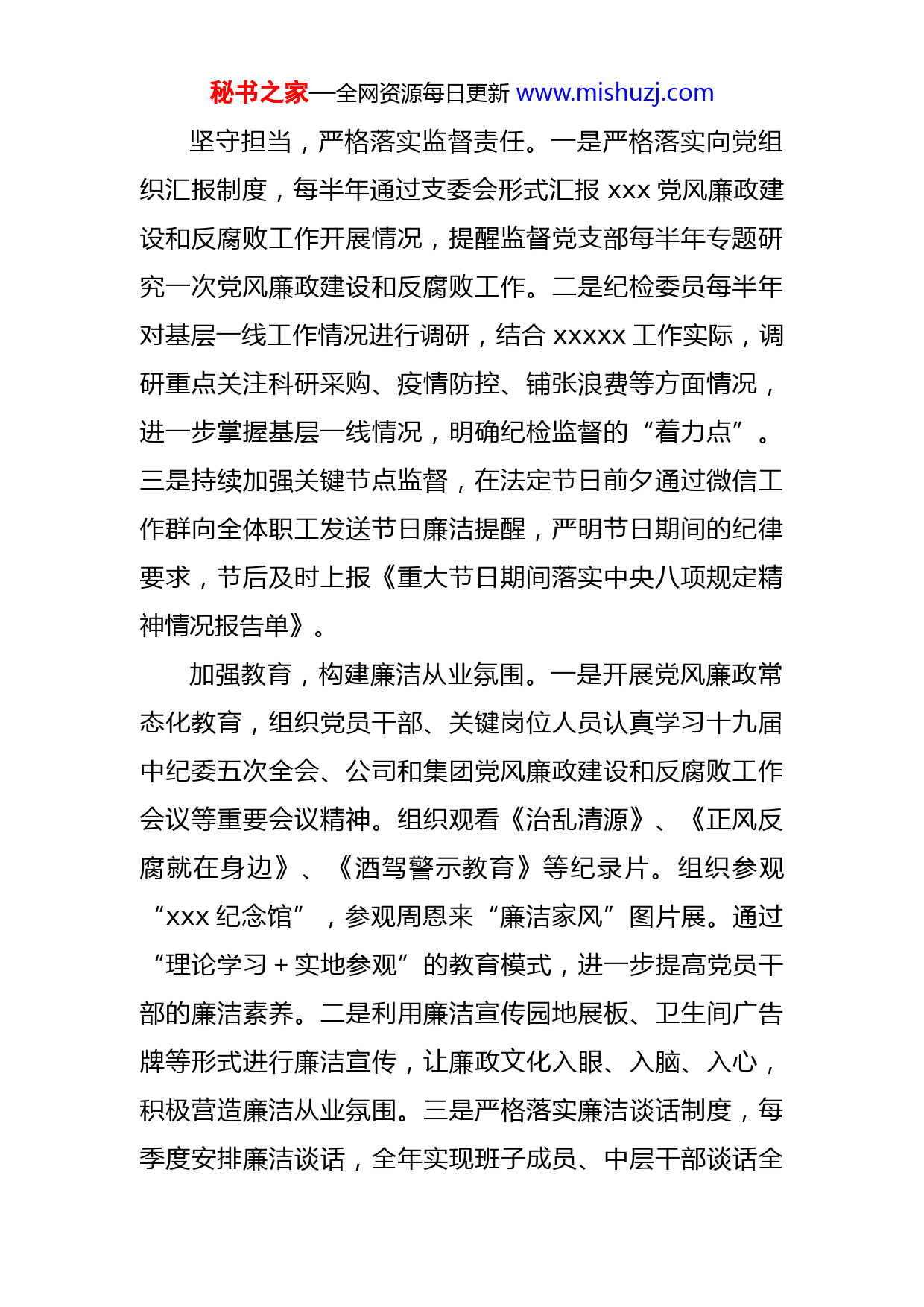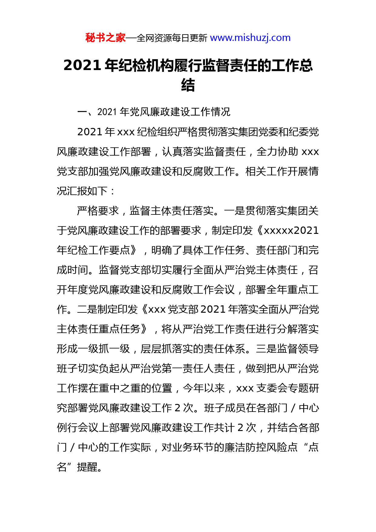 秘书之家—全网资源每日更新www.mishuzj.com2021年纪检机构履行监督责任的工作总结一、2021年党风廉政建设工作情况2021年xxx纪检组织严格贯彻落实集团党委和纪委党风廉政建设工作部署,认真落实监督责任,全力协助xxx党支部加强党风廉政建设和反腐败工作。相关工作开展情况汇报如下:严格要求,监督主体责任落实。一是贯彻落实集团关于党风廉政建设工作的部署要求,制定印发《xxxxx2021年纪检工作要点》,明确了具体工作任务、责任部门和完成时间。监督党支部切实履行全面从严治党主体责任,召开年度党风廉政建设和反腐败工作会议,部署全年重点工作。二是制定印发《xxx党支部2021年落实全面从严治党主体责任重点任务》,将从严治党工作责任进行分解落实形成一级抓一级,层层抓落实的责任体系。三是监督领导班子切实负起从严治党第一责任人责任,做到把从严治党工作摆在重中之重的位置,今年以来,xxx支委会专题研究部署党风廉政建设工作2次。班子成员在各部门/中心例行会议上部署党风廉政建设工作共计2次,并结合各部门/中心的工作实际,对业务环节的廉洁防控风险点“点名”提醒。秘书之家—全网资源每日更新www.mishuzj.com坚守担当,严格落实监督责任。一是严格落实向党组织汇报制度,每半年通过支委会形式汇报xxx党风廉政建设和反腐败工作开展情况,提醒监督党支部每半年专题研究一次党风廉政建设和反腐败工作。二是纪检委员每半年对基层一线工作情况进行调研,结合xxxxx工作实际,调研重点关注科研采购、疫情防控、铺张浪费等方面情况,进一步掌握基层一线情况,明确纪检监督的“着力点”。三是持续加强关键节点监督,在法定节日前夕通过微信工作群向全体职工发送节日廉洁提醒,严明节日期间的纪律要求,节后及时上报《重大节日期间落实中央八项规定精神情况报告单》。加强教育,构建廉洁从业氛围。一是开展党风廉政常态化教育,组织党员干部、关键岗位人员认真学习十九届中纪委五次全会、公司和集团党风廉政建设和反腐败工作会议等重要会议精神。组织观看《治乱清源》、《正风反腐就在身边》、《酒驾警示教育》等纪录片。组织参观“xxx纪念馆”,参观周恩来“廉洁家风”图片展。通过“理论学习+实地参观”的教育模式,进一步提高党员干部的廉洁素养。二是利用廉洁宣传园地展板、卫生间广告牌等形式进行廉洁宣传,让廉政文化入眼、入脑、入心,积极营造廉洁从业氛围。三是严格落实廉洁谈话制度,每季度安排廉洁谈话,全年实现班子成员、中层干部谈话全秘书之家—全网资源每日更新www.mishuzj.com覆盖,谈话内容聚焦“谈人谈事谈责”,着重关注不同领域的廉洁防控风险,提醒时刻绷紧“廉洁之弦”。提高认识,积极开展专项监督。一是积极配合集团巡察组开展巡察整改“回头看”工作,秉持“无遮盖,不遮掩”的工作态度,将巡察反馈问题整改情况如实汇报给巡察组,并分门别类整理好相关整改佐证材料,确保巡察审计发现问题全面整改到位。二是开展疫情防控工作监督,严格落实公司及集团疫情防控要求,坚持外防输入、内防反弹,强化员工关心关爱,督促做好自我防护,杜绝麻痹思想,坚决有效防止疫情反弹。三是开展安全生产监督,监督安全警示教育和安全隐患排查情况,坚持“教育”和“排查”两手并重,切实提高政治站位,牢记生命重于泰山,强化底线思维和红线意识,确保业务发展和安全生产两手抓、两不误。四是对照2021年xxxxx公司党组巡视发现典型问题自查自纠,坚持靶向定位、精准整改,明确整改目标和工作重点,针对查找的5项问题,研究制定5项整改措施,明确整改责任人,一个问题一个问题整改、一个问题一个问题落实,确保条条改到位、件件有落实。加强保障,深化纪检监察干部自身建设。一是加强纪检干部政治建设,集中学习《习近平谈治国理政第三卷》中央纪委十九届五次全会精神、xx纪检监察史等内容,坚决贯彻中央纪委和上级纪检组织的决策部署,牢固树立纪秘书之家—全网资源每日更新www.mishuzj.com检干部正确的政治方向,坚定理想信念,坚决杜绝“灯下黑”。二是积极参加集团纪检监察干部培训班,通过专家解读,进一步提升纪检监察干部履责能力。三是把常态化自学当作重点工作来抓,通过“三会一课”、纪检干部专题学习等形式,及时掌握上级政策规定和法律法规最新要求,参加集团xx、纪检监察史知识竞赛并取得满分,为更好的开展纪检工作提供理论支持。二、特色亮点建立年度党风廉政建设工作“工作月历”:根据集团党风廉政工作考评指标,结合部门年度工作实际,制定全年党风廉政建设工作“工作月历”,将党风廉政建设工作分解至每月,实现工作任务“可视化”管理,有效提高工作效率。三、存在的薄弱环节和不足廉洁教育的形式不够丰富。廉洁教育大多以“读文章”、“听讲解”等形式开展,形式单一,员工接受度和参与度不高。廉洁教育内容不够充实。本年度虽也组织全体党员和关键岗位人员学习了上级指示精神和相关政策法规,但教育内容多聚焦在“正向”引导层面,对于利用“反面”教材进行警示教育有所缺失,导致廉洁教育缺少一定的震慑力,未能触及灵魂,教育效果有待提高。秘书之家—全网资源每日更新www.mishuzj.com廉洁宣传形式单一。廉洁宣传主要利用楼道宣传展