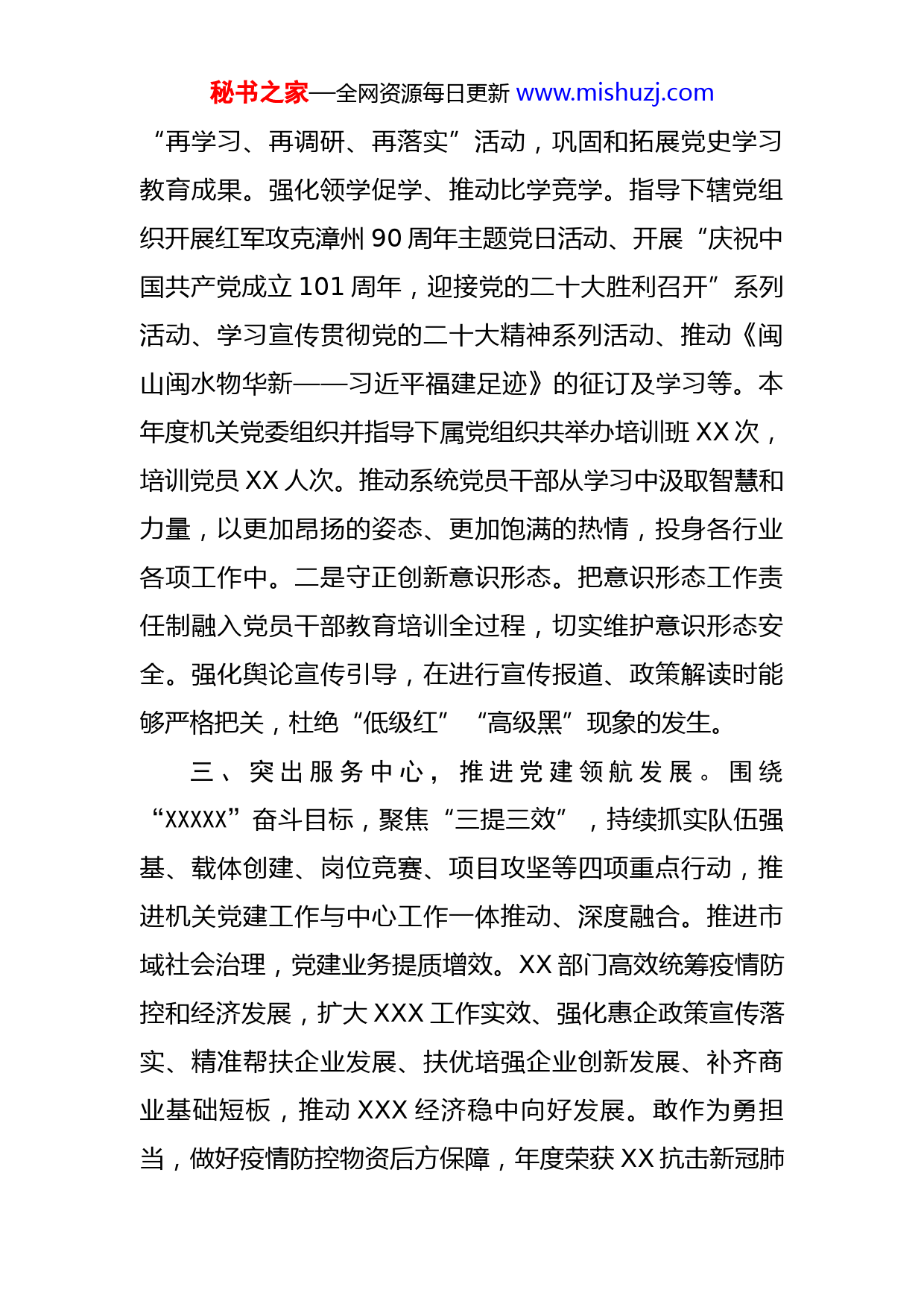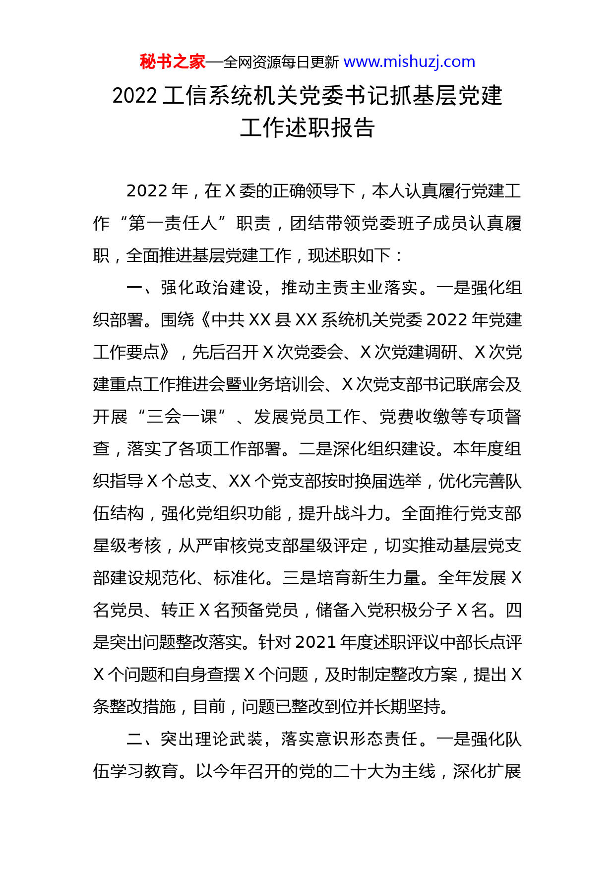 秘书之家—全网资源每日更新www.mishuzj.com2022工信系统机关党委书记抓基层党建工作述职报告2022年,在X委的正确领导下,本人认真履行党建工作“第一责任人”职责,团结带领党委班子成员认真履职,全面推进基层党建工作,现述职如下:一、强化政治建设,推动主责主业落实。一是强化组织部署。围绕《中共XX县XX系统机关党委2022年党建工作要点》,先后召开X次党委会、X次党建调研、X次党建重点工作推进会暨业务培训会、X次党支部书记联席会及开展“三会一课”、发展党员工作、党费收缴等专项督查,落实了各项工作部署。二是深化组织建设。本年度组织指导X个总支、XX个党支部按时换届选举,优化完善队伍结构,强化党组织功能,提升战斗力。全面推行党支部星级考核,从严审核党支部星级评定,切实推动基层党支部建设规范化、标准化。三是培育新生力量。全年发展X名党员、转正X名预备党员,储备入党积极分子X名。四是突出问题整改落实。针对2021年度述职评议中部长点评X个问题和自身查摆X个问题,及时制定整改方案,提出X条整改措施,目前,问题已整改到位并长期坚持。二、突出理论武装,落实意识形态责任。一是强化队伍学习教育。以今年召开的党的二十大为主线,深化扩展秘书之家—全网资源每日更新www.mishuzj.com“再学习、再调研、再落实”活动,巩固和拓展党史学习教育成果。强化领学促学、推动比学竞学。指导下辖党组织开展红军攻克漳州90周年主题党日活动、开展“庆祝中国共产党成立101周年,迎接党的二十大胜利召开”系列活动、学习宣传贯彻党的二十大精神系列活动、推动《闽山闽水物华新——习近平福建足迹》的征订及学习等。本年度机关党委组织并指导下属党组织共举办培训班XX次,培训党员XX人次。推动系统党员干部从学习中汲取智慧和力量,以更加昂扬的姿态、更加饱满的热情,投身各行业各项工作中。二是守正创新意识形态。把意识形态工作责任制融入党员干部教育培训全过程,切实维护意识形态安全。强化舆论宣传引导,在进行宣传报道、政策解读时能够严格把关,杜绝“低级红”“高级黑”现象的发生。三、突出服务中心,推进党建领航发展。围绕“XXXXX”奋斗目标,聚焦“三提三效”,持续抓实队伍强基、载体创建、岗位竞赛、项目攻坚等四项重点行动,推进机关党建工作与中心工作一体推动、深度融合。推进市域社会治理,党建业务提质增效。XX部门高效统筹疫情防控和经济发展,扩大XXX工作实效、强化惠企政策宣传落实、精准帮扶企业发展、扶优培强企业创新发展、补齐商业基础短板,推动XXX经济稳中向好发展。敢作为勇担当,做好疫情防控物资后方保障,年度荣获XX抗击新冠肺秘书之家—全网资源每日更新www.mishuzj.com炎疫情集体嘉奖。XX部门深化拓展“机关联动乡村,党建引领振兴”行动,进一步促进党建与业务工作深度融合,积极开展党建民心工程,提升公路养护和路况服务水平,美化路域环境,为群众出行服务。在疫情防控一线成立X个临时党支部,设立党员先锋岗,党员干部冲锋在一线、战斗在一线、服务在一线,以实际行动践行初心使命,坚决守好疫情防控“出入关”。XX部门以党建引领,全力当好人民“守夜人”。提升全民安全意识,加强安全生产监督管理,深入开展“安全生产百日大会战”,安全生产形势持续向好。XXX深化“XX联动”体制机制,建成“三位一体”服务中心,推动金融贷款渠道进一步多元化、多样化,为丰富“三位一体”综合合作增添金融力量,进一步提升服务专业合作社及联合社、家庭农场等农民合作经济组织的综合社会效益。XX部门以党建推进网络强国建设,进一步提升网络资源能力,加快5G网络全覆盖。同时充分发挥云网融合优势,赋能千行百业,创建良好的营商环境,更好地服务地方经济,助力“数字XX”发展壮大。四、弘扬社会文明,推进模范机关建设。培育践行社会主义核心价值观,发挥党员带头示范作用,我委组织各级党组织深入开展社区“双报到”等各类志愿服务活动,积极参加省级文明县城创建工作和疫情防控工作,推动机关精神文明创建取得新成效。在新时代文明实践中心成立X秘书之家—全网资源每日更新www.mishuzj.com支服务大队,年度开展志愿服务活动XX次。系统各部门持续发挥行业优势,履行社会责任。对照中央和省市县的标准要求,我在履行党建职责方面还有不小差距:一是推动党建工作办法不够丰富。平时注重对基层党建“必修课”和“规定动作”的落实,结合不同单位实际“选修课”和“自选动作”较少,对基层党建创新创造落实不够,缺乏高质量、上水平的党建活动载体。指导基层党组织安排的学习任务多,集体活动少,形式比较单一,基层党建工作新思路、新举措不多,对准确把握年轻党员特点,增强支部吸引力、提升凝聚力上还有不足。二是党建深度融合缺乏操作性。对新形势下加强党建工作的思路、载体、措施研究的不够,不能很好的将最新的党建理论同实际工作很好地结合,存在就党建抓党建问题,党建与业务工作深度融合还有待进一步提高,缺少具体抓手,没能将基层党建工作抓出新意,抓出特点,围绕中心、服务大局作用发挥受局限。三是提高舆论引导的本领需要进一步增强。意识形态阵地和人才队伍建设、管理力度有待进一步加强,我系统党建类宣传在省、
