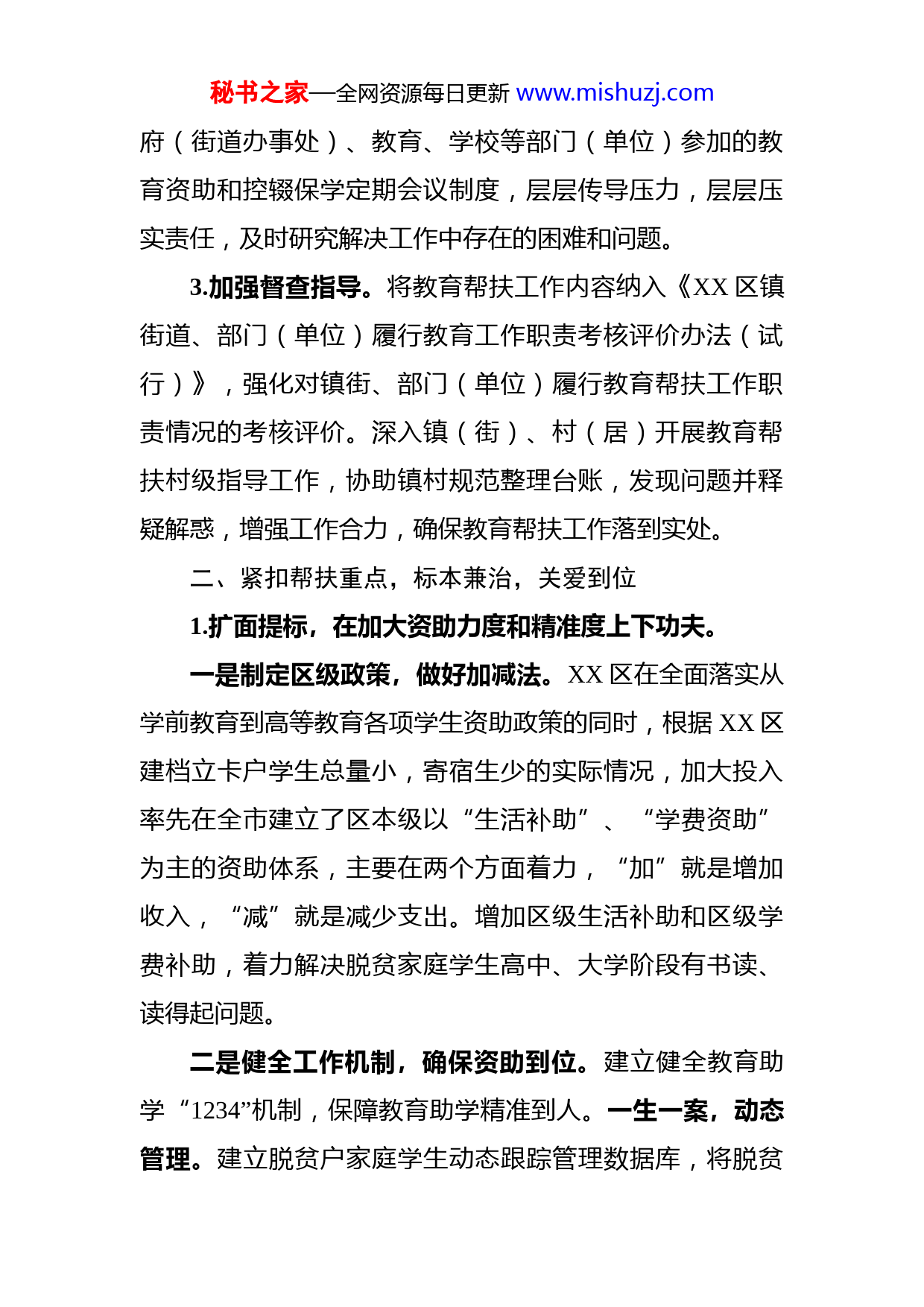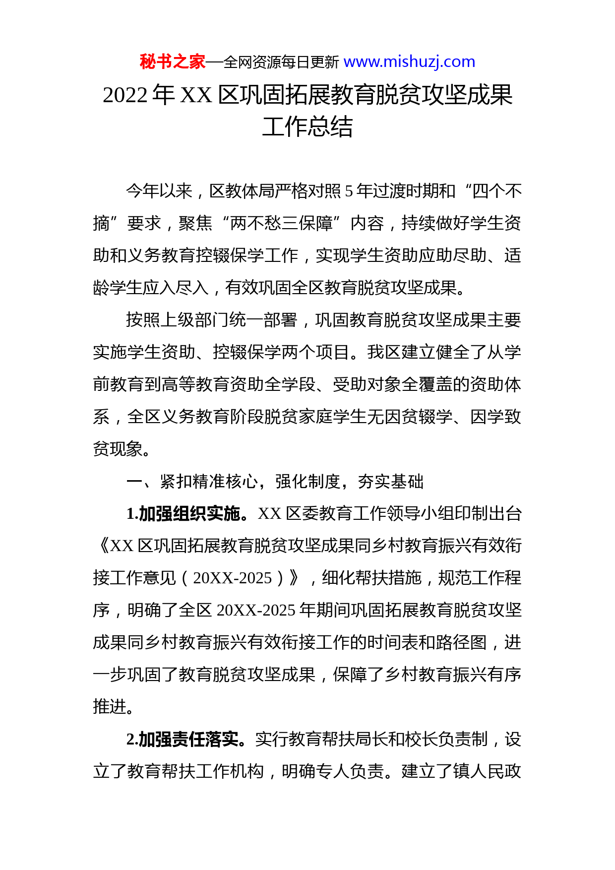 秘书之家—全网资源每日更新www.mishuzj.com2022年XX区巩固拓展教育脱贫攻坚成果工作总结今年以来,区教体局严格对照5年过渡时期和“四个不摘”要求,聚焦“两不愁三保障”内容,持续做好学生资助和义务教育控辍保学工作,实现学生资助应助尽助、适龄学生应入尽入,有效巩固全区教育脱贫攻坚成果。按照上级部门统一部署,巩固教育脱贫攻坚成果主要实施学生资助、控辍保学两个项目。我区建立健全了从学前教育到高等教育资助全学段、受助对象全覆盖的资助体系,全区义务教育阶段脱贫家庭学生无因贫辍学、因学致贫现象。一、紧扣精准核心,强化制度,夯实基础1.加强组织实施。XX区委教育工作领导小组印制出台《XX区巩固拓展教育脱贫攻坚成果同乡村教育振兴有效衔接工作意见(20XX-2025)》,细化帮扶措施,规范工作程序,明确了全区20XX-2025年期间巩固拓展教育脱贫攻坚成果同乡村教育振兴有效衔接工作的时间表和路径图,进一步巩固了教育脱贫攻坚成果,保障了乡村教育振兴有序推进。2.加强责任落实。实行教育帮扶局长和校长负责制,设立了教育帮扶工作机构,明确专人负责。建立了镇人民政秘书之家—全网资源每日更新www.mishuzj.com府(街道办事处)、教育、学校等部门(单位)参加的教育资助和控辍保学定期会议制度,层层传导压力,层层压实责任,及时研究解决工作中存在的困难和问题。3.加强督查指导。将教育帮扶工作内容纳入《XX区镇街道、部门(单位)履行教育工作职责考核评价办法(试行)》,强化对镇街、部门(单位)履行教育帮扶工作职责情况的考核评价。深入镇(街)、村(居)开展教育帮扶村级指导工作,协助镇村规范整理台账,发现问题并释疑解惑,增强工作合力,确保教育帮扶工作落到实处。二、紧扣帮扶重点,标本兼治,关爱到位1.扩面提标,在加大资助力度和精准度上下功夫。一是制定区级政策,做好加减法。XX区在全面落实从学前教育到高等教育各项学生资助政策的同时,根据XX区建档立卡户学生总量小,寄宿生少的实际情况,加大投入率先在全市建立了区本级以“生活补助”、“学费资助”为主的资助体系,主要在两个方面着力,“加”就是增加收入,“减”就是减少支出。增加区级生活补助和区级学费补助,着力解决脱贫家庭学生高中、大学阶段有书读、读得起问题。二是健全工作机制,确保资助到位。建立健全教育助学“1234”机制,保障教育助学精准到人。一生一案,动态管理。建立脱贫户家庭学生动态跟踪管理数据库,将脱贫秘书之家—全网资源每日更新www.mishuzj.com户家庭学生(含随迁子女)、辍学学生、残疾儿童分类造册登记,定期核查、定点跟踪,形成“一生一案”,全面及时掌握脱贫户家庭学生信息情况。镇(街)、校联动,“双线”负责。建立了春、秋季学期镇(街)、学校、教体局共同参与的教育资助会商制度,加强对镇(街)、学校调度,强化责任意识。实行“双线(镇街、学校)”摸排比对,精准识别从学前教育到高等教育的五类学生资助信息,同时与全市脱贫户家庭信息进行函数比对,确保精准到人。三级公示,四级审核。学校和村进行初审,镇(街办)汇总审核上报,教体局联合乡村振兴局进行终审确定拟资助名单后,再把名单下发到学校、村、镇(街)进行公示,确保公开、公平、公正,不错漏一人,公示期满无误后再通过“财政一卡通”发放,确保资助金准确、及时发放到脱贫户手中。同时,完善村、校同步摸底比对,镇街、教育同步联审机制,缩短识别时间,提高识别精准度,做到精准识别不漏不错,确保教育帮扶政策全覆盖,助学资金及时发放到位。2.多措并举,着力控辍保学。一是压实镇(街)履行义务教育控辍保学工作的主体责任,与学校一起开展“双线控辍”工作,建立了义务教育阶段学生辍学失学书面报告脱贫户家庭学生辍学“六对一”挂点联系劝学制度,动态秘书之家—全网资源每日更新www.mishuzj.com管理,及时掌握脱贫户和监测对象家庭学生的辍学动向,镇、村(街道、社区)、教育局、学校第一时间联合开展劝学工作。强化帮扶干部责任,将脱贫户家庭子女和监测对象入学情况纳入帮扶干部工作考核,充分利用帮扶干部素质高、对脱贫户家庭情况熟的优势,有效发挥帮扶干部在控辍保学尤其是在真情劝返方面的作用。二是实施多元化关爱工程。关爱学困生,实施帮扶干部、校级领导、班主任、心理健康教师“N+1”帮扶关爱工程,开展帮扶系列活动,构建了“纵向到底、横向到边,监护到位、关爱到人”的脱贫户和监测对象家庭学生、残疾学生和留守学生关爱网络。我区以“红色教育活动传承优良传统”为主题组织脱贫户家庭学生开展的研学旅行活动得到了江西卫视教育频道的报道推介,《探索劳动育人改革,实现教育“双减”与乡村振兴共赢》文稿在中央政策研究室刊发。三是加强家长教育。宣传义务教育法,教育家长履行监护责任,确保子女上学。
