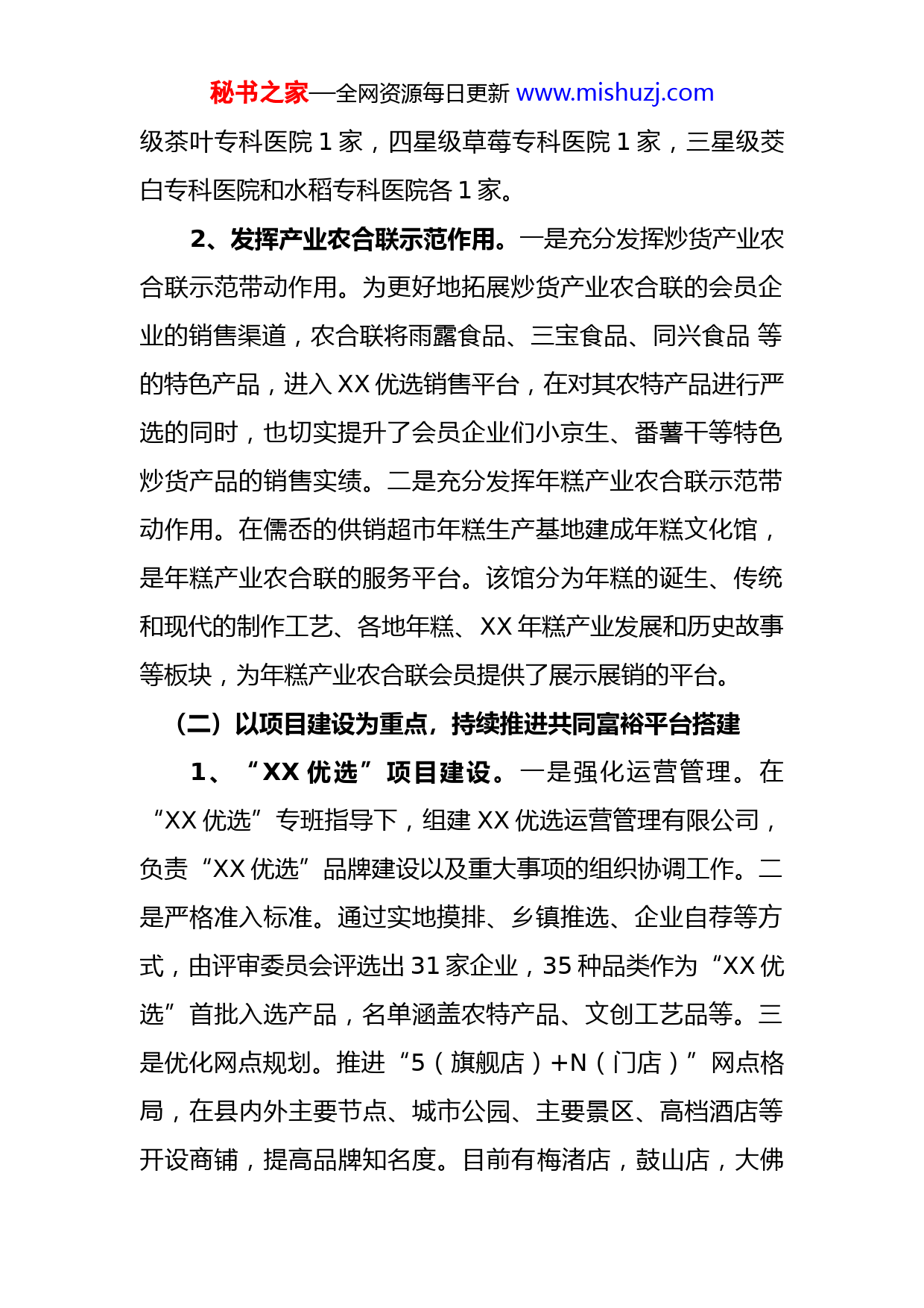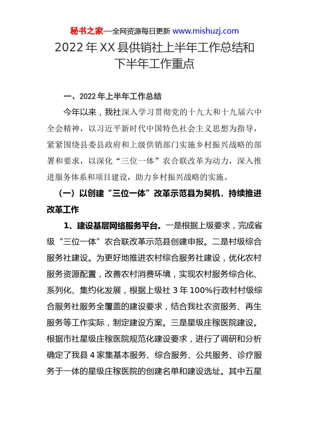秘书之家—全网资源每日更新www.mishuzj.com2022年XX县供销社上半年工作总结和下半年工作重点一、2022年上半年工作总结今年以来,我社深入学习贯彻党的十九大和十九届六中全会精神,以习近平新时代中国特色社会主义思想为指导,紧紧围绕县委县政府和上级供销部门实施乡村振兴战略的部署和要求,以深化“三位一体”农合联改革为动力,深入推进服务体系和项目建设,助力乡村振兴战略的实施。(一)以创建“三位一体”改革示范县为契机,持续推进改革工作1、建设基层网络服务平台。一是根据上级要求,完成省级“三位一体”农合联改革示范县创建申报。二是村级综合服务社建设。为更好地推进农村综合服务社建设,优化农村服务资源配置,改善农村消费环境,实现农村服务综合化、系列化、集约化发展,根据上级社3年100%行政村村级综合服务社服务全覆盖的建设要求,结合我社农资服务、再生服务等工作实际,制定建设方案。三是星级庄稼医院建设。根据市社星级庄稼医院规范化建设要求,进行了调研和分析确定了我县4家集基本服务、综合服务、公共服务、诊疗服务于一体的星级庄稼医院的创建名单和建设选址。其中五星秘书之家—全网资源每日更新www.mishuzj.com级茶叶专科医院1家,四星级草莓专科医院1家,三星级茭白专科医院和水稻专科医院各1家。2、发挥产业农合联示范作用。一是充分发挥炒货产业农合联示范带动作用。为更好地拓展炒货产业农合联的会员企业的销售渠道,农合联将雨露食品、三宝食品、同兴食品等的特色产品,进入XX优选销售平台,在对其农特产品进行严选的同时,也切实提升了会员企业们小京生、番薯干等特色炒货产品的销售实绩。二是充分发挥年糕产业农合联示范带动作用。在儒岙的供销超市年糕生产基地建成年糕文化馆,是年糕产业农合联的服务平台。该馆分为年糕的诞生、传统和现代的制作工艺、各地年糕、XX年糕产业发展和历史故事等板块,为年糕产业农合联会员提供了展示展销的平台。(二)以项目建设为重点,持续推进共同富裕平台搭建1、“XX优选”项目建设。一是强化运营管理。在“XX优选”专班指导下,组建XX优选运营管理有限公司,负责“XX优选”品牌建设以及重大事项的组织协调工作。二是严格准入标准。通过实地摸排、乡镇推选、企业自荐等方式,由评审委员会评选出31家企业,35种品类作为“XX优选”首批入选产品,名单涵盖农特产品、文创工艺品等。三是优化网点规划。推进“5(旗舰店)+N(门店)”网点格局,在县内外主要节点、城市公园、主要景区、高档酒店等开设商铺,提高品牌知名度。目前有梅渚店,鼓山店,大佛秘书之家—全网资源每日更新www.mishuzj.com寺店,鲁迅故里店,左于店,及万怡酒店、尊蓝山居优选点等7家店(点)。四是统一规范管理,制定了《“XX优选”品牌管理办法》,做到“五个统一”:统一品牌形象、统一认定标准、统一包装设计、统一监督管理、统一宣传推介。五是强化政策扶持。县财政每年统筹安排“XX优选”品牌发展专项资金1000万元,主要用于开设门店(柜)、包装制作、品牌推介等方面的补助和奖励。六是开展多元营销。过直播、短视频带货销售等渠道促进线上销售,举办“XX优选”品牌发布会,做好品牌宣传、深耕品牌文化、讲好品牌故事。2、XX县茶叶整理服务中心项目建设。该项目通过采购茶叶匀堆机、数控色选机、静电除杂机、自动包装机、自动赋码、滚动式真空包装机、割沫、风选一体机、打包机、热收缩膜包装机、视频监控设备和除尘设施等,为茶农、茶商提供匀堆、除杂、色选、包装等服务,可一次性拼配茶叶2吨左右。有效补齐了茶市配套服务短板,改善了中国茶市整体形象,促进茶产业转型升级,实现由传统茶业向现代茶业发展。通过科技手段,让茶叶品质得到提升,让茶农、消费者、经营者的关系进一步融洽,进一步保证各方利益。(三)以春备耕农资下乡为抓手,持续推进为民工作1、春备耕农资下乡活动。4月份,我社联合惠多利农资公司积极开展春备耕农资、农技下乡活动。向种植大户提供秘书之家—全网资源每日更新www.mishuzj.com有机肥40吨并组织人员和农技专家前往羽林街道、东茗乡等地为农户提供病虫害防治技术、春季育苗技术指导并向农户和农资供应点宣传配方肥相关政策。截至目前,全系统共储备各类化肥1180吨、农药20吨,为春备耕提供有力保障。2、推进“配方肥替代平衡肥”行动。年初我社和农业农村局联合下发《关于印发XX县全面推进“配方肥替代平衡肥”行动实施方案的通知》,同时我社发布《XX县主要农作物肥料建议主售配方(2022年)》,根据肥药减量问题整改专项督查要求,督促农资公司做好实名制购销、数字化台账建设等工作;通过培训、印发技术资料等多种形式积极推广主售配方,将主售配方发至各农资经营店、合作社、自然村和种植户,深化农企合作、技术培训和指导服务,切实提高测土配方施肥覆盖率,降低农业面源污染,推动农业保供增收,促进生态文明建设和农业高质量。(四)以清廉供销建设为抓手,持续推进供销自身建设1、清廉供销建设。一是抓好全面从严治党工作,落实全面从严治党责任年度任务安排,层层签订《2022年全面从严治党责任书》,明确责任分工、完成时限与要求。专题学习《中共XX县委办公室关于印发加强对