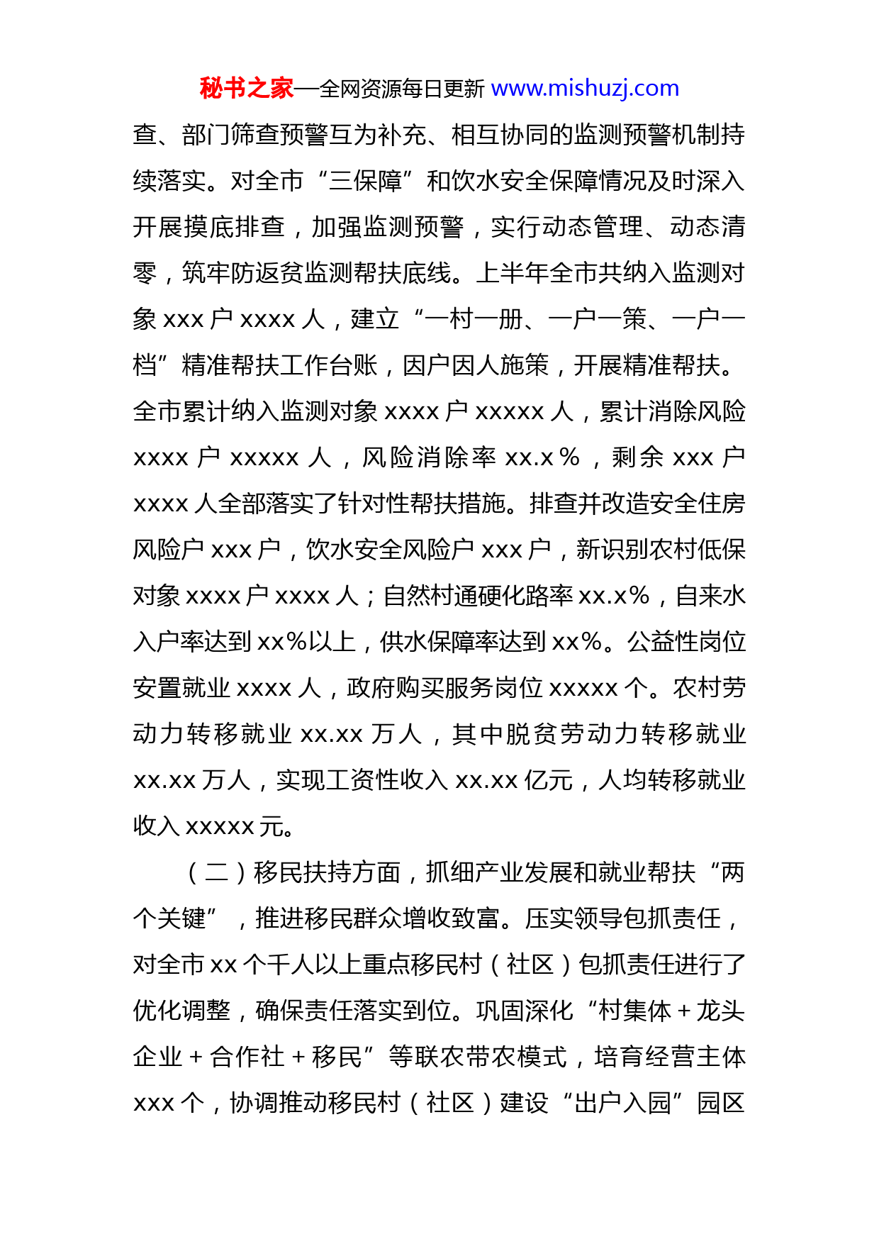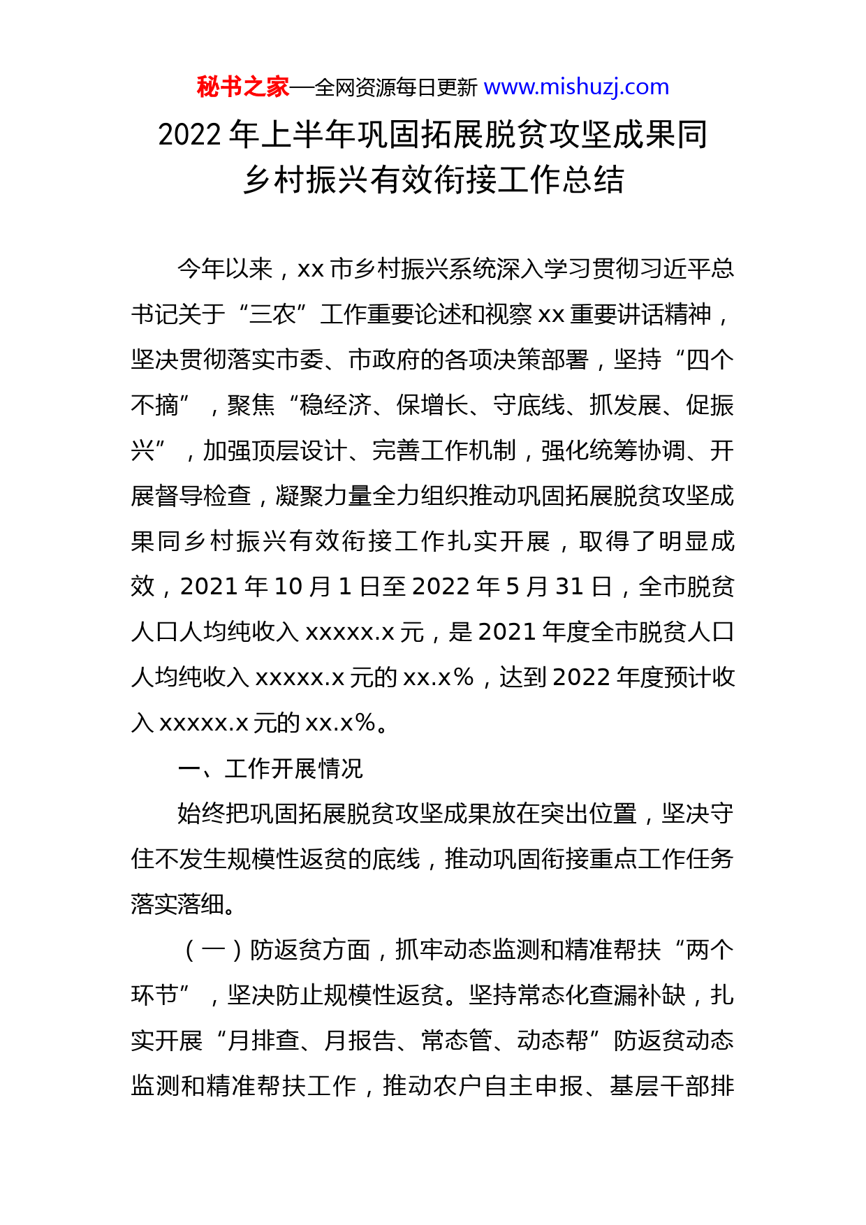 秘书之家—全网资源每日更新www.mishuzj.com2022年上半年巩固拓展脱贫攻坚成果同乡村振兴有效衔接工作总结今年以来,xx市乡村振兴系统深入学习贯彻习近平总书记关于“三农”工作重要论述和视察xx重要讲话精神,坚决贯彻落实市委、市政府的各项决策部署,坚持“四个不摘”,聚焦“稳经济、保增长、守底线、抓发展、促振兴”,加强顶层设计、完善工作机制,强化统筹协调、开展督导检查,凝聚力量全力组织推动巩固拓展脱贫攻坚成果同乡村振兴有效衔接工作扎实开展,取得了明显成效,2021年10月1日至2022年5月31日,全市脱贫人口人均纯收入xxxxx.x元,是2021年度全市脱贫人口人均纯收入xxxxx.x元的xx.x%,达到2022年度预计收入xxxxx.x元的xx.x%。一、工作开展情况始终把巩固拓展脱贫攻坚成果放在突出位置,坚决守住不发生规模性返贫的底线,推动巩固衔接重点工作任务落实落细。(一)防返贫方面,抓牢动态监测和精准帮扶“两个环节”,坚决防止规模性返贫。坚持常态化查漏补缺,扎实开展“月排查、月报告、常态管、动态帮”防返贫动态监测和精准帮扶工作,推动农户自主申报、基层干部排秘书之家—全网资源每日更新www.mishuzj.com查、部门筛查预警互为补充、相互协同的监测预警机制持续落实。对全市“三保障”和饮水安全保障情况及时深入开展摸底排查,加强监测预警,实行动态管理、动态清零,筑牢防返贫监测帮扶底线。上半年全市共纳入监测对象xxx户xxxx人,建立“一村一册、一户一策、一户一档”精准帮扶工作台账,因户因人施策,开展精准帮扶。全市累计纳入监测对象xxxx户xxxxx人,累计消除风险xxxx户xxxxx人,风险消除率xx.x%,剩余xxx户xxxx人全部落实了针对性帮扶措施。排查并改造安全住房风险户xxx户,饮水安全风险户xxx户,新识别农村低保对象xxxx户xxxx人;自然村通硬化路率xx.x%,自来水入户率达到xx%以上,供水保障率达到xx%。公益性岗位安置就业xxxx人,政府购买服务岗位xxxxx个。农村劳动力转移就业xx.xx万人,其中脱贫劳动力转移就业xx.xx万人,实现工资性收入xx.xx亿元,人均转移就业收入xxxxx元。(二)移民扶持方面,抓细产业发展和就业帮扶“两个关键”,推进移民群众增收致富。压实领导包抓责任,对全市xx个千人以上重点移民村(社区)包抓责任进行了优化调整,确保责任落实到位。巩固深化“村集体+龙头企业+合作社+移民”等联农带农模式,培育经营主体xxx个,协调推动移民村(社区)建设“出户入园”园区秘书之家—全网资源每日更新www.mishuzj.comxx个。今年,全市移民村(社区)共谋划产业、就业、基础设施、公共服务、人居环境和基层治理等各类项目xxx个,总投资x.x亿元,其中产业类项目xxx个,投资x.xx亿元;就业类项目xx个,投资x.xx亿元;产业和就业项目投资占比达xx%,截至目前,已开工项目xxx个,开工率xx.x%,完成投资x.xx亿元。组织输出劳动力x.xx万人(其中脱贫劳动力x.xx万人),就近就业x.xx万人、自主创业xxxx人,开发公益性岗位就业xxxx人。推动全市xxx家就业帮扶车间开复工xxx家,受季节影响未运行的帮扶车间x个,开复工率xx.x%,吸纳农村劳动力xxxx人,其中脱贫劳动力xxxx人。打造移民示范村xx个,计划投资x.x亿元,其中产业和就业项目投资占比达xx%以上。(三)项目资金方面,抓实资金投入和项目建设“两个基础”,持续稳定发挥带动作用。今年,计划整合各类涉农资金xx.x亿元,截至目前,已到位xx.x亿元,其中中央衔接资金xx.x亿元、自治区衔接资金x.xx亿元、政府一般债务资金x.xx亿元、其他涉农资金x.xx亿元、县(区)级财政安排资金x.xx亿元;衔接资金安排率xxx%,项目开工率xxx%;衔接资金支付率xx.x%,(其中xx县xx.x%、xx县xx.x%、xx区xx.x%、xx县xx.xx%、xx县xx.x%)。今年已下达的中央和自治区衔接资金秘书之家—全网资源每日更新www.mishuzj.com中,用于产业资金占比xx.x%,到人到户项目资金的占比xx.x%。持续加强对全市脱贫人口的贷款扶持,截至x月底,全市脱贫人口(包括监测对象)贷款余额xx.xx亿元,获贷脱贫户x.xx万户,户均x.xx万元;当年新增xxxxx户x.xx亿元,完成贷款任务xx.xx亿元的xx.xx%,贷款覆盖率xx.xx%。截止目前,全市共储备巩固衔接项目xxxx个,资金规模xx.xx亿元,同比减少xxx个,xx区、xx县、xx县项目储备数量同比分别增加xxx个、xxx个和xxx个,xx县、xx县分别下降xxx个和xxx个。(四)社会助力方面,抓好xx协作和社会帮扶“两个重点”,助推成果巩固衔接振兴。认真谋划xx协作项目,共争取xx帮扶资金x.xxx亿元,实施帮扶项目xxx个。截止目前,两省市、县共开展互访交流x次xxx人,其中xx市及五县(区)赴福建考察学习x次xx人,共结成学校、医院、乡镇、村等帮扶对子xxx对。抓好劳务协作和人才交流,举办劳务培训xx场次培训xxx人,向福建“点对点”输出劳动力xxxx人,其中脱贫劳动力xxxx人,与去年相比新增xxx人,其中脱贫劳动力xxx人。福建省选派科技、教育、卫生等人才xxx人来固开展帮扶工作。持续开展消费帮扶,销售xx特色农产品x.x亿元。启动建设xx乡村振兴示范村xx个,计划投资x.x亿元,其中xx资金秘书之家—全网资源每日更新www.mishuzj.comxxxx万元。积极对接中央和国家x个定点帮扶单位,投入帮扶资金xxxx.x万元,实施帮扶项目xx个。“万企兴万村”行动正式启动,安排xx市xx个企业帮扶xx个村。组织xxx个帮扶单位、xxx个第一书记和xxxx名驻村工作队员开展帮扶工作,“调换召回”年龄偏大、身体患病等驻村干部xxx名。新一轮
