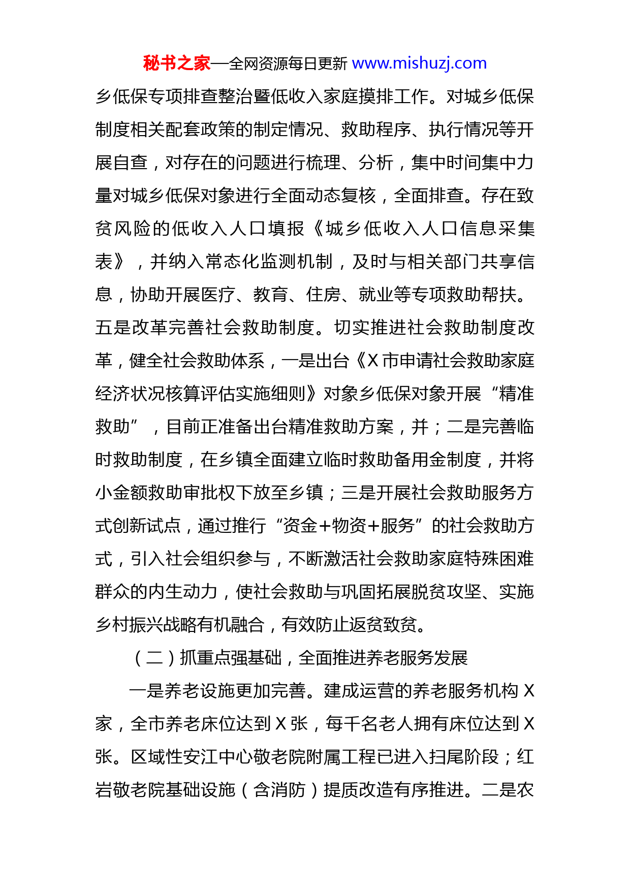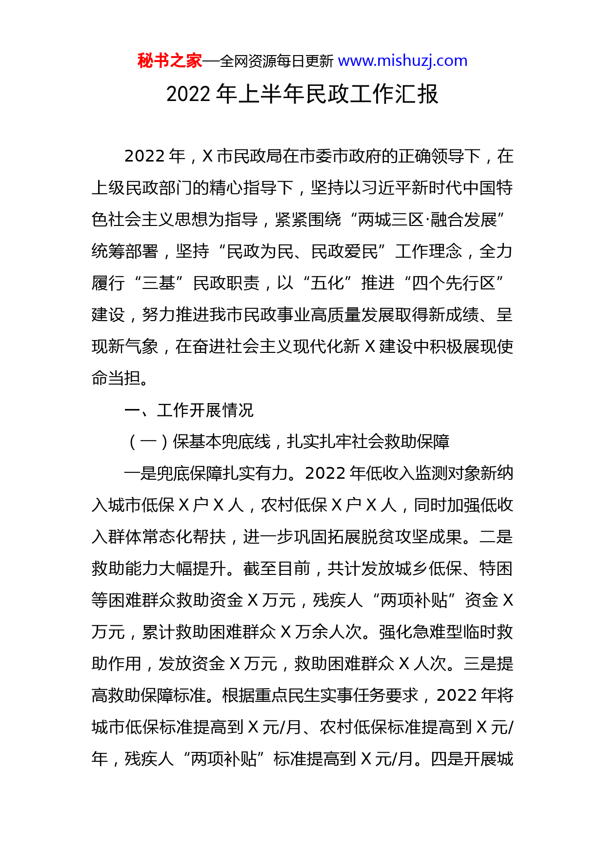秘书之家—全网资源每日更新www.mishuzj.com2022年上半年民政工作汇报2022年,X市民政局在市委市政府的正确领导下,在上级民政部门的精心指导下,坚持以习近平新时代中国特色社会主义思想为指导,紧紧围绕“两城三区·融合发展”统筹部署,坚持“民政为民、民政爱民”工作理念,全力履行“三基”民政职责,以“五化”推进“四个先行区”建设,努力推进我市民政事业高质量发展取得新成绩、呈现新气象,在奋进社会主义现代化新X建设中积极展现使命当担。一、工作开展情况(一)保基本兜底线,扎实扎牢社会救助保障一是兜底保障扎实有力。2022年低收入监测对象新纳入城市低保X户X人,农村低保X户X人,同时加强低收入群体常态化帮扶,进一步巩固拓展脱贫攻坚成果。二是救助能力大幅提升。截至目前,共计发放城乡低保、特困等困难群众救助资金X万元,残疾人“两项补贴”资金X万元,累计救助困难群众X万余人次。强化急难型临时救助作用,发放资金X万元,救助困难群众X人次。三是提高救助保障标准。根据重点民生实事任务要求,2022年将城市低保标准提高到X元/月、农村低保标准提高到X元/年,残疾人“两项补贴”标准提高到X元/月。四是开展城秘书之家—全网资源每日更新www.mishuzj.com乡低保专项排查整治暨低收入家庭摸排工作。对城乡低保制度相关配套政策的制定情况、救助程序、执行情况等开展自查,对存在的问题进行梳理、分析,集中时间集中力量对城乡低保对象进行全面动态复核,全面排查。存在致贫风险的低收入人口填报《城乡低收入人口信息采集表》,并纳入常态化监测机制,及时与相关部门共享信息,协助开展医疗、教育、住房、就业等专项救助帮扶。五是改革完善社会救助制度。切实推进社会救助制度改革,健全社会救助体系,一是出台《X市申请社会救助家庭经济状况核算评估实施细则》对象乡低保对象开展“精准救助”,目前正准备出台精准救助方案,并;二是完善临时救助制度,在乡镇全面建立临时救助备用金制度,并将小金额救助审批权下放至乡镇;三是开展社会救助服务方式创新试点,通过推行“资金+物资+服务”的社会救助方式,引入社会组织参与,不断激活社会救助家庭特殊困难群众的内生动力,使社会救助与巩固拓展脱贫攻坚、实施乡村振兴战略有机融合,有效防止返贫致贫。(二)抓重点强基础,全面推进养老服务发展一是养老设施更加完善。建成运营的养老服务机构X家,全市养老床位达到X张,每千名老人拥有床位达到X张。区域性安江中心敬老院附属工程已进入扫尾阶段;红岩敬老院基础设施(含消防)提质改造有序推进。二是农秘书之家—全网资源每日更新www.mishuzj.com村养老大力发展。建成黔城、安江、洗马等X家农村居家和社区养老服务示范点,积极开展心理慰藉、生活护理、关爱慰问等活动,有力提升了农村养老服务水平。三是综合监管落实到位。全面摸排养老服务机构安全生产、疫情防控情况并整改到位,积极开展养老领域防范网络诈骗、非法集资风险宣传,确保养老机构健康发展。四是严格按照上级文件精神和资金拨付要求,全面落实相关政策,确保老年人的福利待遇落实到位。(三)争项目促发展,统筹推进殡葬改革工作一是积极争取项目落地。通过积极向省民政厅汇报争取,安江公益性骨灰堂项目纳入湖南省民政厅“十四五”发展规划,同时将给予部分项目资金支持。二是统筹殡葬改革工作。结合“一市两城”特殊背景,进一步完善安江殡葬设施建设;目前安江殡葬设施项目一期(公益性骨灰堂)虽然已完成立项,一期、二期修建性详细规划文本已经国土空间规划委员会讨论通过,并争取尽快实现开工,同时有序推进三期(农村公益性公墓)选址工作。三是加强殡葬服务机构管理。全面落实疫情防控措施,同时加强厚养薄丧、文明治丧、生态安葬等殡葬文化宣传,为殡葬改革工作积极营造氛围。(四)联部门形合力,提升基层社会治理水平一是完成村(居)委会换届补选工作。配合完成了第秘书之家—全网资源每日更新www.mishuzj.com十二批、十三批、第十四批、十五批、十六批、十七批村(居)委换届补选候选人X部门联审工作。同时完成了村(居)委换届选举补充自治台卡相关资料。二是加强地名信息库数据建设。严格按照国家地名信息库数据质量建设行动数据审核标准以及时间、任务、进度要求,完成地名信息录入X条。三是加强城乡社区治理。完成了X市X个村(社区)在全国基层政权建设和社区治理信息系统上的数据录入,核对了城乡社区工作者人员信息与全国基层政权建设社区治理系统上的数据相符情况。四是积极推进清廉乡村建设。完成下坪村清廉乡村示范创建汇报工作,引导各村(社区)积极开展清廉乡村创建活动。(五)守初心担使命,继续完善社会福利制度一是加强困境儿童关爱保障。按时发放孤儿、事实无人抚养儿童基本生活补贴X万元;办理收养登记X例、解除收养登记X例;进一步完善乡镇督导员、村(社区)儿童主任制度,加强对农村留守儿童关爱帮扶。二是完善残疾人福利制度。加强对X市心悦家园精神障碍社区康复服务试点的监督管理,目前注册会员(精神障碍患者)X人。三是加强流浪乞讨人员救助管理。救助流浪乞讨人员X余名,寻亲成功X人。积极开展“寒冬送温暖”专项救助行动,发放棉衣、棉被、棉鞋等救助物资