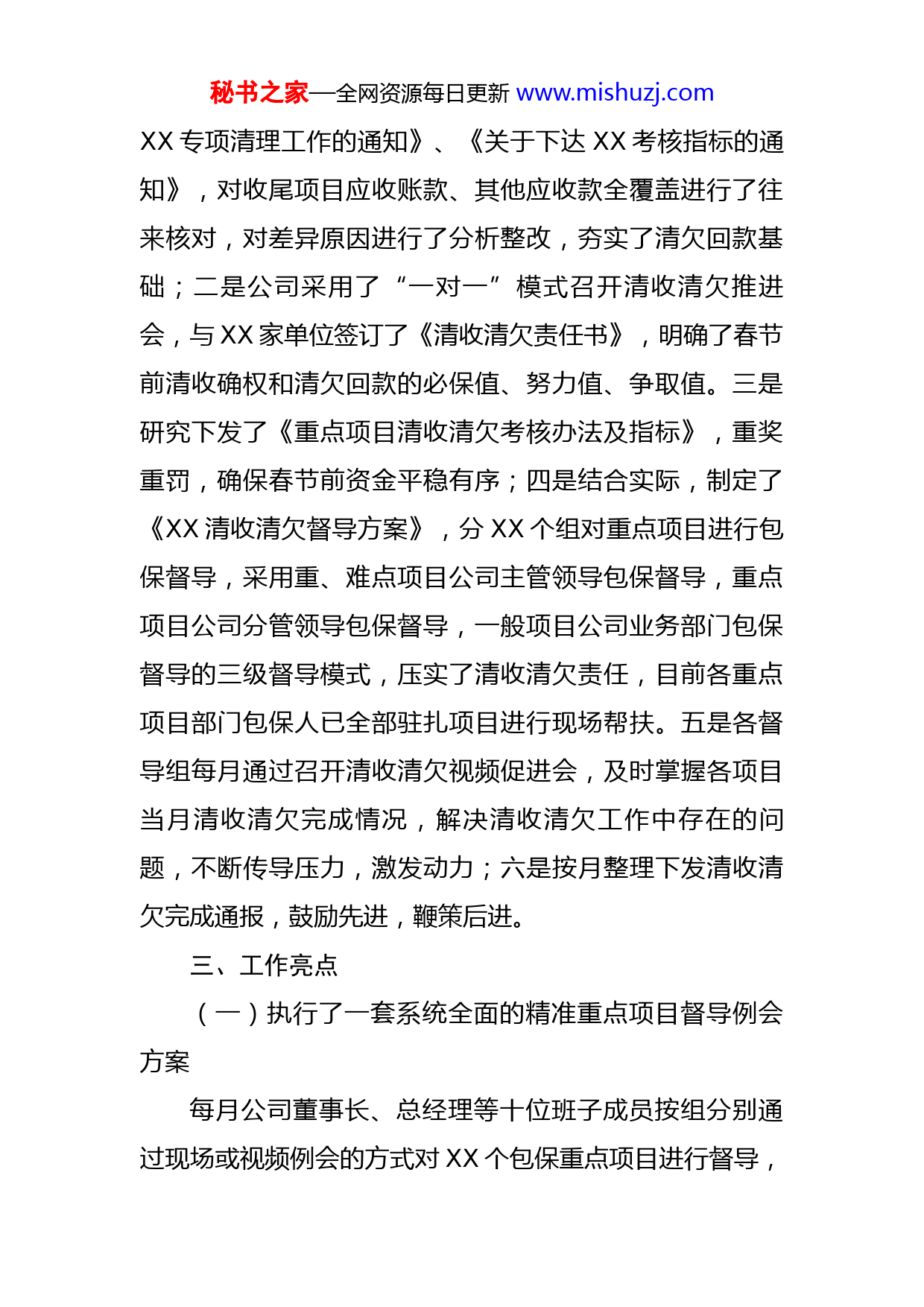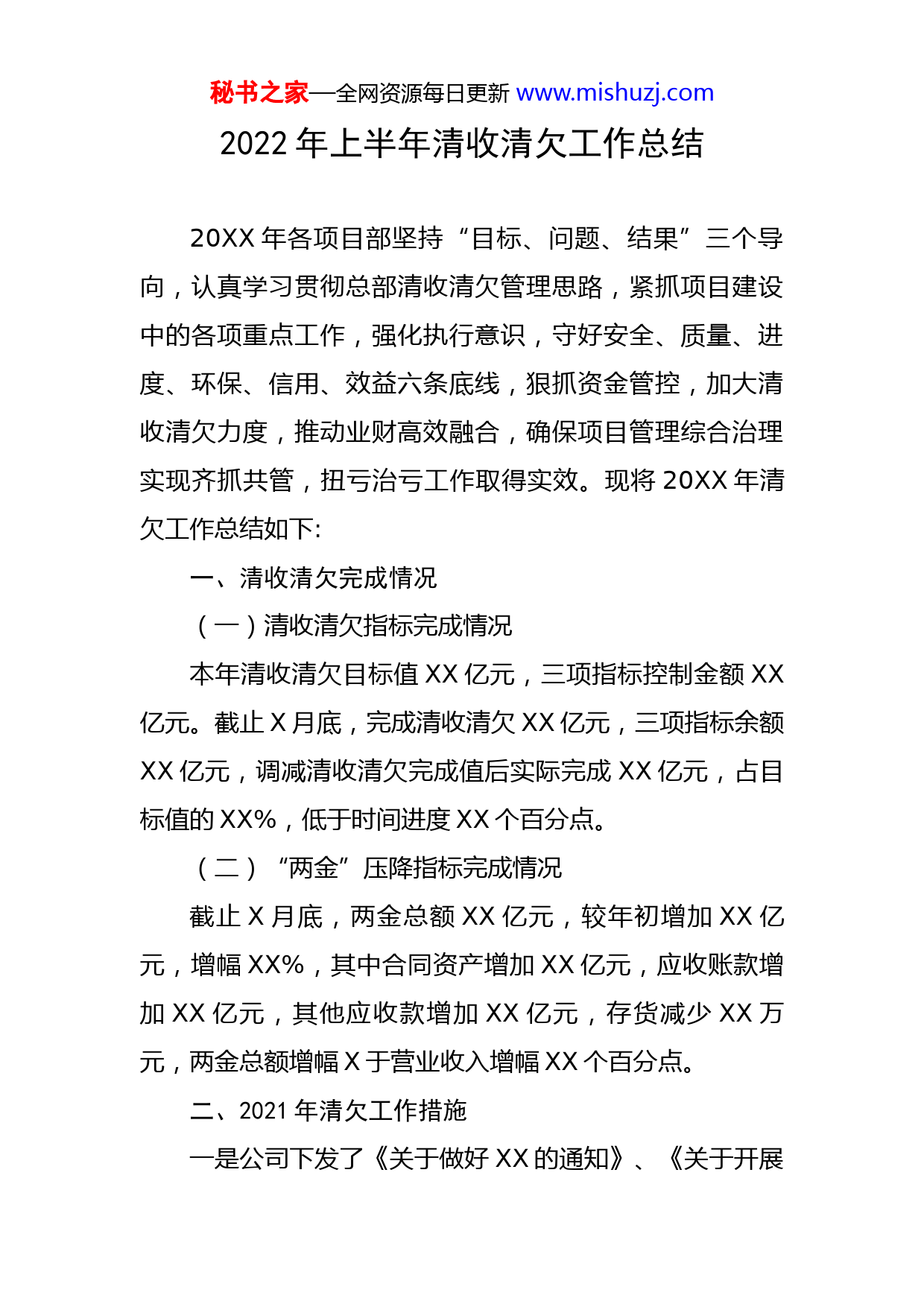 秘书之家—全网资源每日更新www.mishuzj.com2022年上半年清收清欠工作总结20XX年各项目部坚持“目标、问题、结果”三个导向,认真学习贯彻总部清收清欠管理思路,紧抓项目建设中的各项重点工作,强化执行意识,守好安全、质量、进度、环保、信用、效益六条底线,狠抓资金管控,加大清收清欠力度,推动业财高效融合,确保项目管理综合治理实现齐抓共管,扭亏治亏工作取得实效。现将20XX年清欠工作总结如下:一、清收清欠完成情况(一)清收清欠指标完成情况本年清收清欠目标值XX亿元,三项指标控制金额XX亿元。截止X月底,完成清收清欠XX亿元,三项指标余额XX亿元,调减清收清欠完成值后实际完成XX亿元,占目标值的XX%,低于时间进度XX个百分点。(二)“两金”压降指标完成情况截止X月底,两金总额XX亿元,较年初增加XX亿元,增幅XX%,其中合同资产增加XX亿元,应收账款增加XX亿元,其他应收款增加XX亿元,存货减少XX万元,两金总额增幅X于营业收入增幅XX个百分点。二、2021年清欠工作措施一是公司下发了《关于做好XX的通知》、《关于开展秘书之家—全网资源每日更新www.mishuzj.comXX专项清理工作的通知》、《关于下达XX考核指标的通知》,对收尾项目应收账款、其他应收款全覆盖进行了往来核对,对差异原因进行了分析整改,夯实了清欠回款基础;二是公司采用了“一对一”模式召开清收清欠推进会,与XX家单位签订了《清收清欠责任书》,明确了春节前清收确权和清欠回款的必保值、努力值、争取值。三是研究下发了《重点项目清收清欠考核办法及指标》,重奖重罚,确保春节前资金平稳有序;四是结合实际,制定了《XX清收清欠督导方案》,分XX个组对重点项目进行包保督导,采用重、难点项目公司主管领导包保督导,重点项目公司分管领导包保督导,一般项目公司业务部门包保督导的三级督导模式,压实了清收清欠责任,目前各重点项目部门包保人已全部驻扎项目进行现场帮扶。五是各督导组每月通过召开清收清欠视频促进会,及时掌握各项目当月清收清欠完成情况,解决清收清欠工作中存在的问题,不断传导压力,激发动力;六是按月整理下发清收清欠完成通报,鼓励先进,鞭策后进。三、工作亮点(一)执行了一套系统全面的精准重点项目督导例会方案每月公司董事长、总经理等十位班子成员按组分别通过现场或视频例会的方式对XX个包保重点项目进行督导,秘书之家—全网资源每日更新www.mishuzj.com灌输项目要突破传统束缚,创新思想,坚定信心,提升对清收清欠工作重要性的认识,真正将清收清欠工作付诸于实践,落实到每一个细节。(二)制定了一套系统全面的其他应收款清理方案总部根据项目其他应收款清理情况针对已到期各类保证金、押金制定催要计划,明确具体承办人员,对于长期挂账的其他应收款查明了原因,分清责任,制定了处理方案,对形成的年代久远、回收无望的呆坏账并有确凿证据表明无法收回的其他应收款项,整理说明原因。(三)聚焦指标、精准施策,用好以会代训抓细抓实清欠工作三四季度总部密集召开X次清收清欠推进会,集团公司副总经理、公司党委书记、董事长出席并作出重要指示,会上逐一分析重点项目指标完成值较差原因,下一步工作重点。总部包保人员全部驻扎项目进行现场帮扶,并督促要求各项目经理必须亲力亲为,对工作中的每一环节亲自督办、亲自过问,及时掌握工作进度和工作的具体实施情况,在清收清欠相关工作过程中要充分发挥领导的表率作用,以此推进工作的开展。(四)加强考核、压实责任、确保其他应收款项应收尽收为调动各单位清理其他应收款的积极性,增加企业货币秘书之家—全网资源每日更新www.mishuzj.com积累,压减其他应收款金额,公司下发《关于下达XX考核指标的通知》,按协议约定到期应收回的款项、无明确约定退还时间但现场已履约完毕的款项、缴纳时间超过5年的各类押金下达清欠指标,明确每笔挂账款责任人,采用回款即奖,定期考核,净额兑现的奖罚原则,确保及时回收各类款项。四、清欠工作存在的问题20XX年全公司上下在清欠方面作了一定工作,也取得了一定的成绩。但总体上看,效果虽然明显,但公司债权数额依然居高不下,有相当一部分应收账款没有收回,特别是一些重点、难点项目、“老大难”项目还没有取得实质性的进展。主要原因:一是由于清欠负责人重视不够,认识不足,没有把这项工作摆到重要的议事日程。二是在客观上,由于拖欠时间的延续,一些业主机构、人员和经营状况在不断发生变化,特别是一些政府拖欠的项目受到地方保护主义的干扰,无形中增加了清欠的难度。三是在公司内部,由于管理基础工作薄弱,合同签订不规范或存在漏洞,设计变更增加工程量的签证未能及时办理,竣工结算资料不全,工程质量、工期进度等问题没有得到及时处理,导致债权数额不能确认,给业主继续拖欠造成借口,使清欠催收变得更加艰难。这充分说明,在这方面还有大量工作亟待去做,清欠工作秘书之家—全网资源每日更新www.mishuzj.com任务依然十分繁重。这就要求我们必须把这项工作摆到重要的工作日程,坚定信心,迎难而上,以加强经营管理、有效遏制新的拖欠为主线,以清收国家重点工程建设项目拖欠的工程款为重点,以突破一批重点、难点项目为目标,采取有力措施,加大工作力度,打一场清欠催收攻坚战,努力