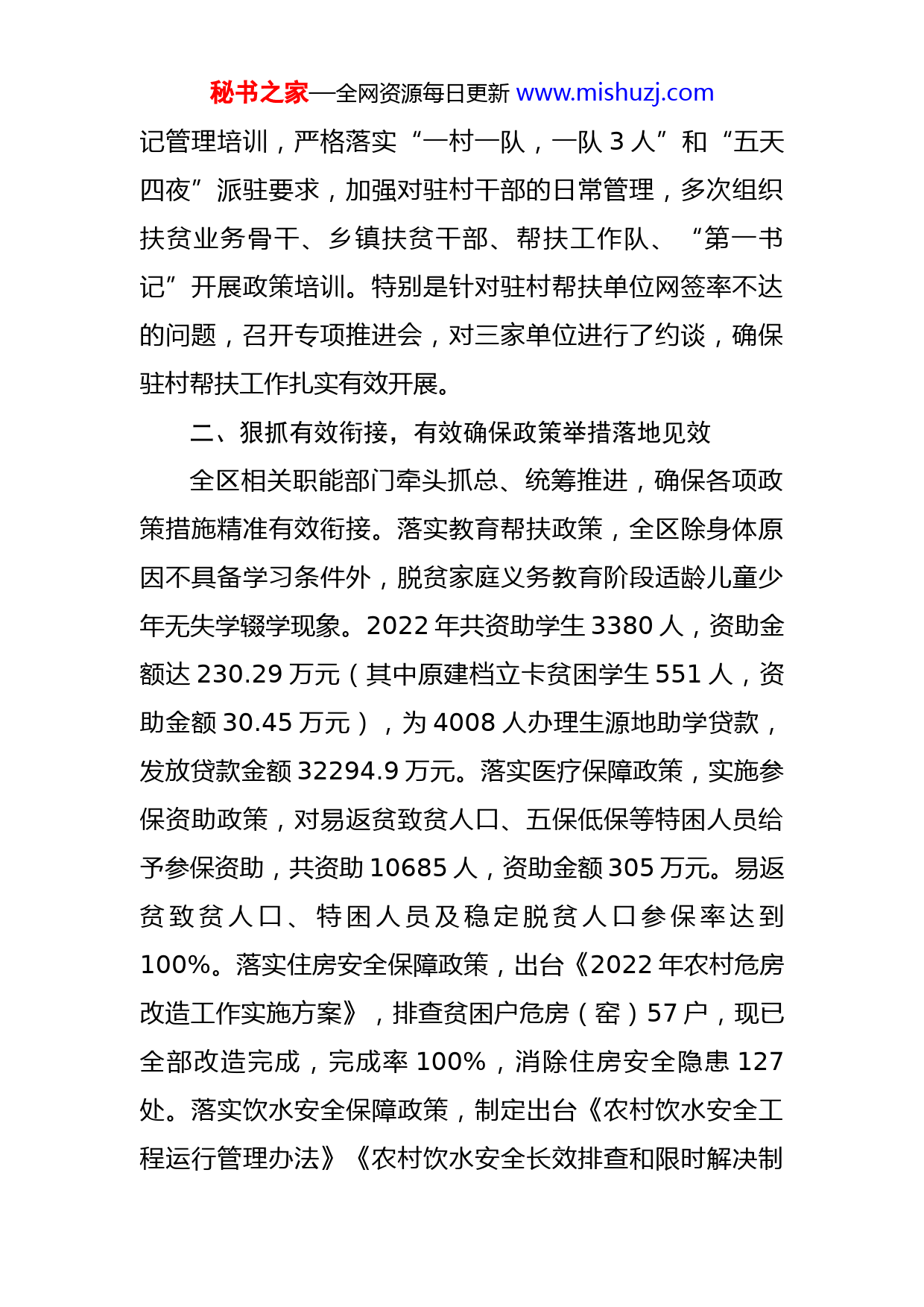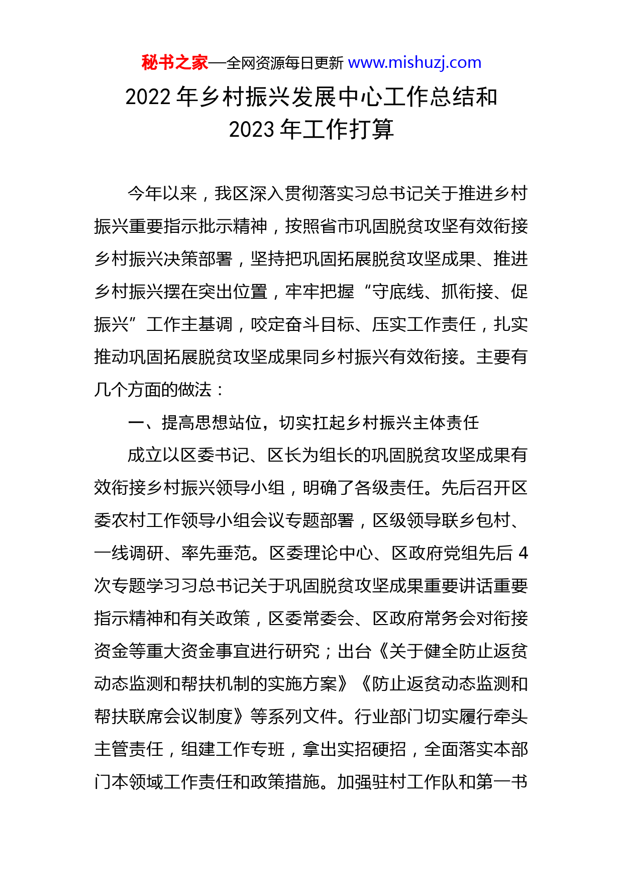 秘书之家—全网资源每日更新www.mishuzj.com2022年乡村振兴发展中心工作总结和2023年工作打算今年以来,我区深入贯彻落实习总书记关于推进乡村振兴重要指示批示精神,按照省市巩固脱贫攻坚有效衔接乡村振兴决策部署,坚持把巩固拓展脱贫攻坚成果、推进乡村振兴摆在突出位置,牢牢把握“守底线、抓衔接、促振兴”工作主基调,咬定奋斗目标、压实工作责任,扎实推动巩固拓展脱贫攻坚成果同乡村振兴有效衔接。主要有几个方面的做法:一、提高思想站位,切实扛起乡村振兴主体责任成立以区委书记、区长为组长的巩固脱贫攻坚成果有效衔接乡村振兴领导小组,明确了各级责任。先后召开区委农村工作领导小组会议专题部署,区级领导联乡包村、一线调研、率先垂范。区委理论中心、区政府党组先后4次专题学习习总书记关于巩固脱贫攻坚成果重要讲话重要指示精神和有关政策,区委常委会、区政府常务会对衔接资金等重大资金事宜进行研究;出台《关于健全防止返贫动态监测和帮扶机制的实施方案》《防止返贫动态监测和帮扶联席会议制度》等系列文件。行业部门切实履行牵头主管责任,组建工作专班,拿出实招硬招,全面落实本部门本领域工作责任和政策措施。加强驻村工作队和第一书秘书之家—全网资源每日更新www.mishuzj.com记管理培训,严格落实“一村一队,一队3人”和“五天四夜”派驻要求,加强对驻村干部的日常管理,多次组织扶贫业务骨干、乡镇扶贫干部、帮扶工作队、“第一书记”开展政策培训。特别是针对驻村帮扶单位网签率不达的问题,召开专项推进会,对三家单位进行了约谈,确保驻村帮扶工作扎实有效开展。二、狠抓有效衔接,有效确保政策举措落地见效全区相关职能部门牵头抓总、统筹推进,确保各项政策措施精准有效衔接。落实教育帮扶政策,全区除身体原因不具备学习条件外,脱贫家庭义务教育阶段适龄儿童少年无失学辍学现象。2022年共资助学生3380人,资助金额达230.29万元(其中原建档立卡贫困学生551人,资助金额30.45万元),为4008人办理生源地助学贷款,发放贷款金额32294.9万元。落实医疗保障政策,实施参保资助政策,对易返贫致贫人口、五保低保等特困人员给予参保资助,共资助10685人,资助金额305万元。易返贫致贫人口、特困人员及稳定脱贫人口参保率达到100%。落实住房安全保障政策,出台《2022年农村危房改造工作实施方案》,排查贫困户危房(窑)57户,现已全部改造完成,完成率100%,消除住房安全隐患127处。落实饮水安全保障政策,制定出台《农村饮水安全工程运行管理办法》《农村饮水安全长效排查和限时解决制秘书之家—全网资源每日更新www.mishuzj.com度》,对全区209个行政村农村饮水工程及分散工程全部进行了水质检测,检测水样265份,水质全部达到合格和基本合格标准。投入700万元,对37处农村饮水工程进行维修养护,受益人口5万余人。落实兜底保障政策,完善《最低生活保障对象和特困供养综合认定办法》,严格落实低保动态管理制度,共保障城乡低保3747户6211人,发放低保金1603.36万元,特困供养金625.7288万元,实施临时救助31人,发放临时救助资金15.08万元。落实产业帮扶政策落实情况,2022年全区脱贫户参与种植尖椒达到3000余亩,每户平均收入2000元,下发《关于做好2022年度消费扶贫的通知》,全区累计消费帮扶金额80余万元,累计投放小额信贷1650万元,带动脱贫户600户,财政贴息823.02万元,户均增收3000元。落实就业帮扶政策,今年省里下达我区任务是2252人,其中省外就业260人。目前已完成2307人,省外务工就业275人,均已经完成年度目标任务。为245人发放交通补贴9.87万元,为60人发放稳岗补助3.28万元,为92人发放外出务工奖补9.2万元,确保行业部门政策全部落实到位。三、细化工作举措,切实推动重点任务取得实效(一)健全防治返贫动态监测和帮扶机制。出台了《关于健全防止返贫动态监测和帮扶机制的实施方案》秘书之家—全网资源每日更新www.mishuzj.com《防止返贫动态监测和帮扶联席会议制度》,建立健全返贫致贫人口快速发现和响应机制,分层分类及时纳入帮扶政策范围,真正做到“遇困即扶”,从源头上防止致贫返贫。建立完善脱贫人口数据监测体系,在区、乡、村三级设立信息采集员,现已全部在岗。(二)强化易地搬迁后续帮扶。落实易地扶贫搬迁“1+7”后续扶持政策,重点加大对371户663人搬迁脱贫户的后续帮扶。目前有劳动力的117户搬迁户全部有就业人口,181名劳动力通过务工全部实就业,易地扶贫搬迁贫困户享受三项产业措施扶持比例达到65%以上。(三)严格资金项目使用监管。先后出台了《2022年财政衔接推进乡村振兴补助资金分配方案》、关于印发《健全完善帮扶项目联农带农机制的实施细则》的通知、《关于开展扶贫项目资产后续管理自查“回头看”的通知》,严格落实乡村振兴衔接补助资金只增不减要求,将衔接资金列入本级预算资金,在去年1650万元的基础上,今年达到1700万元,已按照年度项目实施计划全部匹配到项目。(四)强化农村低收入人口常态化帮扶。为脱贫人口和监测对象全部缴纳防返贫保险,对收入不达6500元的脱贫人口和监测对象,由防返贫险一次性补足,全部覆盖到脱贫户和监测对象。今年新识别监测户15户54人,全部秘书之家—全网资源每日更新www.mishuzj.com采取了“三项”以上帮扶措施,坚决
