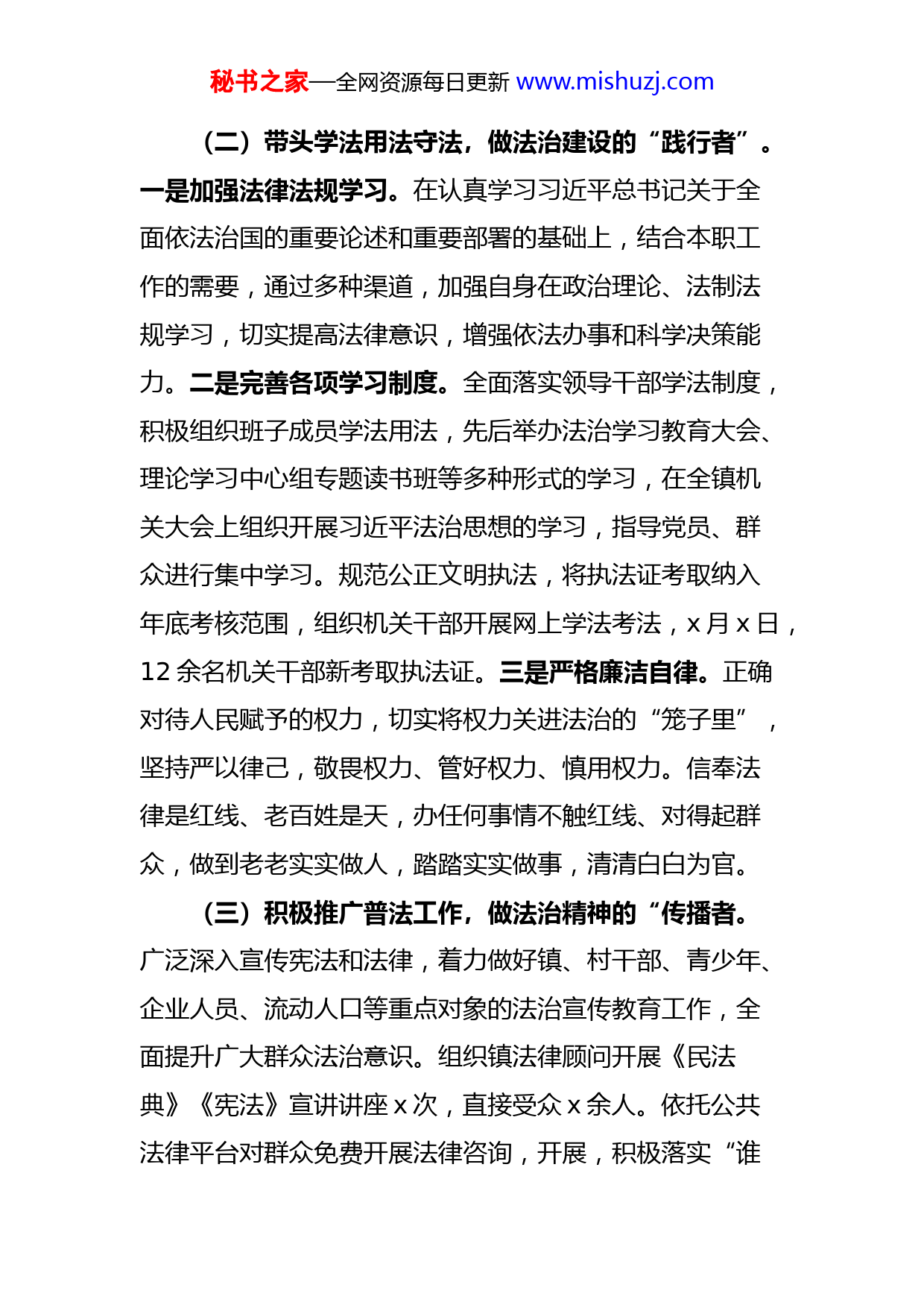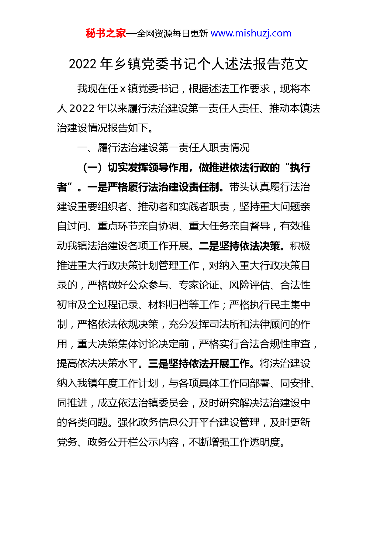 秘书之家—全网资源每日更新www.mishuzj.com2022年乡镇党委书记个人述法报告范文我现在任x镇党委书记,根据述法工作要求,现将本人2022年以来履行法治建设第一责任人责任、推动本镇法治建设情况报告如下。一、履行法治建设第一责任人职责情况(一)切实发挥领导作用,做推进依法行政的“执行者”。一是严格履行法治建设责任制。带头认真履行法治建设重要组织者、推动者和实践者职责,坚持重大问题亲自过问、重点环节亲自协调、重大任务亲自督导,有效推动我镇法治建设各项工作开展。二是坚持依法决策。积极推进重大行政决策计划管理工作,对纳入重大行政决策目录的,严格做好公众参与、专家论证、风险评估、合法性初审及全过程记录、材料归档等工作;严格执行民主集中制,严格依法依规决策,充分发挥司法所和法律顾问的作用,重大决策集体讨论决定前,严格实行合法合规性审查,提高依法决策水平。三是坚持依法开展工作。将法治建设纳入我镇年度工作计划,与各项具体工作同部署、同安排、同推进,成立依法治镇委员会,及时研究解决法治建设中的各类问题。强化政务信息公开平台建设管理,及时更新党务、政务公开栏公示内容,不断增强工作透明度。秘书之家—全网资源每日更新www.mishuzj.com(二)带头学法用法守法,做法治建设的“践行者”。一是加强法律法规学习。在认真学习习近平总书记关于全面依法治国的重要论述和重要部署的基础上,结合本职工作的需要,通过多种渠道,加强自身在政治理论、法制法规学习,切实提高法律意识,增强依法办事和科学决策能力。二是完善各项学习制度。全面落实领导干部学法制度,积极组织班子成员学法用法,先后举办法治学习教育大会、理论学习中心组专题读书班等多种形式的学习,在全镇机关大会上组织开展习近平法治思想的学习,指导党员、群众进行集中学习。规范公正文明执法,将执法证考取纳入年底考核范围,组织机关干部开展网上学法考法,x月x日,12余名机关干部新考取执法证。三是严格廉洁自律。正确对待人民赋予的权力,切实将权力关进法治的“笼子里”,坚持严以律己,敬畏权力、管好权力、慎用权力。信奉法律是红线、老百姓是天,办任何事情不触红线、对得起群众,做到老老实实做人,踏踏实实做事,清清白白为官。(三)积极推广普法工作,做法治精神的“传播者。广泛深入宣传宪法和法律,着力做好镇、村干部、青少年、企业人员、流动人口等重点对象的法治宣传教育工作,全面提升广大群众法治意识。组织镇法律顾问开展《民法典》《宪法》宣讲讲座x次,直接受众x余人。依托公共法律平台对群众免费开展法律咨询,开展,积极落实“谁秘书之家—全网资源每日更新www.mishuzj.com执法谁普法”责任制,相关站所依据自身职能,利用发放宣传材料等方式积极宣传相关法律法规,镇法律顾问利用服务群推送普法信息x余条,极大地提高了群众学法、用法的素养,为群众送上“法治精神食粮”。二、存在的问题(一)专业人才队伍有待进一步加强。具备专业法律知识的人才较少,运用法治思维和法治方式开展工作的能力还需进一步加强。少数工作人员对于国家新出台的法律法规仍不够熟悉,法律意识和依法行政能力有待加强。(二)法治宣传教育工作方面存在不足。法制宣传力度和投入不足,基层普法阵地建设不及时、不全面,普法人员队伍工作接续性不够强,宣传效果有待进一步提升。部分普法内容枯燥乏味,没有结合具体案例、结合群众的实际需求进行法律宣传,导致群众厌倦、产生抵触情绪;农村人口分散、流动性大、群众文化素质低等因素,导致普法教育组织难度大、实施效果不明显。三、下步打算(一)坚持学法用法,树牢法治意识。积极组织参加机关干部普法培训,学习《宪法》《中国共产党章程》《中国共产党农村基层组织工作条例》等专业知识,加大法律法规学习力度,邀请法院、检察院等市级部门同志解读相关法律法规制度,不断提升全体机关干部的法治素养、秘书之家—全网资源每日更新www.mishuzj.com法治意识。坚持重视法治素养和法治能力的用人导向,把是否具有运用法治思维和法治方式破解难题能力作为考察使用干部的重要依据,把法律知识考查和依法行政能力测试结果作为提拔任用干部的重要参考。(二)强化法治思维,严格依法办事。深刻认识依法治国的重大意义,敬畏宪法法律,带头维护宪法法律权威,保证宪法法律实施。树立正确的政绩观,把遵纪守法、依法办事作为履职尽责、安身立命最基本的要求,坚持在法治的框架内处理和解决各种矛盾和问题,做到“法无授权不可为、法定职责必须为”,让权力和责任在法治的阳光下运行。进一步明确法治建设职责,建立健全镇党委定期听取法治建设进展汇报、研究法治建设重大事项等工作制度,压实压紧法治建设职责。(三)创新宣传手段,提升宣传实效。拓宽宣传方式,通过以案说法,增强基层干部群众法治观念和依法办事能力,切实满足辖区群众司法需求。创新宣传形式,充分利用“3·15”国际消费者权益日、“6·26”国际禁毒日、“12·4”宪法宣传日、全国安全生产月等重要节日,采取数字广播、横幅、摆摊等多种形式开展有关法律法规宣传教育活动,使广大群众受到潜移默化的法治教育。