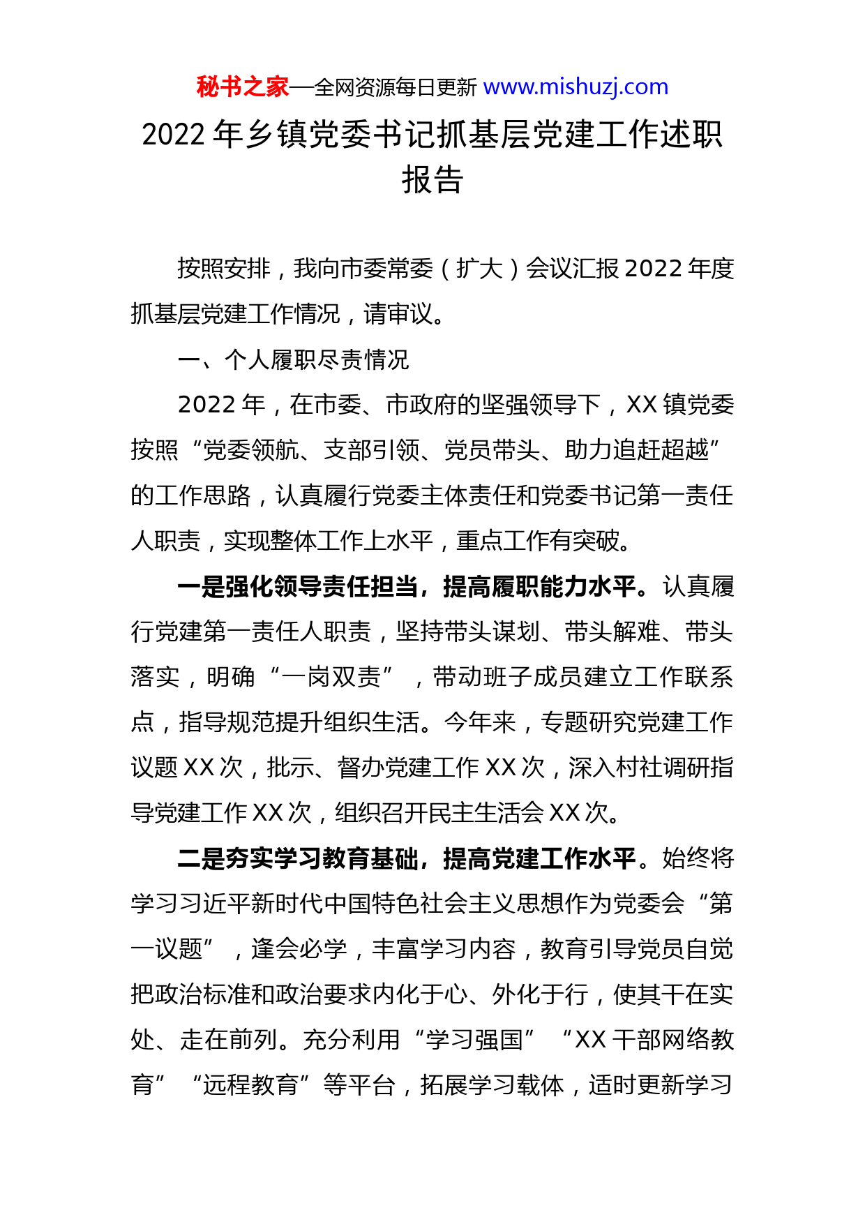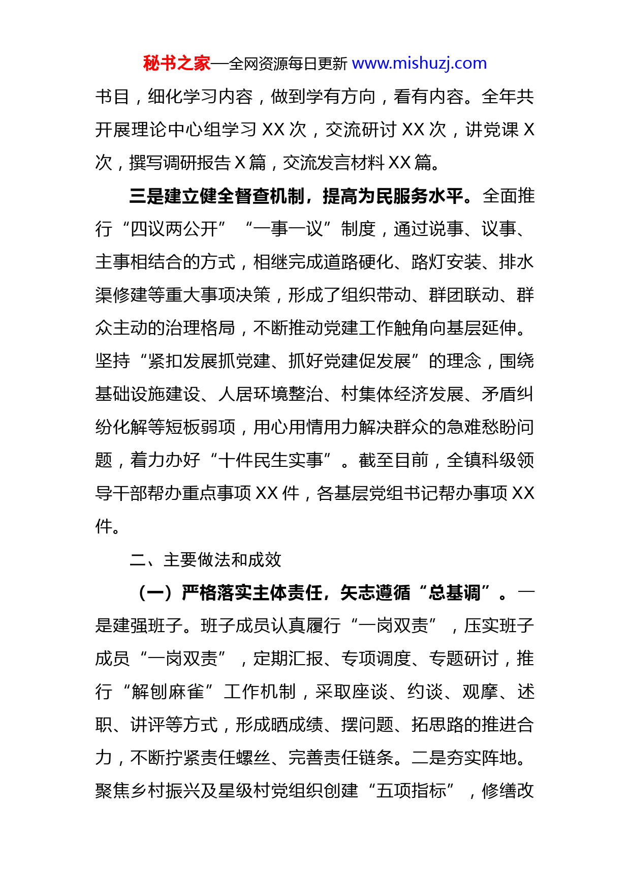 秘书之家—全网资源每日更新www.mishuzj.com2022年乡镇党委书记抓基层党建工作述职报告按照安排,我向市委常委(扩大)会议汇报2022年度抓基层党建工作情况,请审议。一、个人履职尽责情况2022年,在市委、市政府的坚强领导下,XX镇党委按照“党委领航、支部引领、党员带头、助力追赶超越”的工作思路,认真履行党委主体责任和党委书记第一责任人职责,实现整体工作上水平,重点工作有突破。一是强化领导责任担当,提高履职能力水平。认真履行党建第一责任人职责,坚持带头谋划、带头解难、带头落实,明确“一岗双责”,带动班子成员建立工作联系点,指导规范提升组织生活。今年来,专题研究党建工作议题XX次,批示、督办党建工作XX次,深入村社调研指导党建工作XX次,组织召开民主生活会XX次。二是夯实学习教育基础,提高党建工作水平。始终将学习习近平新时代中国特色社会主义思想作为党委会“第一议题”,逢会必学,丰富学习内容,教育引导党员自觉把政治标准和政治要求内化于心、外化于行,使其干在实处、走在前列。充分利用“学习强国”“XX干部网络教育”“远程教育”等平台,拓展学习载体,适时更新学习秘书之家—全网资源每日更新www.mishuzj.com书目,细化学习内容,做到学有方向,看有内容。全年共开展理论中心组学习XX次,交流研讨XX次,讲党课X次,撰写调研报告X篇,交流发言材料XX篇。三是建立健全督查机制,提高为民服务水平。全面推行“四议两公开”“一事一议”制度,通过说事、议事、主事相结合的方式,相继完成道路硬化、路灯安装、排水渠修建等重大事项决策,形成了组织带动、群团联动、群众主动的治理格局,不断推动党建工作触角向基层延伸。坚持“紧扣发展抓党建、抓好党建促发展”的理念,围绕基础设施建设、人居环境整治、村集体经济发展、矛盾纠纷化解等短板弱项,用心用情用力解决群众的急难愁盼问题,着力办好“十件民生实事”。截至目前,全镇科级领导干部帮办重点事项XX件,各基层党组书记帮办事项XX件。二、主要做法和成效(一)严格落实主体责任,矢志遵循“总基调”。一是建强班子。班子成员认真履行“一岗双责”,压实班子成员“一岗双责”,定期汇报、专项调度、专题研讨,推行“解刨麻雀”工作机制,采取座谈、约谈、观摩、述职、讲评等方式,形成晒成绩、摆问题、拓思路的推进合力,不断拧紧责任螺丝、完善责任链条。二是夯实阵地。聚焦乡村振兴及星级村党组织创建“五项指标”,修缮改秘书之家—全网资源每日更新www.mishuzj.com造提升X个村级党组织阵地,积极申报创建“星”级类型,成功创建XX村四星级村、XX村二星级村。三是管好队伍。以主题活动为抓手,强化党性教育,引导全镇党员自觉讲党性、重品行、做表率,攻坚克难、奋勇争先,在产业发展、乡村振兴等重点工作上发扬党员先锋模范作用。严格发展党员,全年培养入党积极分子XX名,新发展党员XX名。(二)加强驻村帮扶成效,构建发展“双引擎”。一是党建引领谋发展。按照“种植规模化、管理标准化、经营品牌化、销售多样化”的发展思路,大力实施“一村一品”发展,让本土圣女果、葡萄、甜柿子等品牌日渐响亮。今年新建大秋甜柿XX亩,阳光玫瑰XX亩,吊篮西瓜、高石脆瓜XX多棚。二是帮扶队伍尽职责。健全完善常态化驻村工作机制,聚焦制度落实、作用发挥、考核评价、关心关爱重点,用活管好驻村第一书记和驻村工作队伍,赋能乡村振兴。三是环境整治显成效。搭建横向到边、纵向到底的人居环境整治责任网,将任务划分到村组、分解到网格,具体到事、责任到人,持续推进农村人居环境整治大提升。2022年,我镇被评为XX卫生镇荣誉称号。四是产业支撑促振兴。全面推行“党建+”模式,引导党组织创办领办专业合作社,加快村级集体经济发展壮大,特别是XX村村集体经济XX亩阳光玫瑰首次产生收秘书之家—全网资源每日更新www.mishuzj.com益,共为XX户脱贫户发放分红款XX万元,有效形成了“党建强、产业旺、群众富”的乡村产业发展良好局面。2022年,我镇被评XX乡村振兴示范镇。(三)深化全面从严治党,聚力营造“好生态”。一是扎实开展作风建设专项行动。完善领导干部“红、黄、蓝”三色问题查摆台账,对查找作风建设问题5类XX条,进行深刻剖析、分析原因,制定整改措施,明确整改时限,确保问题应改尽改、抓出实效。二是扎实开展反腐倡廉教育活动。针对党员干部思想和作风方面存在的突出问题,开展理想信念教育、权力观教育、党纪国法教育、违规违纪警示教育。截至目前,办理线索案件XX件,其中党内警告XX人,诫勉谈话XX人,提醒约谈XX人。三是扎实开展党建专项督查。采取抓书记、强支撑、严考核三措并举,充分利用月督导通报、季考评表彰等方式,晒问题、找病根,开展基层党建专项督查XX,督促村级党组织书记扛起主责、抓好主业、当好主角。三、存在问题一是党建工作创新载体不够,主题党日活动开展形式单一,组织生活有流于形式的倾向,对党员的干部教育缺乏针对性,吸引力不够,凝聚力不够。二是村级后备干部培养力度有待加强,实际锻炼培养不足。三是督查问责力度不大。对个别工作出现偏差或失误的基层党支部书记,秘书之家—全网资源每日更新www.mishuzj.com仅限于批评教育,包容多、问责少,致使个别党支部书记党建第
