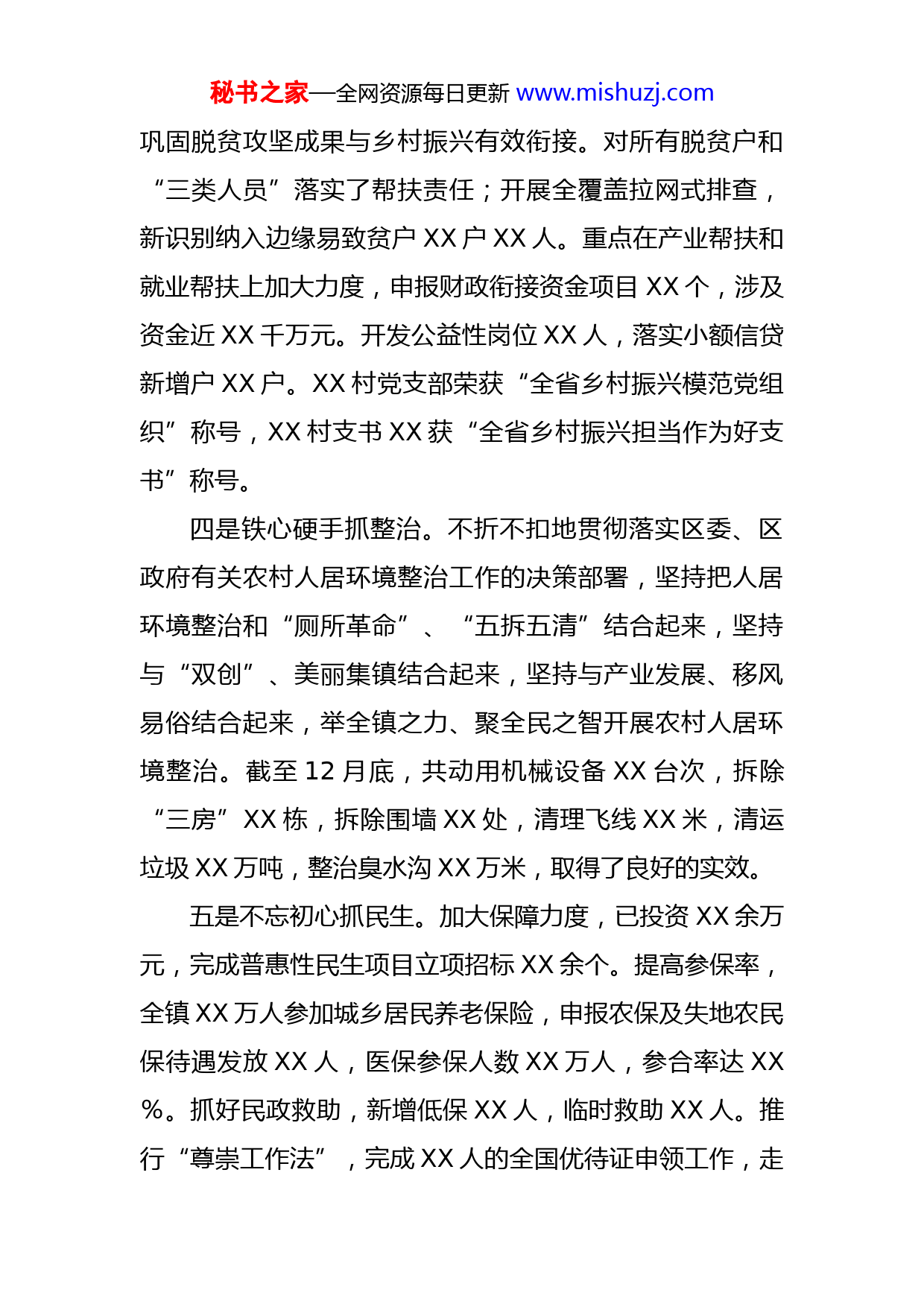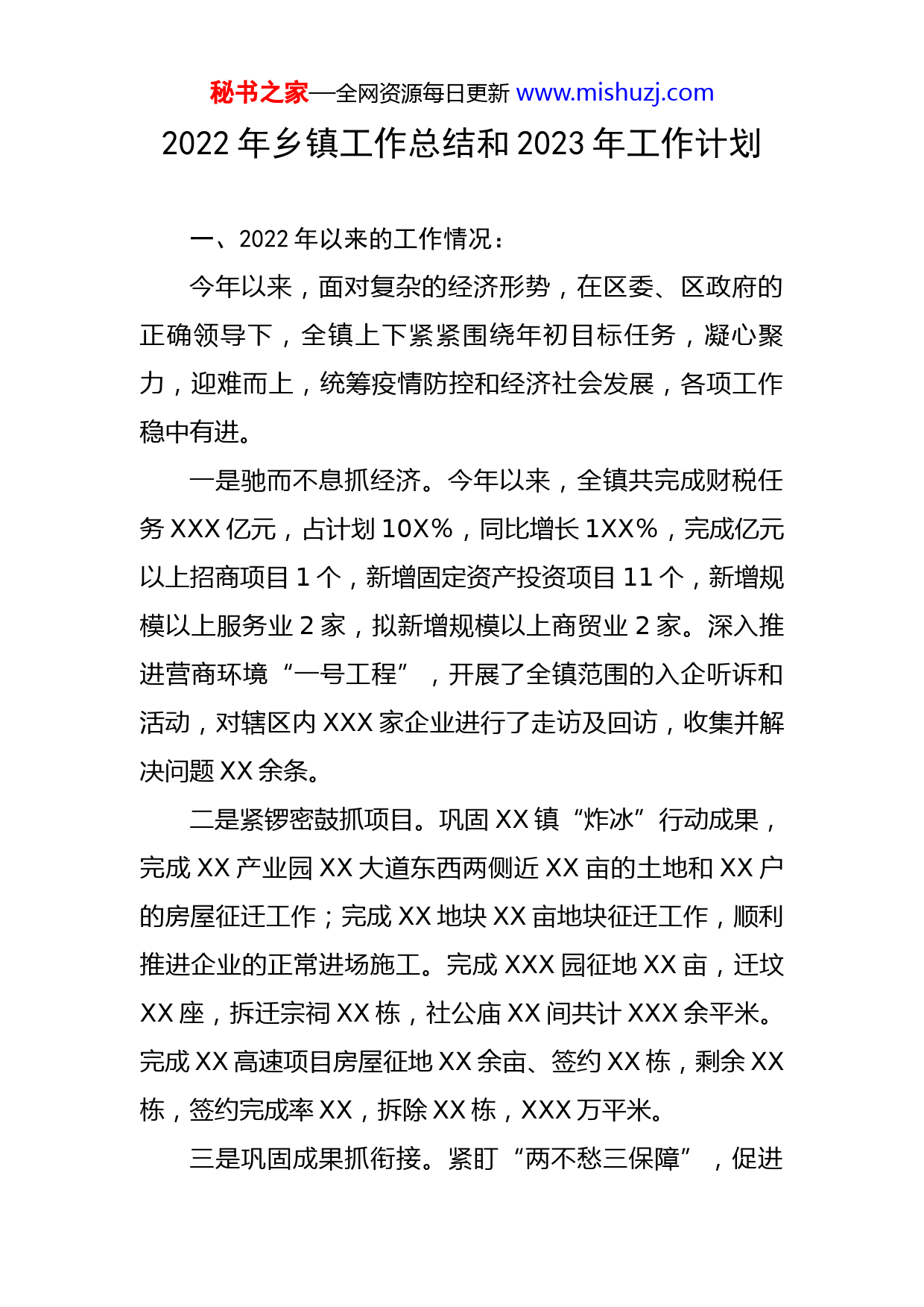 秘书之家—全网资源每日更新www.mishuzj.com2022年乡镇工作总结和2023年工作计划一、2022年以来的工作情况:今年以来,面对复杂的经济形势,在区委、区政府的正确领导下,全镇上下紧紧围绕年初目标任务,凝心聚力,迎难而上,统筹疫情防控和经济社会发展,各项工作稳中有进。一是驰而不息抓经济。今年以来,全镇共完成财税任务XXX亿元,占计划10X%,同比增长1XX%,完成亿元以上招商项目1个,新增固定资产投资项目11个,新增规模以上服务业2家,拟新增规模以上商贸业2家。深入推进营商环境“一号工程”,开展了全镇范围的入企听诉和活动,对辖区内XXX家企业进行了走访及回访,收集并解决问题XX余条。二是紧锣密鼓抓项目。巩固XX镇“炸冰”行动成果,完成XX产业园XX大道东西两侧近XX亩的土地和XX户的房屋征迁工作;完成XX地块XX亩地块征迁工作,顺利推进企业的正常进场施工。完成XXX园征地XX亩,迁坟XX座,拆迁宗祠XX栋,社公庙XX间共计XXX余平米。完成XX高速项目房屋征地XX余亩、签约XX栋,剩余XX栋,签约完成率XX,拆除XX栋,XXX万平米。三是巩固成果抓衔接。紧盯“两不愁三保障”,促进秘书之家—全网资源每日更新www.mishuzj.com巩固脱贫攻坚成果与乡村振兴有效衔接。对所有脱贫户和“三类人员”落实了帮扶责任;开展全覆盖拉网式排查,新识别纳入边缘易致贫户XX户XX人。重点在产业帮扶和就业帮扶上加大力度,申报财政衔接资金项目XX个,涉及资金近XX千万元。开发公益性岗位XX人,落实小额信贷新增户XX户。XX村党支部荣获“全省乡村振兴模范党组织”称号,XX村支书XX获“全省乡村振兴担当作为好支书”称号。四是铁心硬手抓整治。不折不扣地贯彻落实区委、区政府有关农村人居环境整治工作的决策部署,坚持把人居环境整治和“厕所革命”、“五拆五清”结合起来,坚持与“双创”、美丽集镇结合起来,坚持与产业发展、移风易俗结合起来,举全镇之力、聚全民之智开展农村人居环境整治。截至12月底,共动用机械设备XX台次,拆除“三房”XX栋,拆除围墙XX处,清理飞线XX米,清运垃圾XX万吨,整治臭水沟XX万米,取得了良好的实效。五是不忘初心抓民生。加大保障力度,已投资XX余万元,完成普惠性民生项目立项招标XX余个。提高参保率,全镇XX万人参加城乡居民养老保险,申报农保及失地农民保待遇发放XX人,医保参保人数XX万人,参合率达XX%。抓好民政救助,新增低保XX人,临时救助XX人。推行“尊崇工作法”,完成XX人的全国优待证申领工作,走秘书之家—全网资源每日更新www.mishuzj.com访慰问困难退役军人XX人次,营造尊崇军人的良好氛围。成功推送11名有志大学生参军入伍。深入推进创文工作,提升新时代文明实践一所十三站,开展线下实践活动共计XXX余次,线上微夜校授课宣讲活动XXX余次。六是是一心为民抓防控。坚持疫情防控和防汛减灾两手抓、两不误、两促进。面对XX月底中心城区突发疫情,XX个“平战一体”专班果断出击,XX个村居划分为XXX个网格点联防联控,开展了XX轮XX万人次的核酸检测,保障了人民群众生命安全和身体健康。面对汛期连续强降雨,严格落实24小时值班制度,排查安全隐患,巡查了XX个地质灾害点,转移群众XX人,组建XX余人的应急队伍,储备XX余万只编织袋等物资应对汛情。闻“汛”而动,第一时间驰援XX镇抗洪救灾,为其XX个村居送去XX余箱矿泉水、面包、八宝粥、牛奶等物资,解群众“燃眉之急”;采取村对村、点对点对口援助模式,由XXX名人员组成的XX援助队伍赶赴XX全力开展清理整治工作,帮助群众尽快恢复正常的生产生活秩。七是紧盯一线抓稳定。坚持矛盾纠纷在一线化解,镇党政班子在工作日轮流接访,落实镇信访工作包案责任。排查各类矛盾纠纷XX件,调处XX件,调处率达100%,化解了XX件信访积案,并签订息访息诉协议书。坚持安全生产在一线落实,镇党政班子定期或不定期对各自挂点村秘书之家—全网资源每日更新www.mishuzj.com居的安全生产点进行督查,切实加强生产安全事故防范和处置。坚持“两违”管控在一线严守,今年以来控建拆违共查处和拆除违章XXX处,面积约XXX平米,查处违法沙场XX处、废品回收站XX家、不规范渣土运输车XX余辆,违章案件结案率百分百。八是一以贯之抓党建。强化思想政治教育。今年XX镇党委开展理论中心组学习XX次,系统学习了习近平新时代中国特色社会主义思想及系列重要讲话精神、XX大精神,常态化开展党史学习教育,把忠诚拥护“两个确立”、做到“两个维护”体现在实际行动上,示范带动全体党员学深学透系列讲话、积极争当合格党员。落实基层党建责任。制定基层党建工作考评细则,以刚性考评促责任落实;开展村居支部书记抓基层党建工作述职评议工作,XX个村居支部书记分别述职,研究破解基层党建难题;XX个党支部,XX个党总支完成了基层党建信息化平台数据录入,推动组织工作信息化、规范化.加强干部队伍建设,在疫情防控、乡村振兴、重点项目攻坚等工作中担当作为,发挥先锋模范作用,铸就一支能吃苦能战斗,勇于担苦、担难、担重、担险的部队伍,XX名年轻干部走上村党支部书记岗位。积极挖掘本土人才,目前人才库有省内重点人才共计XX人,XX籍在外人才共计XX人,急需引进人才共计XX人。上半年吸纳了XX名入党积极分子,XX名发秘书之家—全网资源每日更新www.mishuzj.com展对象完成预审,党委审批XX名预备党员转正,