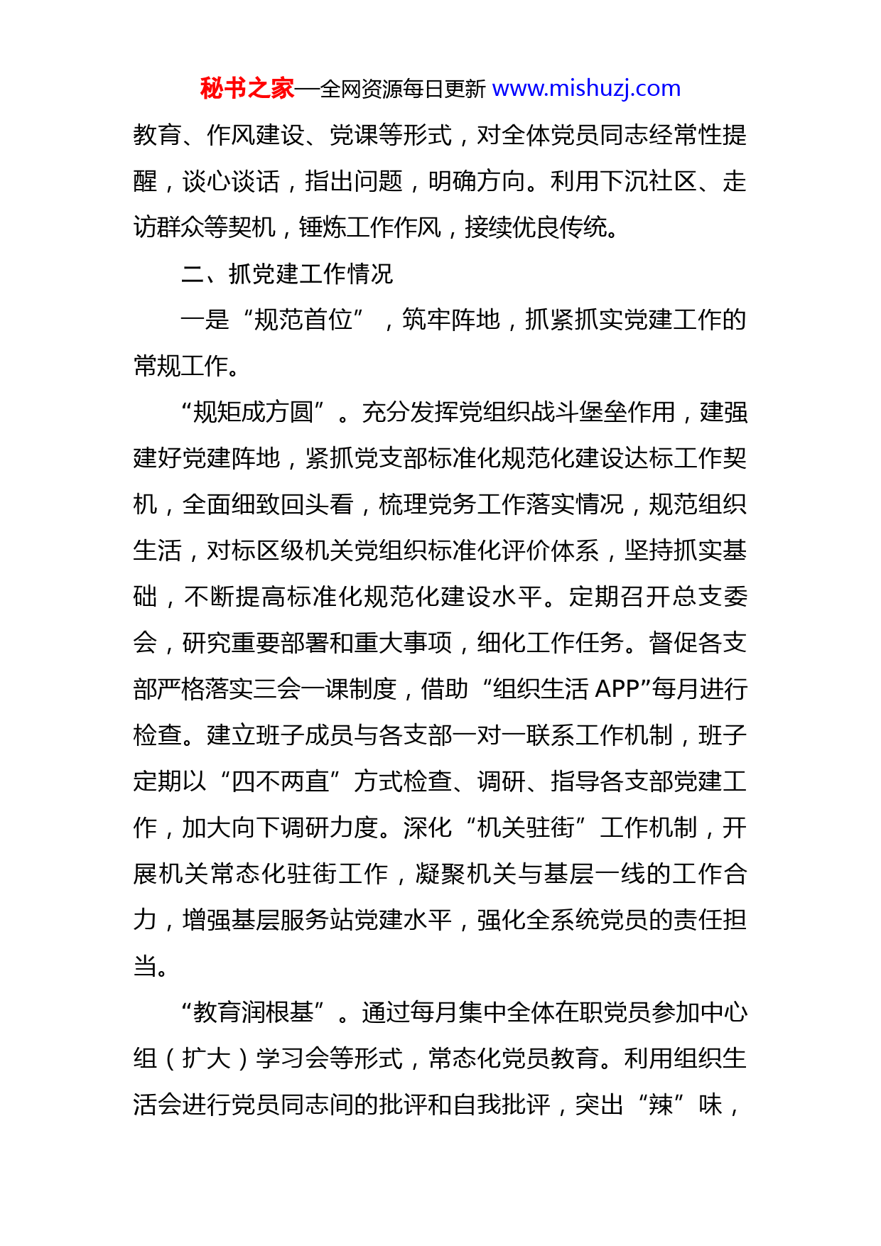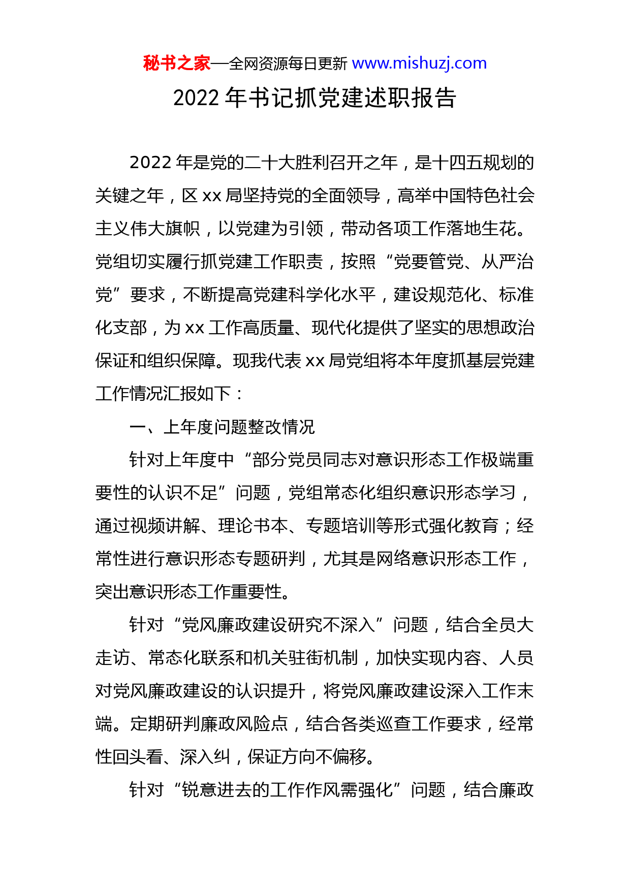 秘书之家—全网资源每日更新www.mishuzj.com2022年书记抓党建述职报告2022年是党的二十大胜利召开之年,是十四五规划的关键之年,区xx局坚持党的全面领导,高举中国特色社会主义伟大旗帜,以党建为引领,带动各项工作落地生花。党组切实履行抓党建工作职责,按照“党要管党、从严治党”要求,不断提高党建科学化水平,建设规范化、标准化支部,为xx工作高质量、现代化提供了坚实的思想政治保证和组织保障。现我代表xx局党组将本年度抓基层党建工作情况汇报如下:一、上年度问题整改情况针对上年度中“部分党员同志对意识形态工作极端重要性的认识不足”问题,党组常态化组织意识形态学习,通过视频讲解、理论书本、专题培训等形式强化教育;经常性进行意识形态专题研判,尤其是网络意识形态工作,突出意识形态工作重要性。针对“党风廉政建设研究不深入”问题,结合全员大走访、常态化联系和机关驻街机制,加快实现内容、人员对党风廉政建设的认识提升,将党风廉政建设深入工作末端。定期研判廉政风险点,结合各类巡查工作要求,经常性回头看、深入纠,保证方向不偏移。针对“锐意进去的工作作风需强化”问题,结合廉政秘书之家—全网资源每日更新www.mishuzj.com教育、作风建设、党课等形式,对全体党员同志经常性提醒,谈心谈话,指出问题,明确方向。利用下沉社区、走访群众等契机,锤炼工作作风,接续优良传统。二、抓党建工作情况一是“规范首位”,筑牢阵地,抓紧抓实党建工作的常规工作。“规矩成方圆”。充分发挥党组织战斗堡垒作用,建强建好党建阵地,紧抓党支部标准化规范化建设达标工作契机,全面细致回头看,梳理党务工作落实情况,规范组织生活,对标区级机关党组织标准化评价体系,坚持抓实基础,不断提高标准化规范化建设水平。定期召开总支委会,研究重要部署和重大事项,细化工作任务。督促各支部严格落实三会一课制度,借助“组织生活APP”每月进行检查。建立班子成员与各支部一对一联系工作机制,班子定期以“四不两直”方式检查、调研、指导各支部党建工作,加大向下调研力度。深化“机关驻街”工作机制,开展机关常态化驻街工作,凝聚机关与基层一线的工作合力,增强基层服务站党建水平,强化全系统党员的责任担当。“教育润根基”。通过每月集中全体在职党员参加中心组(扩大)学习会等形式,常态化党员教育。利用组织生活会进行党员同志间的批评和自我批评,突出“辣”味,秘书之家—全网资源每日更新www.mishuzj.com真正帮助同志正衣冠。每月组织主题党日活动,党组带领全体党员干部原原本本读理论著作,如《习近平谈治国理政(第四卷)》《习近平法治思想》《党的二十大报告》等,增强政治判断力、政治领悟力、政治执行力,深刻领悟“两个确立”的决定性意义,增强“四个意识”,坚定“四个自信”,做到“两个维护”;着重学习《中国共产党党徽党旗条例》,举办党的二十大精神交流学习研讨会,不同年龄、不同身份的党员同志争相发言,互学互鉴;组织红色主题观影活动,《长津湖》《狙击手》《郭富山》等优秀主旋律电影不断锤炼党员光辉党性,浸润精神世界。“人才垒高楼”。培养吸纳优秀人才进入中国共产党是基层党组织的重要工作之一,xx局根据现有人员结构分析、党外人士情况了解,鼓励优秀青年提交入党申请书、持续培养入党积极分子。2022年,共有x名预备党员转正、x名入党积极分子发展为预备党员、x名同志递交入党申请书,不断壮大党的组织力量,为基层党组织建设标准化、高质量化提供坚实保障,建强建好基层党组织战斗堡垒。7月1日,党总支新发展党员、党员代表赴xx地进行入党宣誓、重温入党誓词活动,宣出理想信念,坚定初心使命。二是“人民至上”,深化服务,做好做特党建工作的秘书之家—全网资源每日更新www.mishuzj.com根本任务。xx局始终坚持用心用情用力做服务,深入践行群众路线和以人民为中心的大局观,充分发挥党建引领作用,依托党建阵地,实现为人民服务的初心与使命。“志愿红”点亮防疫一线。上半年,xx局派出志愿服务队局机关支队xx名队员前往xx参与一线疫情防控工作,克服路途遥远、天气恶劣、战线拉长等因素,秉承“生命至上、人民至上”的原则,挺在一线,让党旗高高飘扬。下半年,志愿服务队继续站好疫情防控最后一班岗,下沉社区,日夜坚守,守护人民生命安全。扎实开展“党员干部大走访”行动,为民办实事、办好事,面对面了解群众困难,心贴心感受群众疾苦,切实为群众纾困解难。“英雄红”赓续红色血脉。2022年,xx局打造英模宣讲团,讲述英烈故事,弘扬英烈精神。全年累计宣讲31场,受众达1732余人,分别涵盖学校、医院、社区、企业、机关单位等,受到上级部门、群众一致好评,有效做到了红色精神代代相传的初衷。策划拍摄出品《xxxx》系列英烈宣传短片,以烈士事迹为背景,记录烈士生平,赓续英烈精神,传承红色基因。短片在学习强国等平台播出后,好评如潮,浓厚了社会氛围。联合扶贫基金会,组织线上募捐活动,筹集资金xx万元,用于慰问烈士直系家属,努力营造崇尚英烈、缅怀英烈、学习英烈、捍卫英秘书之家—全网资源每日更新www.mishuzj.com烈、关爱烈属的浓厚氛围。“阵地红”谱写创新篇章。2022年xx局助力打造运营综合服务基地,以党建为引领,打造