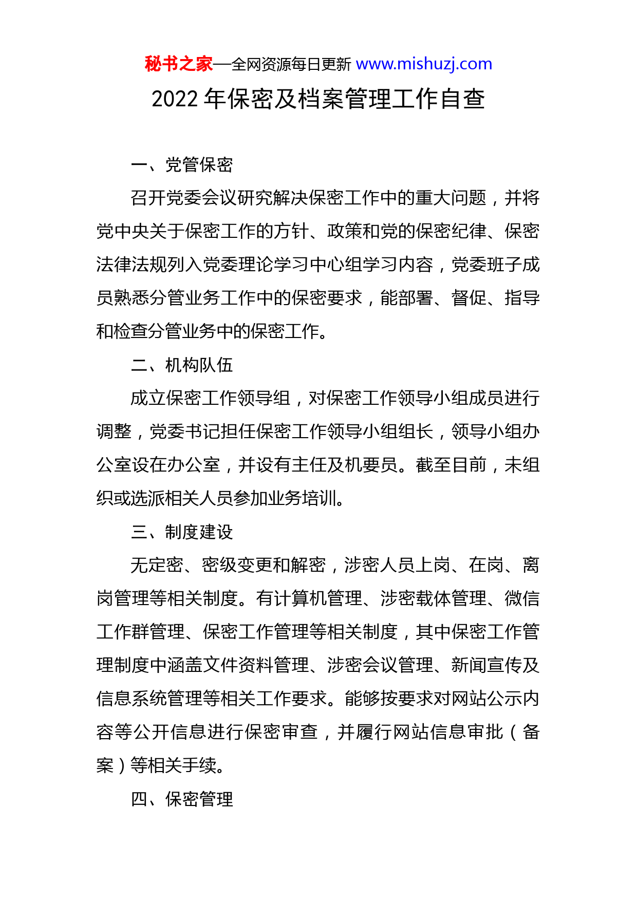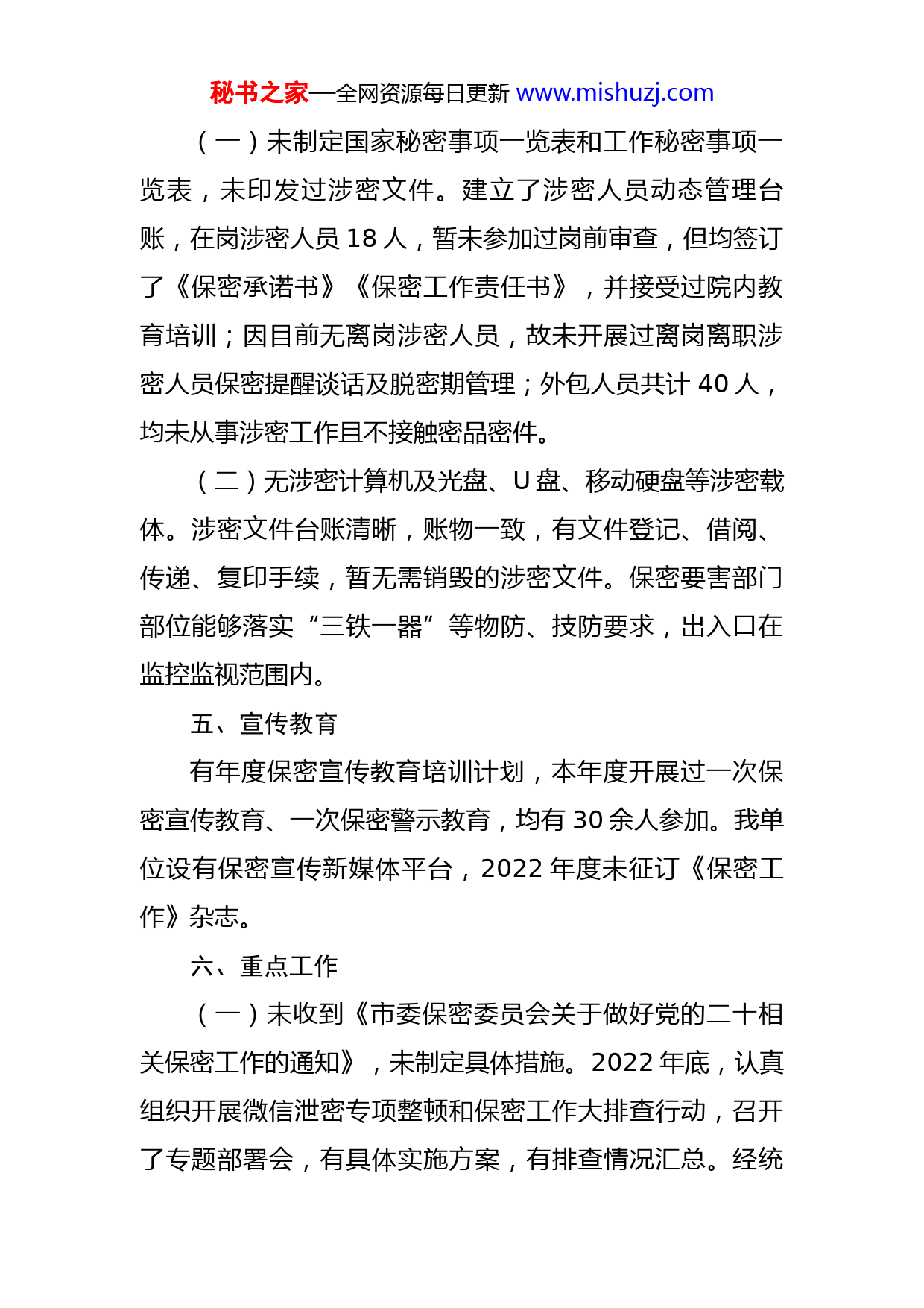 秘书之家—全网资源每日更新www.mishuzj.com2022年保密及档案管理工作自查一、党管保密召开党委会议研究解决保密工作中的重大问题,并将党中央关于保密工作的方针、政策和党的保密纪律、保密法律法规列入党委理论学习中心组学习内容,党委班子成员熟悉分管业务工作中的保密要求,能部署、督促、指导和检查分管业务中的保密工作。二、机构队伍成立保密工作领导组,对保密工作领导小组成员进行调整,党委书记担任保密工作领导小组组长,领导小组办公室设在办公室,并设有主任及机要员。截至目前,未组织或选派相关人员参加业务培训。三、制度建设无定密、密级变更和解密,涉密人员上岗、在岗、离岗管理等相关制度。有计算机管理、涉密载体管理、微信工作群管理、保密工作管理等相关制度,其中保密工作管理制度中涵盖文件资料管理、涉密会议管理、新闻宣传及信息系统管理等相关工作要求。能够按要求对网站公示内容等公开信息进行保密审查,并履行网站信息审批(备案)等相关手续。四、保密管理秘书之家—全网资源每日更新www.mishuzj.com(一)未制定国家秘密事项一览表和工作秘密事项一览表,未印发过涉密文件。建立了涉密人员动态管理台账,在岗涉密人员18人,暂未参加过岗前审查,但均签订了《保密承诺书》《保密工作责任书》,并接受过院内教育培训;因目前无离岗涉密人员,故未开展过离岗离职涉密人员保密提醒谈话及脱密期管理;外包人员共计40人,均未从事涉密工作且不接触密品密件。(二)无涉密计算机及光盘、U盘、移动硬盘等涉密载体。涉密文件台账清晰,账物一致,有文件登记、借阅、传递、复印手续,暂无需销毁的涉密文件。保密要害部门部位能够落实“三铁一器”等物防、技防要求,出入口在监控监视范围内。五、宣传教育有年度保密宣传教育培训计划,本年度开展过一次保密宣传教育、一次保密警示教育,均有30余人参加。我单位设有保密宣传新媒体平台,2022年度未征订《保密工作》杂志。六、重点工作(一)未收到《市委保密委员会关于做好党的二十相关保密工作的通知》,未制定具体措施。2022年底,认真组织开展微信泄密专项整顿和保密工作大排查行动,召开了专题部署会,有具体实施方案,有排查情况汇总。经统秘书之家—全网资源每日更新www.mishuzj.com计,我单位现有微信工作群111个、QQ工作群5个、工作邮箱60个。(二)按要求开展保密宣传教育月系列活动,有活动方案,制作“保密故事大家讲”微视频一部;开展保密专题课一次、警示教育会一次;组织涉密岗位人员通过“保密观”APP或中国保密在线参加保密教育线上培训,共101人取得保密教育培训证书。截至目前,暂未组织学习中央保密办、国家保密局印发的《机关、单位保密自查自评工作规则》,未开展保密自查自评工作。七、档案安全保障机制落实情况(一)我单位档案管理组织机构健全,规章制度较为完善,制定下发了《关于调整档案管理领导小组成员的通知》《关于调整档案鉴定、销毁领导小组成员的通知》等文件,明确各项工作职责,保障了档案安全工作的顺利开展。(二)严格按照《档案库房管理制度》《档案保管保密制度》《档案鉴定销毁制度》《档案查阅利用制度》《档案管理人员岗位职责》等相关规定开展工作,定期进行档案安全检查,不断加强对归档文件材料的保管及保密力度。(三)我单位设有专职档案管理员4名,各相关科室根据工作职责设有兼职档案管理员10余名。我单位不断提秘书之家—全网资源每日更新www.mishuzj.com高档案管理人员的业务素质,定期组织档案管理人员参加业务培训,但目前缺乏具有档案专业技术职称的工作人员。八、档案实体安全隐患排查情况(一)综合档案检索工具齐全,目录登记与档案实体相符,档案装具符合档案安全要求,并严格落实档案保管、利用、保护、保密、应急等规章制度,实行档案专人保管、专人查阅、集中归档,凡涉及保密的文件资料,领导审批方能借阅。(二)档案室为一层彩钢房,设在地上一层,面积约60平方米,档案库房未出租、出借或改作他用。档案室设有符合国家标准的装具,按要求配备了二氧化碳灭火器、报警器、防爆灯、防盗门窗、监控等设施,防尘、防光、防污染基本设施齐全,定期放置防虫、防鼠等药剂。档案室电气线路、水暖管道、机电设备安全,日常维护保养到位,但存在各种电线插板裸露在外的情况。库房设有温湿度计,但无调控措施,无防水设施及门禁系统。九、档案信息安全隐患排查情况因档案室未配置档案管理软件以及信息化管理机房,因此暂未实现档案信息化管理。十、档案安全应急管理安全隐患排查情况(一)我单位尚未建立自然灾害及其他突发事件的防秘书之家—全网资源每日更新www.mishuzj.com范和应急处置机制,但能严格按照《档案工作突发事件应急管理办法》《档案防治灾害工作指南》等要求开展档案管理工作;针对档案管理制定了应对突发事件以及自然灾害的应急预案,能结合我单位工作实际,定期开展安全生产应急演练及隐患排查,不断提高工作人员对安全知识的掌握和应急处置的能力。(二)我单位设有总值班,能保证24小时通讯畅通,但尚未针对档案管理建立值班制度,下班期间档案室暂无专人值守。下一步,针对自查中发现的问题,我单位将进一步提高思想认识,建立完善