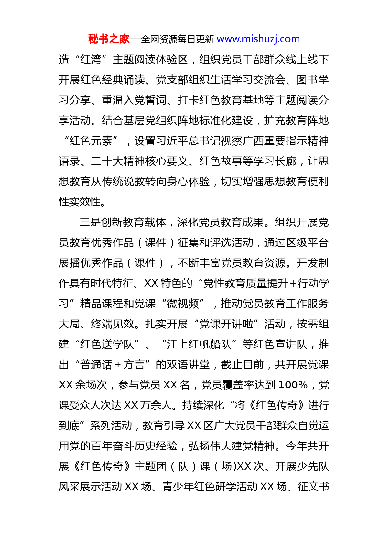 秘书之家—全网资源每日更新www.mishuzj.com2022年党员教育工作总结2022年,X区紧紧围绕“喜迎二十大,建功新时代”主题,以“强堡垒、当先锋、打头阵”规范提升年暨“五基三化”攻坚年行动为抓手,深入贯彻落实《中国共产党党员教育管理工作条例》《2019-2023年全国党员教育培训工作规划》等文件精神,全面推动XX区党员教育工作提质提效。一、2022主要工作情况一是突出政治引领,强化思想政治教育。坚持把习近平新时代中国特色社会主义思想作为各级党员教育培训的首课、主课、必修课和常修课,贯穿“三会一课”等日常教育全过程,建立健全常态化长效化教育培训工作机制,推动广大党员深刻领悟“两个确立”的决定性意义,切实增强“四个意识”、坚定“四个自信”、做到“两个维护”。二是加强平台建设,优化党员教育功能。持续推进党员教育工作体系化和平台一体化建设,推动建设“壮美广西·党建云”站点项目。充分发挥区镇村三级党群服务中心阵地作用,依托XX辖区高校教育资源优势,打造特色课程,分层分类对各领域党员进行全覆盖兜底大培训,整体提升党员队伍质量,今年共开展培训XX场、XX人次。打秘书之家—全网资源每日更新www.mishuzj.com造“红湾”主题阅读体验区,组织党员干部群众线上线下开展红色经典诵读、党支部组织生活学习交流会、图书学习分享、重温入党誓词、打卡红色教育基地等主题阅读分享活动。结合基层党组织阵地标准化建设,扩充教育阵地“红色元素”,设置习近平总书记视察广西重要指示精神语录、二十大精神核心要义、红色故事等学习长廊,让思想教育从传统说教转向身心体验,切实增强思想教育便利性实效性。三是创新教育载体,深化党员教育成果。组织开展党员教育优秀作品(课件)征集和评选活动,通过区级平台展播优秀作品(课件),不断丰富党员教育资源。开发制作具有时代特征、XX特色的“党性教育质量提升+行动学习”精品课程和党课“微视频”,推动党员教育工作服务大局、终端见效。扎实开展“党课开讲啦”活动,按需组建“红色送学队”、“江上红帆船队”等红色宣讲队,推出“普通话+方言”的双语讲堂,截止目前,共开展党课XX余场次,参与党员XX名,党员覆盖率达到100%,党课受众人次达XX万余人。持续深化“将《红色传奇》进行到底”系列活动,教育引导XX区广大党员干部群众自觉运用党的百年奋斗历史经验,弘扬伟大建党精神。今年共开展《红色传奇》主题团(队)课(场)XX次、开展少先队风采展示活动XX场、青少年红色研学活动XX场、征文书秘书之家—全网资源每日更新www.mishuzj.com画诵读评比活动报送作品XX件、开展演讲演唱活动XX场、主题阅读分享活动XX场、红色家书征集XX篇、宣传报道XX篇。二、当前重点工作一是完成第四季度党员教育工作。采取区级普遍培训、基层党委兜底培训形式,利用党员教育培训阵地、党员教育师资库,高质量完成第四季度党员教育轮训工作。二是完成“红湾”主题阅读体验区建设。根据自治区“两红”工作专班和市党员教育中心领导来我区调研时提出的整改要求,对场地和阅读区重新进行规划,严格按照自治区验收时间完成“红湾”主题阅读体验区建设。三是总结各项系列活动。对“党课开讲啦”“将《红色传奇》进行到底”“向身边榜样学习”等系列活动进行总结。三、2023年党员教育工作打算(一)深化党的创新理论学习教育。坚持把学习贯彻习近平新时代中国特色社会主义思想作为首要政治任务,围绕党的创新理论落地生根这一主题,以党的二十大精神、习近平总书记视察广西“4·27”重要讲话精神和对广西工作系列重要指示以及对XX的重要指示精神为重点,把习近平新时代中国特色社会主义思想作为各级党员教育培训的首课、主课、必修课和常修课,贯穿“三会一课”等日常教育全过程,建立健全常态化长效化教育培训工作机秘书之家—全网资源每日更新www.mishuzj.com制,推动广大党员深刻领悟“两个确立”的决定性意义,切实增强“四个意识”、坚定“四个自信”、做到“两个维护”。打造“对党忠诚教育”情景课、现场课,开发制作具有时代特征、XX特色的精品课程,使党员教育工作入脑入心。(二)组织开展党员教育系列活动。按照市党员教育中心统一部署,充分发挥党员教育系列平台矩阵作用。持续深化“党课开讲啦”活动,广泛开展“学习身边榜样”活动,巩固拓展“将《红色传奇》进行到底”系列活动成果,加大“红湾”主题阅读体验区建设使用力度,深化“红湾”图书线下漂流活动,持续开展“打卡红色教育基地”活动。(三)精准落实《条例》和《规划》。贯彻落实《中国共产党党员教育管理工作条例》和《2019—2023年全国党员教育培训工作规划》,围绕打造世界级旅游城市新XX和抓党建促产业振兴、科教振兴、乡村振兴等中心工作,加强党员教育精品教材开发建设,组织开展党员教育优秀作品(课件)征集和评选活动,通过各级平台展播优秀作品(课件),不断丰富党员教育资源。(四)分层分类开展党员教育培训。坚持集中培训、集体学习、个人自学和组织生活、实践锻炼有机结合,创新运用信息化手段组织广大党员开展集中性教育、经常性秘书之家—全网资源每日更新www.mishuzj.com教育。根据不同群体和需求,对村“两委”、新发展党员等,