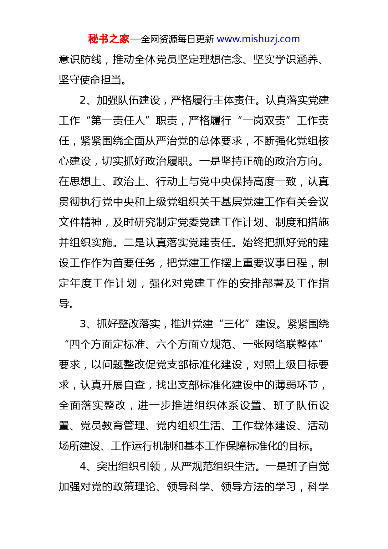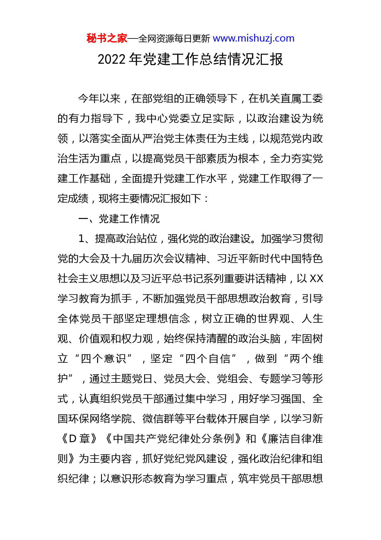 秘书之家—全网资源每日更新www.mishuzj.com2022年党建工作总结情况汇报今年以来,在部党组的正确领导下,在机关直属工委的有力指导下,我中心党委立足实际,以政治建设为统领,以落实全面从严治党主体责任为主线,以规范党内政治生活为重点,以提高党员干部素质为根本,全力夯实党建工作基础,全面提升党建工作水平,党建工作取得了一定成绩,现将主要情况汇报如下:一、党建工作情况1、提高政治站位,强化党的政治建设。加强学习贯彻党的大会及十九届历次会议精神、习近平新时代中国特色社会主义思想以及习近平总书记系列重要讲话精神,以XX学习教育为抓手,不断加强党员干部思想政治教育,引导全体党员干部坚定理想信念,树立正确的世界观、人生观、价值观和权力观,始终保持清醒的政治头脑,牢固树立“四个意识”,坚定“四个自信”,做到“两个维护”,通过主题党日、党员大会、党组会、专题学习等形式,认真组织党员干部通过集中学习,用好学习强国、全国环保网络学院、微信群等平台载体开展自学,以学习新《D章》《中国共产党纪律处分条例》和《廉洁自律准则》为主要内容,抓好党纪党风建设,强化政治纪律和组织纪律;以意识形态教育为学习重点,筑牢党员干部思想秘书之家—全网资源每日更新www.mishuzj.com意识防线,推动全体党员坚定理想信念、坚实学识涵养、坚守使命担当。2、加强队伍建设,严格履行主体责任。认真落实党建工作“第一责任人”职责,严格履行“一岗双责”工作责任,紧紧围绕全面从严治党的总体要求,不断强化党组核心建设,切实抓好政治履职。一是坚持正确的政治方向。在思想上、政治上、行动上与党中央保持高度一致,认真贯彻执行党中央和上级党组织关于基层党建工作有关会议文件精神,及时研究制定党委党建工作计划、制度和措施并组织实施。二是认真落实党建责任。始终把抓好党的建设工作作为首要任务,把党建工作摆上重要议事日程,制定年度工作计划,强化对党建工作的安排部署及工作指导。3、抓好整改落实,推进党建“三化”建设。紧紧围绕“四个方面定标准、六个方面立规范、一张网络联整体”要求,以问题整改促党支部标准化建设,对照上级目标要求,认真开展自查,找出支部标准化建设中的薄弱环节,全面落实整改,进一步推进组织体系设置、班子队伍设置、党员教育管理、党内组织生活、工作载体建设、活动场所建设、工作运行机制和基本工作保障标准化的目标。4、突出组织引领,从严规范组织生活。一是班子自觉加强对党的政策理论、领导科学、领导方法的学习,科学秘书之家—全网资源每日更新www.mishuzj.com调配自身的时间和精力,充分发挥表率作用、引领作用,带头学习、带头落实党建任务,认真执行《新形势下党内政治生活若干准则》,严格落实民主集中制和“三会一课”等党内生活制度,认真开展主题党日活动,按规定召开组织生活会。定期组织集中学习、党员民主评议、按期缴纳党费等,加强党员考核管理,提高党性修养,教育引导党员干部发挥好示范引领作用,全年开展“支部主题党日”活动12次、中心委员会16次、召开党员大会以及组织党员集中学习11次,讲授专题党课12次。二是规范落实机关单位党组织在职党员到社区报工作,党员干部到社区报到率100%,发挥党员先锋模范作用,服务社区服务群众,开展政策宣讲、环境卫生整治、交通秩序维护、家居服务、困难群众帮扶等为民办实事活动,全面深化共建工作。2022年X月X日联合XX、XX、XX等单位参与XX社区群众服务,现场开展XX宣讲、反电信网络诈骗宣传、防贫险宣传、免费健康体检,让群众知党恩、感党恩、听党话、跟党走。5、加强作风建设,筑牢防腐拒变防线。我中心党委始终深入贯彻落实中央八项规定及实施细则精神等有关规定,坚决贯彻落实民主集中制原则,进一步健全和完善党内监督制度,加强对重点领域的管理监督,“三重一大”事项,均由局党组会议集体讨论决定,保证了决策过程的秘书之家—全网资源每日更新www.mishuzj.com科学民主和结果的公正合理。认真遵守和执行廉洁从政的各项法律法规和规章制度,严格落实党风廉政建设责任制和主要领导“一岗双责”制,加强党风廉政建设工作考核机制。引导党员学习《中国共产党廉洁自律准则》和《中国共产党纪律处分条例》等廉政党纪法规,让廉洁思想入脑入心,切实增强党员干部拒腐防变的能力,自觉抵制各种腐朽思想和不正之风的侵蚀,自觉做到常警醒、明底线、知敬畏,主动在思想上划出红线、在行为上明确界限,真正敬法畏纪、遵规守矩,干部职工的责任意识、廉政守纪意识进一步增强,促进了各项工作的顺利开展。二、XX学习教育开展情况(一)严格落实相关要求一是加强组织领导。专门成立了学习教育领导小组,由党组书记负责XX学习教育的组织领导、统筹协调和督促指导,领导小组由XX同志任组长,XX任副组长,股(室)股长任成员,领导小组办公室设在办公室(党办室),负责日常工作。二是把握正确导向。牢牢把握党的历史发展主题和主线、主流和本质,以两个历史决议等中央文件精神为依据,正确认识XX上的重大事件、重要人物、重要会议等,坚决反对和抵制各种错误观点特别是否定党的领导、否定中国特色社会主义的错误观点,引导全体党员干部群众树秘书之家—全