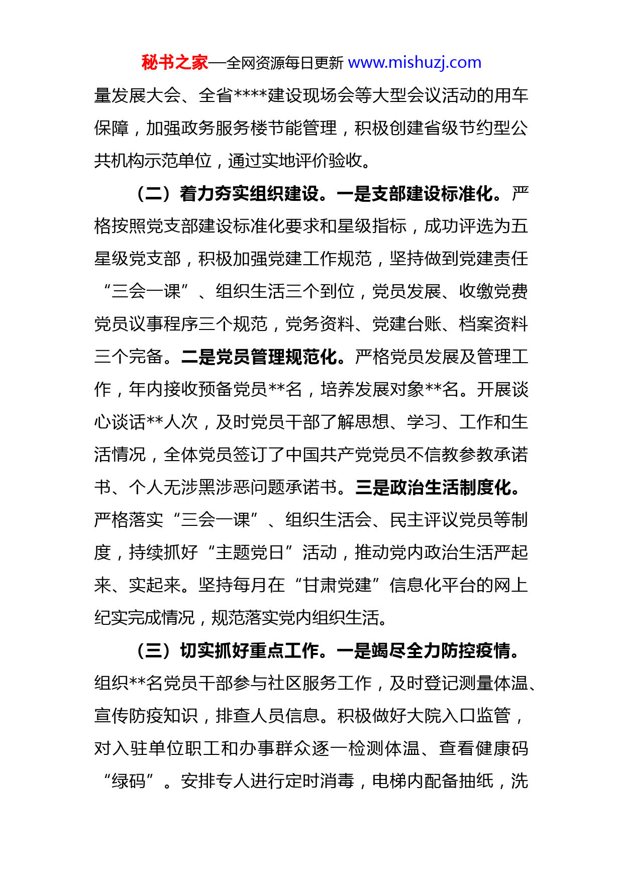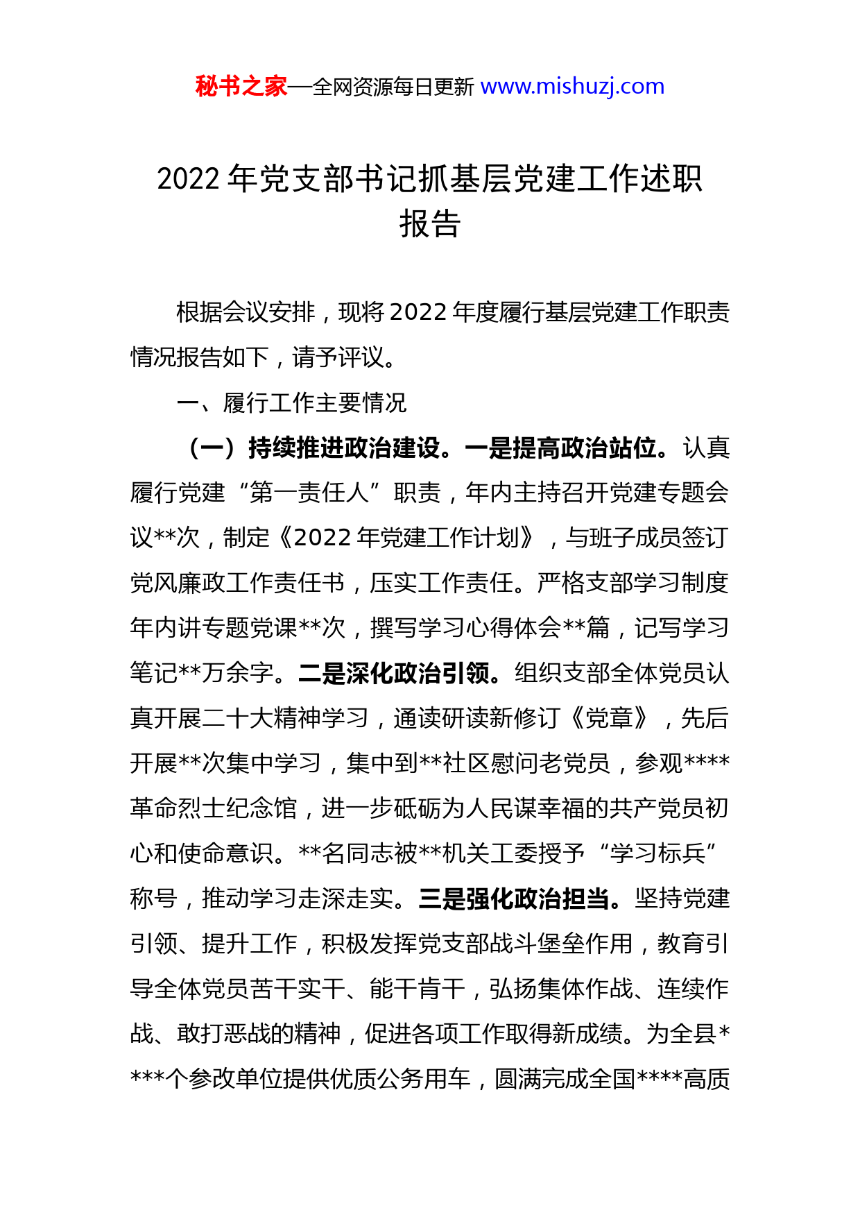 秘书之家—全网资源每日更新www.mishuzj.com2022年党支部书记抓基层党建工作述职报告根据会议安排,现将2022年度履行基层党建工作职责情况报告如下,请予评议。一、履行工作主要情况(一)持续推进政治建设。一是提高政治站位。认真履行党建“第一责任人”职责,年内主持召开党建专题会议次,制定《2022年党建工作计划》,与班子成员签订党风廉政工作责任书,压实工作责任。严格支部学习制度年内讲专题党课次,撰写学习心得体会篇,记写学习笔记万余字。二是深化政治引领。组织支部全体党员认真开展二十大精神学习,通读研读新修订《党章》,先后开展次集中学习,集中到社区慰问老党员,参观革命烈士纪念馆,进一步砥砺为人民谋幸福的共产党员初心和使命意识。名同志被机关工委授予“学习标兵”称号,推动学习走深走实。三是强化政治担当。坚持党建引领、提升工作,积极发挥党支部战斗堡垒作用,教育引导全体党员苦干实干、能干肯干,弘扬集体作战、连续作战、敢打恶战的精神,促进各项工作取得新成绩。为全县个参改单位提供优质公务用车,圆满完成全国高质秘书之家—全网资源每日更新www.mishuzj.com量发展大会、全省建设现场会等大型会议活动的用车保障,加强政务服务楼节能管理,积极创建省级节约型公共机构示范单位,通过实地评价验收。(二)着力夯实组织建设。一是支部建设标准化。严格按照党支部建设标准化要求和星级指标,成功评选为五星级党支部,积极加强党建工作规范,坚持做到党建责任“三会一课”、组织生活三个到位,党员发展、收缴党费党员议事程序三个规范,党务资料、党建台账、档案资料三个完备。二是党员管理规范化。严格党员发展及管理工作,年内接收预备党员名,培养发展对象名。开展谈心谈话人次,及时党员干部了解思想、学习、工作和生活情况,全体党员签订了中国共产党党员不信教参教承诺书、个人无涉黑涉恶问题承诺书。三是政治生活制度化。严格落实“三会一课”、组织生活会、民主评议党员等制度,持续抓好“主题党日”活动,推动党内政治生活严起来、实起来。坚持每月在“甘肃党建”信息化平台的网上纪实完成情况,规范落实党内组织生活。(三)切实抓好重点工作。一是竭尽全力防控疫情。组织名党员干部参与社区服务工作,及时登记测量体温、宣传防疫知识,排查人员信息。积极做好大院入口监管,对入驻单位职工和办事群众逐一检测体温、查看健康码“绿码”。安排专人进行定时消毒,电梯内配备抽纸,洗秘书之家—全网资源每日更新www.mishuzj.com手间和会议室配备抑菌洗手液,确保群众日常生活有基础健康安全有保障。二是想尽办法帮助群众。年内组织帮扶干部入户批人次,梳理扶贫项目需求余条。落实湖羊自养户户,完成养殖技术培训人,新建羊棚座、改扩建座,新建草棚座,饲草种植达到亩,安装净水器户。筹措资金万元为帮扶村户群众每户捐赠户用垃圾桶1个,筹资元为联系户群众送去燃煤、火炉等物资,为群众营造了一个整洁、舒适的环境,为实施乡村振兴战略夯实了基础。二、存在的主要问题及原因通过一年来的努力工作,党支部各项工作均取得了一定成绩,但是对照组织要求,差距还是很大。通过查找,感觉自己还存在以下几个问题:(一)抓党建强理论学习不够经常。在党员集体学习上,虽然建立了学习制度,但在一如既往、善始善终上落实得还不够到位。在学习形式上方法相对单一,在学习内容上存在形式主义,部分党员的学习自觉性和主动性还不高,特别是对新知识、新任务的学习不够深入。(二)抓党建谋发展思路不够清晰。在丰富党员学习、文化生活方面方式还不够多,组织生活主要是以组织生活会、召开党员大会为主,存在内容枯燥,缺乏活力,方式方法单一的问题,党员参与积极性不高,吸引力不够。秘书之家—全网资源每日更新www.mishuzj.com(三)抓党建促落实措施不够有力。对一些具体工作跟得不紧、督的不严,在抓小、抓细、抓实上做的还不够缺乏一抓到底的“钉钉子”精神。同时由于党支部党员较少,党务干部兼办会计业务,缺乏足够精力和时间抓好党务工作,影响了党建工作质量成效。究其主要原因:一是开展党建工作重视程度不够。对工作,感觉任务重、责任大、平时关注的多、研究的多。而对党建工作投入精力相对较少,只要把规定的任务安排部署好,就算是完成任务,导致工作成效一般。二是促进党建工作融合不够有力。抓党建、促发展的站位不高,工作方法不灵活,在找准党建工作与机关事务工作融合点上做得还不够,没有很好发挥党建工作对业务工作的引领助推作用。三是落实党建工作措施不够硬。党建工作目标管理作用发挥得不好,有时满足于出思路、定目标、交任务在抓具体、抓细节、抓深入上做得不够,平时批评指正问题的多,问责追究的少,教育、监督和推动作用发挥得不够好。三、下一步工作打算(一)多措并举,贯彻全会精神。采取集中学习、精读文件、专题研讨、个人自学等方式方法,深入开展学习教育活动,兴起学习宣传贯彻二十大精神的热潮,努力学得更深、悟得更透,使全局党员干部,把思想统一到全会秘书之家—全网资源每日更新www.mishuzj.com精神上来,把认识统一到各项工作部署上来,坚持以学立本,全面提高业务能力,努力把学习宣传贯彻成果转