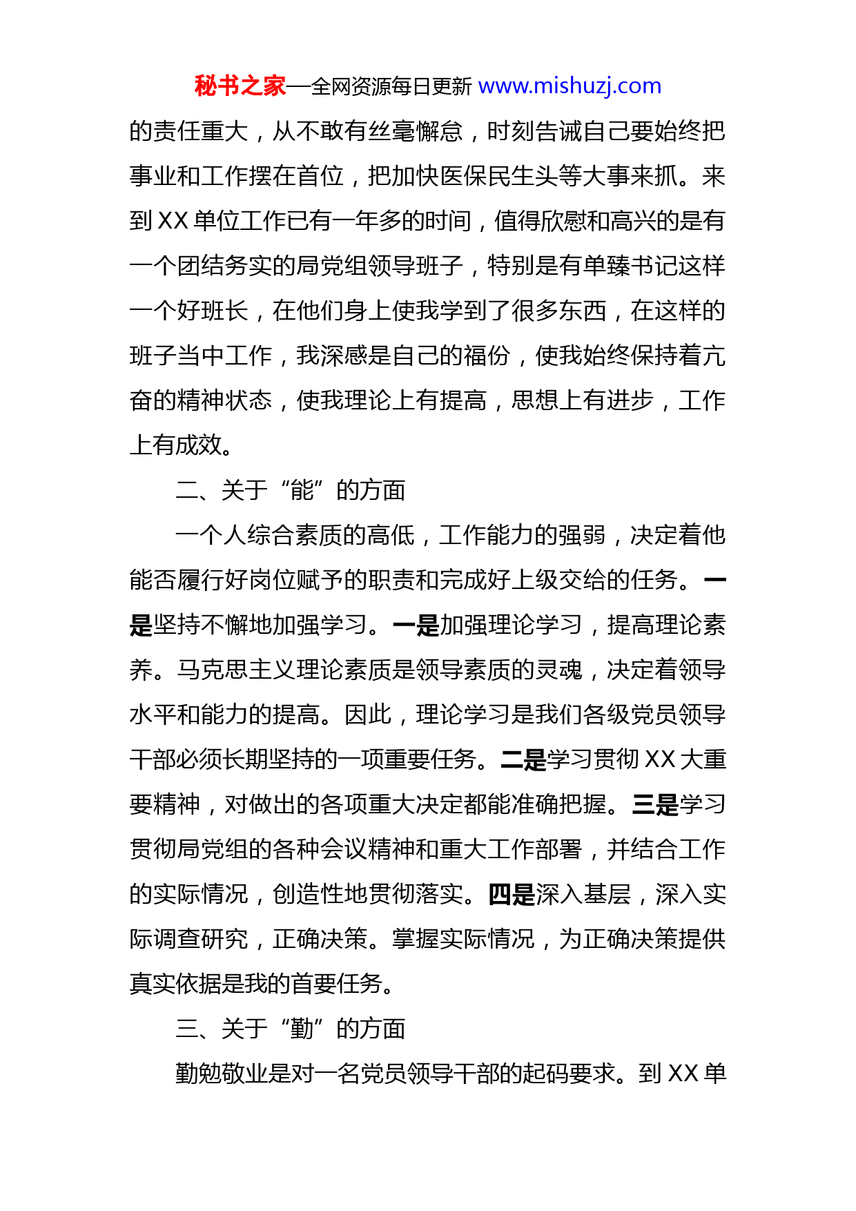 秘书之家—全网资源每日更新www.mishuzj.com2022年党政领导干部个人年终总结2022年以来,我坚持按照XX要求,勤奋学习,努力工作,较好地履行了职责,发挥了思想政治工作的服务保证作用。下面,就将我一年的工作情况作以汇报。一、关于“德”的方面。自从担任领导干部以来,我始终注重加强主观世界的改造,牢固树立马克思主义的世界观、人生观、价值观,牢固树立正确的权力观、地位观、利益观,保持良好的道德风尚。不管是担任副局长,还是主持工作,我都能从严要求自己,坚持做到“在认认真真学习上要有新进步,在堂堂正正做人上要有新境界,在踏踏实实做事上要有新成效,在清清白白做官上要有新形象”。无论做什么工作都能摆正自己同组织、同事业的关系,把实现个人的人生价值同服从上级领导的安排和开创工作新局面,不断振兴事业紧密地结合起来,自觉地学习和贯彻党的基本理论、基本纲领和基本路线,身体力行马列主义、毛泽东思想、“三个代表”、XJP新时代中国特色社会主义的重要思想,激发自己的政治责任感和奋发进取的精神,不断朝着新的目标奋进。在困境面前能够保持良好的心态,继续孜孜不倦地对信仰和理想去追求。始终做到顺境时不得意忘形,困难时不失意悲观。来到XX局工作以后,我深感自己肩负秘书之家—全网资源每日更新www.mishuzj.com的责任重大,从不敢有丝毫懈怠,时刻告诫自己要始终把事业和工作摆在首位,把加快医保民生头等大事来抓。来到XX单位工作已有一年多的时间,值得欣慰和高兴的是有一个团结务实的局党组领导班子,特别是有单臻书记这样一个好班长,在他们身上使我学到了很多东西,在这样的班子当中工作,我深感是自己的福份,使我始终保持着亢奋的精神状态,使我理论上有提高,思想上有进步,工作上有成效。二、关于“能”的方面一个人综合素质的高低,工作能力的强弱,决定着他能否履行好岗位赋予的职责和完成好上级交给的任务。一是坚持不懈地加强学习。一是加强理论学习,提高理论素养。马克思主义理论素质是领导素质的灵魂,决定着领导水平和能力的提高。因此,理论学习是我们各级党员领导干部必须长期坚持的一项重要任务。二是学习贯彻XX大重要精神,对做出的各项重大决定都能准确把握。三是学习贯彻局党组的各种会议精神和重大工作部署,并结合工作的实际情况,创造性地贯彻落实。四是深入基层,深入实际调查研究,正确决策。掌握实际情况,为正确决策提供真实依据是我的首要任务。三、关于“勤”的方面勤勉敬业是对一名党员领导干部的起码要求。到XX单秘书之家—全网资源每日更新www.mishuzj.com位工作后,我始终保持良好的精神状态,决心把局党组对我的重托,全局广大干部职工对我的厚望,化作工作的动力,满腔热情地投入到繁忙的工作之中。加强XX工作。四、关于“绩”的方面一个单位成绩的取得,是上下共同努力的结果,得益于上级领导和部门的支持帮助。XX方面工作有了新的发展做为负责人,我尽到了应尽的职责,发挥了应有的作用。五、关于“廉”的方面。立党为公、执政为民、廉洁奉公是对一名党员领导干部的基本要求。在廉洁自律方面,我能够自觉按照“十不准”和“五防五克服”的要求,严格要求自己,始终保持清政廉洁的作风。我深知自己手中的权利是党和人民赋予的,只有用好权利,真心实意地为职工群众谋利益、服好务,才能履行好自己的职责,才能赢得职工群众的信赖和对事业发展的支持。本人从没有利用职权和职务上的影响,获取一己私利的行为,没有私自从事经营活动的行为,没有假公济私、化公为私的行为,没有讲排场、比阔、挥霍公款铺张浪费的行为。总之,自己在党风廉政建设方面,能够自觉养成奉公守法,以清廉为荣的作风,做到拒腐蚀永不沾。同时,多次在不同的会上强调职工要廉洁从政、清白做人,要求大家一定要保持艰苦奋斗的作风。秘书之家—全网资源每日更新www.mishuzj.com2022年,我局按时完成了XX局年初工作计划的要求。但是,在充分肯定成绩的同时,我们也要清醒地看到面临的困难和问题。对自己一年来的工作情况进行认真述职,从中总结经验,找出差距,对做好今后的工作十分有益。当然,还存在着一些问题和不足,在局党组的真确领导和全局干部职工的齐心努力下,我有决心、有信心,做好本职工作,为XX事业明天的辉煌做出更加伟大的贡献。