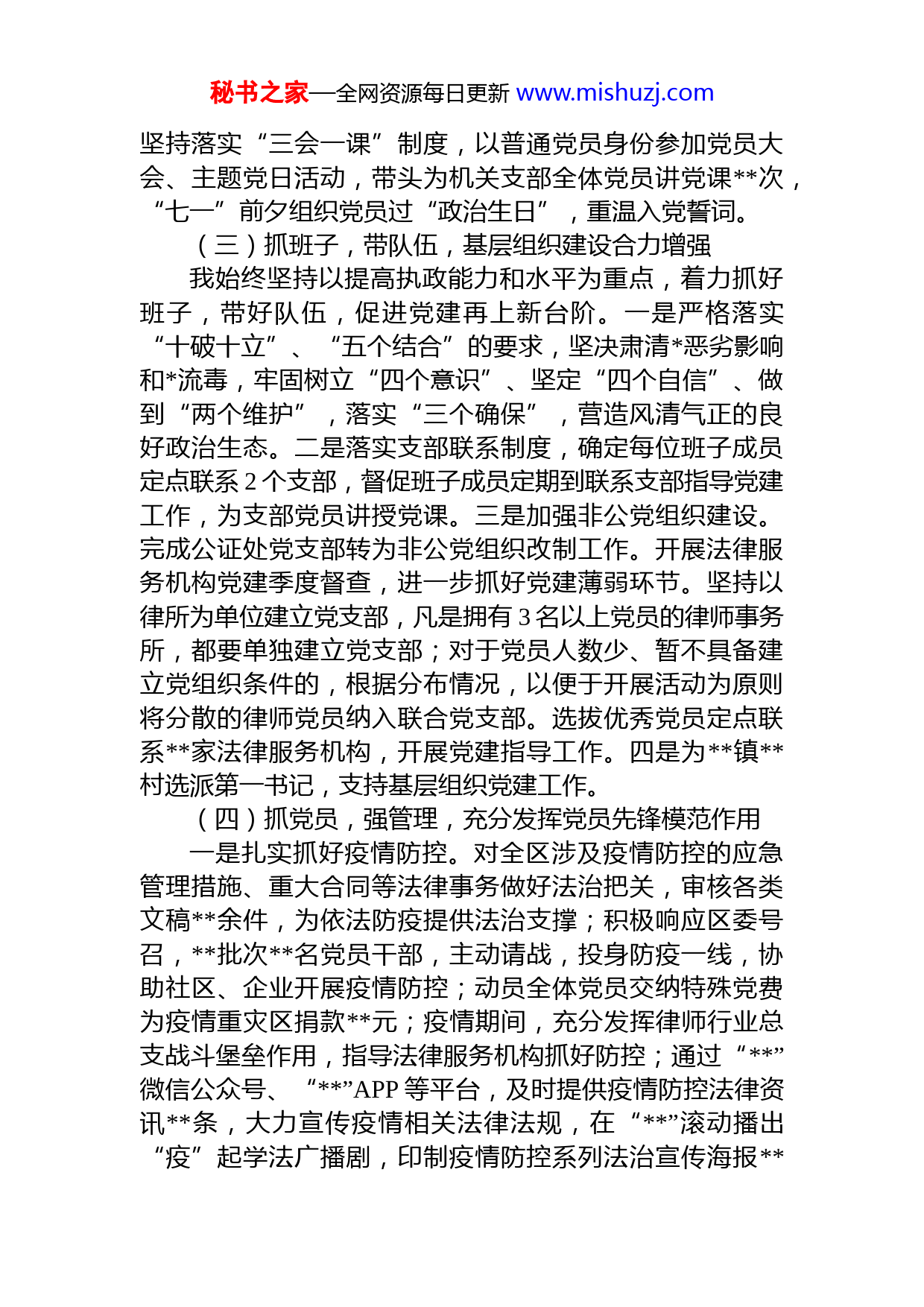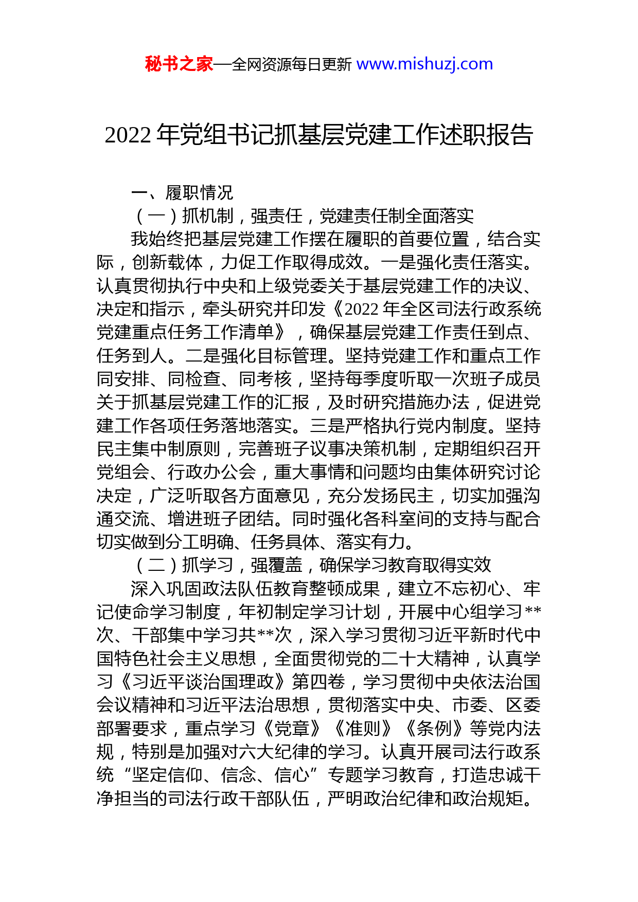 秘书之家—全网资源每日更新www.mishuzj.com2022年党组书记抓基层党建工作述职报告一、履职情况(一)抓机制,强责任,党建责任制全面落实我始终把基层党建工作摆在履职的首要位置,结合实际,创新载体,力促工作取得成效。一是强化责任落实。认真贯彻执行中央和上级党委关于基层党建工作的决议、决定和指示,牵头研究并印发《2022年全区司法行政系统党建重点任务工作清单》,确保基层党建工作责任到点、任务到人。二是强化目标管理。坚持党建工作和重点工作同安排、同检查、同考核,坚持每季度听取一次班子成员关于抓基层党建工作的汇报,及时研究措施办法,促进党建工作各项任务落地落实。三是严格执行党内制度。坚持民主集中制原则,完善班子议事决策机制,定期组织召开党组会、行政办公会,重大事情和问题均由集体研究讨论决定,广泛听取各方面意见,充分发扬民主,切实加强沟通交流、增进班子团结。同时强化各科室间的支持与配合切实做到分工明确、任务具体、落实有力。(二)抓学习,强覆盖,确保学习教育取得实效深入巩固政法队伍教育整顿成果,建立不忘初心、牢记使命学习制度,年初制定学习计划,开展中心组学习次、干部集中学习共次,深入学习贯彻习近平新时代中国特色社会主义思想,全面贯彻党的二十大精神,认真学习《习近平谈治国理政》第四卷,学习贯彻中央依法治国会议精神和习近平法治思想,贯彻落实中央、市委、区委部署要求,重点学习《党章》《准则》《条例》等党内法规,特别是加强对六大纪律的学习。认真开展司法行政系统“坚定信仰、信念、信心”专题学习教育,打造忠诚干净担当的司法行政干部队伍,严明政治纪律和政治规矩。秘书之家—全网资源每日更新www.mishuzj.com坚持落实“三会一课”制度,以普通党员身份参加党员大会、主题党日活动,带头为机关支部全体党员讲党课次,“七一”前夕组织党员过“政治生日”,重温入党誓词。(三)抓班子,带队伍,基层组织建设合力增强我始终坚持以提高执政能力和水平为重点,着力抓好班子,带好队伍,促进党建再上新台阶。一是严格落实“十破十立”、“五个结合”的要求,坚决肃清恶劣影响和流毒,牢固树立“四个意识”、坚定“四个自信”、做到“两个维护”,落实“三个确保”,营造风清气正的良好政治生态。二是落实支部联系制度,确定每位班子成员定点联系2个支部,督促班子成员定期到联系支部指导党建工作,为支部党员讲授党课。三是加强非公党组织建设。完成公证处党支部转为非公党组织改制工作。开展法律服务机构党建季度督查,进一步抓好党建薄弱环节。坚持以律所为单位建立党支部,凡是拥有3名以上党员的律师事务所,都要单独建立党支部;对于党员人数少、暂不具备建立党组织条件的,根据分布情况,以便于开展活动为原则将分散的律师党员纳入联合党支部。选拔优秀党员定点联系家法律服务机构,开展党建指导工作。四是为镇村选派第一书记,支持基层组织党建工作。(四)抓党员,强管理,充分发挥党员先锋模范作用一是扎实抓好疫情防控。对全区涉及疫情防控的应急管理措施、重大合同等法律事务做好法治把关,审核各类文稿余件,为依法防疫提供法治支撑;积极响应区委号召,批次名党员干部,主动请战,投身防疫一线,协助社区、企业开展疫情防控;动员全体党员交纳特殊党费为疫情重灾区捐款元;疫情期间,充分发挥律师行业总支战斗堡垒作用,指导法律服务机构抓好防控;通过“”微信公众号、“”APP等平台,及时提供疫情防控法律资讯条,大力宣传疫情相关法律法规,在“”滚动播出“疫”起学法广播剧,印制疫情防控系列法治宣传海报秘书之家—全网资源每日更新www.mishuzj.com份,免费发放至街镇、村社区和企业,全面提升广大干部群众主动应对疫情的信心和决心。二是积极开展志愿服务开展“公共法律服务便民惠民在行动”志愿服务活动,累计为群众解答来访、来电法律咨询多达余人次。广泛实施“民法典与生活同行”系列宣讲活动,积极参与新时代文明实践“六讲”志愿服务中的讲法律志愿服务。围绕“乡村振兴和”“三治建设”,动员志愿者深入村社开展法治宣传,提升市民法治素养。为民营经济发展提供法律志愿服务,深入企业开展法制宣讲和法律咨询场次,定期提供法律服务,开展法制体检走访次,给企业出具评估报告份,帮助企业查找法律风险隐患点个,为企业提供意见建议条,帮助企业解决困难问题个,收集企业方面的意见建议条,为民营企业内部困难职工及农民工提供法律咨询人次,给予法律援助人次。(五)抓作风,建制度,进一步加强党风廉政建设一是年初修订完善“四定五督”任务清单,结合工作实际,进行动态更新。二是充分运用执纪监督“四种形态”特别是第一种形态,开展例行约谈次,专项约谈次,问题约谈次,坚决抵制行政审批、行政执法、法律服务和刑罚执行中存在的不正之风。三是加强法纪教育。开展“以案四说”警示教育期,召开“以案四改”专题会次,讲廉政党课次,组织临聘人员廉政专题教育次。四是全面开展廉政风险排查,建立岗位廉政风险台账梳理查出个风险点,并完善防控措施。五是加强制度执行力度。制定或修订《非在编人员管理办法(试行)》《请休假制度》等个制度,进一步规范内部管理。每季度组织