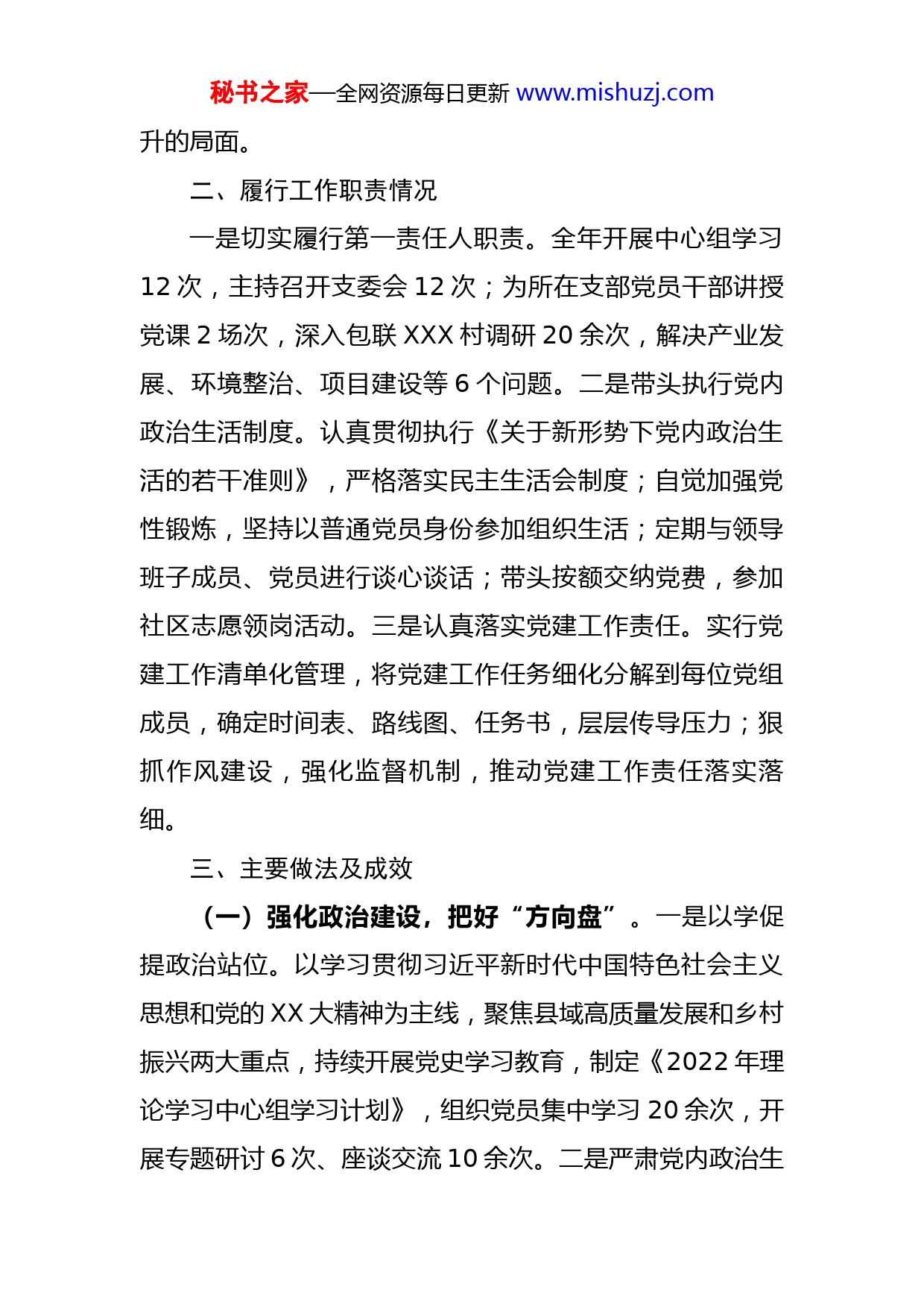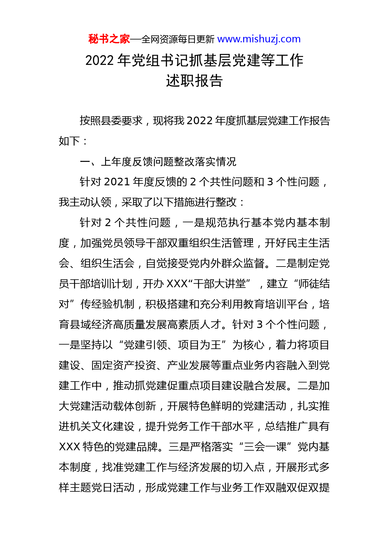 秘书之家—全网资源每日更新www.mishuzj.com2022年党组书记抓基层党建等工作述职报告按照县委要求,现将我2022年度抓基层党建工作报告如下:一、上年度反馈问题整改落实情况针对2021年度反馈的2个共性问题和3个性问题,我主动认领,采取了以下措施进行整改:针对2个共性问题,一是规范执行基本党内基本制度,加强党员领导干部双重组织生活管理,开好民主生活会、组织生活会,自觉接受党内外群众监督。二是制定党员干部培训计划,开办XXX“干部大讲堂”,建立“师徒结对”传经验机制,积极搭建和充分利用教育培训平台,培育县域经济高质量发展高素质人才。针对3个个性问题,一是坚持以“党建引领、项目为王”为核心,着力将项目建设、固定资产投资、产业发展等重点业务内容融入到党建工作中,推动抓党建促重点项目建设融合发展。二是加大党建活动载体创新,开展特色鲜明的党建活动,扎实推进机关文化建设,提升党务工作干部水平,总结推广具有XXX特色的党建品牌。三是严格落实“三会一课”党内基本制度,找准党建工作与经济发展的切入点,开展形式多样主题党日活动,形成党建工作与业务工作双融双促双提秘书之家—全网资源每日更新www.mishuzj.com升的局面。二、履行工作职责情况一是切实履行第一责任人职责。全年开展中心组学习12次,主持召开支委会12次;为所在支部党员干部讲授党课2场次,深入包联XXX村调研20余次,解决产业发展、环境整治、项目建设等6个问题。二是带头执行党内政治生活制度。认真贯彻执行《关于新形势下党内政治生活的若干准则》,严格落实民主生活会制度;自觉加强党性锻炼,坚持以普通党员身份参加组织生活;定期与领导班子成员、党员进行谈心谈话;带头按额交纳党费,参加社区志愿领岗活动。三是认真落实党建工作责任。实行党建工作清单化管理,将党建工作任务细化分解到每位党组成员,确定时间表、路线图、任务书,层层传导压力;狠抓作风建设,强化监督机制,推动党建工作责任落实落细。三、主要做法及成效(一)强化政治建设,把好“方向盘”。一是以学促提政治站位。以学习贯彻习近平新时代中国特色社会主义思想和党的XX大精神为主线,聚焦县域高质量发展和乡村振兴两大重点,持续开展党史学习教育,制定《2022年理论学习中心组学习计划》,组织党员集中学习20余次,开展专题研讨6次、座谈交流10余次。二是严肃党内政治生秘书之家—全网资源每日更新www.mishuzj.com活。严格落实“三会一课”、民主生活会、组织生活会、谈心谈话、民主评议党员等基本制度,坚持民主集中制,执行“三重一大”议事工作制度,坚持机关支部党员每月积分自评,召开民主生活会1次,开展谈心谈话22人次。三是深化理想信念教育。积极开展“植绿护绿、党员先行”义务植树、“缅怀革命先烈、传承红色文化”主题教育、“重温入党誓词”等主题党日活动,利用新媒体开展网络支部活动20余次,举办“微宣讲”活动2场,通过LED宣传屏播放标语50余条,发表宣传稿件270余篇。四是强化纪律作风建设。绷紧党员干部纪律之弦,落实领导干部述职述廉、个人事项报告制度,对标作风建设“六大整治”认真开展自查整改,建立干部廉政档案22份,观看警示教育片4次,对干部考勤、请销假、值班值守工作经常提醒、时刻检查、定期通报。(二)强化履职尽责,细耕“责任田”。一是扛牢党建主体责任。坚持把党建工作放在首要位置,认真履行“第一责任人”职责,督促班子成员落实“一岗双责”,做到重大任务亲自安排,关键环节积极协调,工作落实跟踪督导,签订党建责任书9份,召开党建工作会议12次,组织专项检查4次。二是管好班子带好队伍。建立领导干部岗位监督台,推行干部绩效管理,建立股室工作职责牌和干部在岗公示牌,修订完善并严格执行机关日常管理9秘书之家—全网资源每日更新www.mishuzj.com项制度,公开晾晒领导干部工作实绩12期,新任调整中层干部3名。三是系统强化教育培训。始终坚持党组“第一议题”学习制度,开展党组书记讲党课活动2次,撰写学习心得体会4篇,邀请专家学者开展讲座3次,精心举办“干部大讲堂”5期,开展导师护航计划27人,全面完成干部网络培训。四是抓实抓细责任落实。强化运用“第一种形态”,实行干部“红黄绿”三色卡管理,发出绿色提醒卡5人次,发放重点工作一线直督单、整改提醒函70份。持续提升“四优一减”优化营商环境改革措施,有序推进26个市县民生实事项目,解决了群众一批“急难愁盼”问题。(三)强化党建引领,吹响“冲锋号”。一是抓好统筹谋划。以党建为第一要务,把党建工作与业务工作同谋划、同部署、同推进、同考核,增强学习教育和实践锻炼的自觉性和主动性,软件上注重学习提升,硬件上做到氛围浓厚。二是扎实开展“共驻共建”。党员干部主动到北街社区领岗,积极开展平安建设、疫情防控、志愿服务等工作。特别是在卡点管控、防控物资保障和市场保供等方面,最大程度保障经济社会运行秩序和人民群众安全健康。三是狠抓党建深度融合。扎实做好模范机关创建工作,深入开展“善行义举榜”精神文明教育。聚焦“党建+项目建设、党建+产业发展、党建+乡村振兴、党建+秘书之家—全网资源每日更新www.mishuzj.com招才引智”等工作,推进党务业务互促互进,实现县域经济高质量