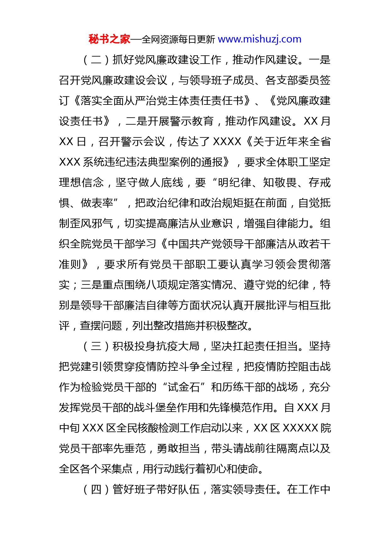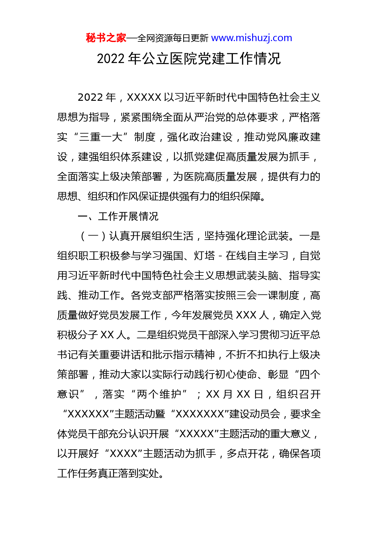 秘书之家—全网资源每日更新www.mishuzj.com2022年公立医院党建工作情况2022年,XXXXX以习近平新时代中国特色社会主义思想为指导,紧紧围绕全面从严治党的总体要求,严格落实“三重一大”制度,强化政治建设,推动党风廉政建设,建强组织体系建设,以抓党建促高质量发展为抓手,全面落实上级决策部署,为医院高质量发展,提供有力的思想、组织和作风保证提供强有力的组织保障。一、工作开展情况(一)认真开展组织生活,坚持强化理论武装。一是组织职工积极参与学习强国、灯塔-在线自主学习,自觉用习近平新时代中国特色社会主义思想武装头脑、指导实践、推动工作。各党支部严格落实按照三会一课制度,高质量做好党员发展工作,今年发展党员XXX人,确定入党积极分子XX人。二是组织党员干部深入学习贯彻习近平总书记有关重要讲话和批示指示精神,不折不扣执行上级决策部署,推动大家以实际行动践行初心使命、彰显“四个意识”,落实“两个维护”;XX月XX日,组织召开“XXXXXX”主题活动暨“XXXXXXX”建设动员会,要求全体党员干部充分认识开展“XXXXX”主题活动的重大意义,以开展好“XXXX”主题活动为抓手,多点开花,确保各项工作任务真正落到实处。秘书之家—全网资源每日更新www.mishuzj.com(二)抓好党风廉政建设工作,推动作风建设。一是召开党风廉政建设会议,与领导班子成员、各支部委员签订《落实全面从严治党主体责任责任书》、《党风廉政建设责任书》,二是开展警示教育,推动作风建设。XX月XX日,召开警示会议,传达了XXXX《关于近年来全省XXX系统违纪违法典型案例的通报》,要求全体职工坚定理想信念,坚守做人底线,要“明纪律、知敬畏、存戒惧、做表率”,把政治纪律和政治规矩挺在前面,自觉抵制歪风邪气,切实提高廉洁从业意识,增强自律能力。组织全院党员干部学习《中国共产党领导干部廉洁从政若干准则》,要求所有党员干部职工要认真学习领会贯彻落实;三是重点围绕八项规定落实情况、遵守党的纪律,特别是领导干部廉洁自律等方面状况认真开展批评与相互批评,查摆问题,列出整改措施并积极整改。(三)积极投身抗疫大局,坚决扛起责任担当。坚持把党建引领贯穿疫情防控斗争全过程,把疫情防控阻击战作为检验党员干部的“试金石”和历练干部的战场,充分发挥党员干部的战斗堡垒作用和先锋模范作用。自XXX月中旬XXX区全民核酸检测工作启动以来,XX区XXXXX院党员干部率先垂范,勇敢担当,带头请战前往隔离点以及全区各个采集点,用行动践行着初心和使命。(四)管好班子带好队伍,落实领导责任。在工作中秘书之家—全网资源每日更新www.mishuzj.com坚持党要管党、从严治党的原则,做到履行主体责任“不甩手”,严格落实“一岗双责”。班子成员对各自分管工作加强监督指导,将党建工作纳入重要议事日程,纳入领导班子和领导干部目标管理,与中心工作、业务工作一同部署、一同落实、一同检查、一同考核,使党建工作真正做到与各个部门、各个科室相结合,推动形成领导带头、上下联动的生动局面。二、亮点工作一是注重党建工作与实际工作的有效结合,根据各支部党员工作岗位实际,抓实活动实践,压实学习教育成效。以党员为主导,经常性到社区、学校开展健康知识宣传、大型义诊等志愿服务活动。二是医院高度重视“第一书记”派驻工作,将其作为密切联系群众,为广大人民群众谋福祉的大事来抓。XXX年XXX日,带队到XXX村,走访慰问困难群众,为他们送去面粉、花生油等慰问品,并给村集体送去XX万元帮扶款。三是注重公益,丰富载体,不断提升医院整体形象,XX月XX日,联合XXX社区举办“XXXXX”庆“八一”双拥文艺联欢“消夏”晚会暨XXXX社区健康义诊及宣教活动。四是抓实活动实践,充分发挥党员领导干部模范先锋带头作用。在开展创建全国文明城市活动中,组织党员干部带头到XXXXX进行志愿服务活动,并根据社区实际向其捐赠了环保垃圾桶。疫情期秘书之家—全网资源每日更新www.mishuzj.com间,在医院党委的号召下,全体党员干部迅速行动,主动进位,纷纷带头请战投身到抗击疫情的第一线,有力扛起疫情防控的“硬核”担当,充分发挥战斗堡垒作用,在这场没有硝烟的“战争”中展现出党员干部良好的职业素养和的精神风貌。三、存在问题:(一)党支部作用发挥不充分。基层党组织是是落实党的路线方针政策和各项任务的战斗堡垒。就医院党组织设置的现实状况来看,各党支部的支部书记和支委多是兼职。这很多临床业务科室的主任或业务骨干担当了各党支部书记、委员职务,往往忙于日常大量繁重的医务工作,抓党建工作的时间和精力都有限,给医院支部党建功能的发挥带来一定的难度。(二)党建工作方法缺乏创新。受场地、经费、人员等因素影响,开展特色亮点创新型党组织生活的频次不高,效果不突出,党员活动阵地建设还不规范,以党建促发展的思路不多,解放思想的程度还需进一步加大。四、下一步工作思路和主要措施(一)健全党建工作与业务工作有机结合机制。首先,牢固树立“围绕业务抓党建,抓好党建促业务”的思想。党的思想政治工作渗透到医疗业务实践中去,通过发挥党组织的战斗堡垒作用和党员的先锋模范作用,为业务秘书之家—全网资源每日更新www.mishuzj.com工作提供可靠保证。其次,在行动上抓住党建工作与