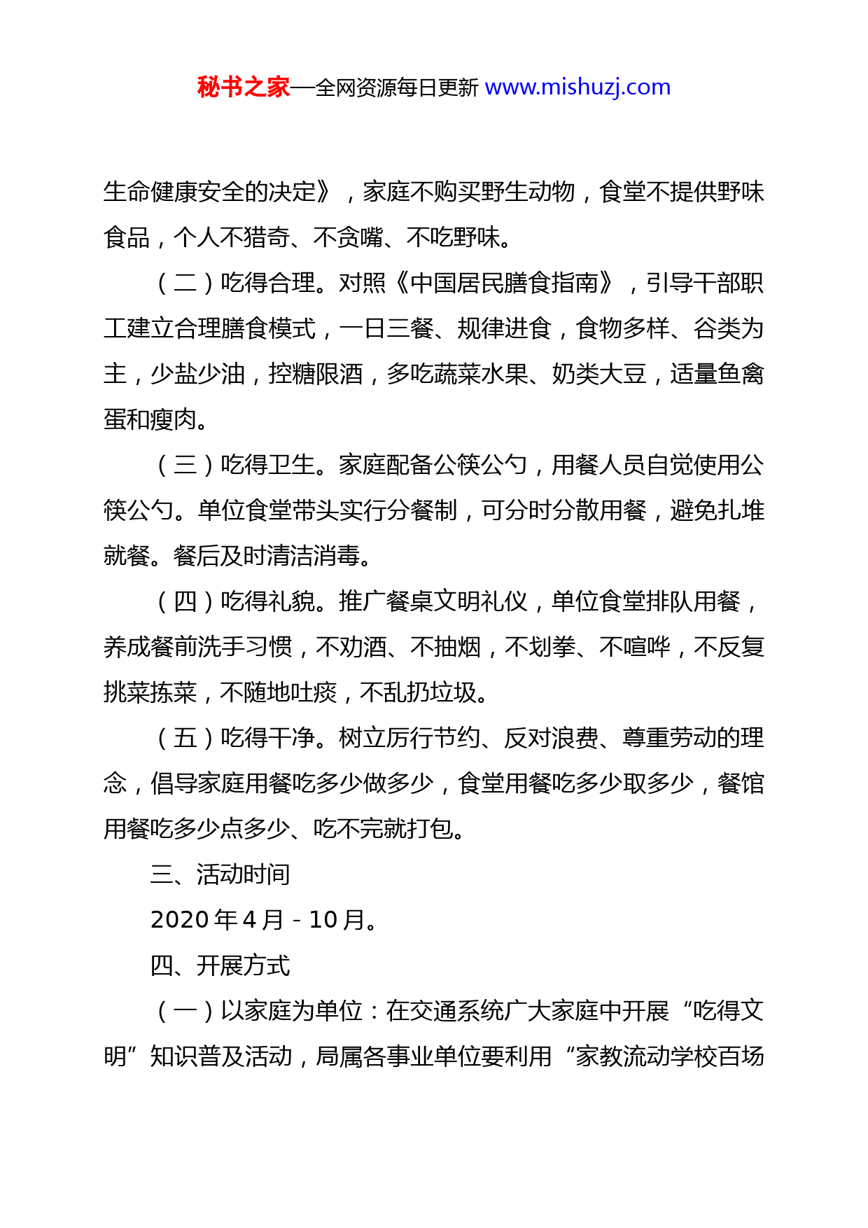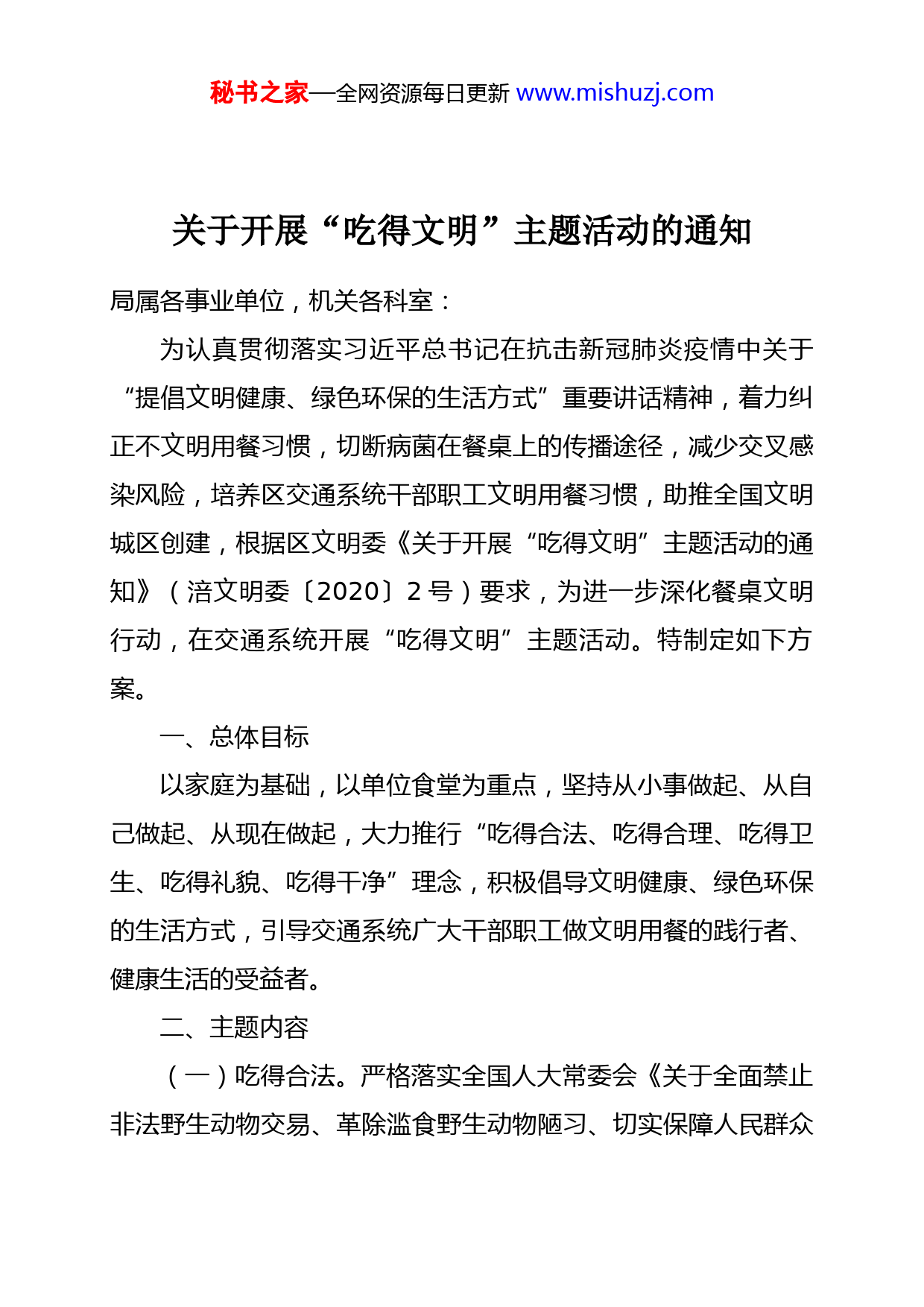 秘书之家—全网资源每日更新www.mishuzj.com关于开展“吃得文明”主题活动的通知局属各事业单位,机关各科室:为认真贯彻落实习近平总书记在抗击新冠肺炎疫情中关于“提倡文明健康、绿色环保的生活方式”重要讲话精神,着力纠正不文明用餐习惯,切断病菌在餐桌上的传播途径,减少交叉感染风险,培养区交通系统干部职工文明用餐习惯,助推全国文明城区创建,根据区文明委《关于开展“吃得文明”主题活动的通知》(涪文明委〔2020〕2号)要求,为进一步深化餐桌文明行动,在交通系统开展“吃得文明”主题活动。特制定如下方案。一、总体目标以家庭为基础,以单位食堂为重点,坚持从小事做起、从自己做起、从现在做起,大力推行“吃得合法、吃得合理、吃得卫生、吃得礼貌、吃得干净”理念,积极倡导文明健康、绿色环保的生活方式,引导交通系统广大干部职工做文明用餐的践行者、健康生活的受益者。二、主题内容(一)吃得合法。严格落实全国人大常委会《关于全面禁止非法野生动物交易、革除滥食野生动物陋习、切实保障人民群众秘书之家—全网资源每日更新www.mishuzj.com生命健康安全的决定》,家庭不购买野生动物,食堂不提供野味食品,个人不猎奇、不贪嘴、不吃野味。(二)吃得合理。对照《中国居民膳食指南》,引导干部职工建立合理膳食模式,一日三餐、规律进食,食物多样、谷类为主,少盐少油,控糖限酒,多吃蔬菜水果、奶类大豆,适量鱼禽蛋和瘦肉。(三)吃得卫生。家庭配备公筷公勺,用餐人员自觉使用公筷公勺。单位食堂带头实行分餐制,可分时分散用餐,避免扎堆就餐。餐后及时清洁消毒。(四)吃得礼貌。推广餐桌文明礼仪,单位食堂排队用餐,养成餐前洗手习惯,不劝酒、不抽烟,不划拳、不喧哗,不反复挑菜拣菜,不随地吐痰,不乱扔垃圾。(五)吃得干净。树立厉行节约、反对浪费、尊重劳动的理念,倡导家庭用餐吃多少做多少,食堂用餐吃多少取多少,餐馆用餐吃多少点多少、吃不完就打包。三、活动时间2020年4月-10月。四、开展方式(一)以家庭为单位:在交通系统广大家庭中开展“吃得文明”知识普及活动,局属各事业单位要利用“家教流动学校百场秘书之家—全网资源每日更新www.mishuzj.com讲座进万家”活动,邀请专家开展“吃得文明”知识讲座,开展线上“吃得文明”知识竞赛“健康餐打卡”等活动,积极引导广大家庭成员知晓、了解“吃得文明”行动;交通系统干部职工积极发动周边家庭参与文明用餐实践活动,倡导使用公勺公筷、不购买野生动物、合理饮食、餐前洗手、尊重劳动不浪费等理念,引导家庭成员养成良好的文明用餐习惯。(二)以机关食堂为单位:开展文明餐桌活动,在交通系统各企事业单位的食堂,普及推广使用公筷公勺,实行错时分餐制,推广合理膳食,落实“光盘行动”抵制餐桌浪费。通过实地考察、择优推荐、部门评审等方式,每季度推选1家“文明用餐”创建示范食堂,通过单位推荐、职工投票、实地考核、综合评审等方式,年底从创建示范食堂中评选2家“文明用餐”示范食堂。五、工作要求(一)加强组织领导。文明用餐习惯,不仅是文明素质的具体体现,更关乎干部职工身体健康和生命安全。局属各事业单位要高度重视,充分认识开展“吃得文明”主题活动的重要意义,要结合当前正在进行的新冠肺炎疫情防控阻击战和全国文明城区创建工作,落实措施,确保活动有序推动。(二)强化责任落实。局属各事业单位要采取宣传引导、检秘书之家—全网资源每日更新www.mishuzj.com查督导等措施,加大对职工食堂的管理,引导职工文明节俭用餐。各单位单位食堂要履行社会责任,将文明用餐作为核心竞争力,主动提供、宣传倡导、推广使用文明用餐好做法。(三)营造浓厚氛围。局属各事业单位要开设宣传专栏,设计宣传海报,广泛普及文明用餐常识,持续开展宣传报道,营造良好的社会氛围,推动活动深入人心、收到实效。