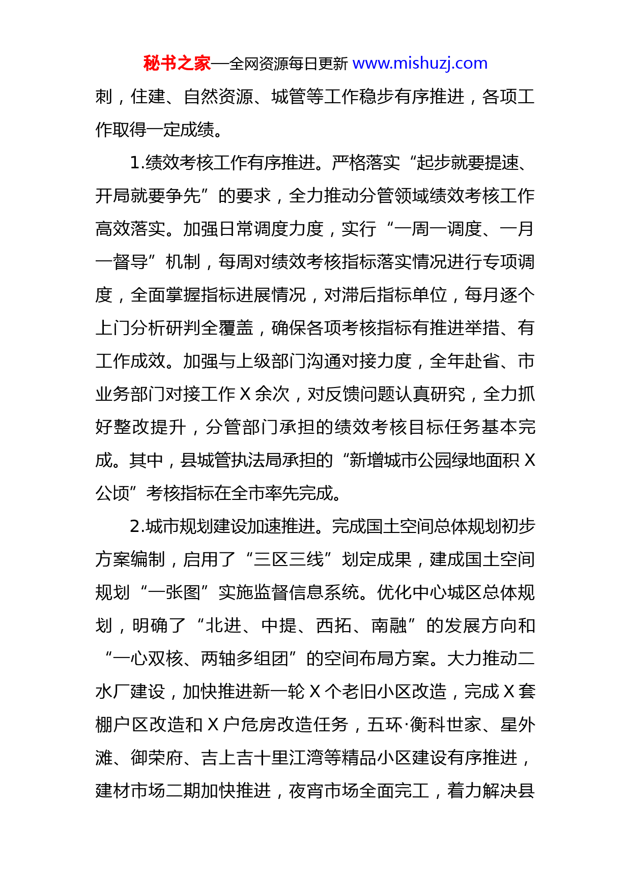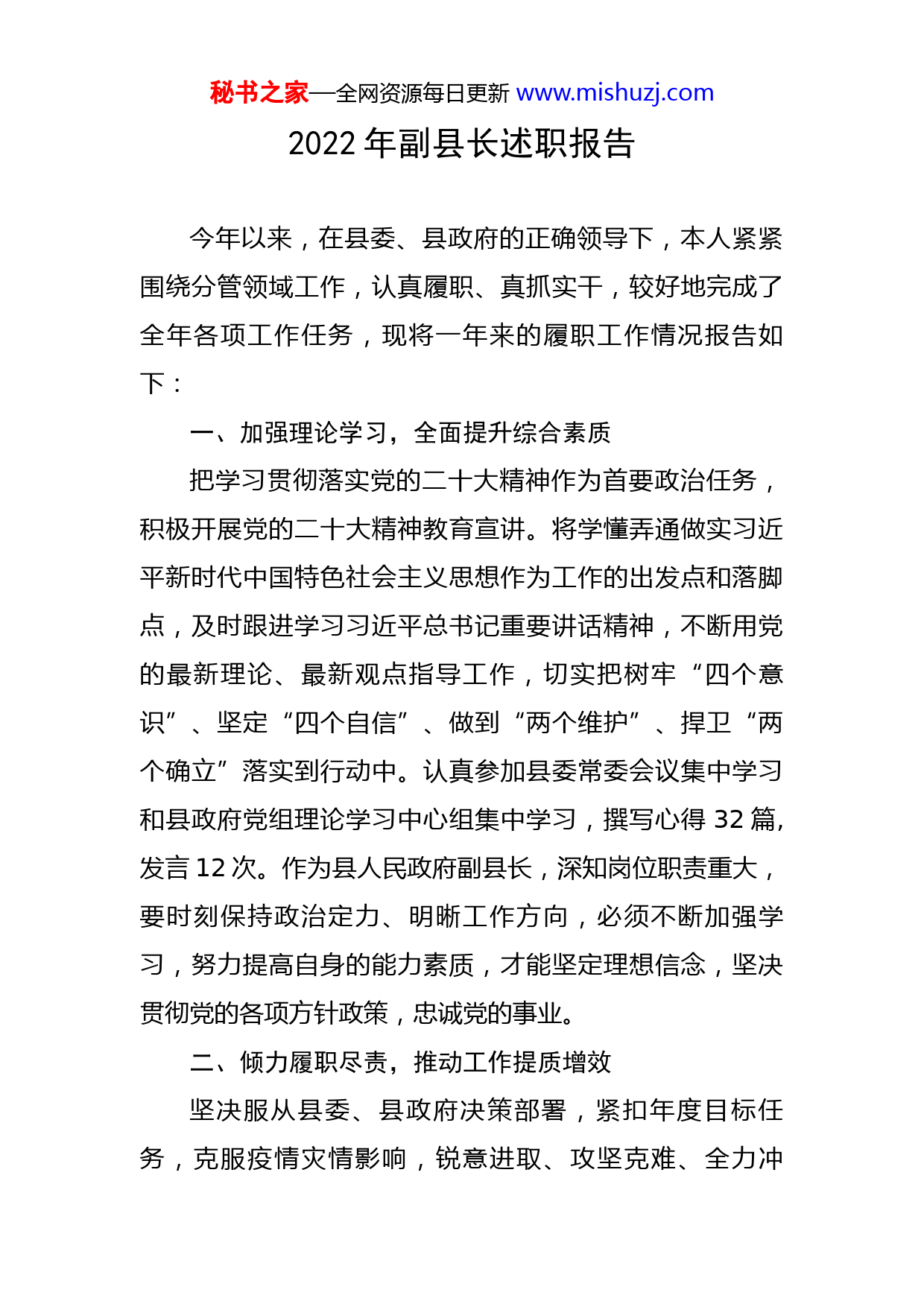 秘书之家—全网资源每日更新www.mishuzj.com2022年副县长述职报告今年以来,在县委、县政府的正确领导下,本人紧紧围绕分管领域工作,认真履职、真抓实干,较好地完成了全年各项工作任务,现将一年来的履职工作情况报告如下:一、加强理论学习,全面提升综合素质把学习贯彻落实党的二十大精神作为首要政治任务,积极开展党的二十大精神教育宣讲。将学懂弄通做实习近平新时代中国特色社会主义思想作为工作的出发点和落脚点,及时跟进学习习近平总书记重要讲话精神,不断用党的最新理论、最新观点指导工作,切实把树牢“四个意识”、坚定“四个自信”、做到“两个维护”、捍卫“两个确立”落实到行动中。认真参加县委常委会议集中学习和县政府党组理论学习中心组集中学习,撰写心得32篇,发言12次。作为县人民政府副县长,深知岗位职责重大,要时刻保持政治定力、明晰工作方向,必须不断加强学习,努力提高自身的能力素质,才能坚定理想信念,坚决贯彻党的各项方针政策,忠诚党的事业。二、倾力履职尽责,推动工作提质增效坚决服从县委、县政府决策部署,紧扣年度目标任务,克服疫情灾情影响,锐意进取、攻坚克难、全力冲秘书之家—全网资源每日更新www.mishuzj.com刺,住建、自然资源、城管等工作稳步有序推进,各项工作取得一定成绩。1.绩效考核工作有序推进。严格落实“起步就要提速、开局就要争先”的要求,全力推动分管领域绩效考核工作高效落实。加强日常调度力度,实行“一周一调度、一月一督导”机制,每周对绩效考核指标落实情况进行专项调度,全面掌握指标进展情况,对滞后指标单位,每月逐个上门分析研判全覆盖,确保各项考核指标有推进举措、有工作成效。加强与上级部门沟通对接力度,全年赴省、市业务部门对接工作X余次,对反馈问题认真研究,全力抓好整改提升,分管部门承担的绩效考核目标任务基本完成。其中,县城管执法局承担的“新增城市公园绿地面积X公顷”考核指标在全市率先完成。2.城市规划建设加速推进。完成国土空间总体规划初步方案编制,启用了“三区三线”划定成果,建成国土空间规划“一张图”实施监督信息系统。优化中心城区总体规划,明确了“北进、中提、西拓、南融”的发展方向和“一心双核、两轴多组团”的空间布局方案。大力推动二水厂建设,加快推进新一轮X个老旧小区改造,完成X套棚户区改造和X户危房改造任务,五环·衡科世家、星外滩、御荣府、吉上吉十里江湾等精品小区建设有序推进,建材市场二期加快推进,夜宵市场全面完工,着力解决县秘书之家—全网资源每日更新www.mishuzj.com城停车难问题,建成生态停车场X个、新增停车位X个,城市更宜居更美好。3.城市运营管理更加规范。以省级文明城市、省级卫生城市创建为抓手,扎实开展市容环境卫生“百日攻坚”行动,整治背街小巷X条,清理卫生死角X余处、垃圾X余吨、小广告X余处,修复人行道板X平方米;扎实推进垃圾分类工作,新增垃圾分类收集设施X座,完成城乡垃圾分类转运一体化建设和垃圾填埋场技术改造工程;规范市场经营秩序,推进“门前三包”责任制落实,整治跨门摆摊X多起、占道经营X余次,行政处罚X余人次;整顿城市道路秩序,处罚违规停放各类机动车辆X余台次。城区市容环境和经营秩序不断改善,以全市第X的优异成绩顺利通过省级文明城市复审。4.两违清理整治有力有效。对城乡违法建设行为始终保持高压态势,为坚决遏制违法违规建设增量,彻底消除城乡历史存量违建,组织相关部门,结合本县实际,制定了《XX县城乡存量违法用地和违法建设处置工作方案》,有序推进控增量和消存量的工作。截至目前,城区共拆除违法建筑X平方米。全县控违治违案件立案X起,结案X宗,收缴罚没款及税费X万元。对全县在册剩余历史违建存量的违建户下达《接受调查通知》,城区382起违法建筑已处理X宗,剩余存量X户,已有X户主动申请处置。秘书之家—全网资源每日更新www.mishuzj.com乡镇违建存量X起,主动申请处理X户,已启动调查、测绘程序,进入办案和审批结案阶段。5.自然资源保障持续提升。强化要素保障,完成《XX县2022年度第1批次土地征收成片开发方案》《XX市XX县产业开发区XX工业园2022年度成片开发方案》的报批审批工作,完成X宗用地项目(XX公顷)农用地转用、土地征收审批;出让土地X宗,共计收入约X亿元;划拨土地X宗,面积X公顷。狠抓耕地保护,全面落实“田长制”工作,完成四级田长制度建设,设置县、乡(镇)、村、网格四级田长1500名。完成耕地保护国土空间专项规划和耕地保护一张图的编制工作,带位置落实耕地、永久基本农田、耕地后备资源。全面完成XX亩恢复耕地任务和新一轮X万亩永久基本农田划定工作。有序推进绿色矿山建设,封堵废弃矿洞X个,对矿产资源违法行为下达责令停止违法行为通知书X份,依法取缔X处非法采矿点、制止X起非法开采矿产资源行为。6.切实筑牢安全生产屏障。督导分管部门加强对重点行业、重点领域安全监管,确保分管领域安全生产形势持续稳定。压茬推进自建房安全专项整治,全县共排查经营性自建房XX栋,非经营性自建房XX栋。经营性自建房全部完成房屋安全鉴定,存在违法违规建设隐患X栋、地质灾害X栋、结构安全隐患X栋、消防安全隐患X栋、经营安秘书之家—全网资源每日更新www.mishuzj.co