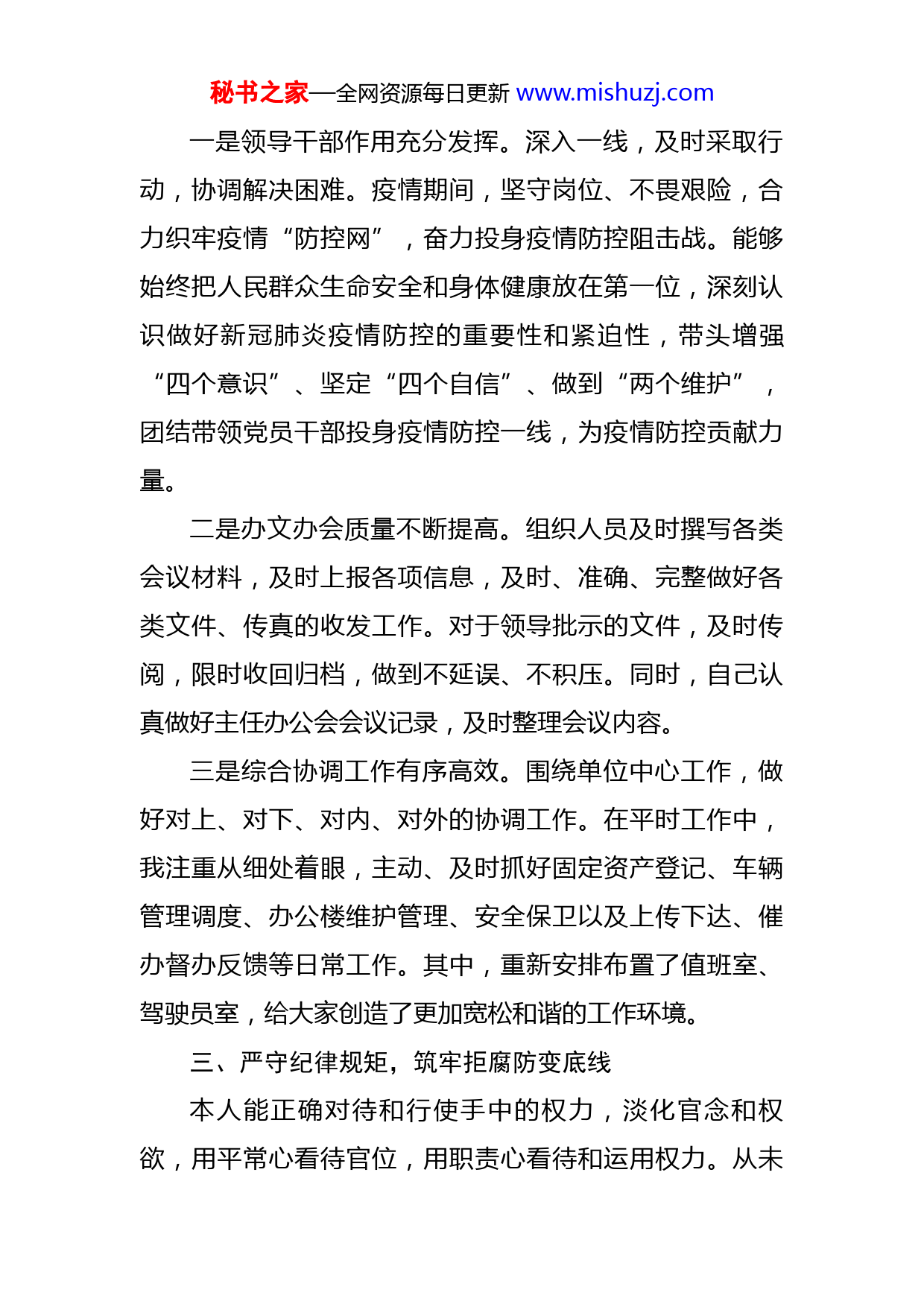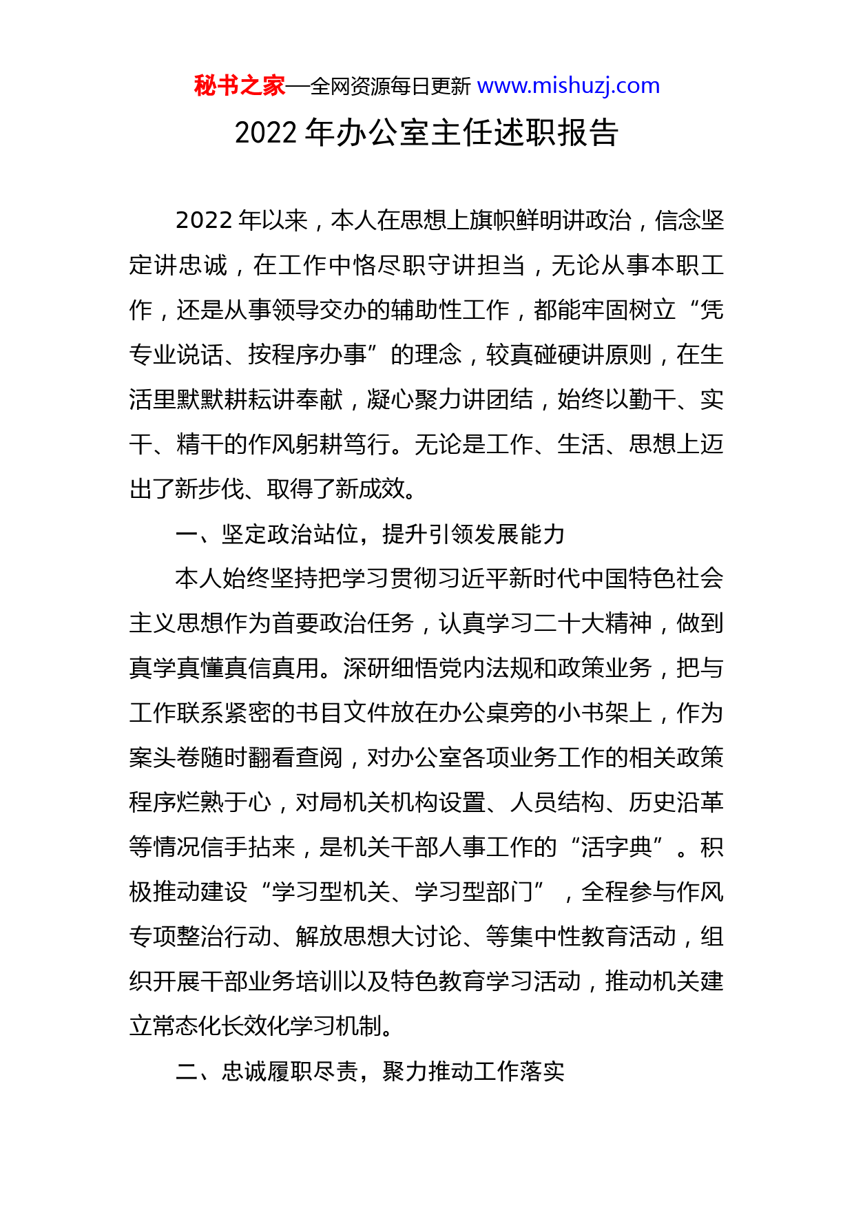 秘书之家—全网资源每日更新www.mishuzj.com2022年办公室主任述职报告2022年以来,本人在思想上旗帜鲜明讲政治,信念坚定讲忠诚,在工作中恪尽职守讲担当,无论从事本职工作,还是从事领导交办的辅助性工作,都能牢固树立“凭专业说话、按程序办事”的理念,较真碰硬讲原则,在生活里默默耕耘讲奉献,凝心聚力讲团结,始终以勤干、实干、精干的作风躬耕笃行。无论是工作、生活、思想上迈出了新步伐、取得了新成效。一、坚定政治站位,提升引领发展能力本人始终坚持把学习贯彻习近平新时代中国特色社会主义思想作为首要政治任务,认真学习二十大精神,做到真学真懂真信真用。深研细悟党内法规和政策业务,把与工作联系紧密的书目文件放在办公桌旁的小书架上,作为案头卷随时翻看查阅,对办公室各项业务工作的相关政策程序烂熟于心,对局机关机构设置、人员结构、历史沿革等情况信手拈来,是机关干部人事工作的“活字典”。积极推动建设“学习型机关、学习型部门”,全程参与作风专项整治行动、解放思想大讨论、等集中性教育活动,组织开展干部业务培训以及特色教育学习活动,推动机关建立常态化长效化学习机制。二、忠诚履职尽责,聚力推动工作落实秘书之家—全网资源每日更新www.mishuzj.com一是领导干部作用充分发挥。深入一线,及时采取行动,协调解决困难。疫情期间,坚守岗位、不畏艰险,合力织牢疫情“防控网”,奋力投身疫情防控阻击战。能够始终把人民群众生命安全和身体健康放在第一位,深刻认识做好新冠肺炎疫情防控的重要性和紧迫性,带头增强“四个意识”、坚定“四个自信”、做到“两个维护”,团结带领党员干部投身疫情防控一线,为疫情防控贡献力量。二是办文办会质量不断提高。组织人员及时撰写各类会议材料,及时上报各项信息,及时、准确、完整做好各类文件、传真的收发工作。对于领导批示的文件,及时传阅,限时收回归档,做到不延误、不积压。同时,自己认真做好主任办公会会议记录,及时整理会议内容。三是综合协调工作有序高效。围绕单位中心工作,做好对上、对下、对内、对外的协调工作。在平时工作中,我注重从细处着眼,主动、及时抓好固定资产登记、车辆管理调度、办公楼维护管理、安全保卫以及上传下达、催办督办反馈等日常工作。其中,重新安排布置了值班室、驾驶员室,给大家创造了更加宽松和谐的工作环境。三、严守纪律规矩,筑牢拒腐防变底线本人能正确对待和行使手中的权力,淡化官念和权欲,用平常心看待官位,用职责心看待和运用权力。从未秘书之家—全网资源每日更新www.mishuzj.com谋取规定以外的特殊利益,不放纵自己的欲望,不贪吃喝、不贪钱财、不贪享乐、不贪图名利地位,堂堂正正地做人,明明白白地工作。坚持大事不糊涂、小事不马虎,自觉增强守一意识,不越雷池一步,在防微杜渐上下功夫,追求党性和道德修养的高境界。在廉洁自律上,做到表里如一,任何时候、任何状况下,都自觉以党性原则和道德规范衡量、约束自己,没有人前一套、人后一套。四、存在的不足在工作中,我也逐渐认识到自己的不足,主要有以下几点:一是理论学习不积极。由于平时忙于业务工作,政治学习的时间较少,以后要加强政治理论的学习,提高政治理论素质。二是工作条理性不足。因为日常工作杂,临时性工作多,往往容易出现手忙脚乱、顾此失彼的问题。在以后的工作中,我要逐步合理安排各项工作时间,有条不紊完成各项工作。三是工作质量不够高。由于自身性格比较急躁,平时工作一味追求效率,有时难免出现这样那样的小纰漏。在今后的工作中要努力克服性格上的不足,办事在求快的同时,更要求稳,不断提高工作质量。五、下一步工作计划秘书之家—全网资源每日更新www.mishuzj.com下一步,通过着重抓好以下“四点”,实现以点带面,寻求自我突破。一是找准切入点。无论做什么事情,都要找准切入点。切入点找到了,找准了,工作不仅主动,还能起到纲举目张、全局皆活的作用。初步打算,准备以月度总结为切入点,以信息的形式将工作任务完成情况进行月度分解,以达到督查督办的目的。二是把握着力点。着力点,顾名思义就是致力于完成某项任务或工作时重点着手之处。重点围绕会务组织、文字综合、文件办理等“着力点”开展工作,分门别类完成好分内工作,不断提高工作效率。三是开拓创新点。创新,某种意义上可以说就是“人无我有,人有我优;人无我有,人有我新。”办公室工作,任务繁杂,头绪众多,要想实现创新,难度较大,但是,有难度并不代表没出路,如果对自己的分内工作加以梳理,无论是会务组织,还是文电处理,都能找到创新点。四是激活兴奋点。常言道“兴趣是最好的老师”。无论是谁,工作时间长了,必然都会产生职业的倦怠感,遭遇发展的瓶颈。这个时候,如何在平时的工作中,有效激活自己的工作兴奋点,对于提高工作效率具有十分重要的作用,努力让自己始终保持“激情澎湃”的工作状态。