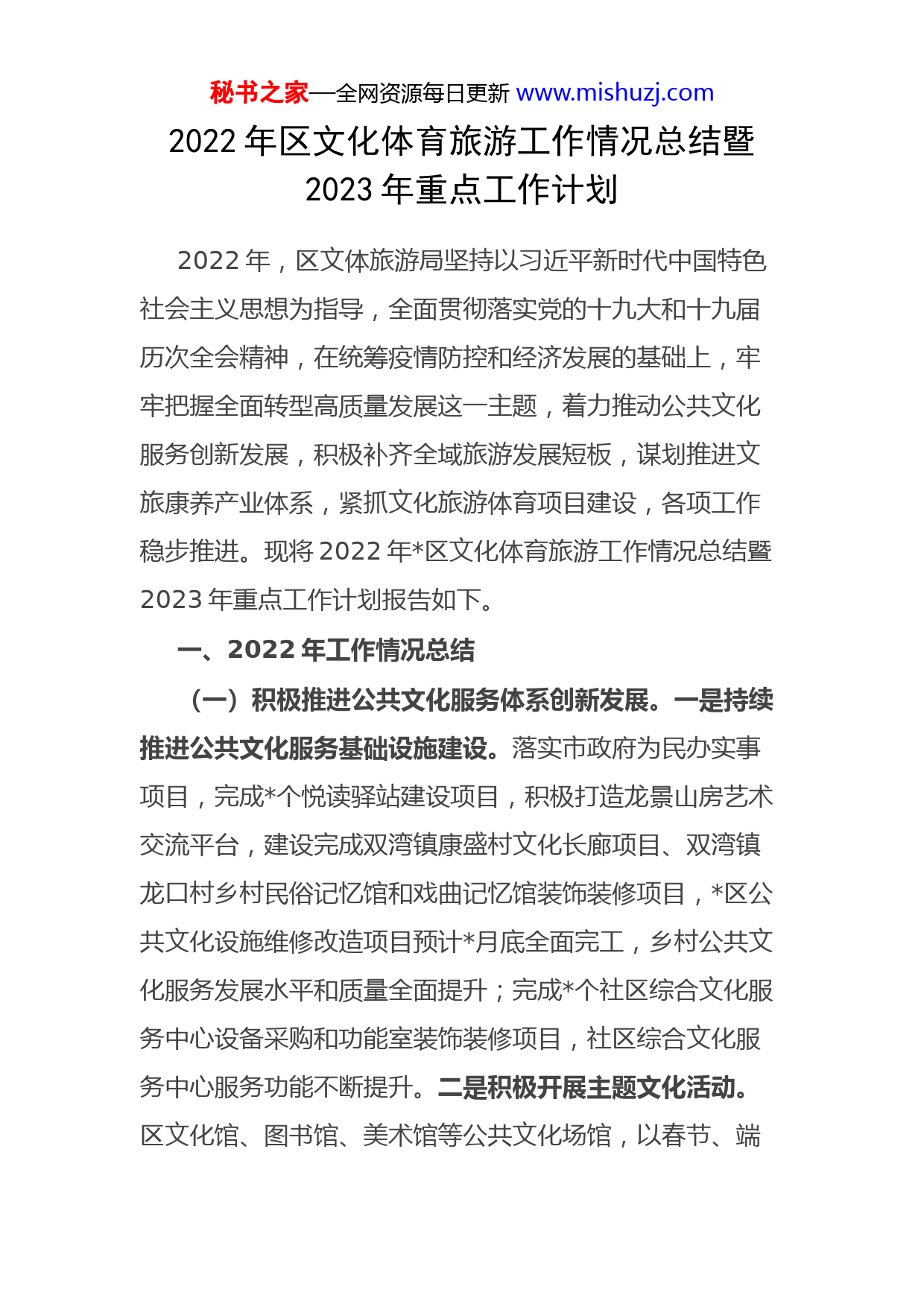 秘书之家—全网资源每日更新www.mishuzj.com2022年区文化体育旅游工作情况总结暨2023年重点工作计划2022年,区文体旅游局坚持以习近平新时代中国特色社会主义思想为指导,全面贯彻落实党的十九大和十九届历次全会精神,在统筹疫情防控和经济发展的基础上,牢牢把握全面转型高质量发展这一主题,着力推动公共文化服务创新发展,积极补齐全域旅游发展短板,谋划推进文旅康养产业体系,紧抓文化旅游体育项目建设,各项工作稳步推进。现将2022年区文化体育旅游工作情况总结暨2023年重点工作计划报告如下。一、2022年工作情况总结(一)积极推进公共文化服务体系创新发展。一是持续推进公共文化服务基础设施建设。落实市政府为民办实事项目,完成个悦读驿站建设项目,积极打造龙景山房艺术交流平台,建设完成双湾镇康盛村文化长廊项目、双湾镇龙口村乡村民俗记忆馆和戏曲记忆馆装饰装修项目,区公共文化设施维修改造项目预计月底全面完工,乡村公共文化服务发展水平和质量全面提升;完成个社区综合文化服务中心设备采购和功能室装饰装修项目,社区综合文化服务中心服务功能不断提升。二是积极开展主题文化活动。区文化馆、图书馆、美术馆等公共文化场馆,以春节、端秘书之家—全网资源每日更新www.mishuzj.com午、中秋、五一、十一等重要节点为契机,积极开展“我们的节日”“喜迎党的二十大”等形式多样内容丰富的主题文化活动。区文化馆成功举办公益培训班期,举办学习“花文化知识、感知花文化魅力”研学主题活动,接待学生人,端午节期间组织开展了“粽香端午·漫游花博”亲子体验活动,个家庭参与其中。区图书馆组织开展“·世界读书日”红色经典诵读比赛、“喜迎二十大文明实践浓情中秋”亲子读书会活动、“喜迎二十大·创客机器人公益课堂”等线下阅读推广活动次,服务读者余人。区博物馆开展流动展览“四进”活动场次,普及人数人;在春节、元宵、端午、中秋等重要节点,举办主题社教活动场次,共计人参与;开展“聆听古迹之声回望千年珍藏”青少年研学活动场,共计人参与。区美术馆以节庆日为契机,大力弘扬民族优秀传统文化,积极开展送书画进基层活动,共送出书画作品余幅,开设少儿春季、暑期、秋季书画培训班,完成书画培训次,参加培训余人次。开设职工书法提高班,完成培训次,参加培训余人次。区开拓者纪念馆开展“爱国主义教育进课堂”活动场次,流动展览“六进”活动场次,工业研学活动场次,开展“寅虎迎冬奥非遗共传承”迎新春剪纸社教活动、“笔墨凝书香春联进万家”迎新春送春联活动、“情系端午共忆党史”端午节主题活动、“我们的节日·中秋节”传承好家风文艺晚秘书之家—全网资源每日更新www.mishuzj.com会等专题文化活动场次,举办临夏康乐博物馆“牛”文物展览、永昌博物馆“唐卡刺绣”展览、福州林则徐纪念馆林则徐家风展、“科学家精神”展览等临时展览场次。三是积极探索线上文化服务。为丰富广大人民群众疫情期间对文化产品的需求,各场馆积极探索服务方式,拓展线上公共文化服务。2022年春节期间,区文化馆组织开展区迎新春线上文艺晚会和“村晚”示范展示活动场次,推送各类文艺作品个,线上累计观读量余人;拍摄录制选送个优秀节目参加“银行杯”省2022年网络春晚线上演出;拍摄完成《领航》MV并入选省委宣传部优秀作品展播,同时策划组织了“喜迎二十大·为冬奥加油”金昌市新时代文明实践《领航》传唱活动。区图书馆积极开展“喜迎二十大·区第二届少儿名著短剧大赛”、“情满中秋·共赏明月”中秋知识线上有奖答题活动”、“庆中秋·观经典·关爱特殊群体”观看无障碍电影、“清廉阅读让廉洁文化“走新”又“走心”等线上阅读推广活动次,服务读者人。区博物馆积极利用已有的文博数字资源,通过公众号、“今日”客户端等平台推出“线上看展”“文物微课堂”等活动,实现市民不出户,云游博物馆。区镍都开拓者纪念馆开通微信公众号,开辟“图说金昌”“党史课堂”“浮雕中的古往今来”等专栏,多角度展现金昌精神。四是不断加强文化遗产保护。圆满完成八冶农场沙井墓群抢秘书之家—全网资源每日更新www.mishuzj.com救性发掘,清理墓葬座,出土青铜耳饰、牌饰、铜削、铜针等文物件,公布区境内具有保护价值的处一般文物点名录,为域内处文物点更改文物标志碑信息,更新围栏,安装界桩、文物标志碑、安全责任公示牌,对明长城黑水墩、下四分、黄毛沟墩、高四墩等座烽火台遗址及省级文物保护单位大庙城遗址分别编制了项目计划书,积极争取专项资金,办理文保项目审批手续件,文物保护取得积极成效。(二)稳步推进全域旅游优化发展。一是积极谋划特色项目建设。编制完成《金昌市区全域旅游发展规划》《火星基地文旅综合体概念性规划》和《泉沟旅游景区概念性规划》作为招商引资项目储备;制定《区文旅康养产业链发展实施方案》《区文化旅游康养产业重点投资项目清单》《区文化旅游康养产业链企业名录库》,积极谋划金昌市区泉沟旅游景区开发、镍都水世界---文旅康养强基础补短板等项目,申报金昌百鸟园科普旅游项目、双湾镇特色乡村民俗文化体验园建设项目等个项目和个专业合作社,以各项规划为引领,精准发力,推动区