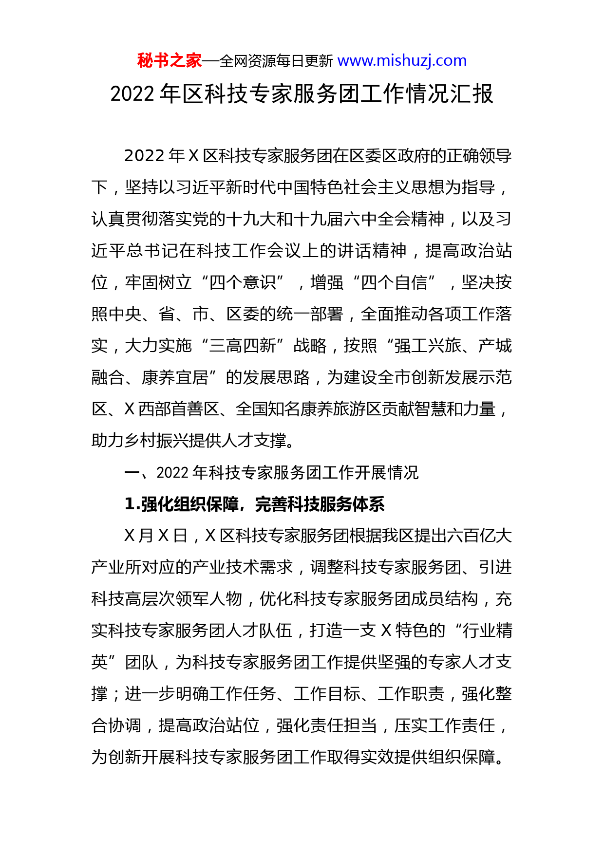 秘书之家—全网资源每日更新www.mishuzj.com2022年区科技专家服务团工作情况汇报2022年X区科技专家服务团在区委区政府的正确领导下,坚持以习近平新时代中国特色社会主义思想为指导,认真贯彻落实党的十九大和十九届六中全会精神,以及习近平总书记在科技工作会议上的讲话精神,提高政治站位,牢固树立“四个意识”,增强“四个自信”,坚决按照中央、省、市、区委的统一部署,全面推动各项工作落实,大力实施“三高四新”战略,按照“强工兴旅、产城融合、康养宜居”的发展思路,为建设全市创新发展示范区、X西部首善区、全国知名康养旅游区贡献智慧和力量,助力乡村振兴提供人才支撑。一、2022年科技专家服务团工作开展情况1.强化组织保障,完善科技服务体系X月X日,X区科技专家服务团根据我区提出六百亿大产业所对应的产业技术需求,调整科技专家服务团、引进科技高层次领军人物,优化科技专家服务团成员结构,充实科技专家服务团人才队伍,打造一支X特色的“行业精英”团队,为科技专家服务团工作提供坚强的专家人才支撑;进一步明确工作任务、工作目标、工作职责,强化整合协调,提高政治站位,强化责任担当,压实工作责任,为创新开展科技专家服务团工作取得实效提供组织保障。秘书之家—全网资源每日更新www.mishuzj.com目前我区科技专家服务团成员发展到X人,向X个乡村振兴驻点村选派X名科技特派员助力乡村振兴工作。同时选派工业科技特派员,增添企业发展动力,通过对企业的技术需求和市场需求进行了摸排,积极与X沟通,充分挖掘区内人才,向X个工业企业派驻了X名工业科技特派员,帮助工业企业提高自主创新力,将理论结合到实践中,加速科研成果转化,提高企业核心竞争力。2022年X区科技专家服务团可谓人才济济,助力乡村振兴开好局,更好地做好科技工作。2.开展科技下乡活动,助力乡村振兴今年以来,开展了X次科技下乡活动,共发放各类科技知识宣传册一万余本,服务群众万余人,为群众、百姓解答各类疑难问题X余次。3.邀请专家现场指导,促进产学研合作一是X月X日,邀请X到X进行指导。二是X月X日,邀请X等一行人对X进行指导。并在X职业技术学院就X千亩农旅产业项目召开科技专家座谈茶话会。三是X月X日邀请X来X指导循环农业和中药材药食同源,并召开座谈会。四是邀请中X来X指导中蜂产业及“林药蜂旅”产业发展模式。4.当好“店小二”,帮助企业申报项目根据省科技厅、省财政厅《关于组织开展2022年度科秘书之家—全网资源每日更新www.mishuzj.com技特派员服务乡村振兴项目申报的通知》,结合我区实际,帮助X申报2022年度省级科技特派员项目。5.组织科技活动周,提高农民科学素质2022年X月X日—X月X日,区科技专家服务团组织了2022年X区科技专家服务团科技活动周活动,围绕乡村振兴、林下经济、循环农业、科技知识宣传普及等热点问题,组织开展一批专题科技服务、技术指导活动,进一步提高公众科学意识、科技技术能力和科技知识,为深入实施“三高四新”战略、着力打造具有核心竞争力的科技创新高地,营造良好的创新氛围。二、2022年科技专家服务团下半年工作打算1.开展技能培训,提升科技含量以实现农业增效、农民增收、农村稳定、社会发展为总体目标,以农村青壮年劳动力、科技型企业技术骨干、合作社负责人、种植养殖大户为主体培训对象;以培训农民提高农民的法律意识、政策水平、道德水平、文化素质、科技技术知识和发展创新驱动水平能力为重点,授课到组、指导到户、培训到人。一是着力开展特色蔬菜种植技术培训。以X等企业为依托,培养发展以西红柿、水果玉米、食用菌等蔬菜为主的高端特色蔬菜种植所需农村实用技术技能人才。二是着力开展特色养殖技术培训。以兴隆养殖、振鑫牧业、富顺源养殖、建果养殖、康源养殖为基秘书之家—全网资源每日更新www.mishuzj.com地,大力开展鸡及特色生猪、肉牛、肉兔等生态养殖技术培训。三是围绕农业产业就业培训。结合科技示范基地、农业企业、农民专业合作社自主用工和岗位需求,开展畜禽养殖、蔬菜种植、中药材种植等实用技术培训。四是开展科技下乡服务活动。利用“科技三下乡”、农忙季节、乡村赶集日等主题宣传活动,集中科技专家服务团力量,在乡镇街道大讲堂、村组活动室、企业生产车间、田间地头等地开展科技下乡服务活动,传播科技知识。2.加大科技成果转化与培育力度针对现有企业创新力不够和缺乏科技平台的现状,科技专家服务团计划加大科技成果引进和转化的力度,下一步将成立X农业大学成果转化X分中心,加速科研成果与区内企业的对接落地。并定期与X等举办茶话会、座谈会的形式进行成果推介和孵化,力争培育新的高科技企业,让X企业插上科技的翅膀,振翅飞翔,提升对重大科技的研发攻关能力。3.发展特色产业,助力乡村振兴以乡村振兴,产业兴旺为目标,坚持“项目立区、产业兴区、科技强区、创新活区”的工作思路,以“X特农”为引领,围绕X等特色支柱产业为重点,积极向国家、省、市争取科技项目资金;着力培育壮大地方优势品牌,重点培育发展农业高新技术企业,提高特色支柱产业产品秘书之家—全网资源每日更新www.mishuzj.com科技含量;着力开展多业融合的科技发展模式,优化特色产业结构,培育新的经济增长点。4.打