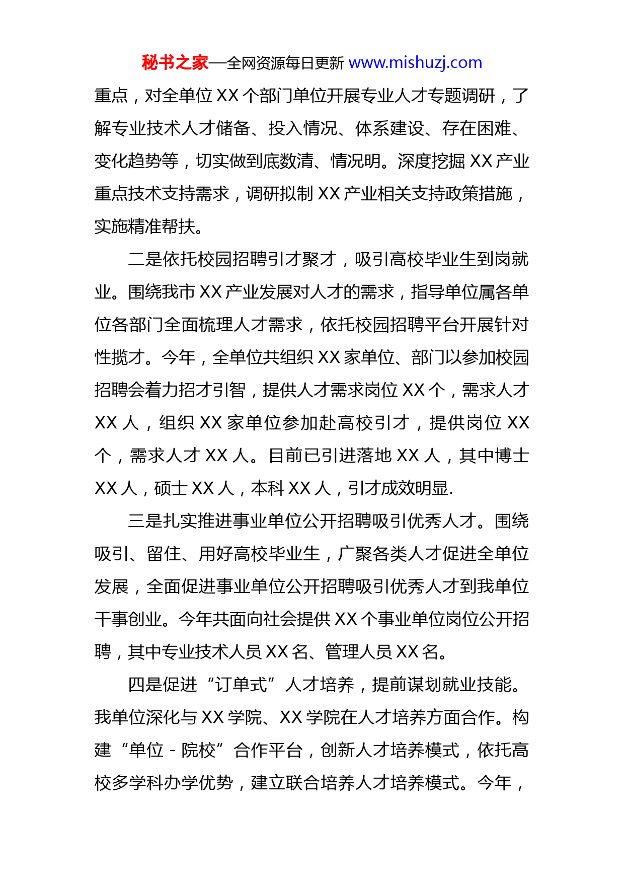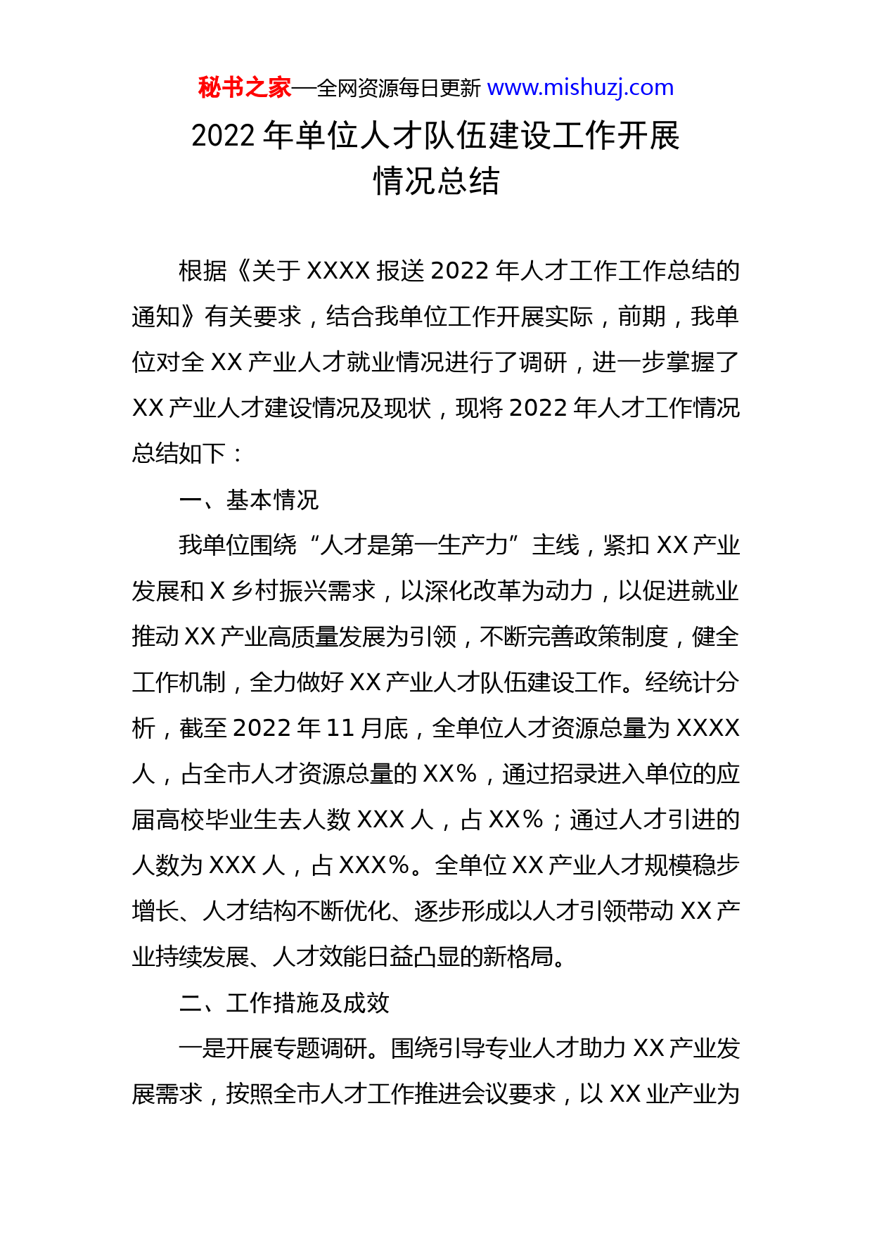 秘书之家—全网资源每日更新www.mishuzj.com2022年单位人才队伍建设工作开展情况总结根据《关于XXXX报送2022年人才工作工作总结的通知》有关要求,结合我单位工作开展实际,前期,我单位对全XX产业人才就业情况进行了调研,进一步掌握了XX产业人才建设情况及现状,现将2022年人才工作情况总结如下:一、基本情况我单位围绕“人才是第一生产力”主线,紧扣XX产业发展和X乡村振兴需求,以深化改革为动力,以促进就业推动XX产业高质量发展为引领,不断完善政策制度,健全工作机制,全力做好XX产业人才队伍建设工作。经统计分析,截至2022年11月底,全单位人才资源总量为XXXX人,占全市人才资源总量的XX%,通过招录进入单位的应届高校毕业生去人数XXX人,占XX%;通过人才引进的人数为XXX人,占XXX%。全单位XX产业人才规模稳步增长、人才结构不断优化、逐步形成以人才引领带动XX产业持续发展、人才效能日益凸显的新格局。二、工作措施及成效一是开展专题调研。围绕引导专业人才助力XX产业发展需求,按照全市人才工作推进会议要求,以XX业产业为秘书之家—全网资源每日更新www.mishuzj.com重点,对全单位XX个部门单位开展专业人才专题调研,了解专业技术人才储备、投入情况、体系建设、存在困难、变化趋势等,切实做到底数清、情况明。深度挖掘XX产业重点技术支持需求,调研拟制XX产业相关支持政策措施,实施精准帮扶。二是依托校园招聘引才聚才,吸引高校毕业生到岗就业。围绕我市XX产业发展对人才的需求,指导单位属各单位各部门全面梳理人才需求,依托校园招聘平台开展针对性揽才。今年,全单位共组织XX家单位、部门以参加校园招聘会着力招才引智,提供人才需求岗位XX个,需求人才XX人,组织XX家单位参加赴高校引才,提供岗位XX个,需求人才XX人。目前已引进落地XX人,其中博士XX人,硕士XX人,本科XX人,引才成效明显.三是扎实推进事业单位公开招聘吸引优秀人才。围绕吸引、留住、用好高校毕业生,广聚各类人才促进全单位发展,全面促进事业单位公开招聘吸引优秀人才到我单位干事创业。今年共面向社会提供XX个事业单位岗位公开招聘,其中专业技术人员XX名、管理人员XX名。四是促进“订单式”人才培养,提前谋划就业技能。我单位深化与XX学院、XX学院在人才培养方面合作。构建“单位-院校”合作平台,创新人才培养模式,依托高校多学科办学优势,建立联合培养人才培养模式。今年,秘书之家—全网资源每日更新www.mishuzj.com共组织XX学单位XX名毕业实习生到我单位实习,由我单位相关专业老师指导,增强学生理论和实践结合的能力,今后我单位将进一步加强与学院合作,推动协同创新,满足乡村振兴需求的高素质应用型人才。五是全力抓实技术技能人才培养。围绕加强全市XX产业职业技术技能提升培训,研究制定《XXX职业技能培训方案》,积极指导各地围绕重点产业、重点领域及相关企业大力开展技术技能人才提升培训行动,开展“订单式”人才培养,加快青年技术技能人才的培育培养,提升企业职工技术技能水平,为企业持续发展提供高质量的人才支撑。今年以来,共组织开展技术技能人才、经营管理人才等各类培训XX期,累计培训XXX人次。三、存在问题及原因分析一是产业发展高层次人才总量小、引进难。我单位在XX产业中,等传统优势产业占比较大,人才分布主要集中在生产一线,管理和技术层面高层次人才相应短缺。人才总体规模不强,行业竞争力有待提升,干事创业的平台空间不大,导致在人才引进上存在一定难度,特别是从事高水平科研和管理专业人才不足,领军人才匮乏。二是人才观念淡薄、意识不强。部分人才观念比较淡薄、人才认识存在误区,对本部门、本领域的重点人才集聚方向研究分析不够,引才路径不清晰、目标不明确,缺秘书之家—全网资源每日更新www.mishuzj.com乏工作主观能动性,人才发展环境有待进一步优化。四、下一步工作打算下一步我们将认真贯彻落实党中央、国务单位出台的重要政策文件及我省出台配套政策文件,聚焦发展产业,坚持“大人才”工作格局,着力优化完善体制机制,创新人才工作思路,着力构建人才服务机制、搭建服务平台,不断提升人才服务质量,努力营造人才发展良好环境,为推进XX人才队伍高质量发展做好人才支撑。
