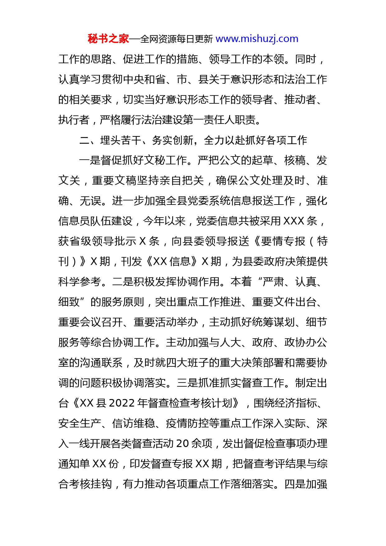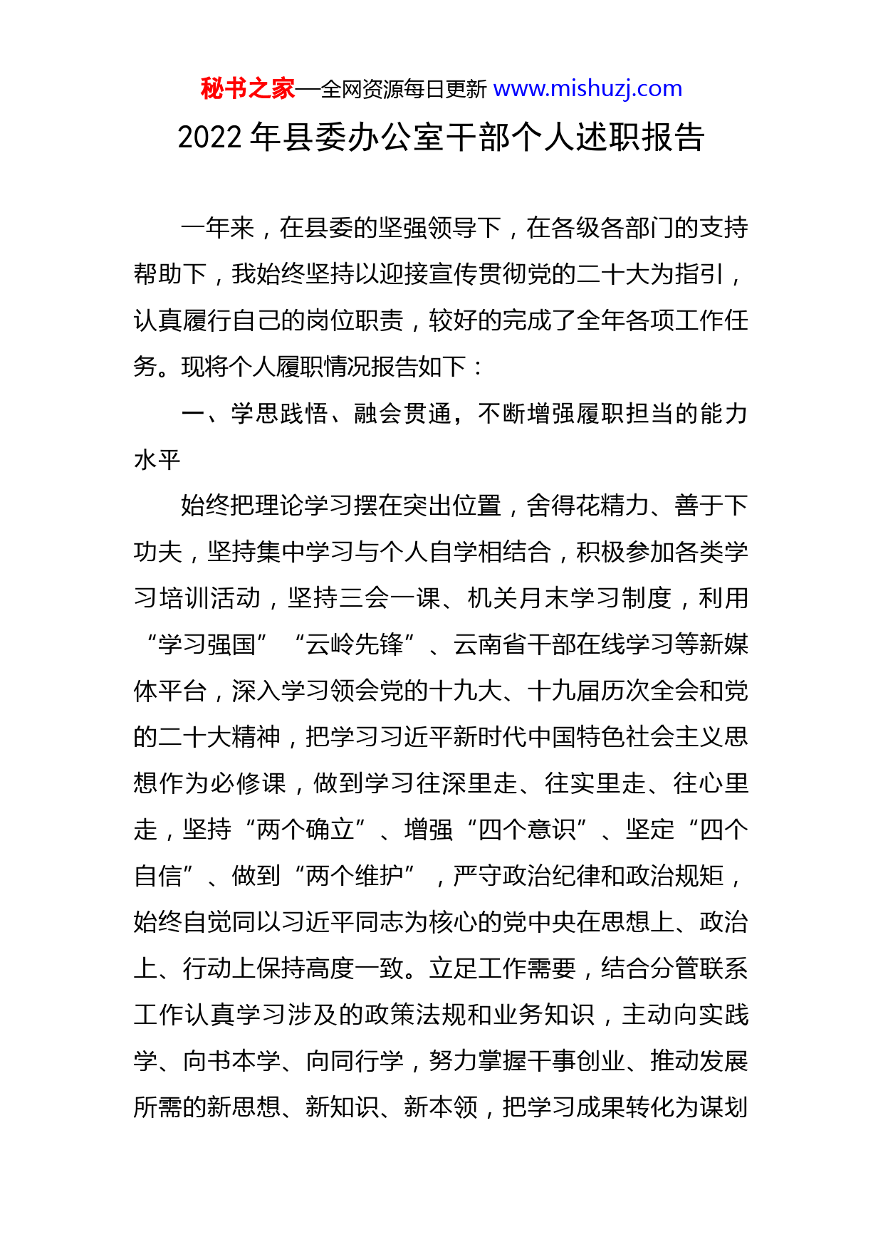 秘书之家—全网资源每日更新www.mishuzj.com2022年县委办公室干部个人述职报告一年来,在县委的坚强领导下,在各级各部门的支持帮助下,我始终坚持以迎接宣传贯彻党的二十大为指引,认真履行自己的岗位职责,较好的完成了全年各项工作任务。现将个人履职情况报告如下:一、学思践悟、融会贯通,不断增强履职担当的能力水平始终把理论学习摆在突出位置,舍得花精力、善于下功夫,坚持集中学习与个人自学相结合,积极参加各类学习培训活动,坚持三会一课、机关月末学习制度,利用“学习强国”“云岭先锋”、云南省干部在线学习等新媒体平台,深入学习领会党的十九大、十九届历次全会和党的二十大精神,把学习习近平新时代中国特色社会主义思想作为必修课,做到学习往深里走、往实里走、往心里走,坚持“两个确立”、增强“四个意识”、坚定“四个自信”、做到“两个维护”,严守政治纪律和政治规矩,始终自觉同以习近平同志为核心的党中央在思想上、政治上、行动上保持高度一致。立足工作需要,结合分管联系工作认真学习涉及的政策法规和业务知识,主动向实践学、向书本学、向同行学,努力掌握干事创业、推动发展所需的新思想、新知识、新本领,把学习成果转化为谋划秘书之家—全网资源每日更新www.mishuzj.com工作的思路、促进工作的措施、领导工作的本领。同时,认真学习贯彻中央和省、市、县关于意识形态和法治工作的相关要求,切实当好意识形态工作的领导者、推动者、执行者,严格履行法治建设第一责任人职责。二、埋头苦干、务实创新,全力以赴抓好各项工作一是督促抓好文秘工作。严把公文的起草、核稿、发文关,重要文稿坚持亲自把关,确保公文处理及时、准确、无误。进一步加强全县党委系统信息报送工作,强化信息员队伍建设,今年以来,党委信息共被采用XXX条,获省级领导批示X条,向县委领导报送《要情专报(特刊)》X期,刊发《XX信息》X期,为县委政府决策提供科学参考。二是积极发挥协调作用。本着“严肃、认真、细致”的服务原则,突出重点工作推进、重要文件出台、重要会议召开、重要活动举办,主动抓好统筹谋划、细节服务等综合协调工作。主动加强与人大、政府、政协办公室的沟通联系,及时就四大班子的重大决策部署和需要协调的问题积极协调落实。三是抓准抓实督查工作。制定出台《XX县2022年督查检查考核计划》,围绕经济指标、安全生产、信访维稳、疫情防控等重点工作深入实际、深入一线开展各类督查活动20余项,发出督促检查事项办理通知单XX份,印发督查专报XX期,把督查考评结果与综合考核挂钩,有力推动各项重点工作落细落实。四是加强秘书之家—全网资源每日更新www.mishuzj.com机关日常管理。进一步修改完善《中共XX县委办公室内部管理制度》,对上加强联系、对内加强管理、对外搞好协调、对下搞好服务,严格落实中央八项规定精神,确保后勤接待勤俭节约,公务用车使用规范。五是全面提升会务质量。进一步增强办会的预见性、计划性,周密细致地做好“会前、会中、会后”各个环节的衔接和服务工作,办会质量明显提高,今年以来,筹备服务中央和省市领导赴XX调研XX余次,县级领导调研类活动X余次,得到了领导的充分肯定和部门的高度认可。六是精准组织调查研究。聚焦牵动全局的关键点、领导的关注点、社会矛盾的突出点和群众意见的集中点,全面、深入、多角度地开展调查研究,为县委提出具有较强针对性、前瞻性和可操作性的意见建议。2022年,共开展调查研究X次,撰写调研报告、理论文章XX余篇。三、严于律己、勤政廉洁,严格执行党风廉政各项规定严格遵守廉洁从政各项规定要求,筑牢防线,守住底线,不越红线,永葆清正廉洁的政治本色。一是认真履行“一岗双责”。深入贯彻全面从严治党要求,全力推进“清廉机关”建设,定期专题研究党风廉政建设工作,把全面从严治党与县委办业务工作同部署、同落实、同检查、同考核。定期了解分管联系部门、包保乡镇(街道)秘书之家—全网资源每日更新www.mishuzj.com党风廉政建设工作开展情况,督促下级“一把手”履行全面从严治党责任、做到清正廉洁。二是带头做到廉洁自律。认真学习并严格遵守党规党纪、法纪政纪、党纪条规,时刻严格要求自己,正确对待个人名利、得失和进退,自觉遵守各项纪律和规章制度,坚持从日常小事做起,规范生活行为,勤俭节约,规范公务接待。三是积极主动接受监督。严格执行重大问题、重要工作请示报告和外出报备制度,如实报告个人事项,带头遵守廉政承诺,自觉接受全县各级党组织、党员和干部群众的监督,严格管理好自己的亲属和身边工作人员,树立了清正廉洁的良好形象。回顾一年来的工作,我始终勤勤恳恳履职尽责,一心一意狠抓落实,取得了一定成绩,但我深知,与组织的要求和人民群众的期望相比,还存在许多差距和不足。在今后的工作和生活中,我将始终坚持以习近平新时代中国特色社会主义思想为指引,认真学习领会、深入贯彻落实党的二十大精神,以更高的标准、更严的要求、更实的作风,扎扎实实做好各项工作,努力为XX经济社会高质量跨越式发展贡献最大力量。