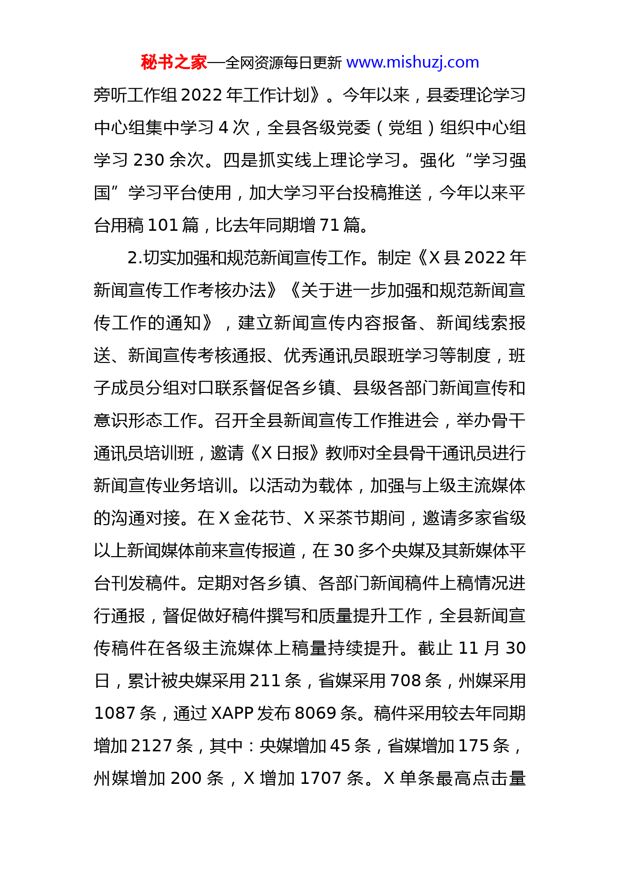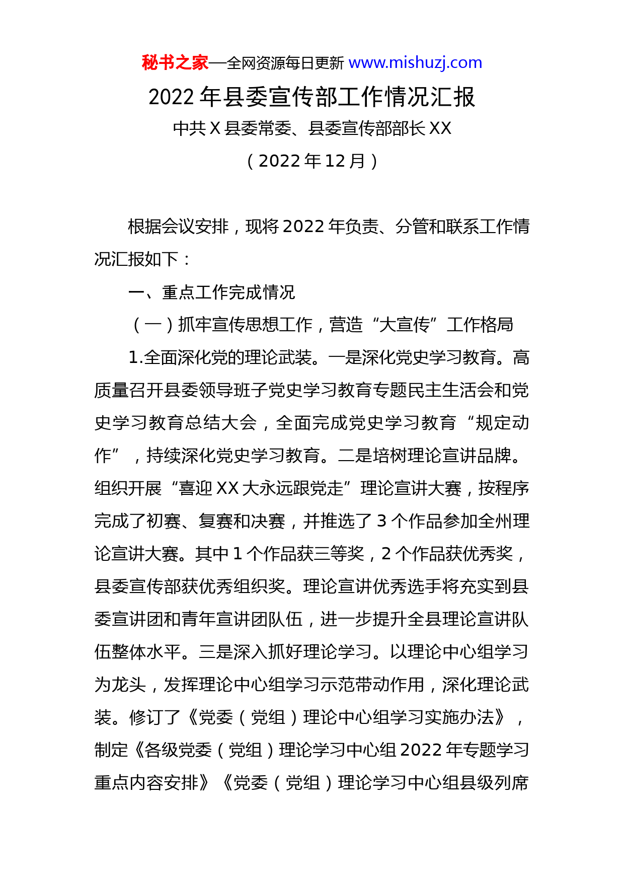 秘书之家—全网资源每日更新www.mishuzj.com2022年县委宣传部工作情况汇报中共X县委常委、县委宣传部部长XX(2022年12月)根据会议安排,现将2022年负责、分管和联系工作情况汇报如下:一、重点工作完成情况(一)抓牢宣传思想工作,营造“大宣传”工作格局1.全面深化党的理论武装。一是深化党史学习教育。高质量召开县委领导班子党史学习教育专题民主生活会和党史学习教育总结大会,全面完成党史学习教育“规定动作”,持续深化党史学习教育。二是培树理论宣讲品牌。组织开展“喜迎XX大永远跟党走”理论宣讲大赛,按程序完成了初赛、复赛和决赛,并推选了3个作品参加全州理论宣讲大赛。其中1个作品获三等奖,2个作品获优秀奖,县委宣传部获优秀组织奖。理论宣讲优秀选手将充实到县委宣讲团和青年宣讲团队伍,进一步提升全县理论宣讲队伍整体水平。三是深入抓好理论学习。以理论中心组学习为龙头,发挥理论中心组学习示范带动作用,深化理论武装。修订了《党委(党组)理论中心组学习实施办法》,制定《各级党委(党组)理论学习中心组2022年专题学习重点内容安排》《党委(党组)理论学习中心组县级列席秘书之家—全网资源每日更新www.mishuzj.com旁听工作组2022年工作计划》。今年以来,县委理论学习中心组集中学习4次,全县各级党委(党组)组织中心组学习230余次。四是抓实线上理论学习。强化“学习强国”学习平台使用,加大学习平台投稿推送,今年以来平台用稿101篇,比去年同期增71篇。2.切实加强和规范新闻宣传工作。制定《X县2022年新闻宣传工作考核办法》《关于进一步加强和规范新闻宣传工作的通知》,建立新闻宣传内容报备、新闻线索报送、新闻宣传考核通报、优秀通讯员跟班学习等制度,班子成员分组对口联系督促各乡镇、县级各部门新闻宣传和意识形态工作。召开全县新闻宣传工作推进会,举办骨干通讯员培训班,邀请《X日报》教师对全县骨干通讯员进行新闻宣传业务培训。以活动为载体,加强与上级主流媒体的沟通对接。在X金花节、X采茶节期间,邀请多家省级以上新闻媒体前来宣传报道,在30多个央媒及其新媒体平台刊发稿件。定期对各乡镇、各部门新闻稿件上稿情况进行通报,督促做好稿件撰写和质量提升工作,全县新闻宣传稿件在各级主流媒体上稿量持续提升。截止11月30日,累计被央媒采用211条,省媒采用708条,州媒采用1087条,通过XAPP发布8069条。稿件采用较去年同期增加2127条,其中:央媒增加45条,省媒增加175条,州媒增加200条,X增加1707条。X单条最高点击量秘书之家—全网资源每日更新www.mishuzj.com31.9万次。3.深入开展群众性精神文明建设。一是围绕文明城市、文明村镇、文明单位、文明家庭、文明校园“五大创建”活动,深入开展社会主义核心价值观进机关、进学校等“十进”活动,印发了《X县贯彻落实《X省精神文明建设“十四五”发展规划》实施方案(试行)》《X县精神文明建设工作制度》《X县各级文明单位创建管理实施细则(试行)》等制度文件,为持续深入开展群众性精神文明建设提供保障。二是围绕“凝聚群众、引导群众,以文化人、成风化俗”目标,在县实践中心的统筹下,各实践所、站结合全县重点工作和群众反映事项每月开展活动均在2次以上,今年1至11月全县公示实践活动项目938项。截至目前,共成立221支志愿者队伍,注册志愿者人数2.69万人,累计组织开展各类新时代文明实践活动4679场次,参加志愿者12.7万人次,累计服务时长67.8万小时。全县党员干部带头,群众广泛参与常态化开展疫情防控、人居环境整治、文明城市创建、河道清理、无偿献血等文明实践志愿服务活动。新时代文明实践活动实现群众在哪里文明实践就延伸到哪里,志愿服务活动实现常态化长效化开展。参加全州首届新时代文明实践志愿服务项目大赛,我县“X科学桥”获项目金奖,“中华五千年,首诊看中医”获优秀项目奖,县委宣传部获优秀组织奖。三是巩固秘书之家—全网资源每日更新www.mishuzj.com提升文明城市创建。开展第十三届县级文明单位、第六届县级文明村镇、县级文明校园、文明家庭和精神文明建设先进个人推荐评选工作;督促各网格责任单位和行业主管部门履行创文职责,围绕春节、五一等节日和世界读书日、全国科普日等重要时间节点常态化开展文明实践活动,夯实文明城市创建基础,奋力推进文明城市创建。目前,我县省级文明城市正等待省级正式发文命名。4.推进公共文化服务标准化体系建设。一是依托新华书店、县图书馆、乡愁书院、141个农家书屋开展全民阅读活动,并加强对农家书屋的规范管理。截至目前,共服务借阅、参观、上网、培训等群众6.5万人次。二是完成县级5项非遗项目,13名传承人认定工作。目前,全县有非物质文化遗产保护项目50项,传承人128人,省级非遗保护项目总数位居全州前列。三是组织实施老少边欠发达地区应急广播建设项目,目前完成县级平台、10各乡镇平台、128个行政村平台、245个自然村终端的安装工作,项目预计在7月底全面完成。5.压实意识形态工作责任。召开意识形态工作领导小组会议1次、分析研判会议1次,对10家县级部门党组织落实意识形态工作责任制情况开展了巡察“回头看”,对全县3个县级单位、5个乡镇及23个村党总支开展巡察。组织28家出版物发行单位、1家印刷企业开